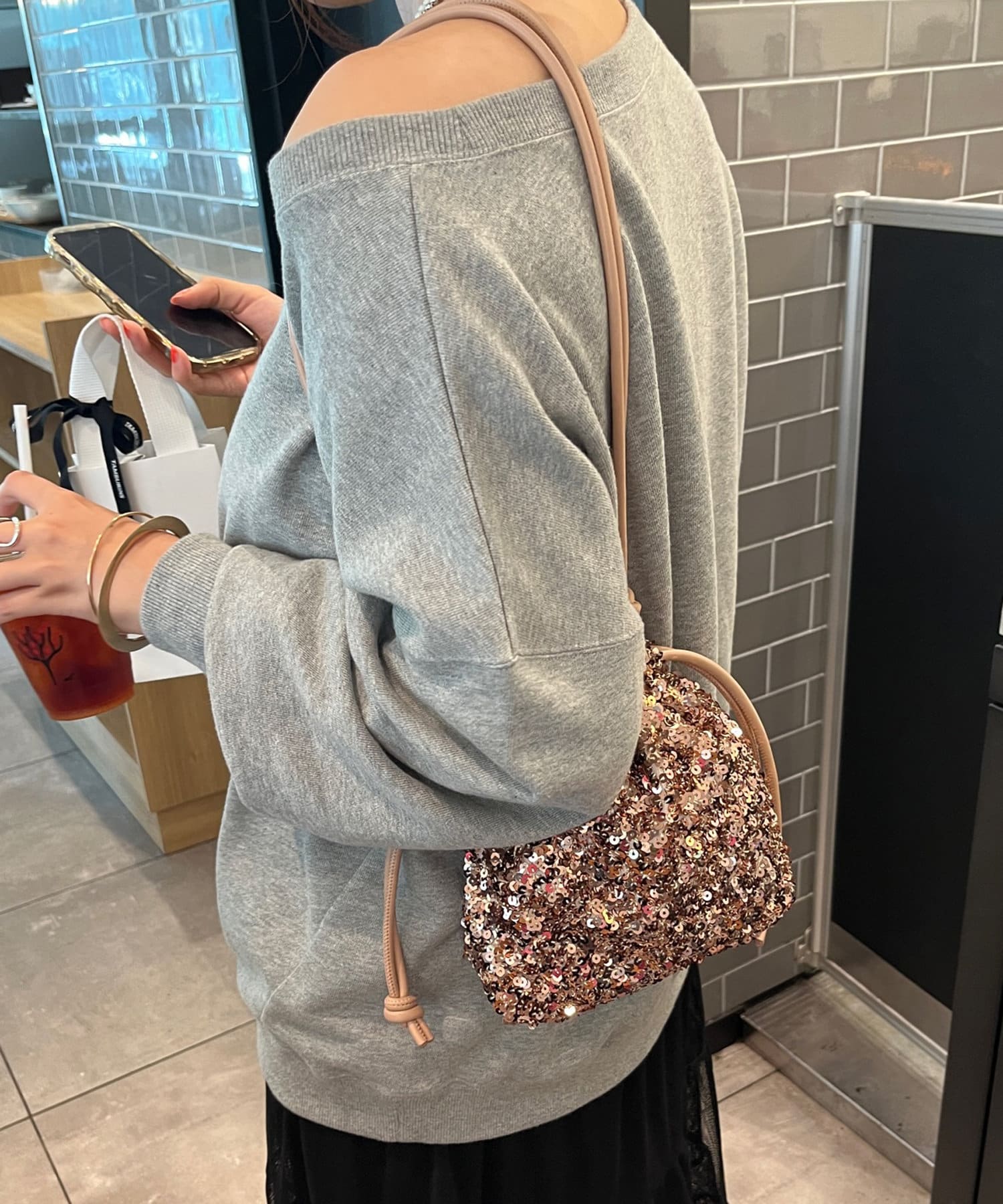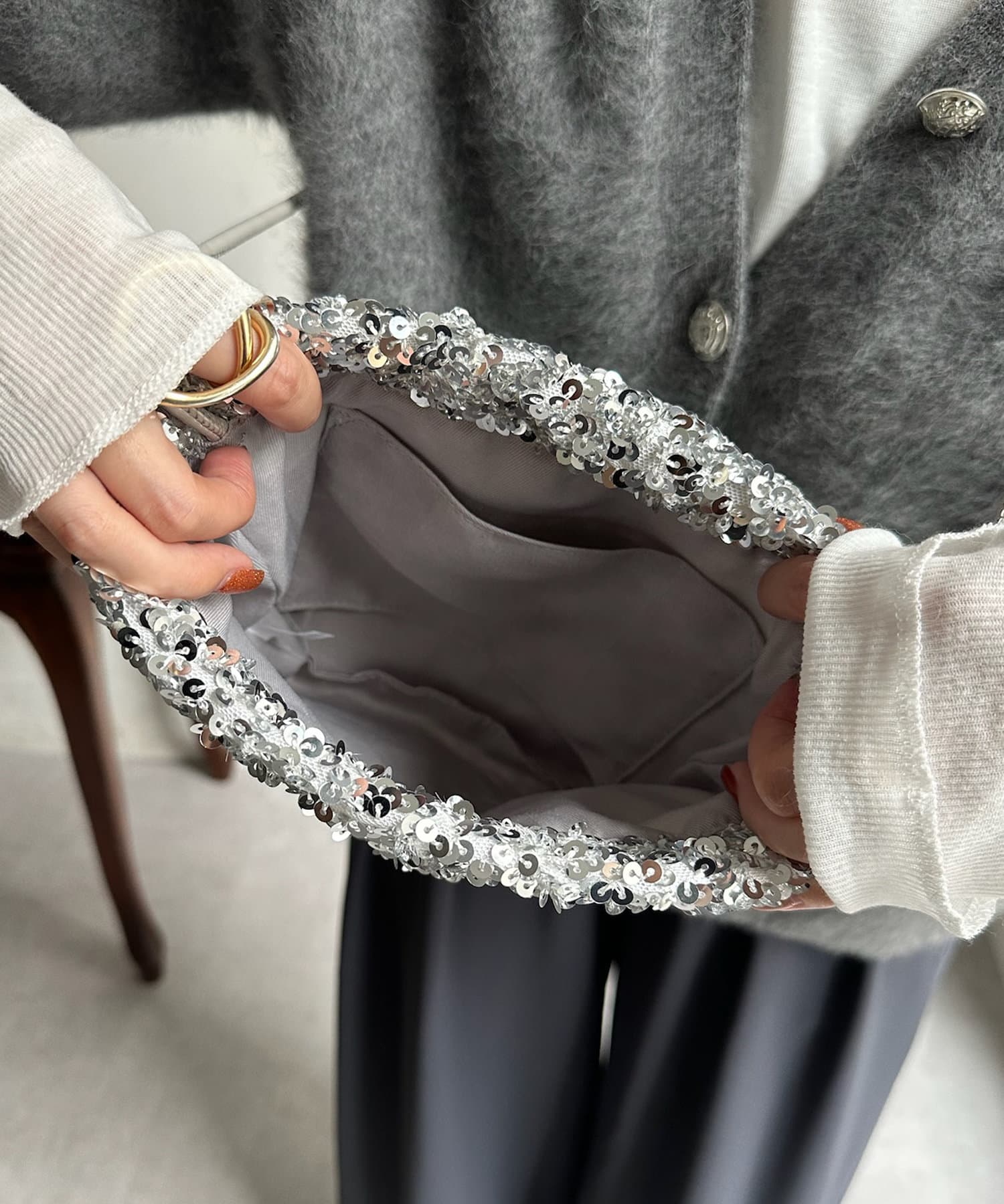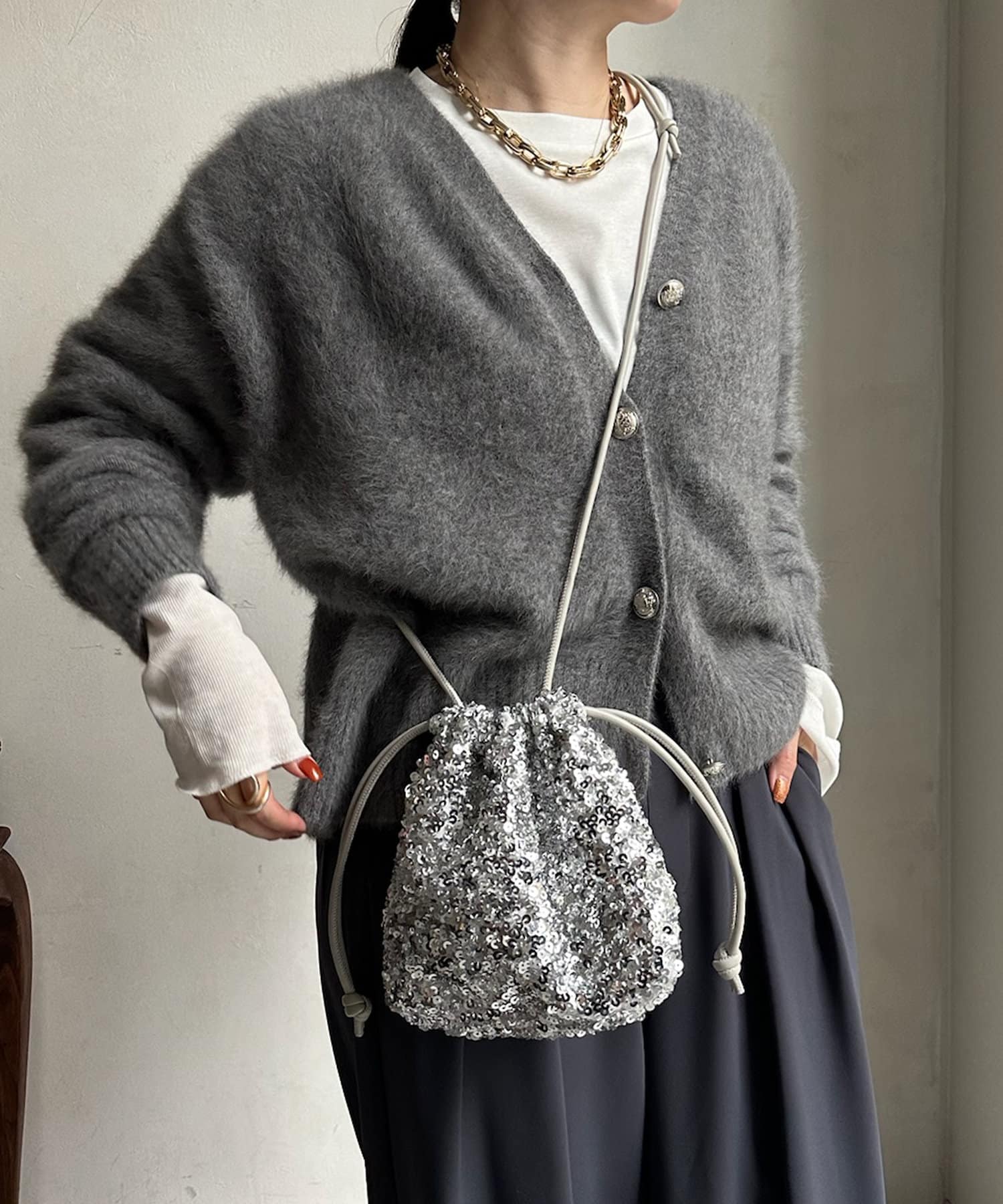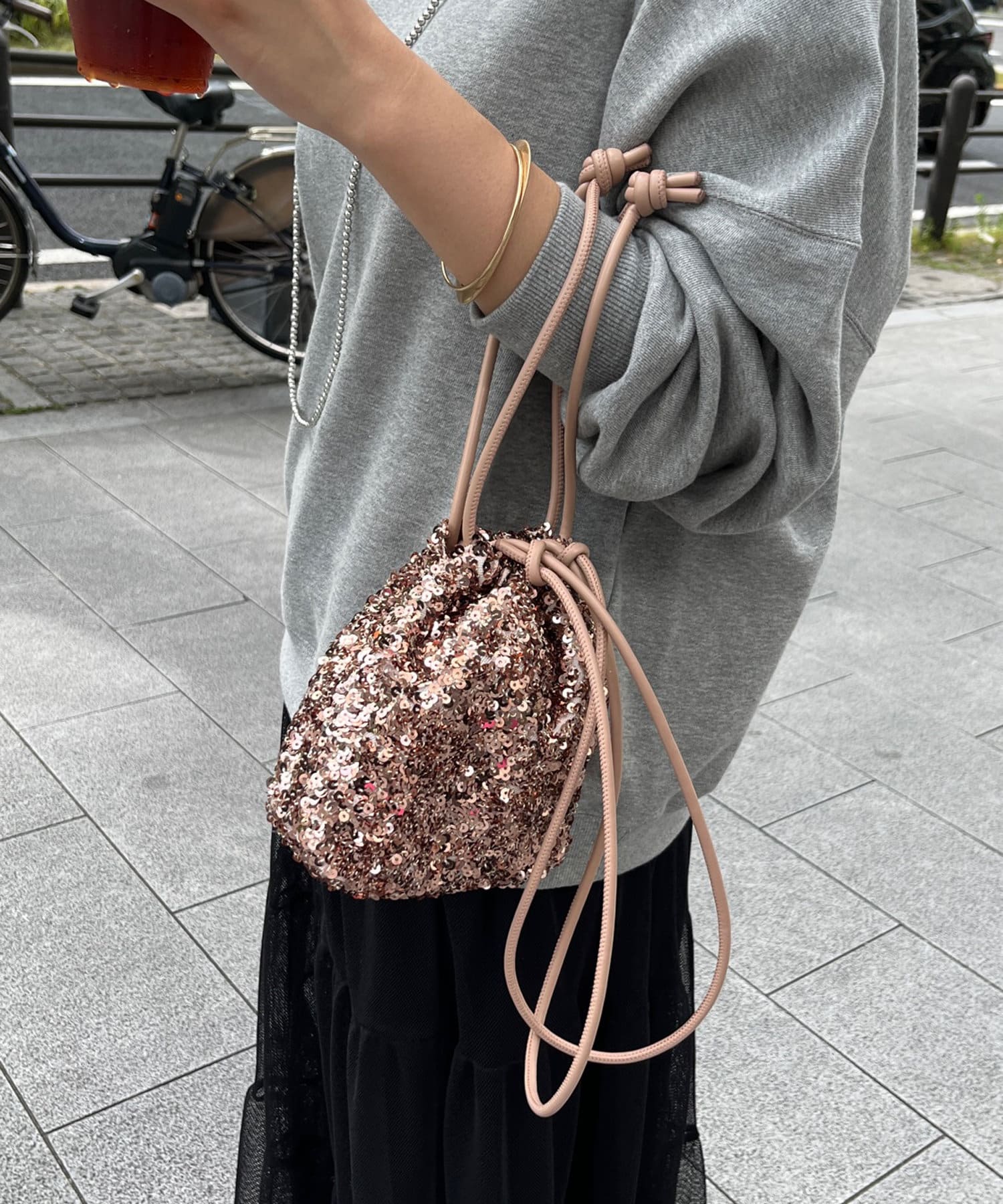 コーディネートを華やかに彩るスパンコール巾着!