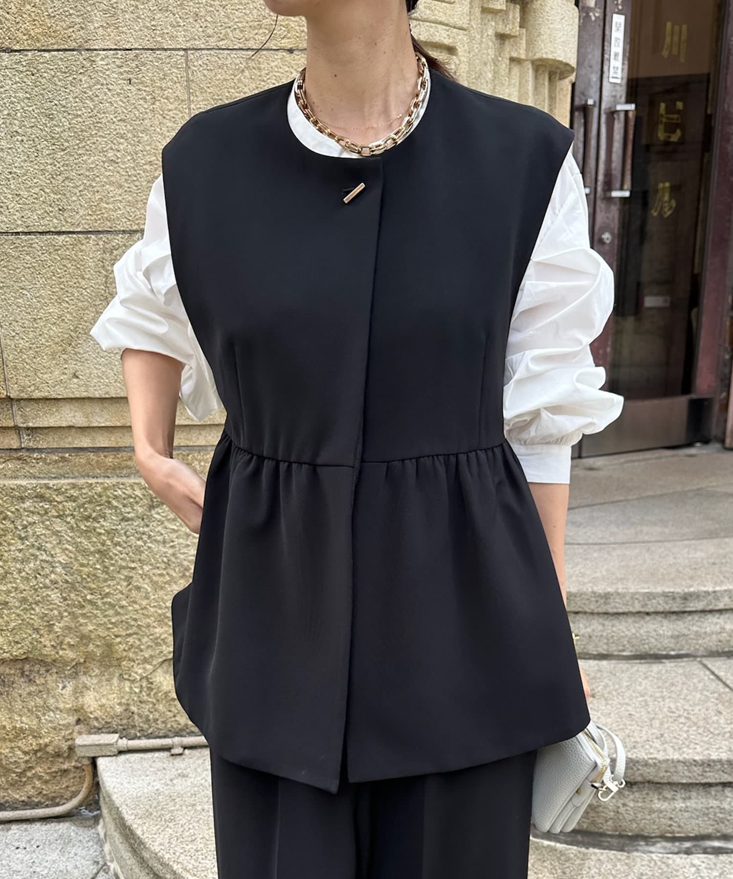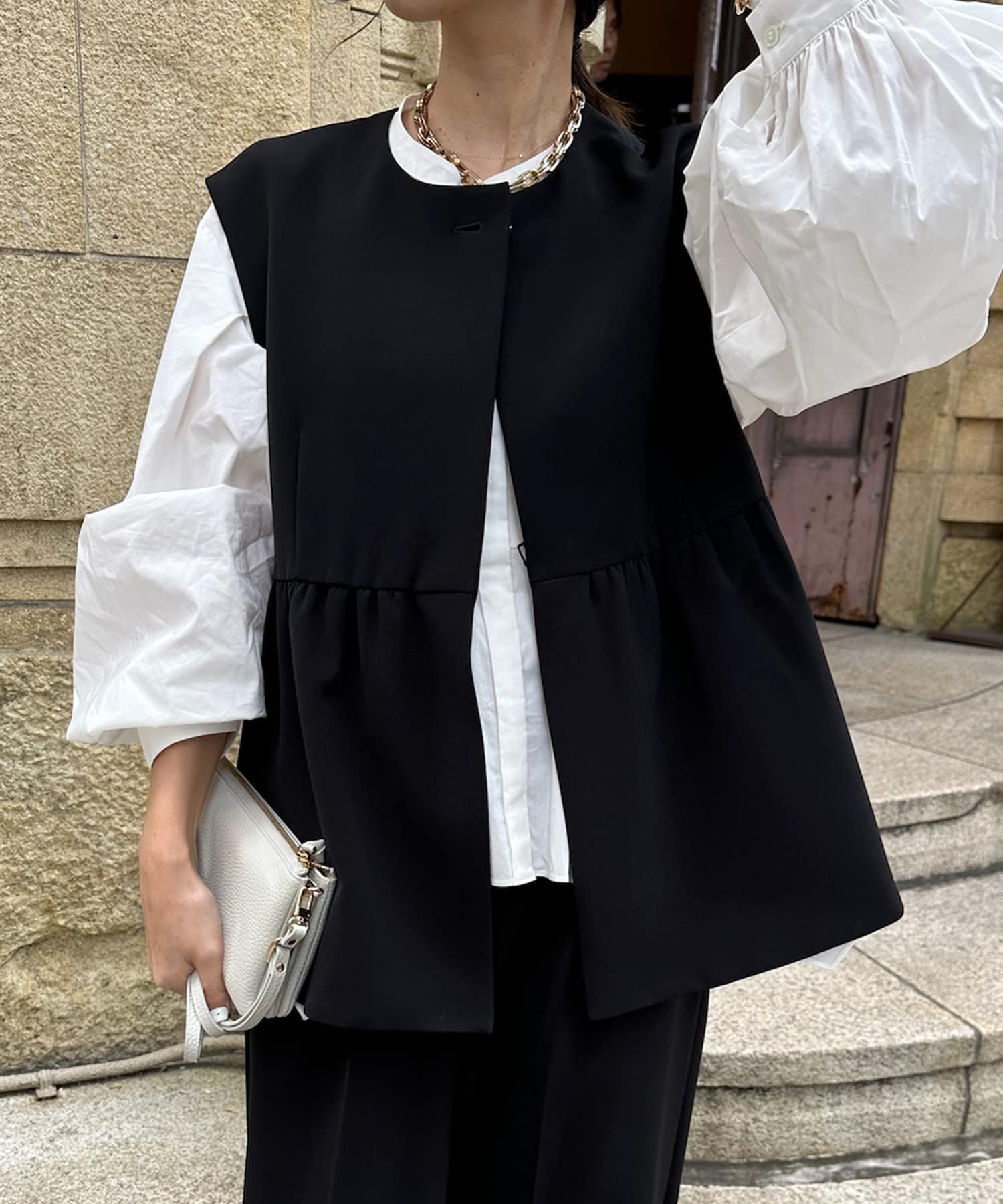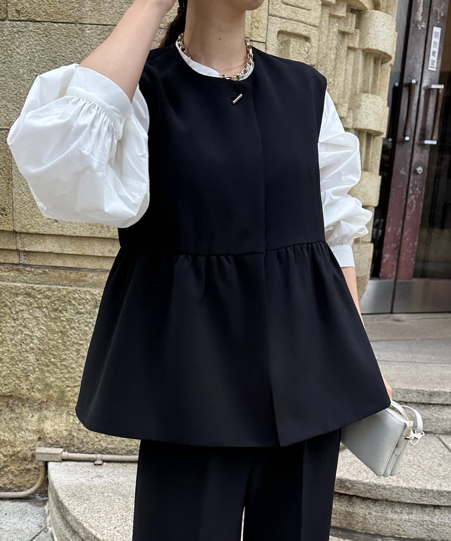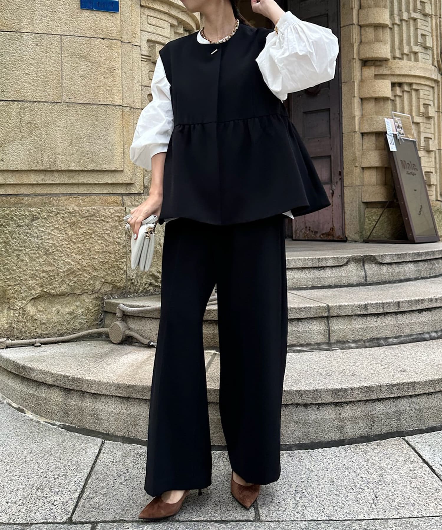 キレイ目スタイルに大人のまとまりをつけてくれるペプラムベスト!