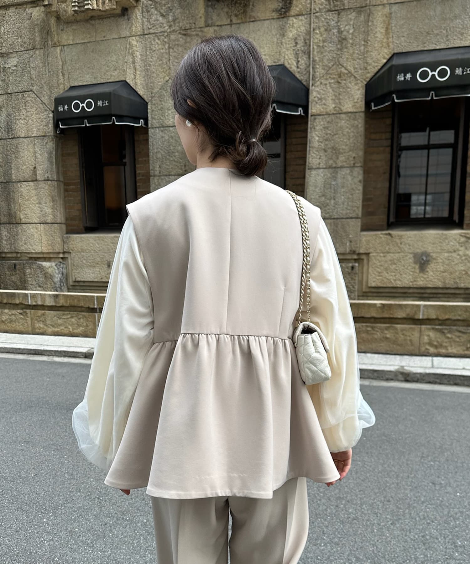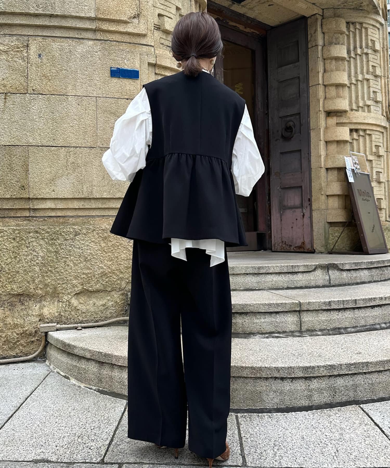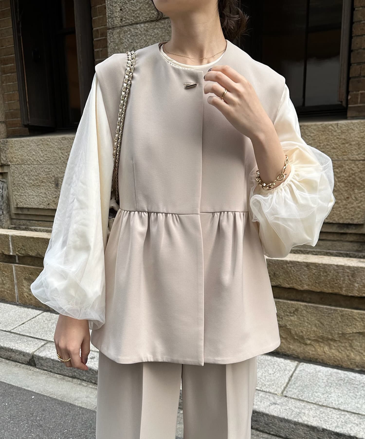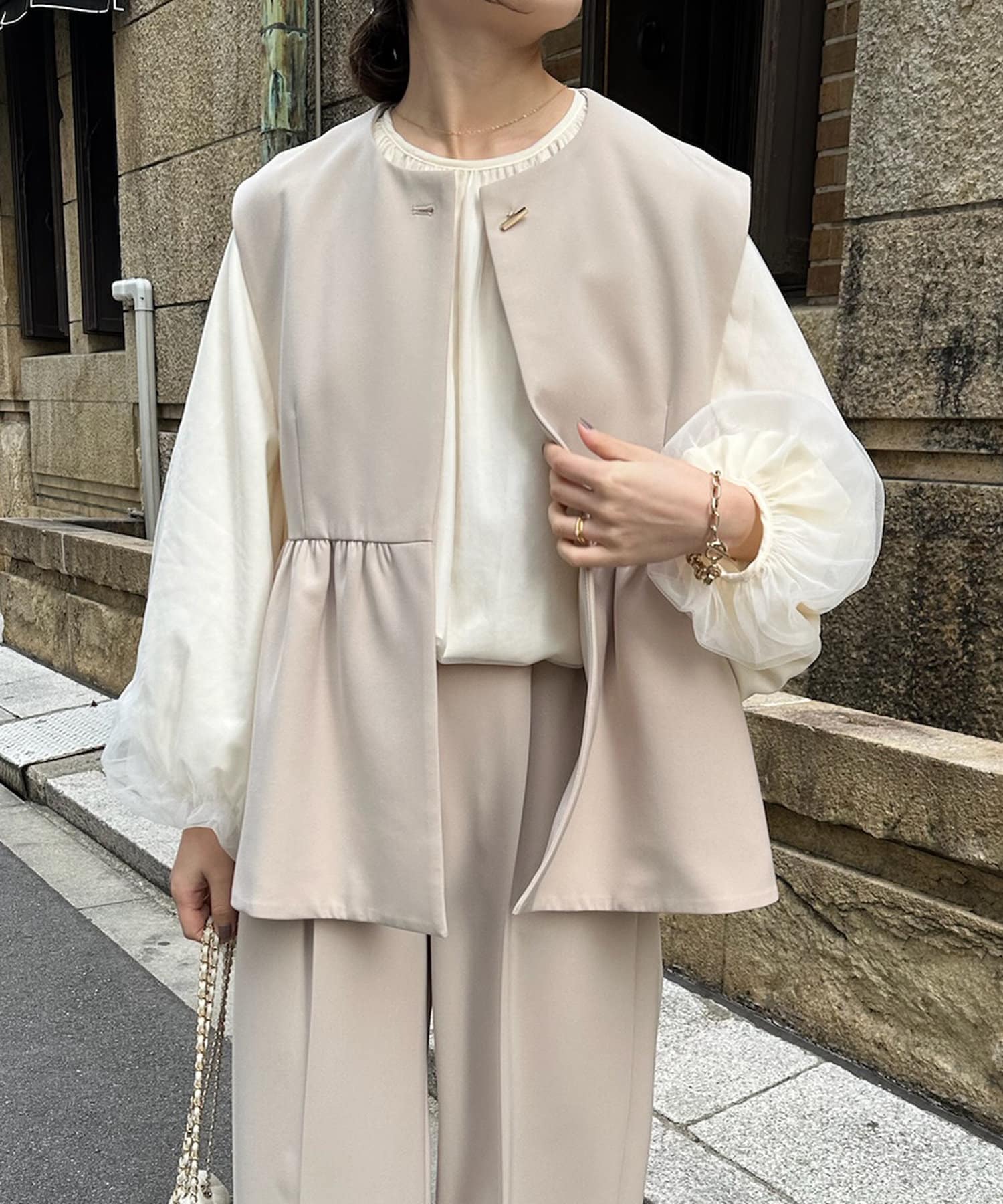 キレイ目スタイルに大人のまとまりをつけてくれるペプラムベスト!