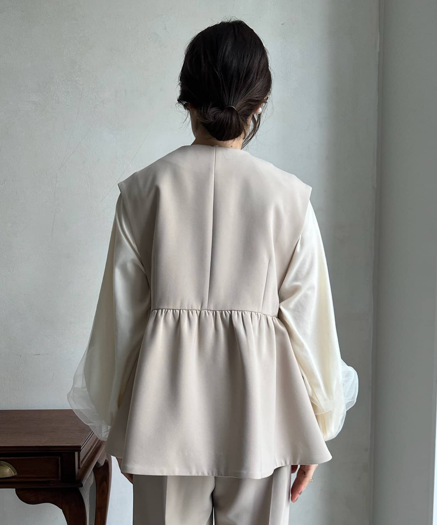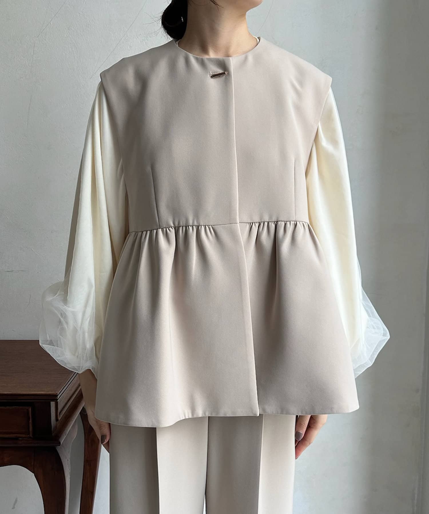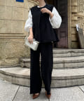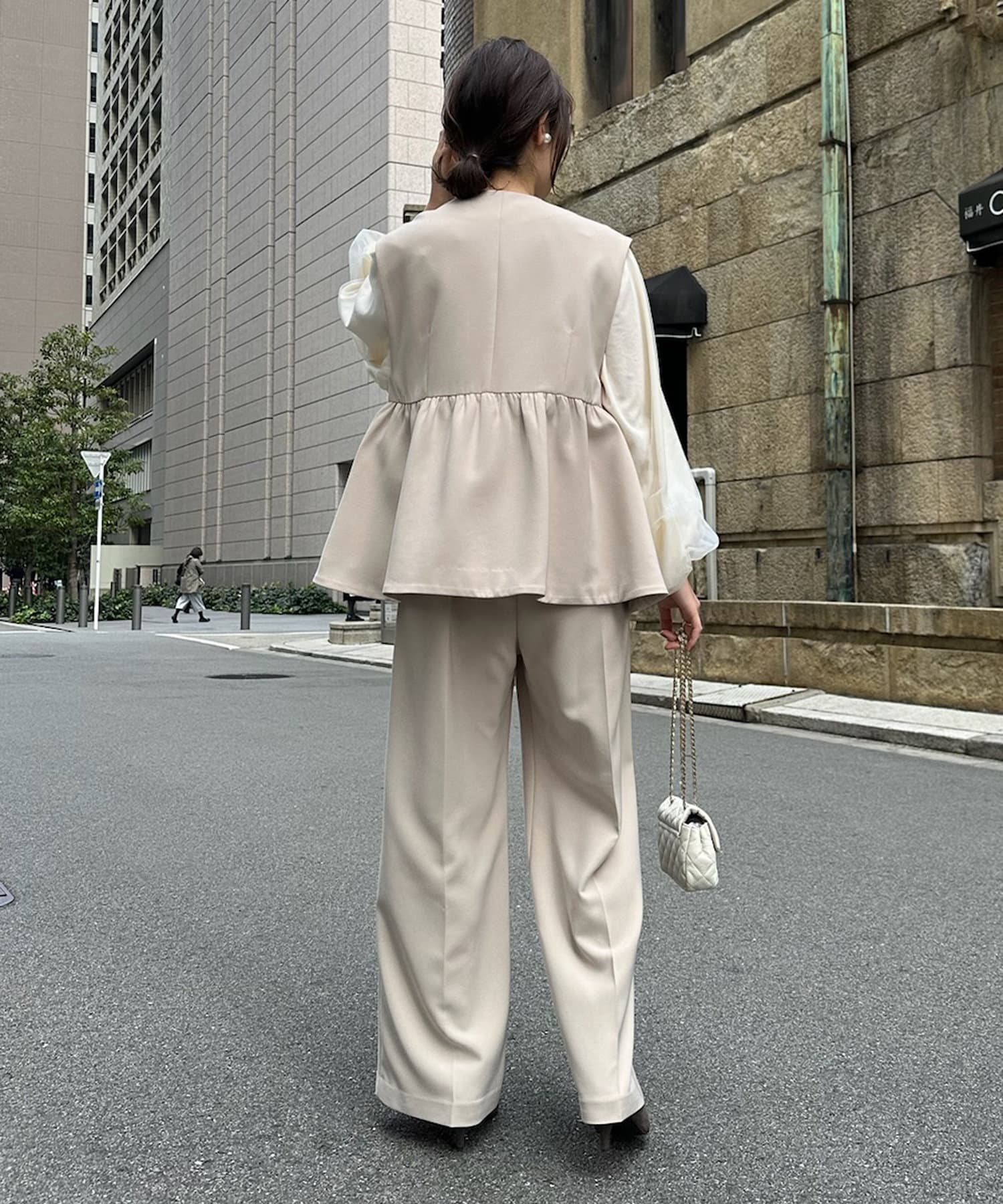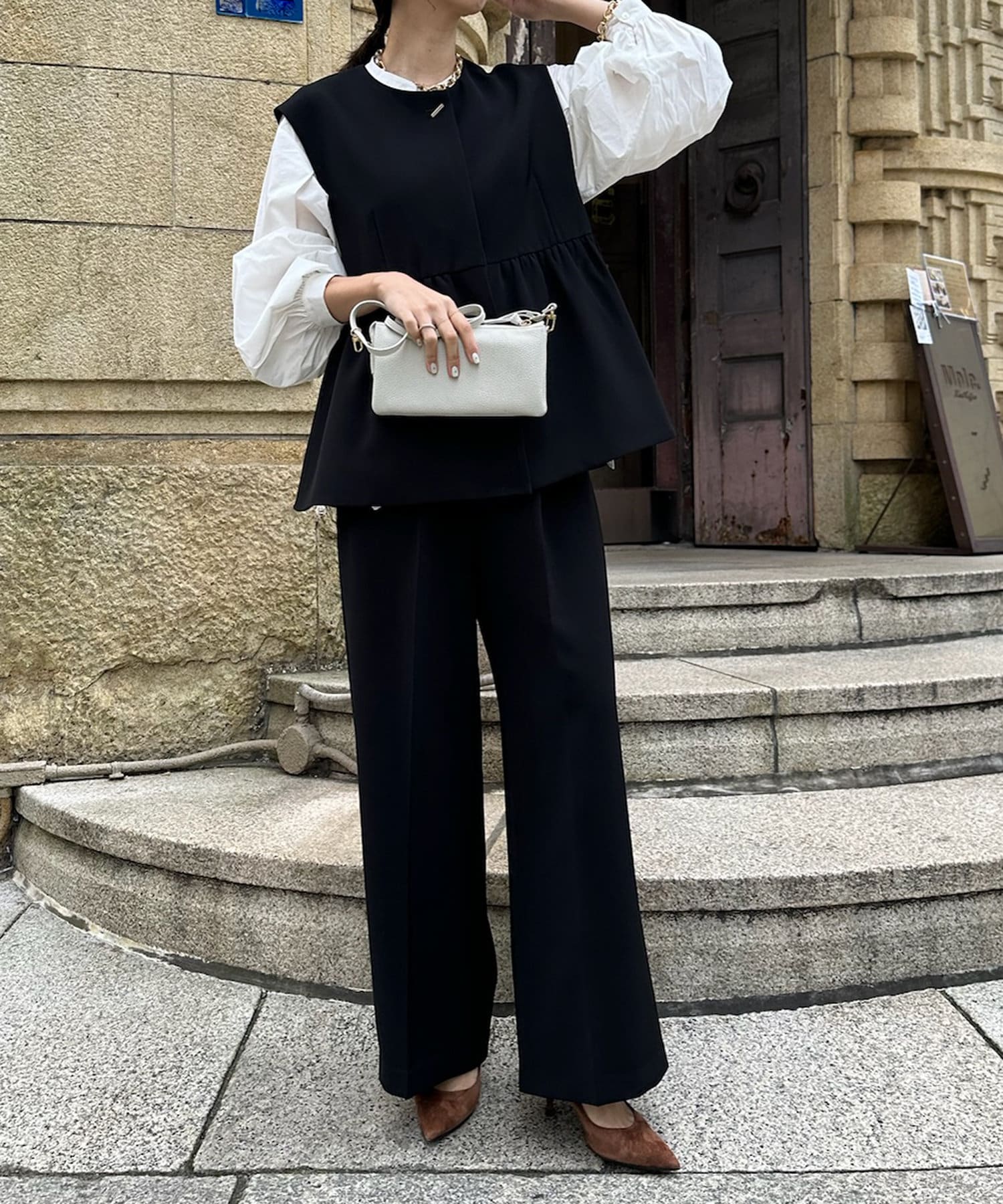 キレイ目スタイルに大人のまとまりをつけてくれるペプラムベスト!