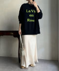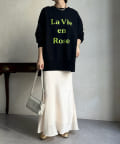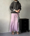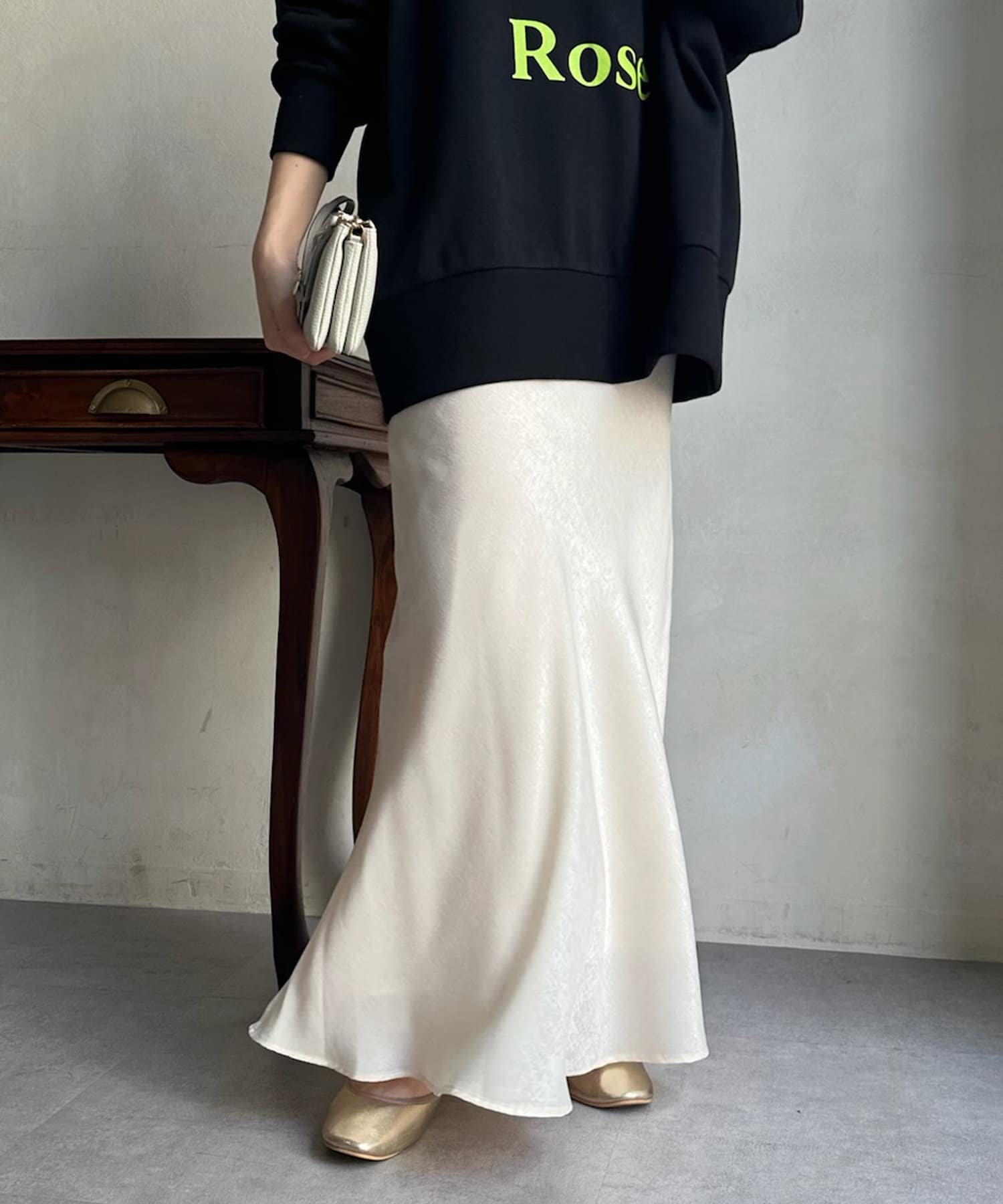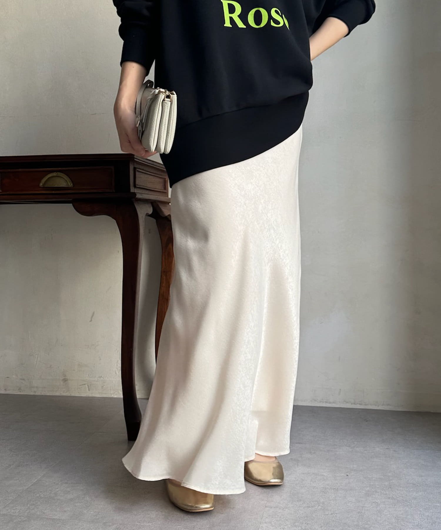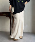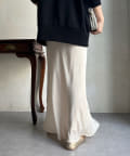裾に向かってゆるやかに広がるマーメードシルエットできれいな印象を与えつつも、ウエストはゴム仕様になっている為、履き心地はリラクシーで楽々。