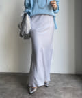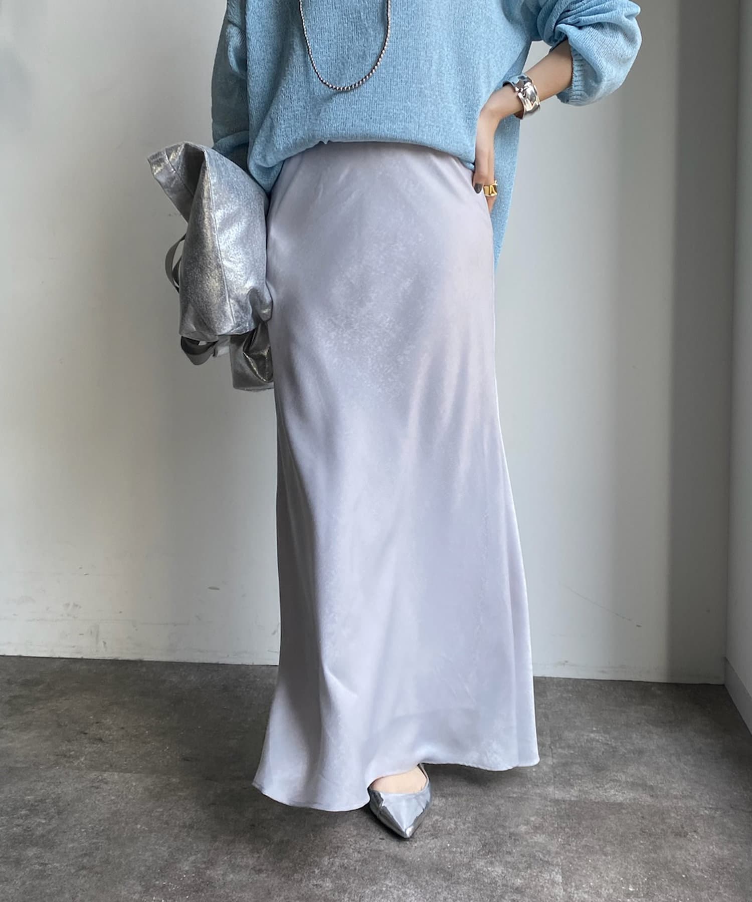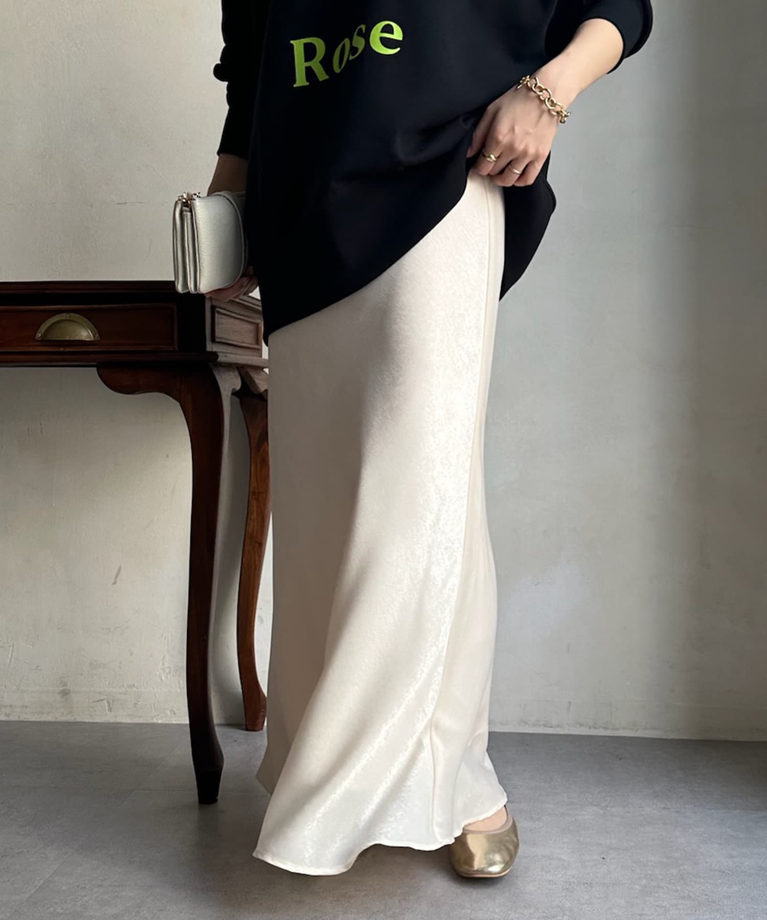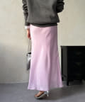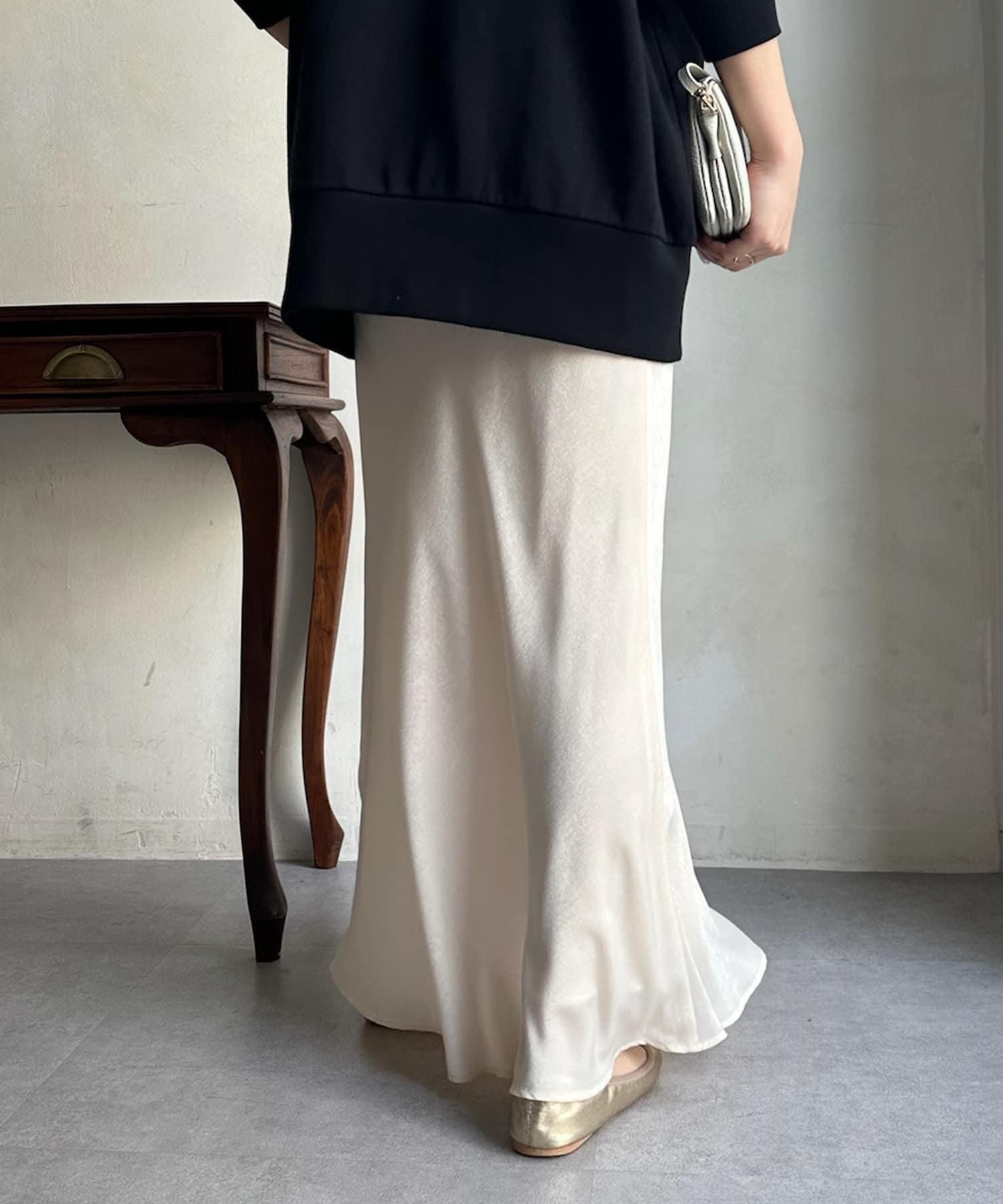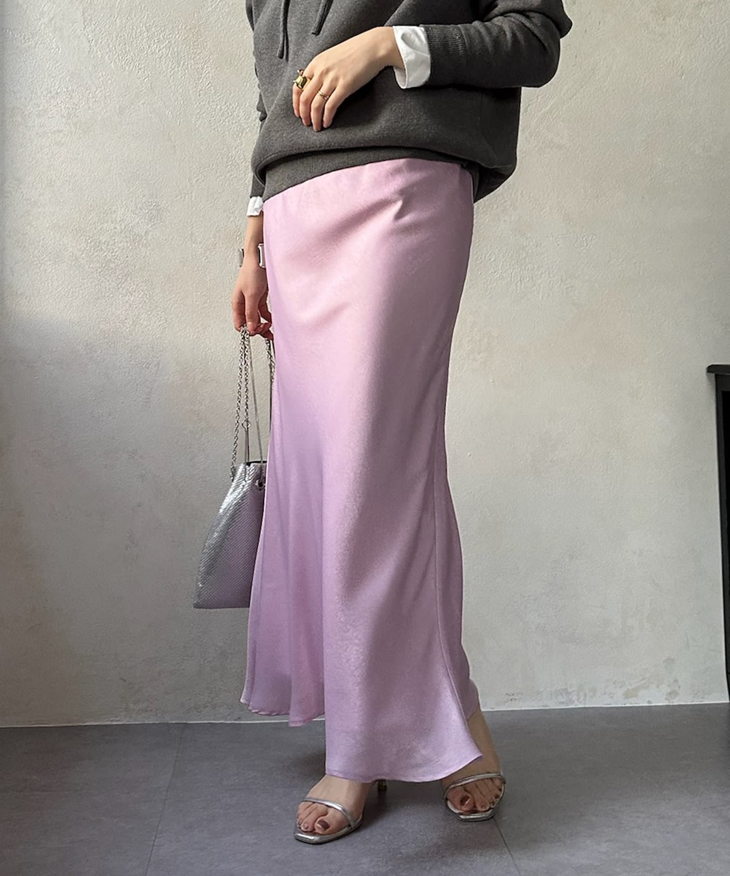 すっきりとした落ち感のある綺麗なシルエットが女性らしい印象を与えてくれるサテンスカート。