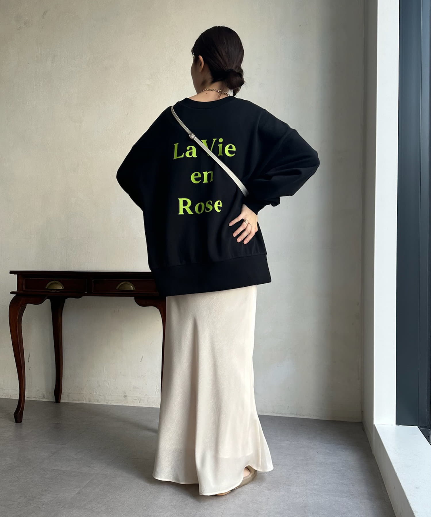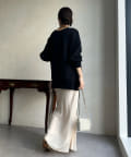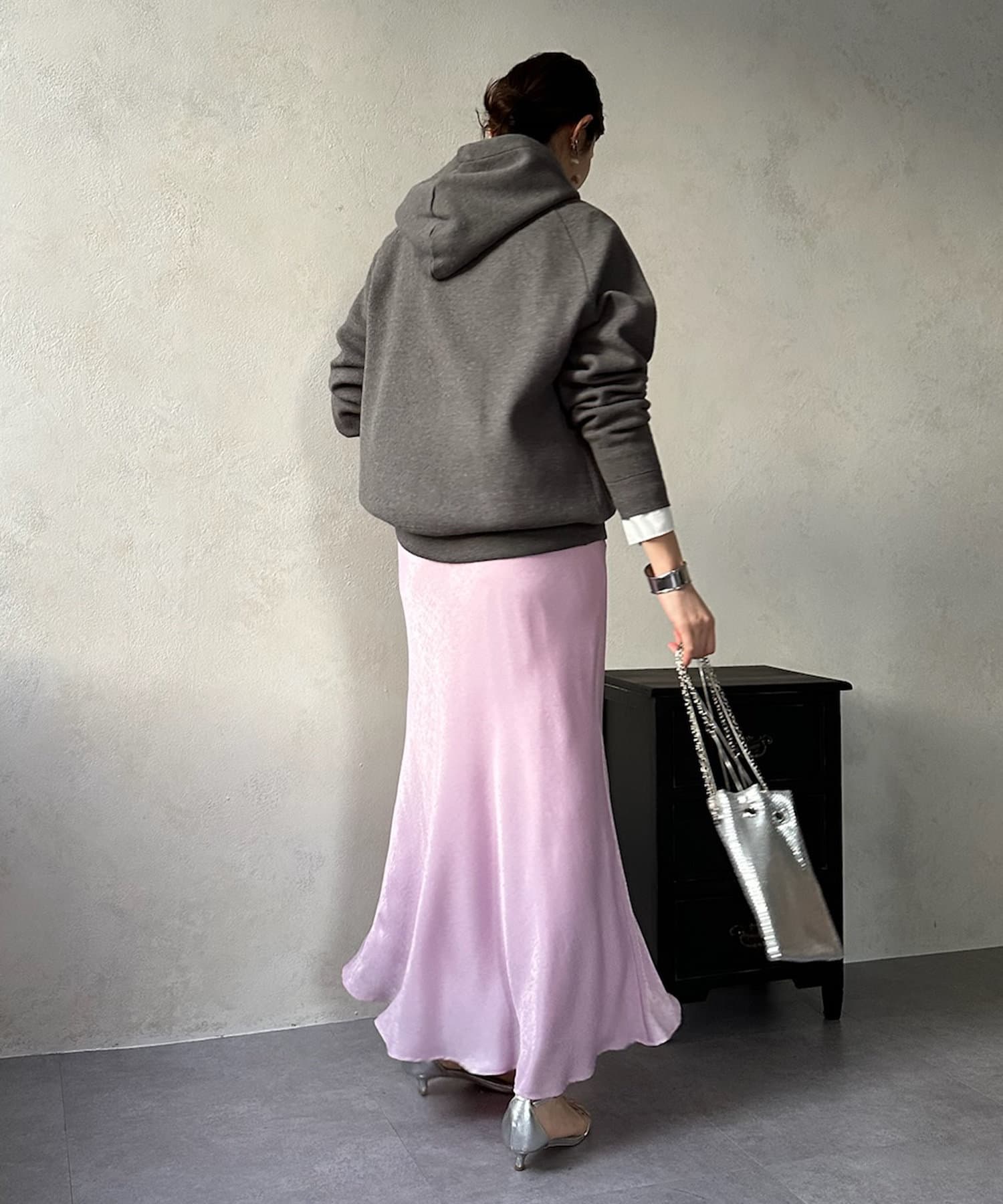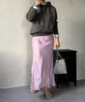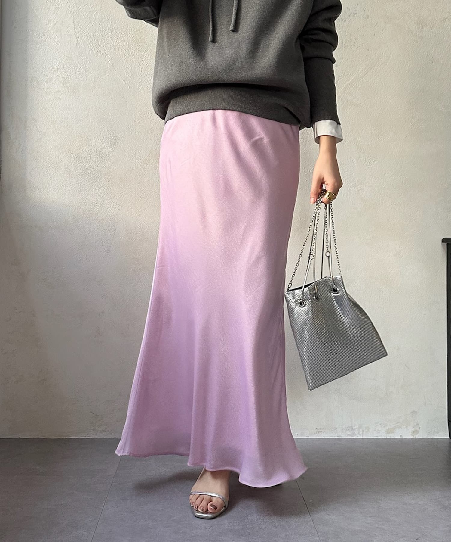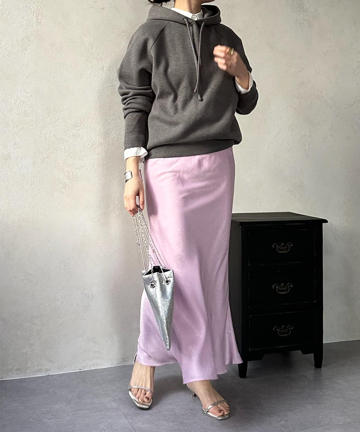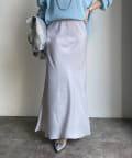 すっきりとした落ち感のある綺麗なシルエットが女性らしい印象を与えてくれるサテンスカート。