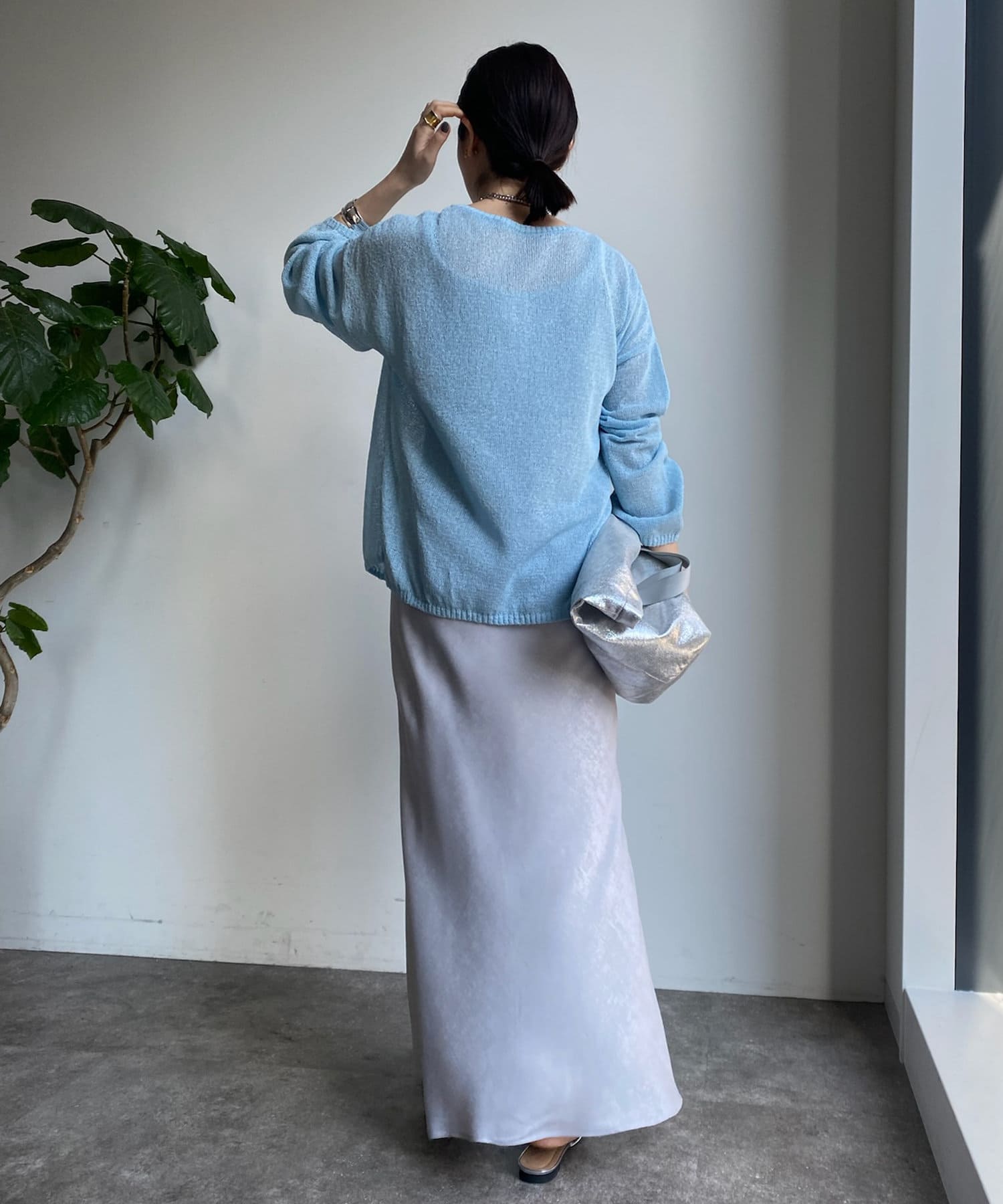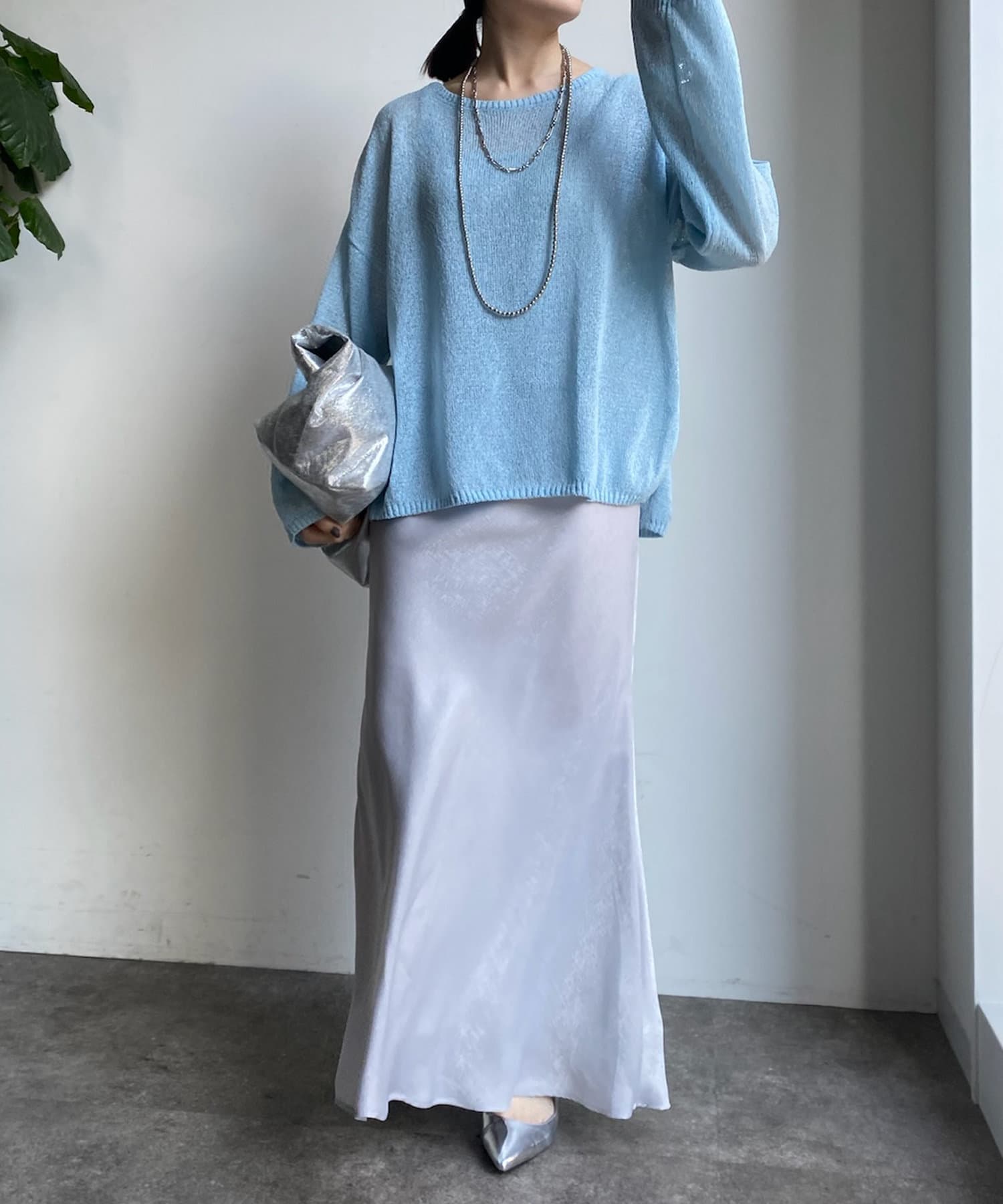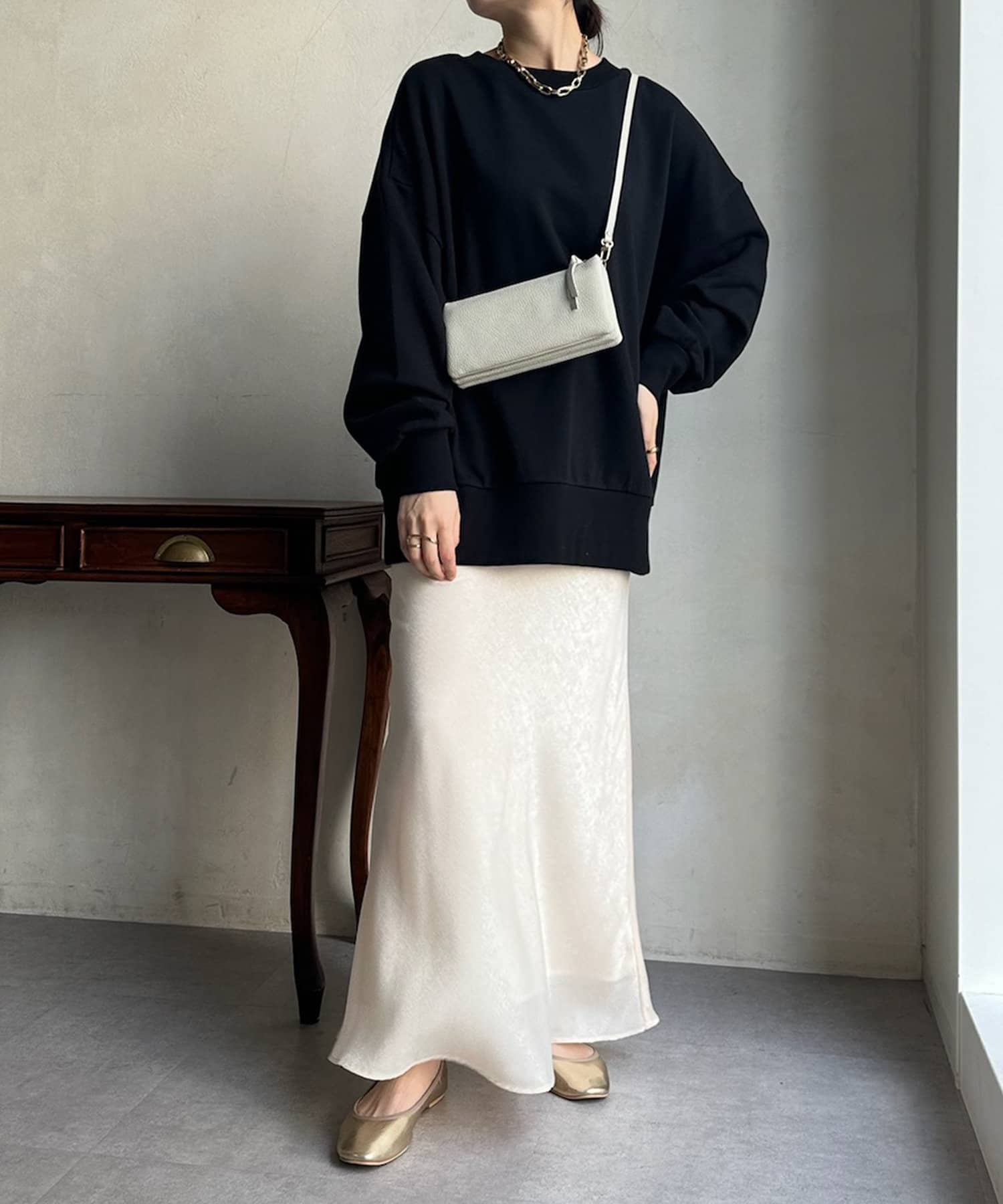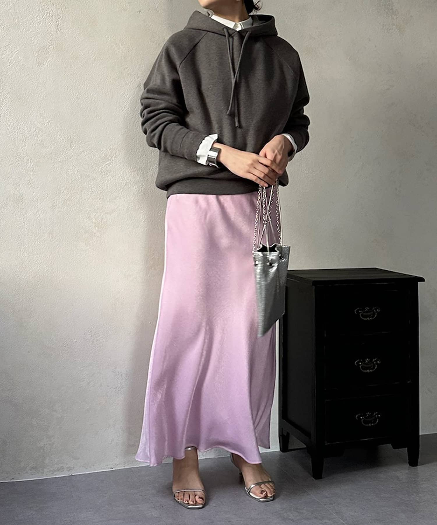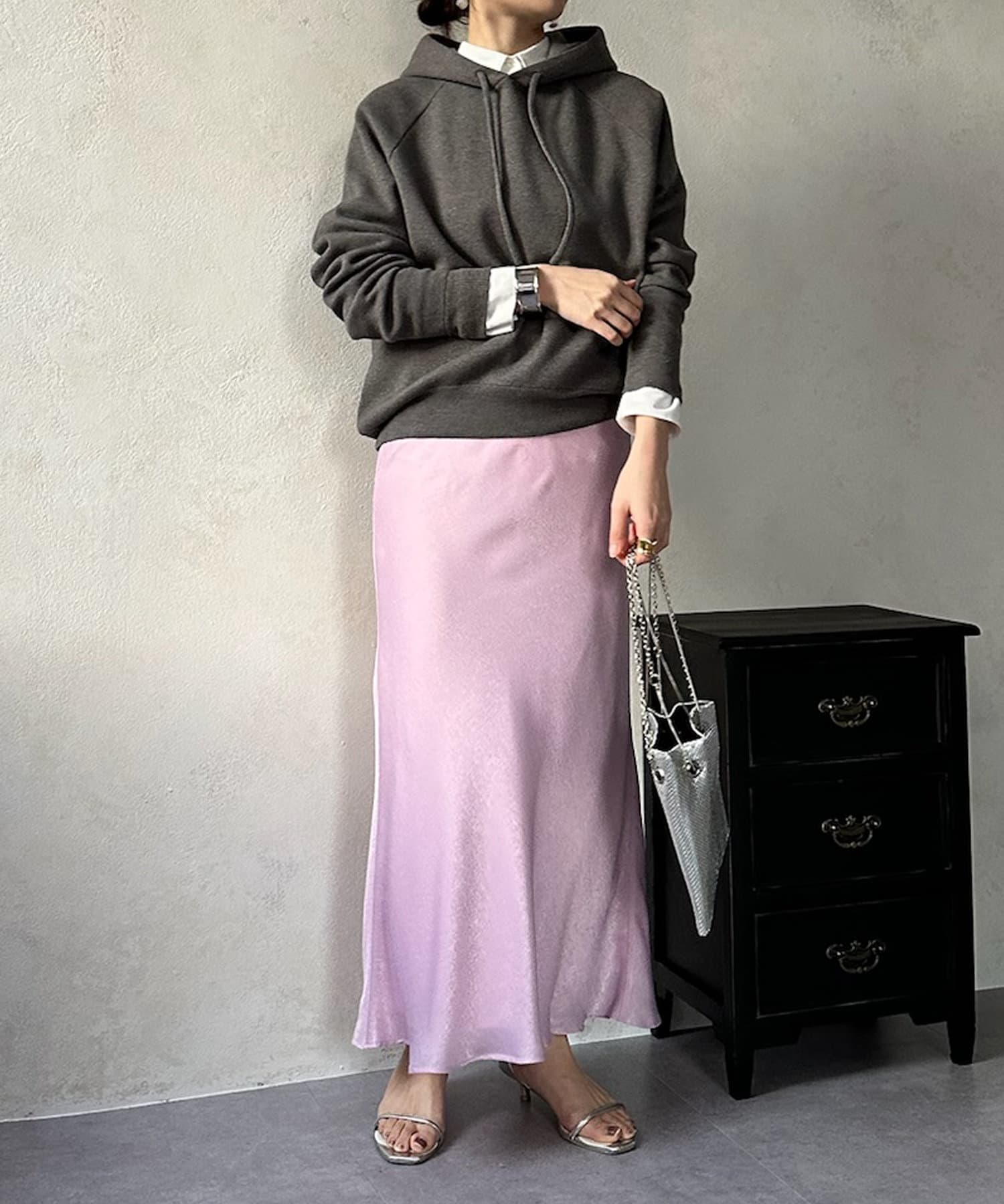 光沢感のある素材感が新鮮で、いつものスタイルをガラッと変えてくれます。