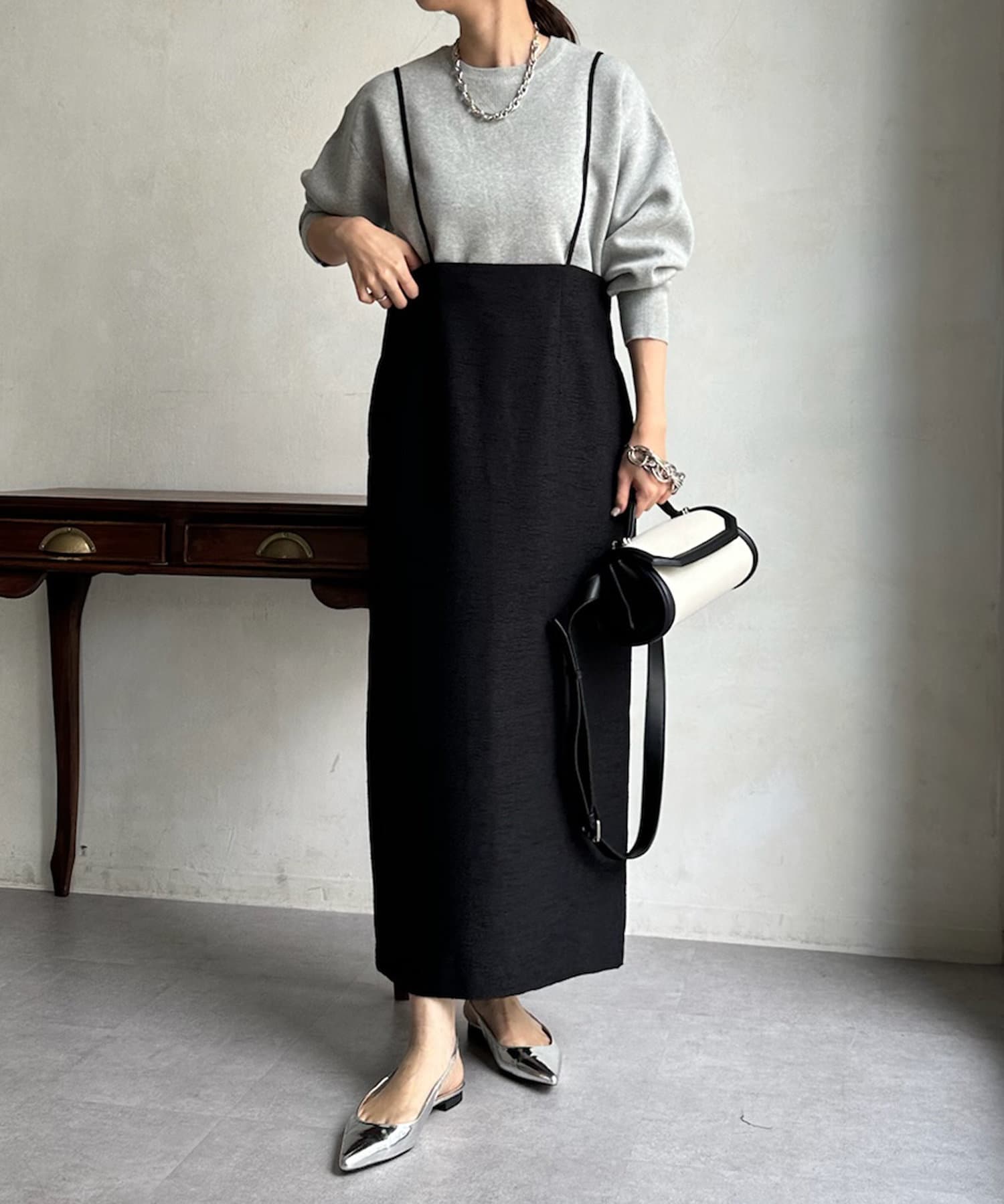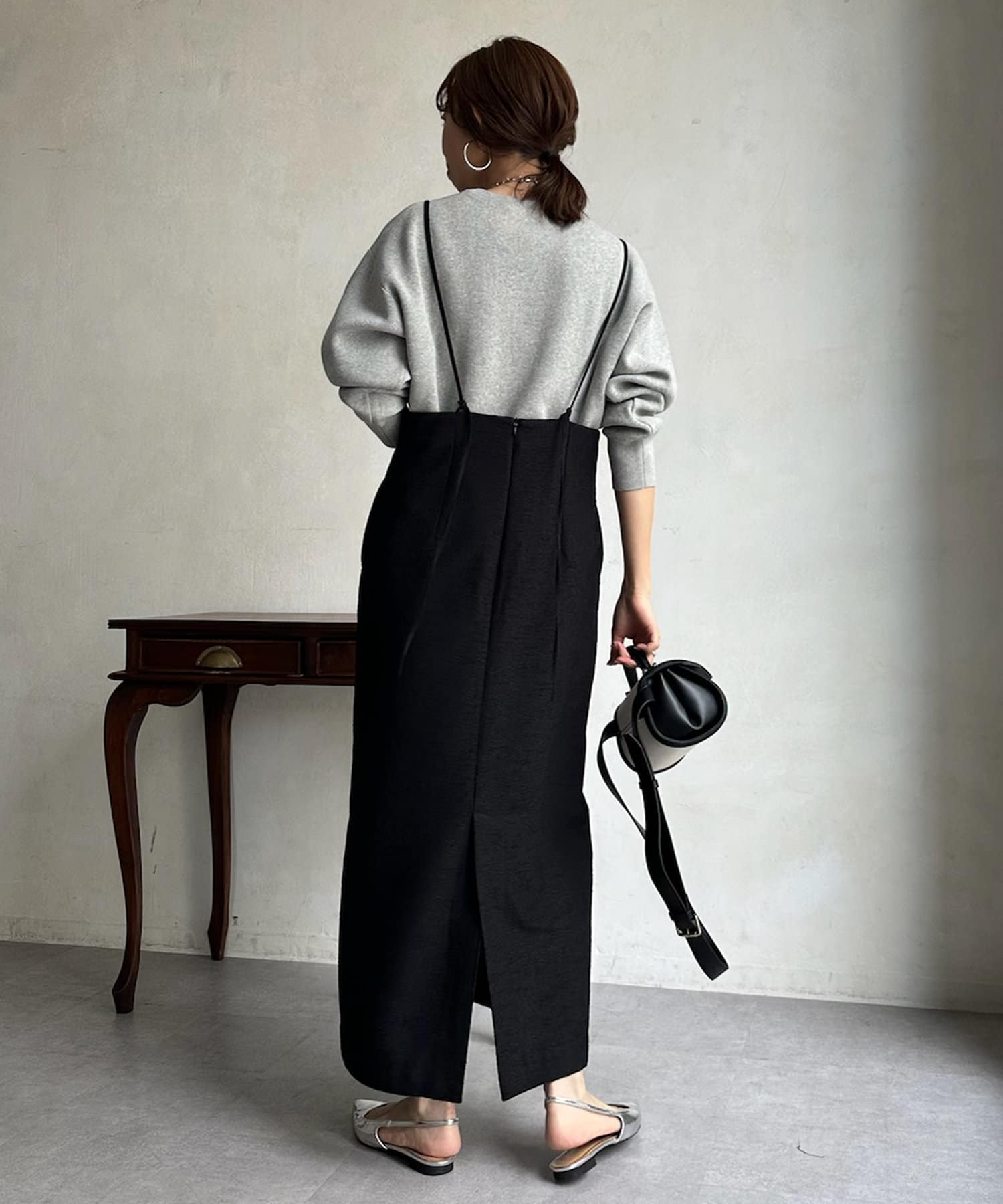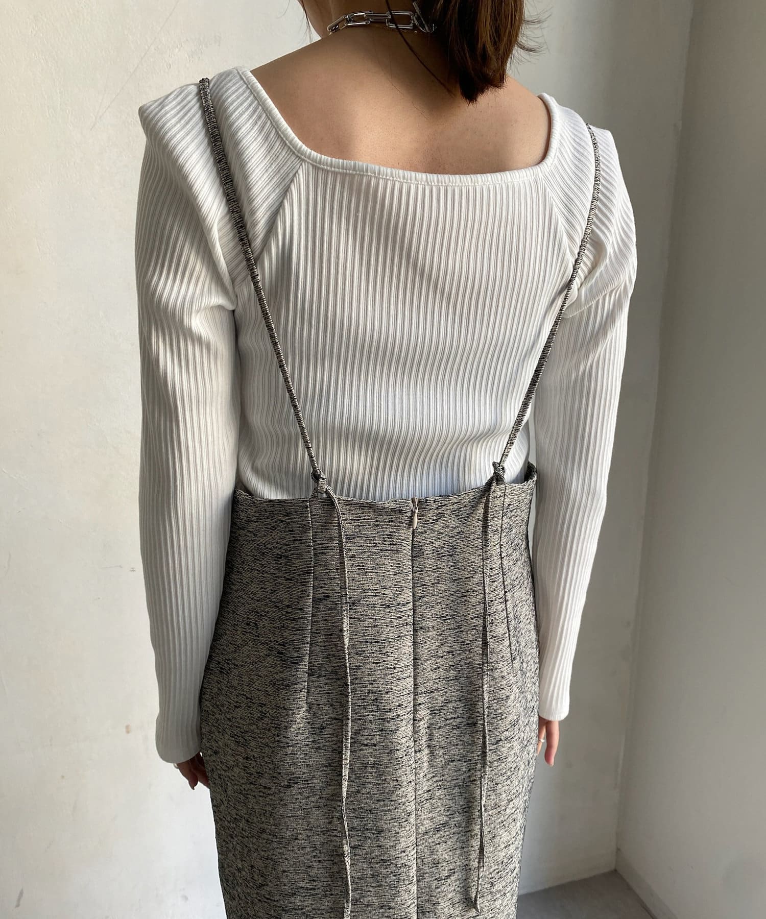 華奢なサスペンダーをプラスしたデザインが着こなしの幅を広げてくれるアイテムです。