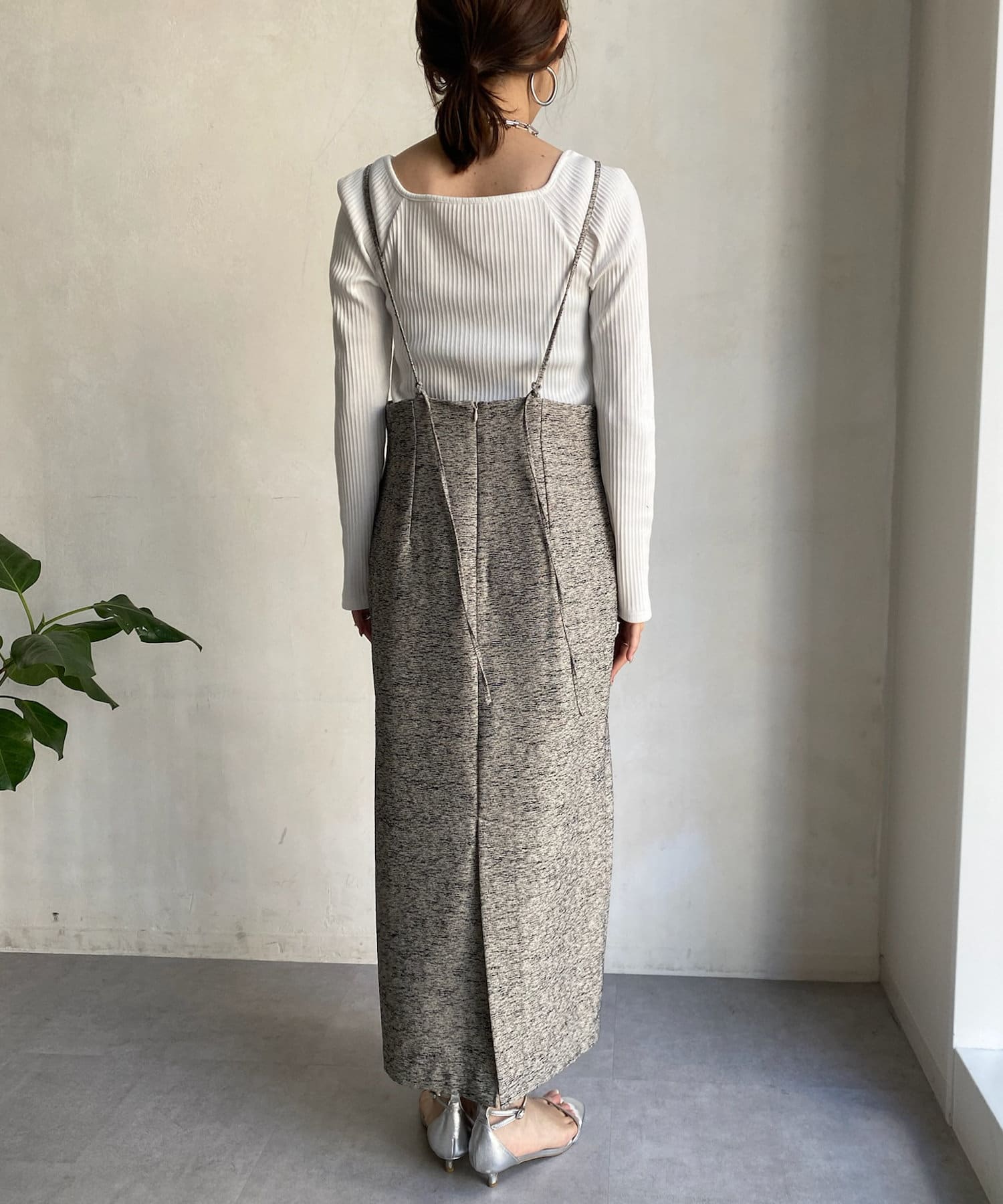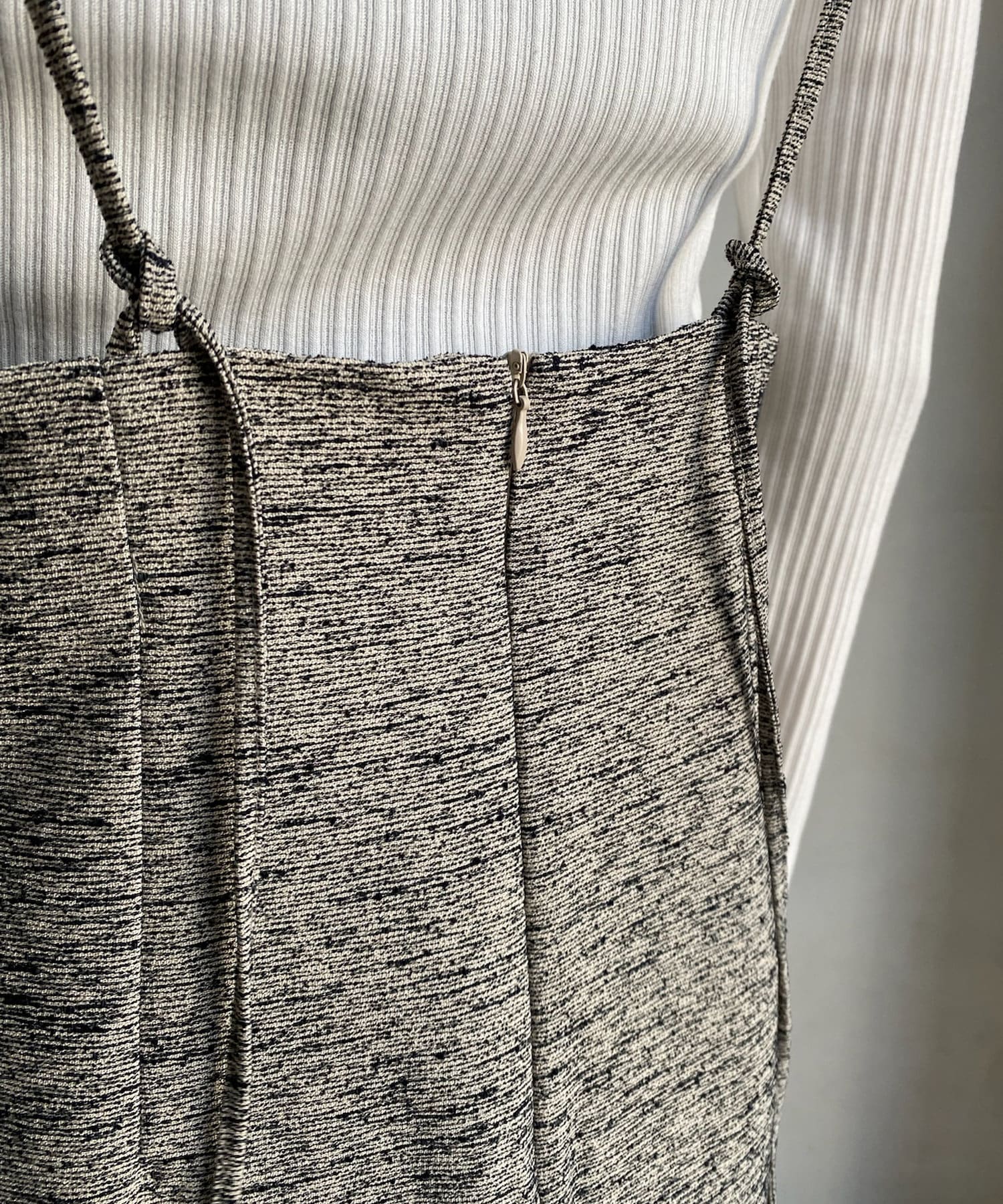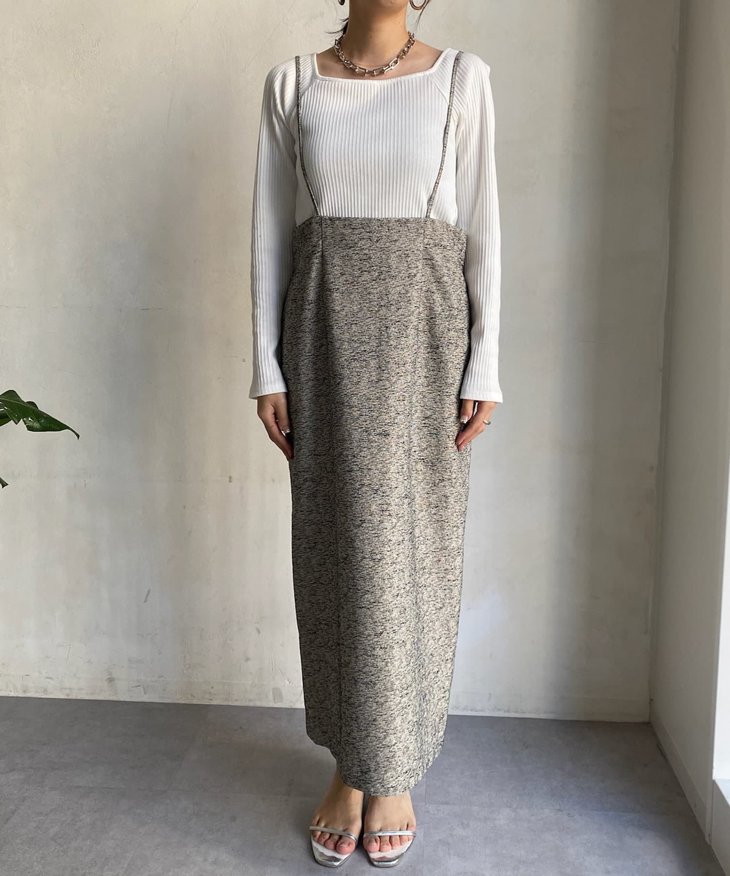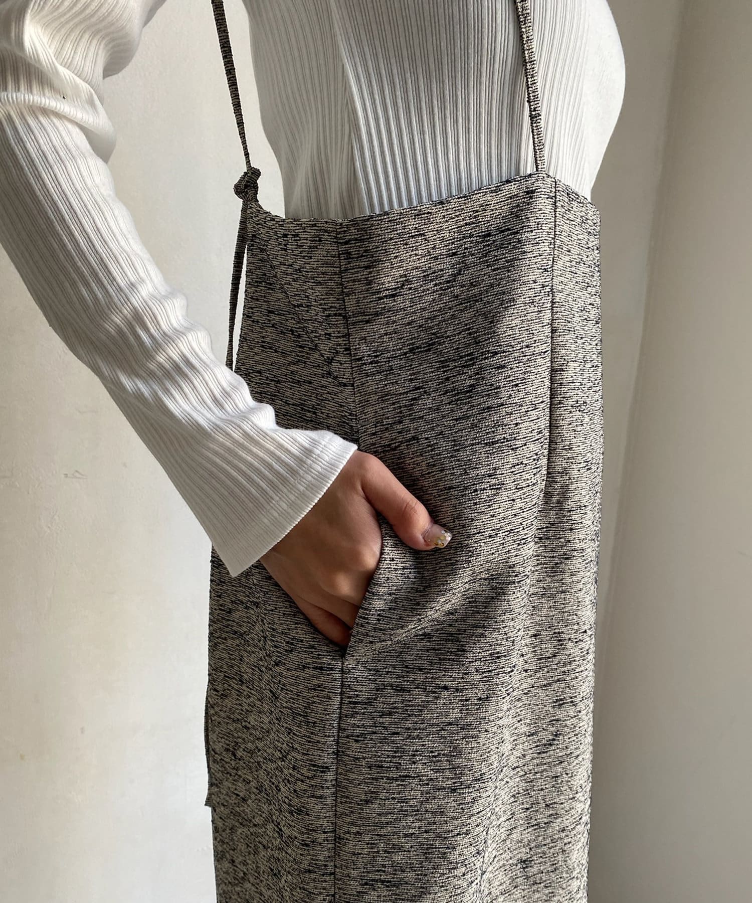 ツイード生地が大人の印象にしてくれるサスペンダー付きのスカート!