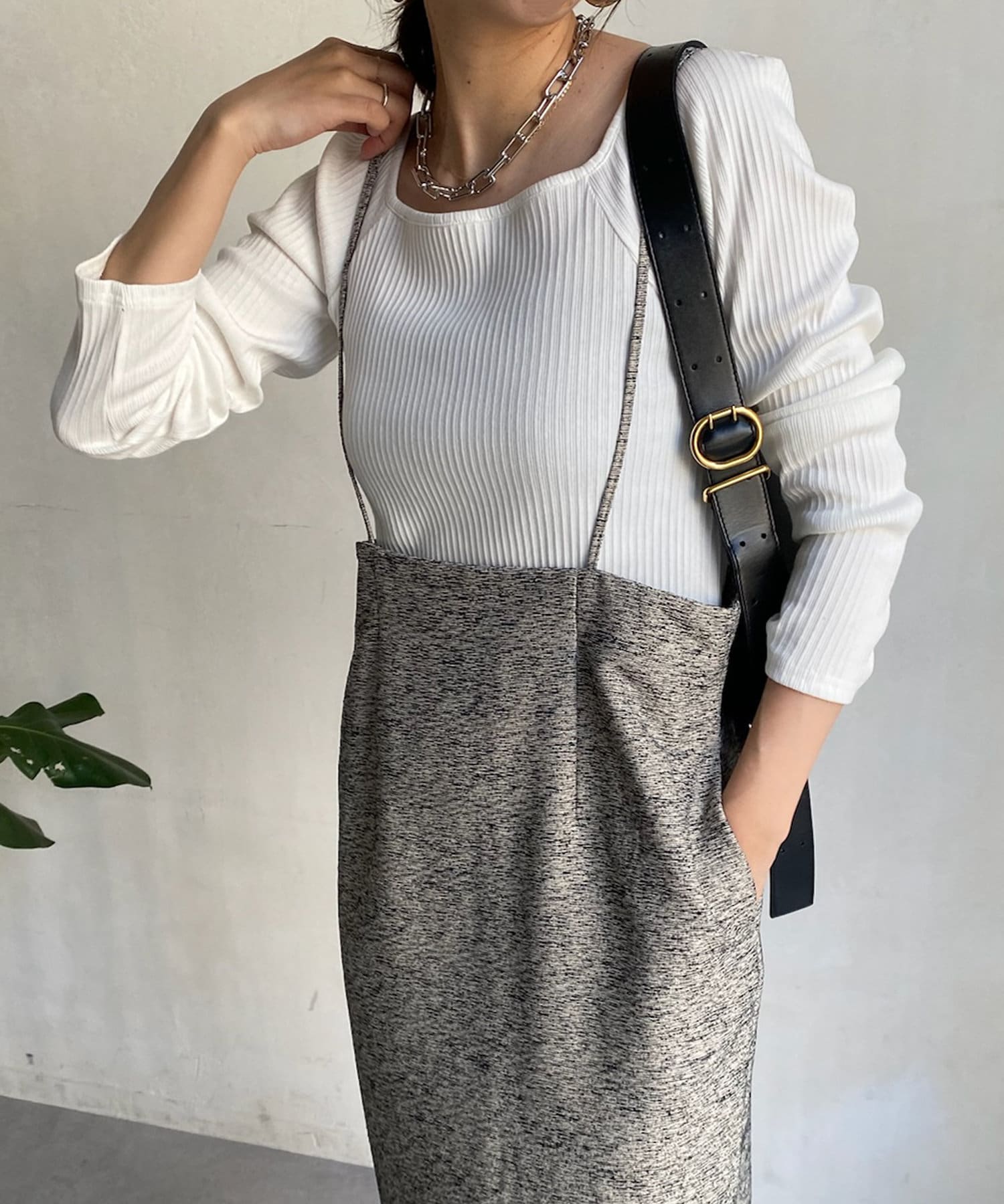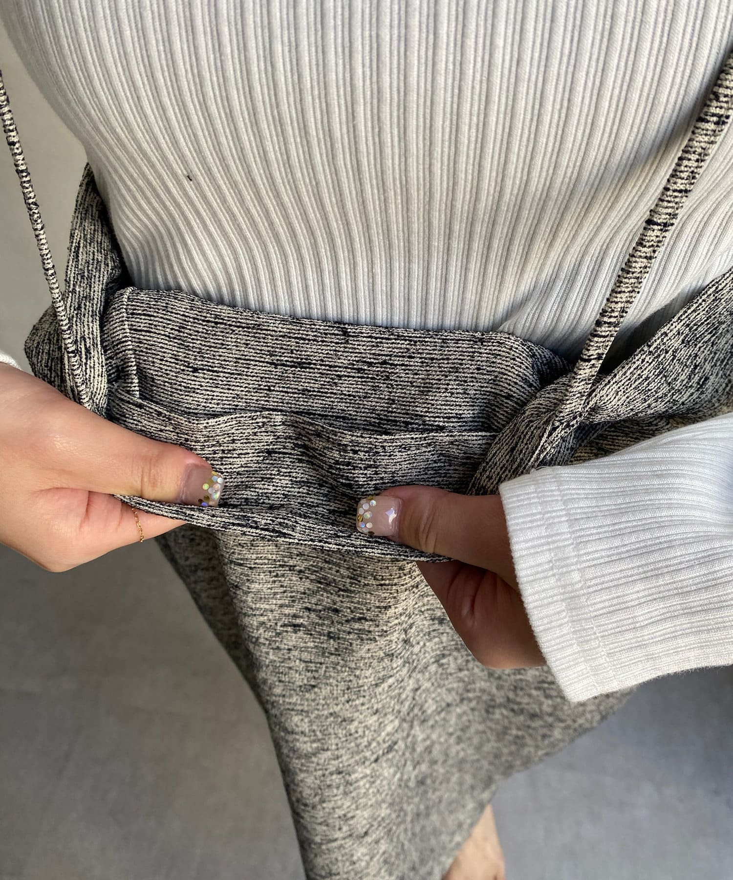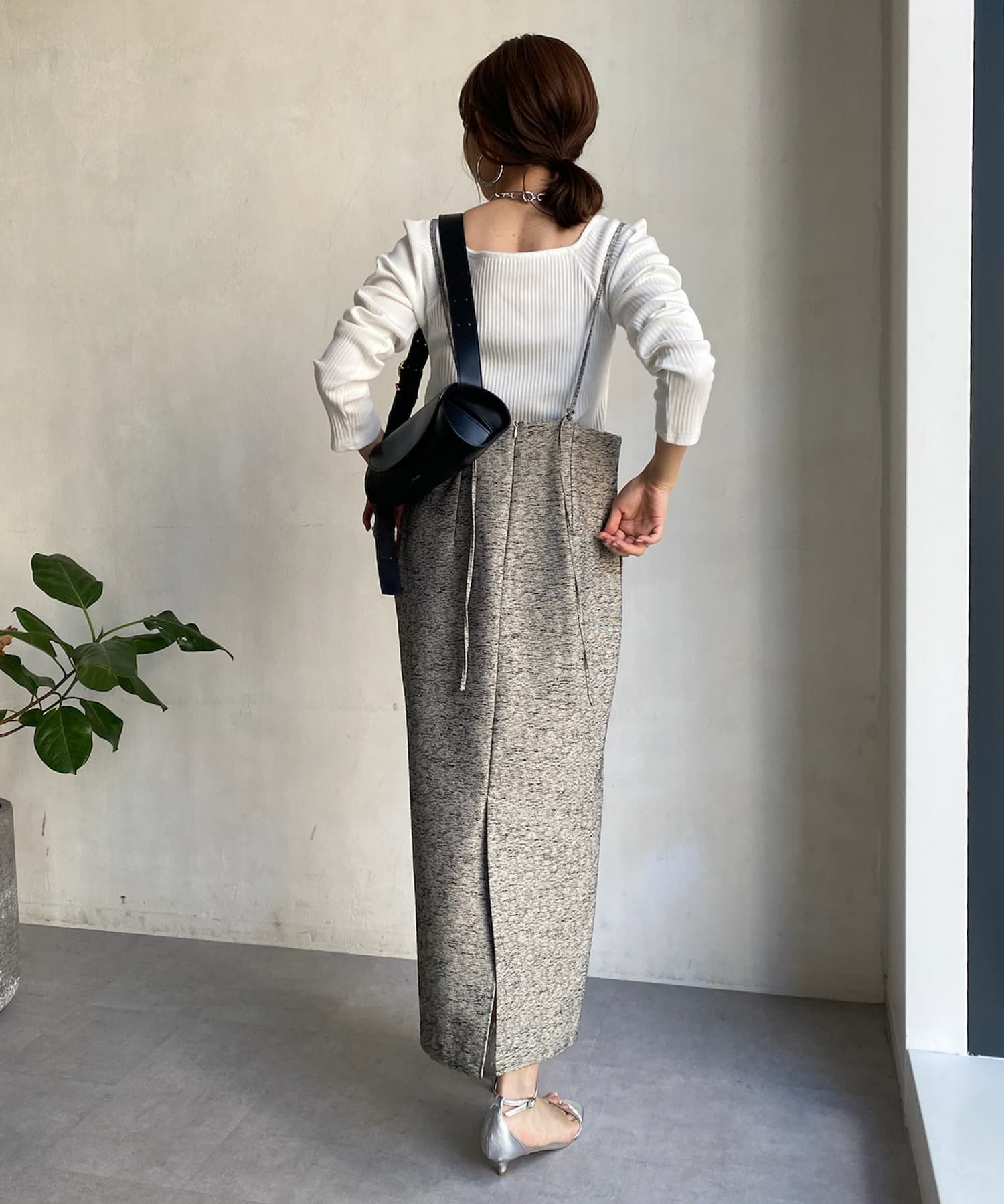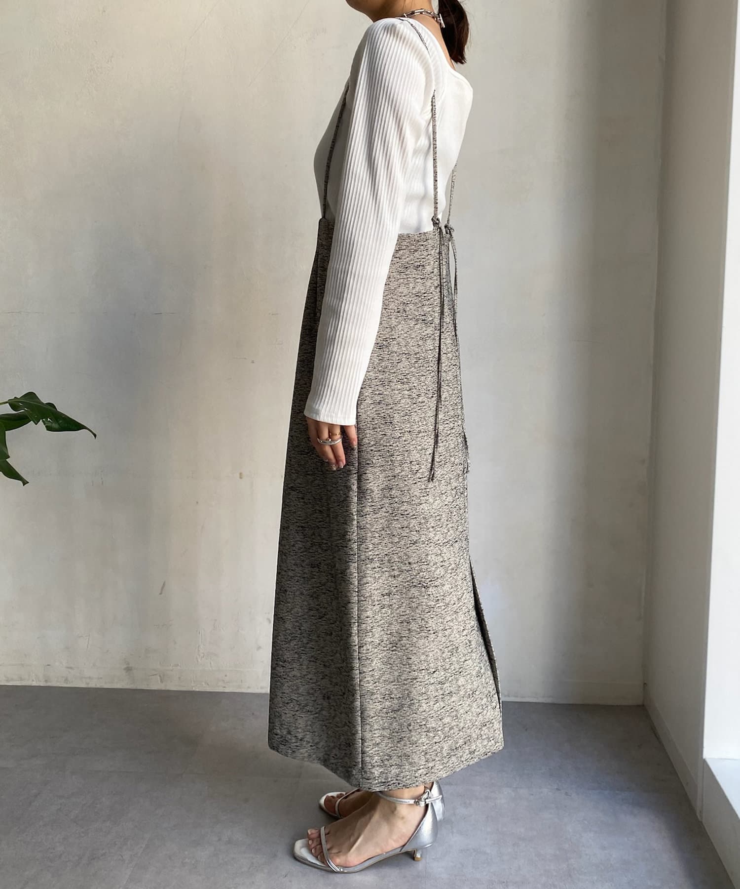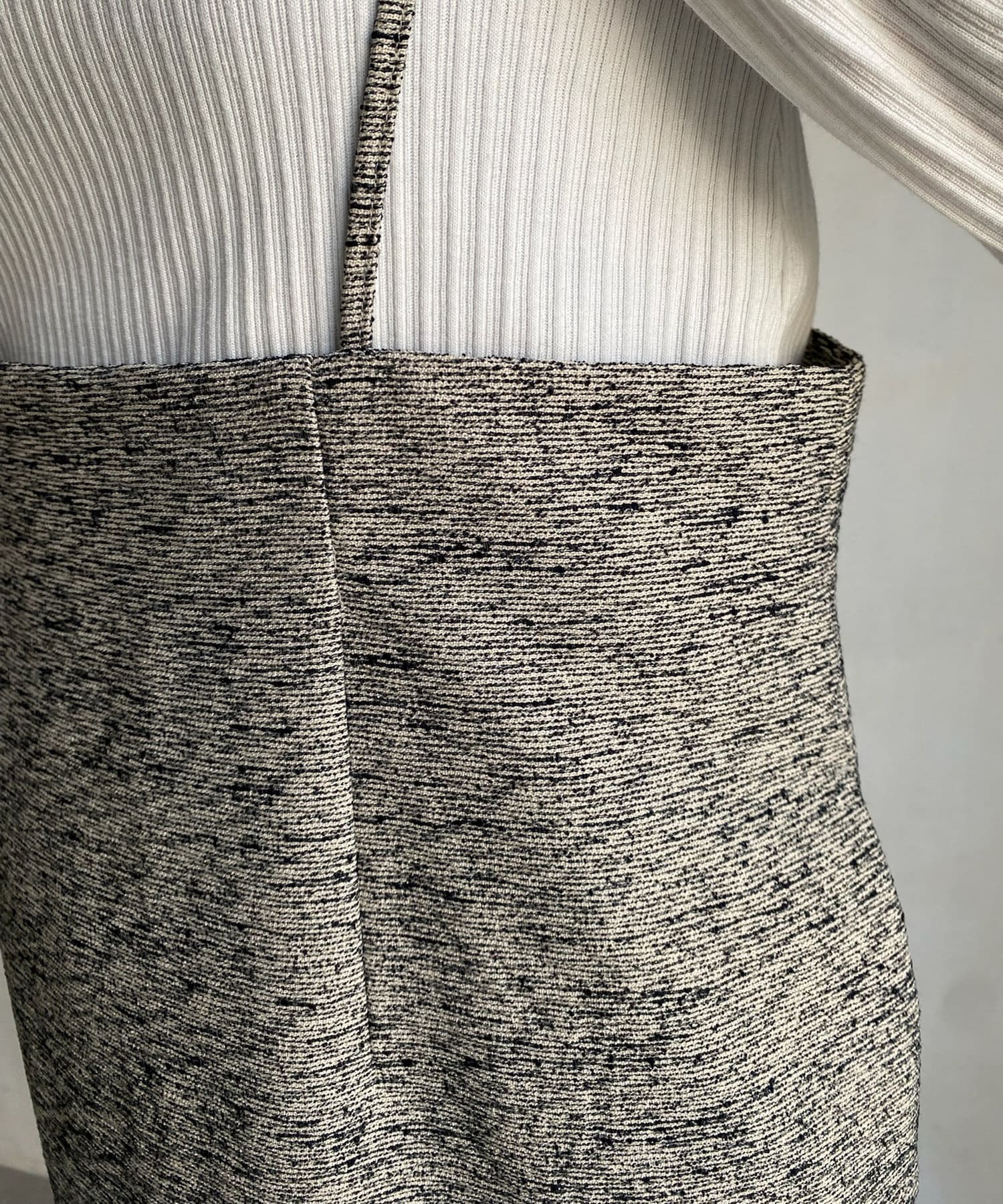 ツイード生地が大人の印象にしてくれるサスペンダー付きのスカート!