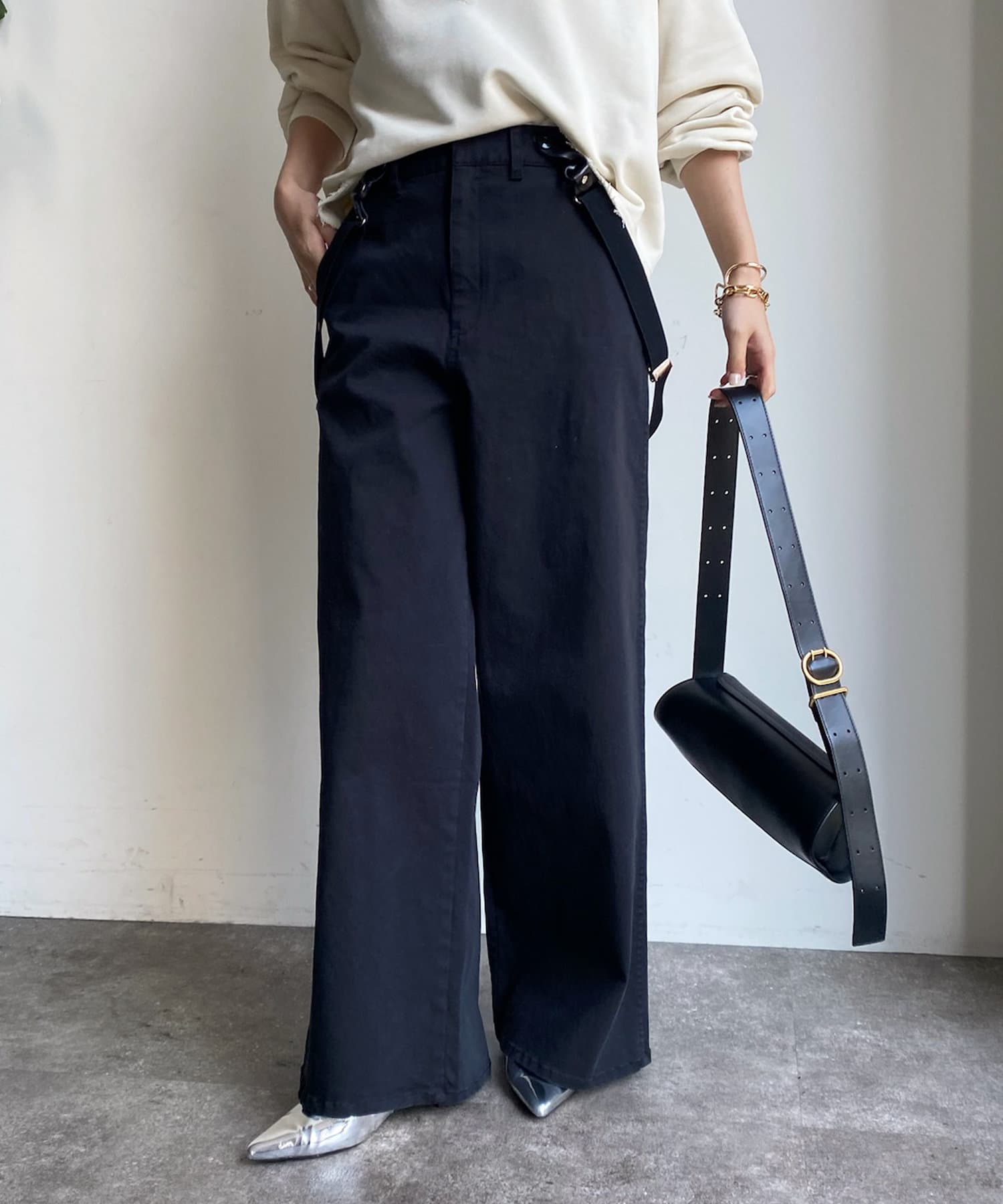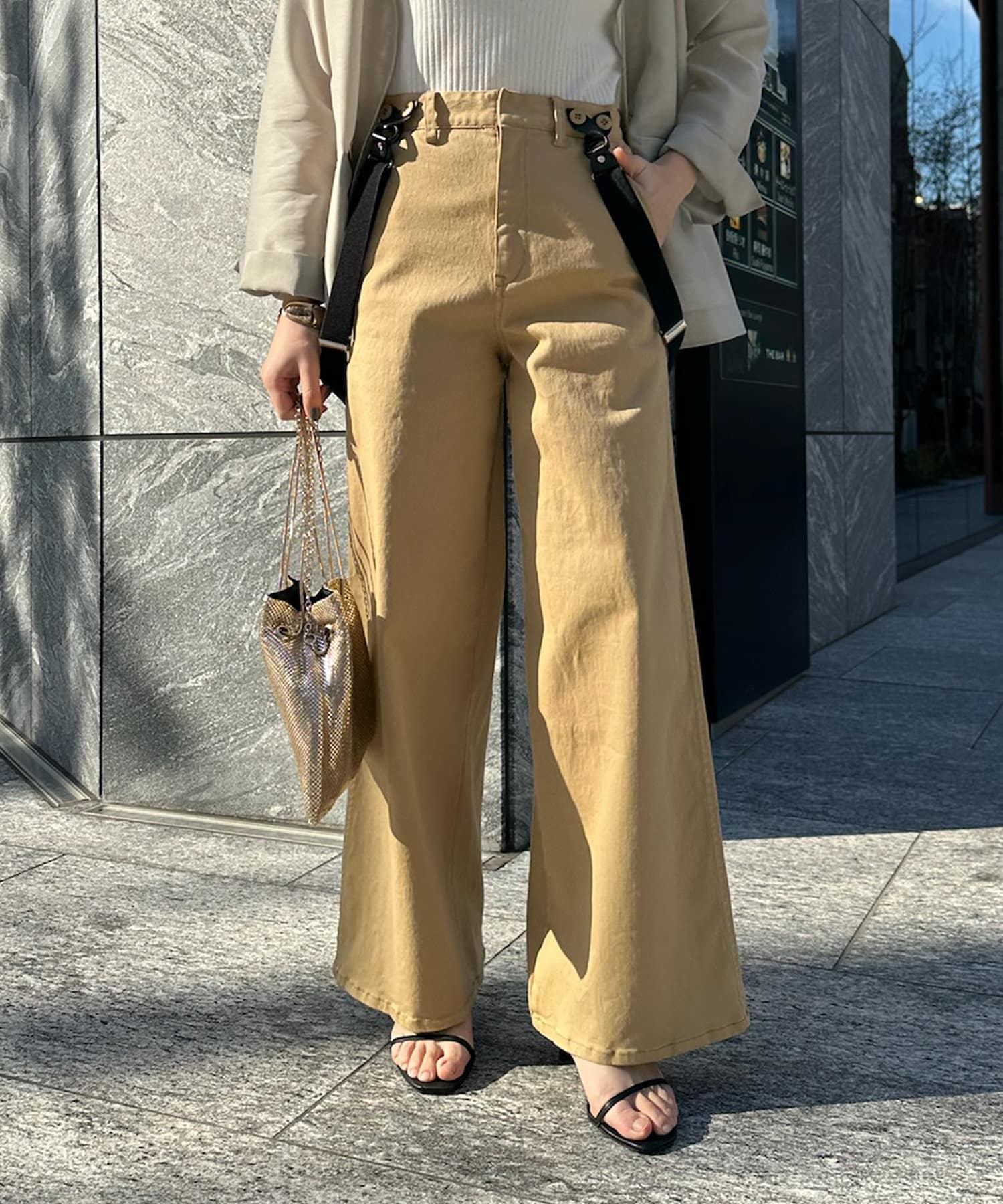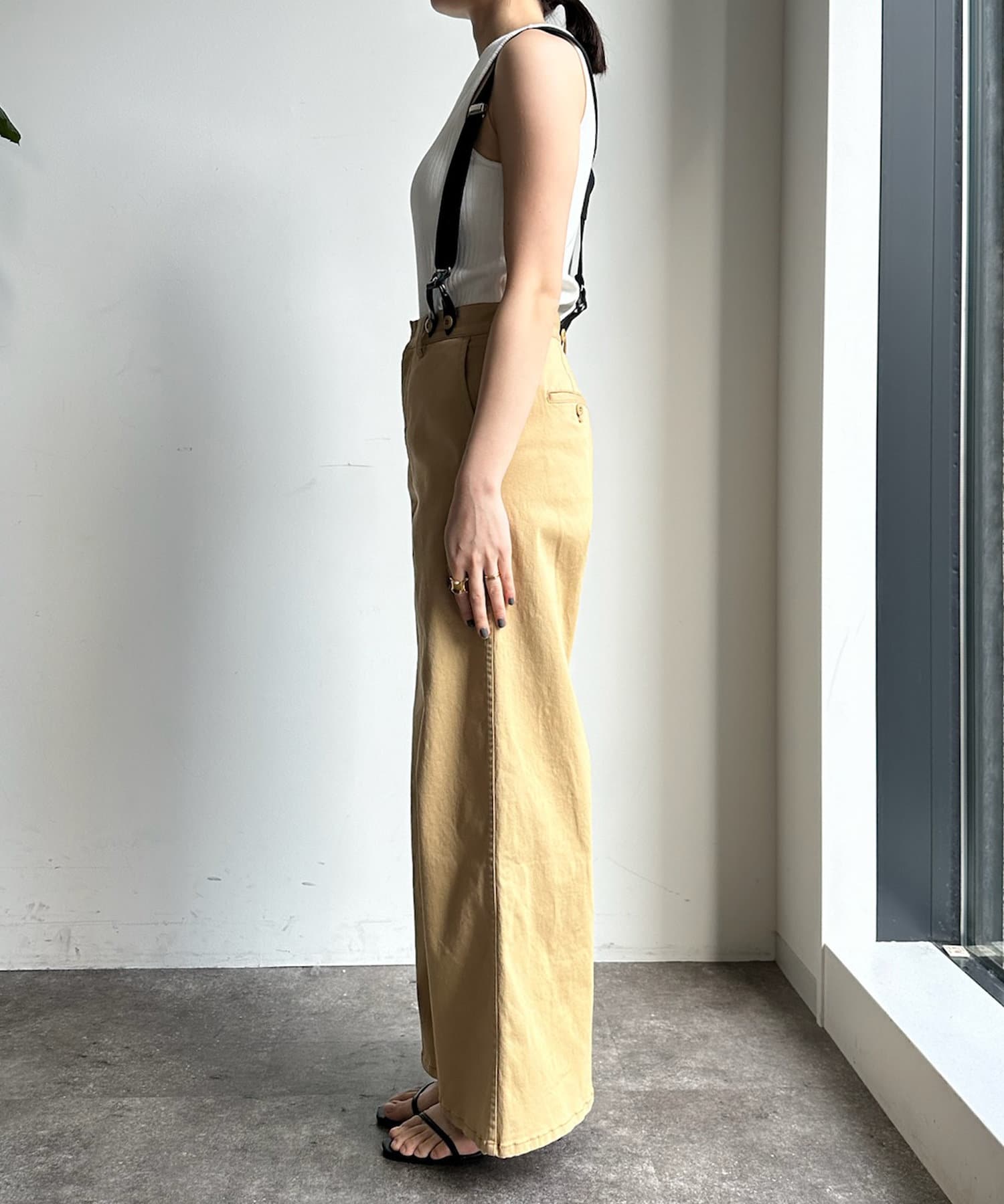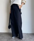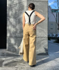 ワイドシルエットながらも大人顔で着こなせるサスペンダー付きパンツ