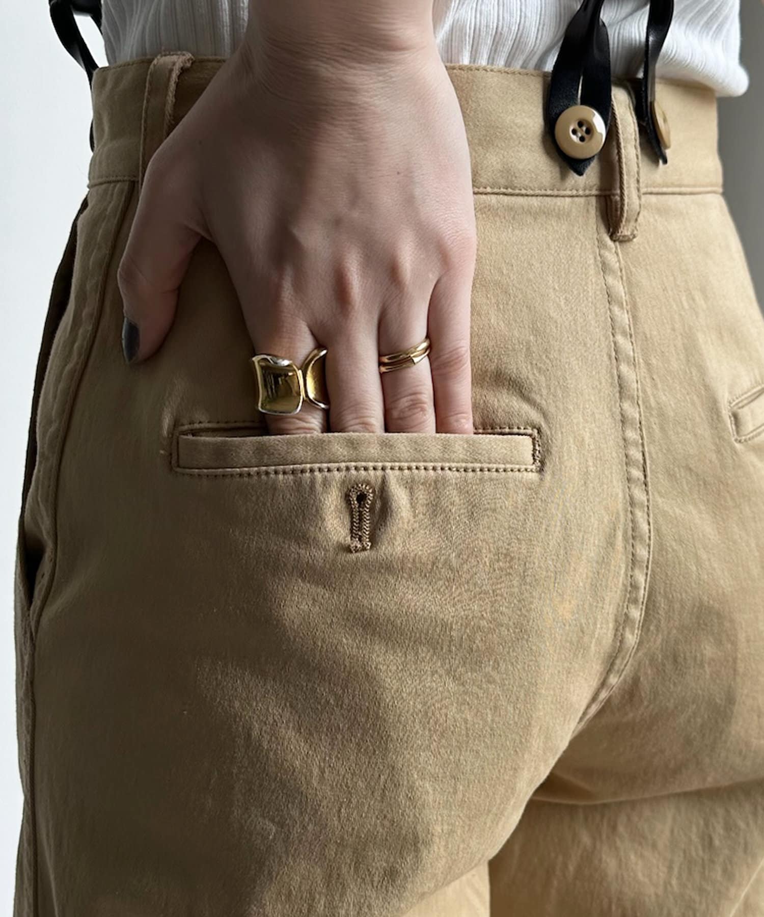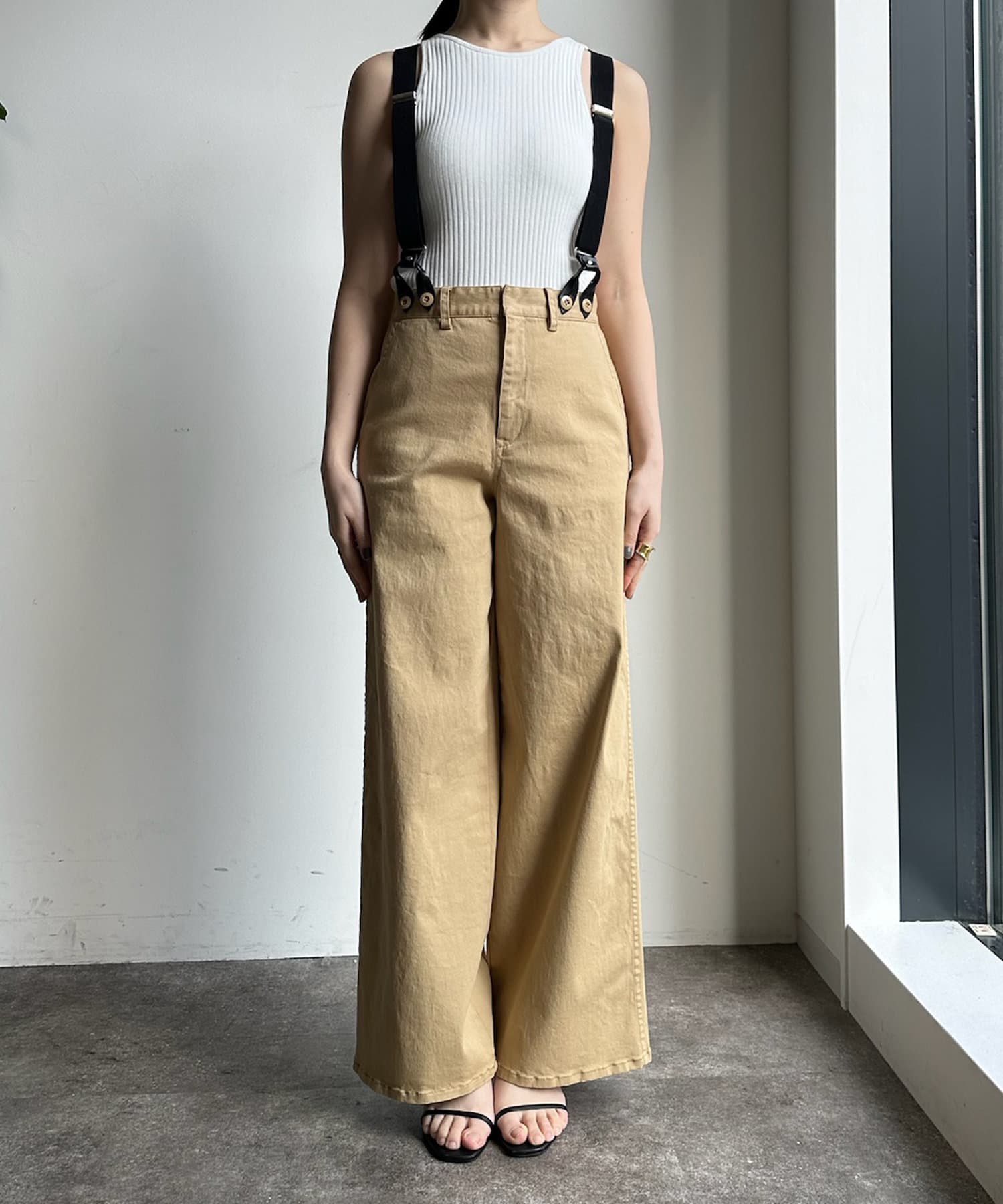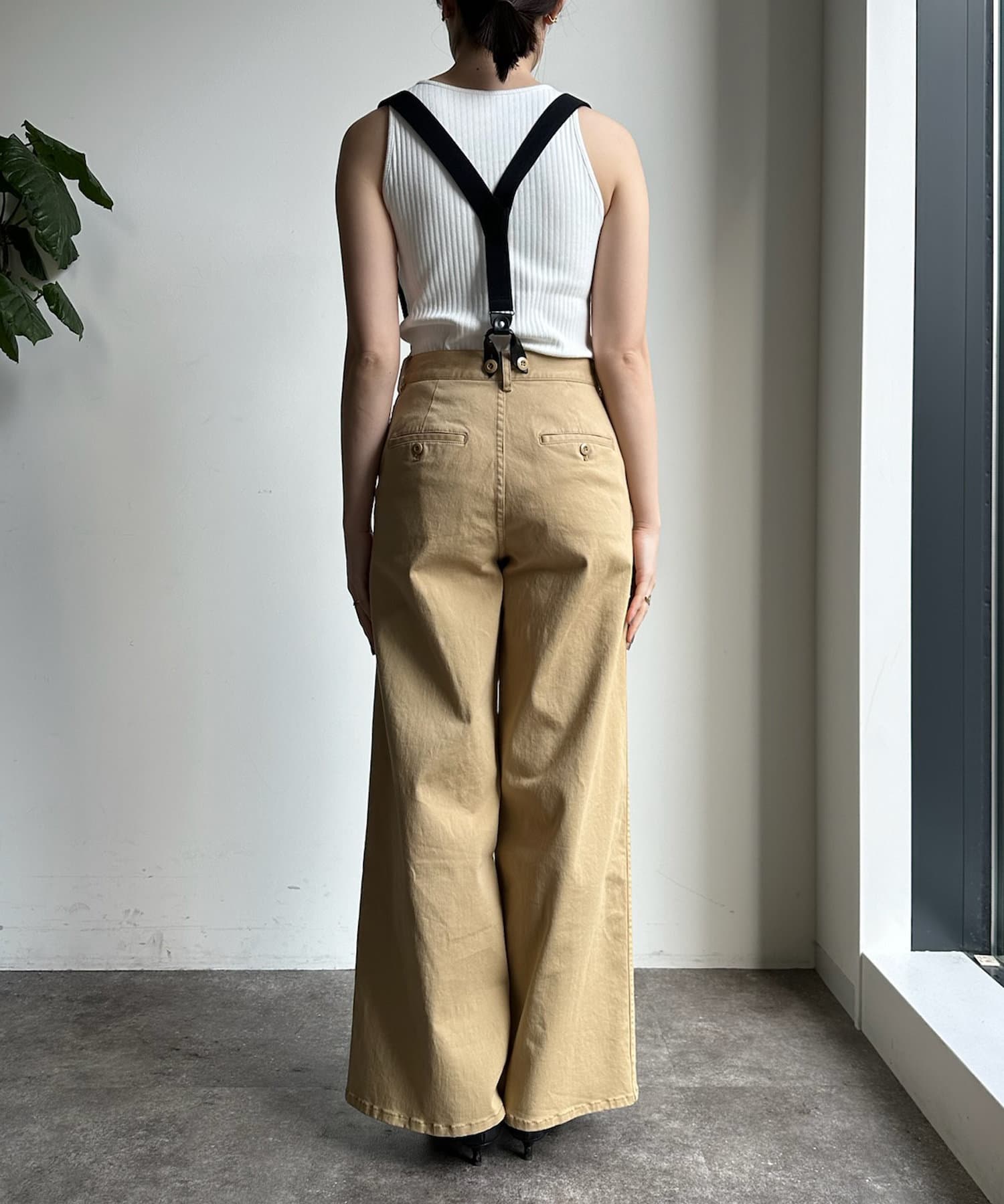 トレンド感のあるサスペンダー付きパンツ。