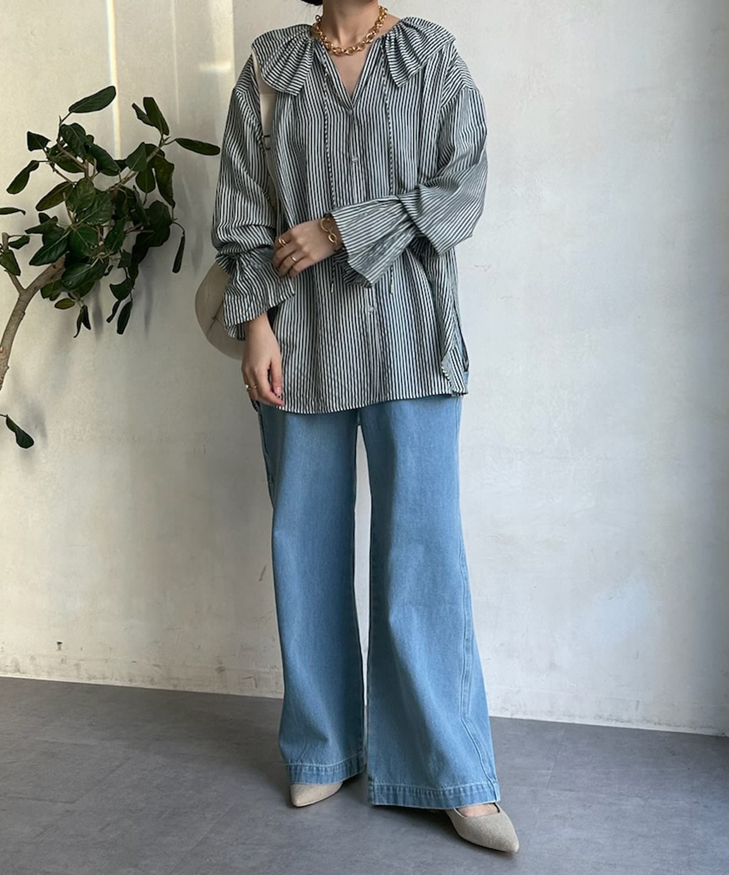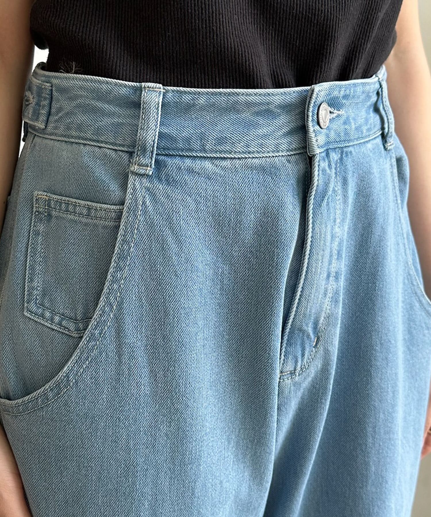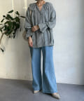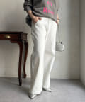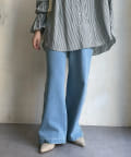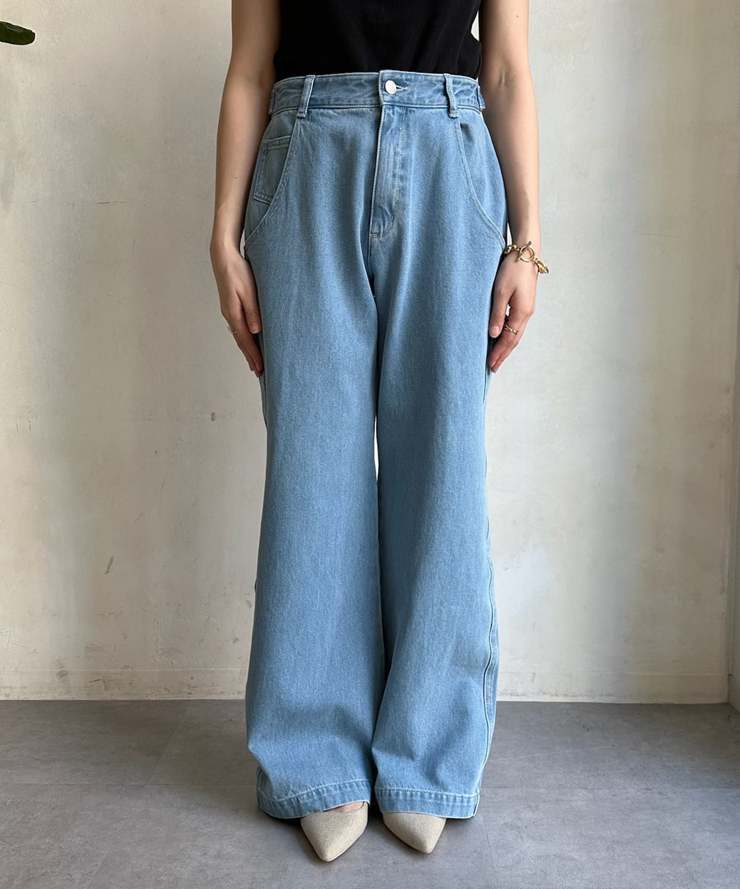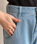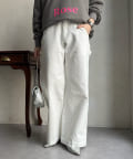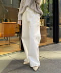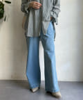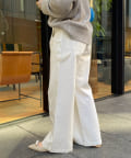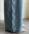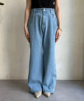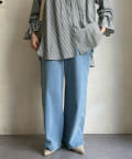 落ち感のあるデニム素材でワイドなシルエットながらも女性らしく決まるパンツに。