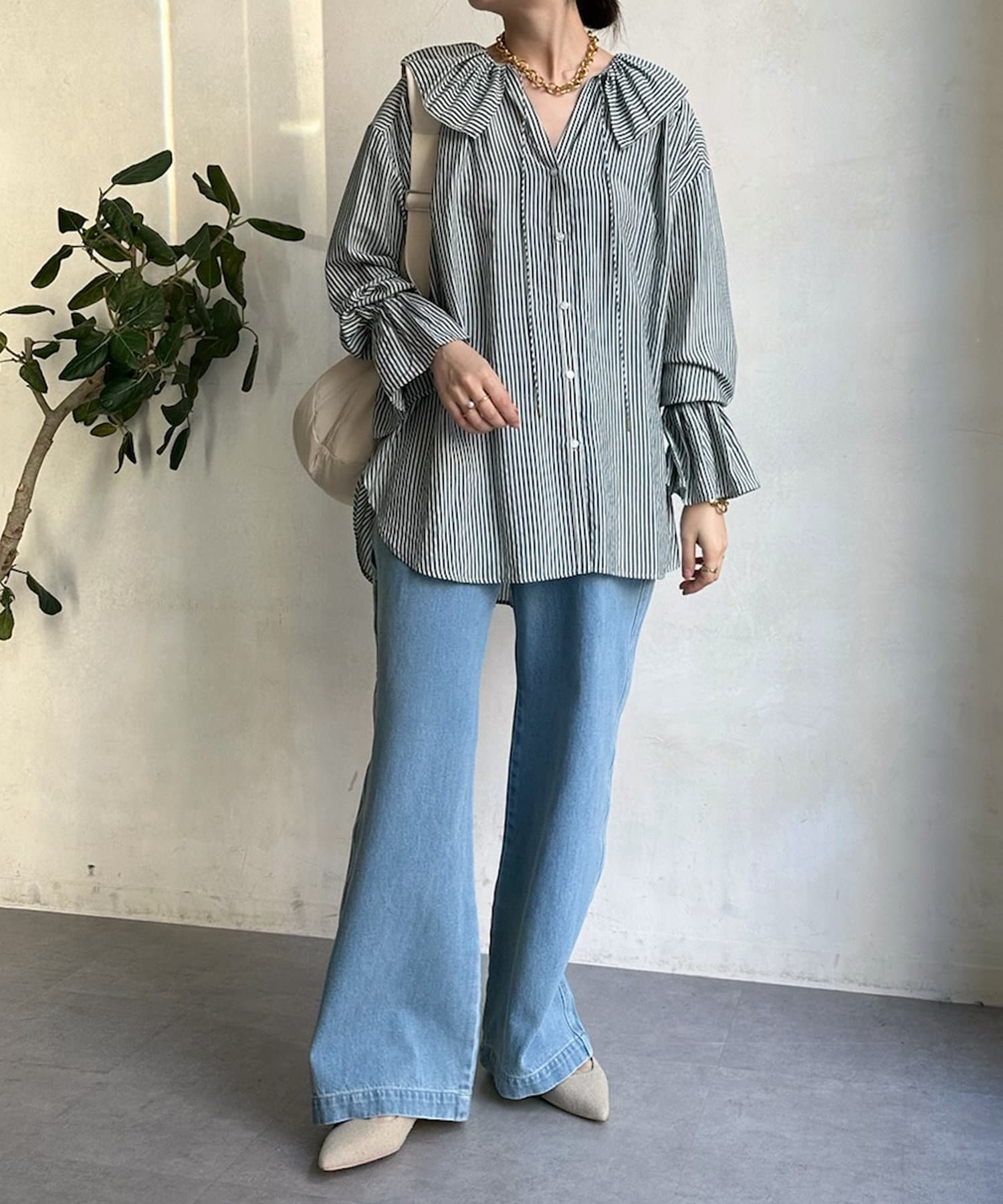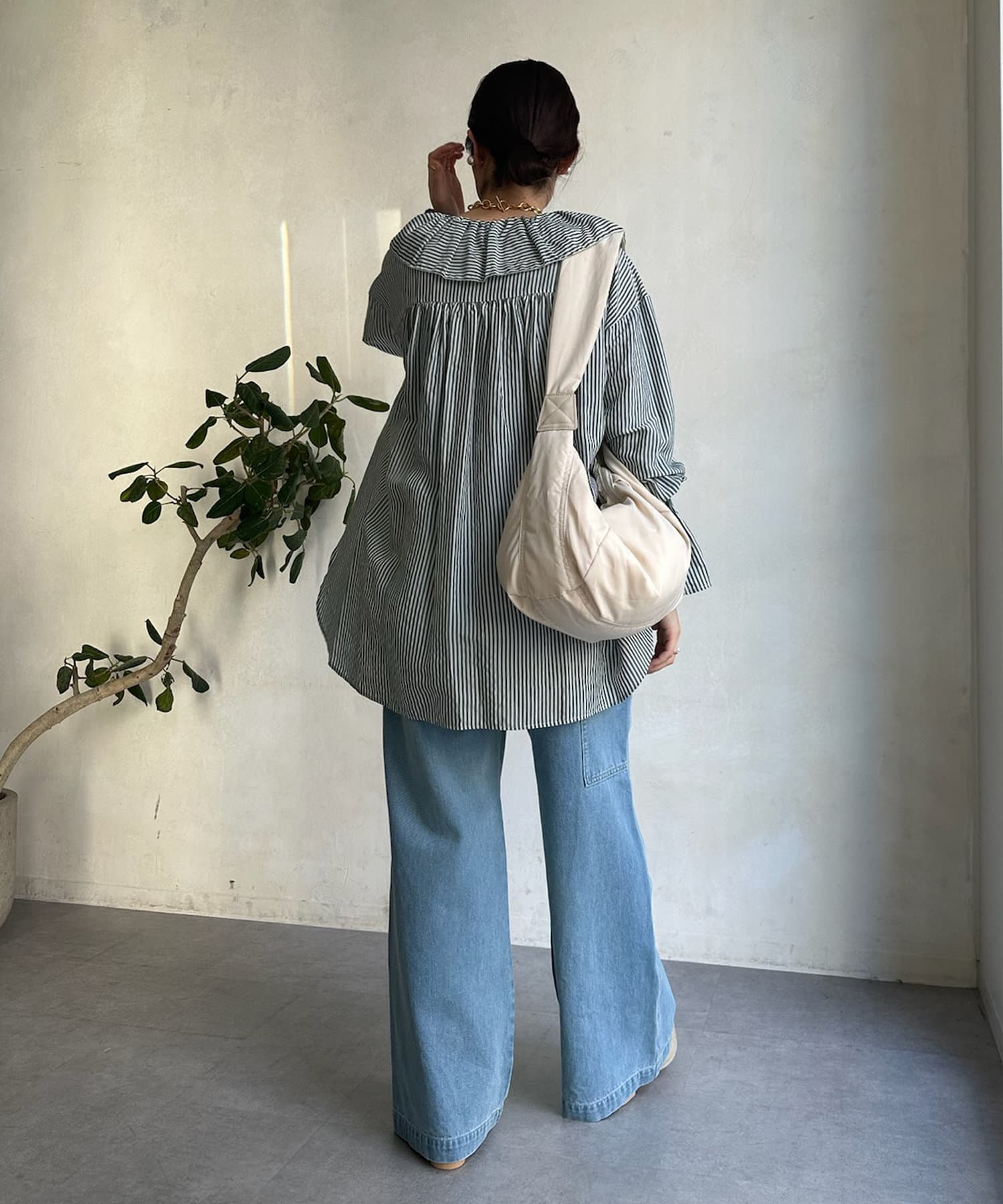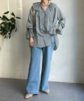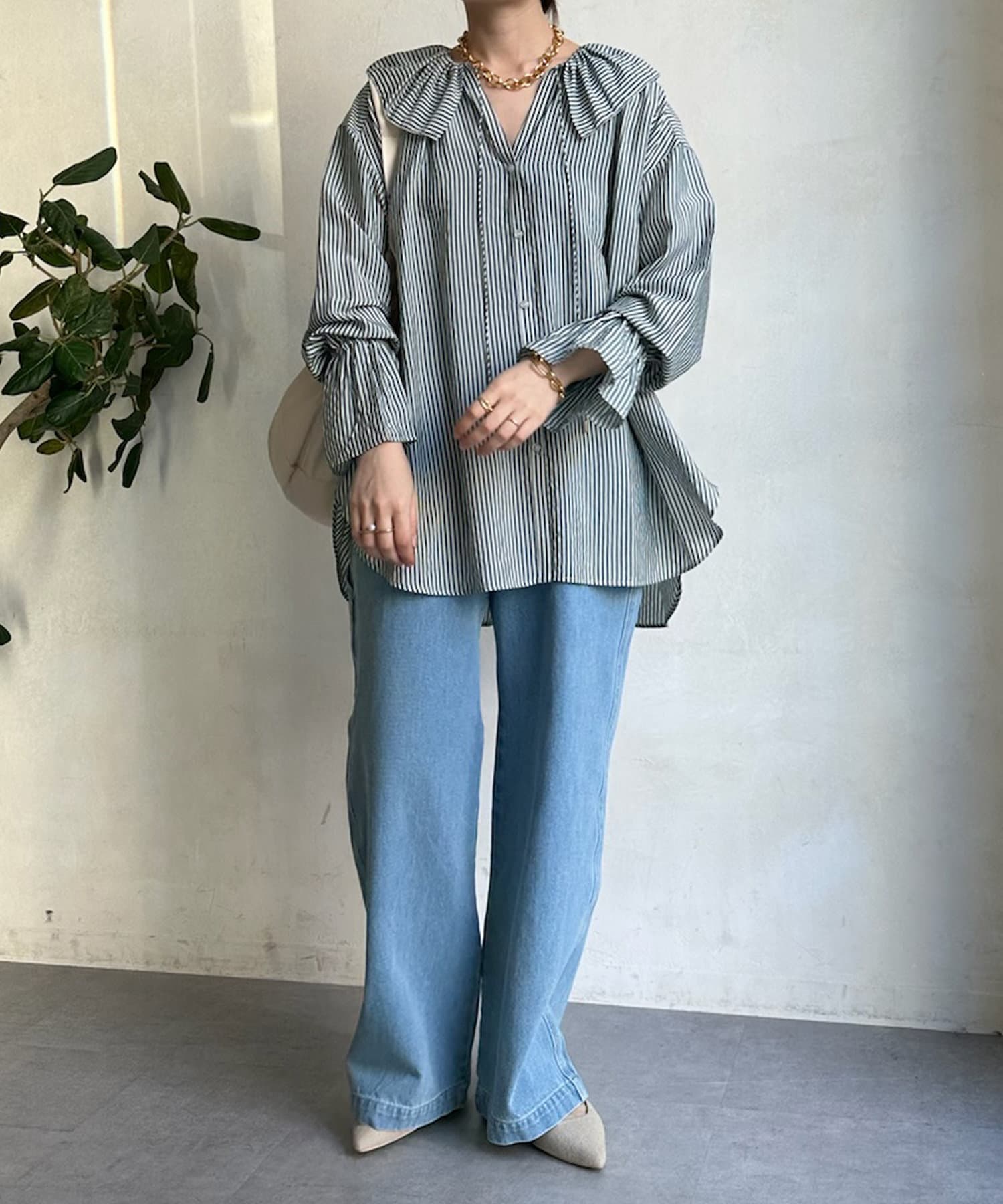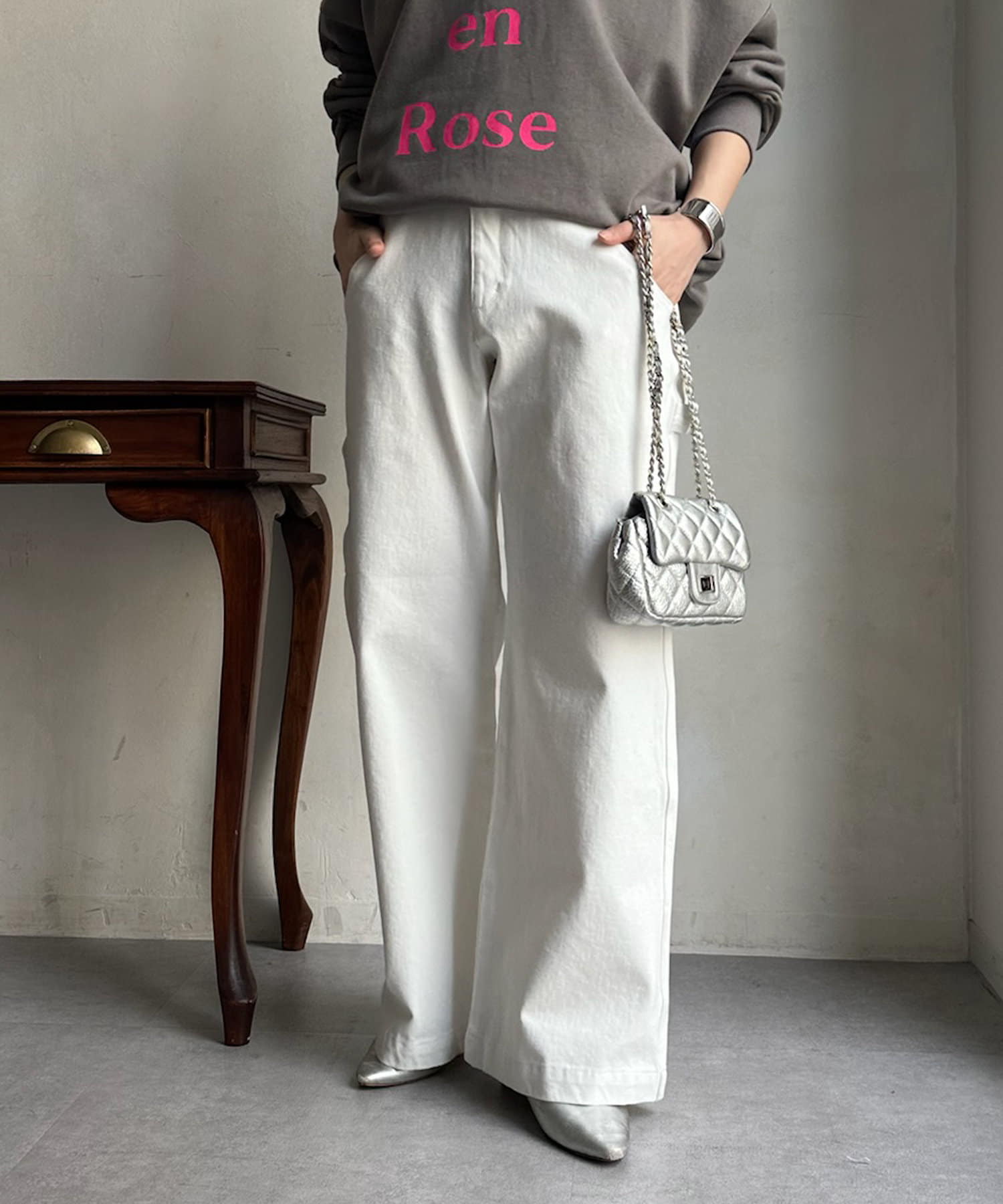 落ち感のあるデニム素材でワイドなシルエットながらも女性らしく決まるパンツに。