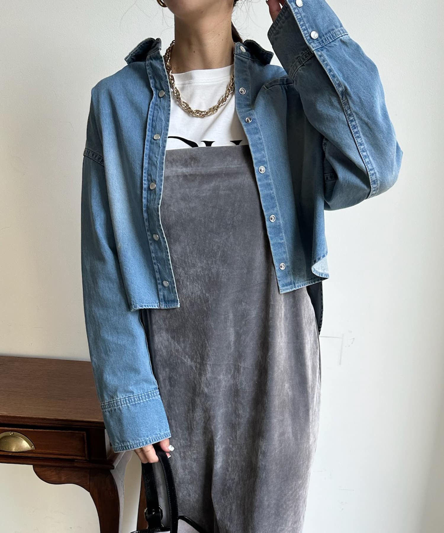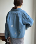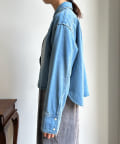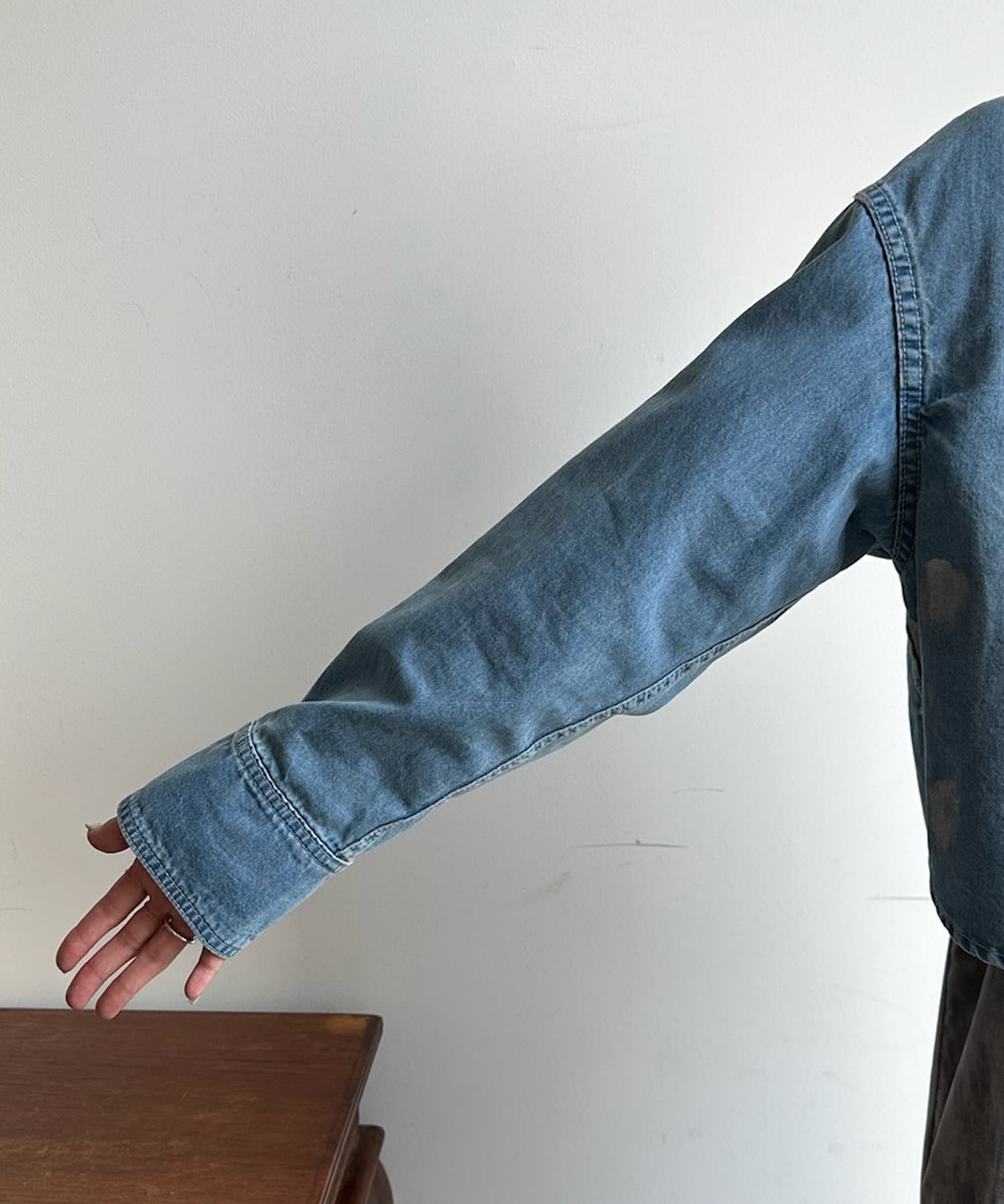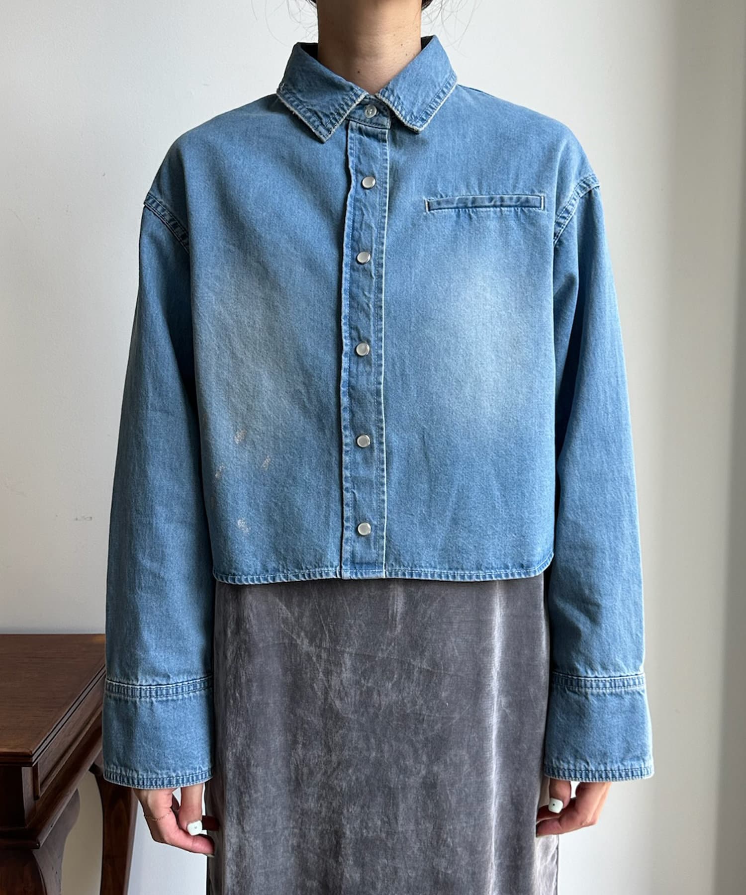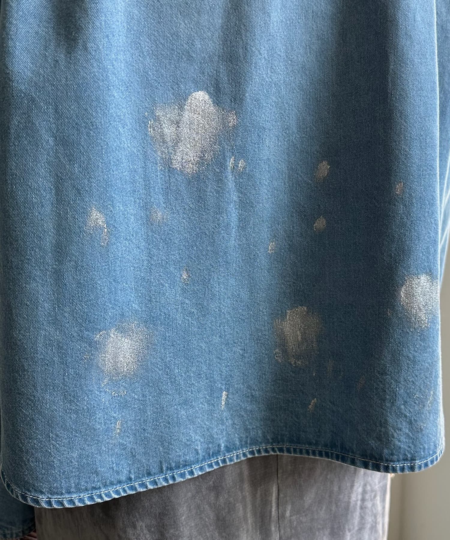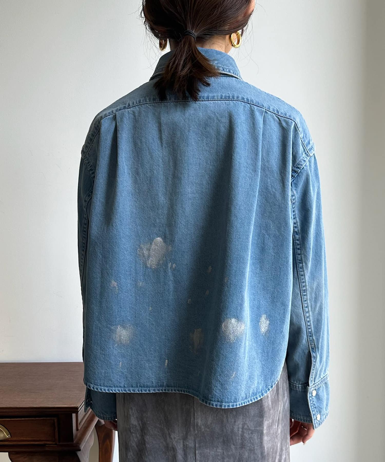 ショート丈に仕上げた柔らかなデニムシャツに、箔ペイントのデザインをプラスした1着。
