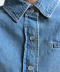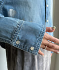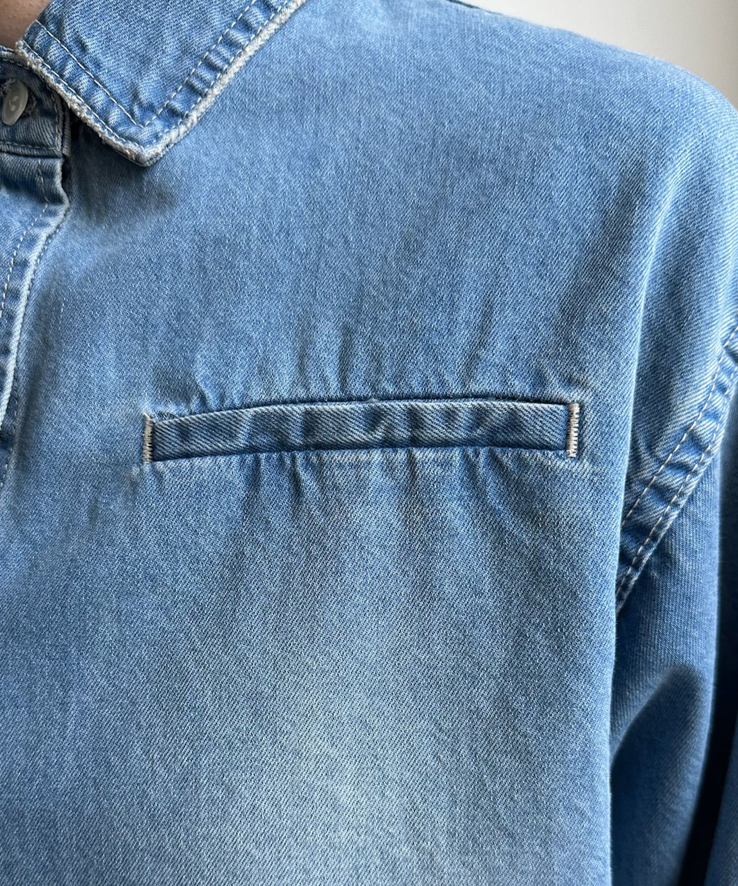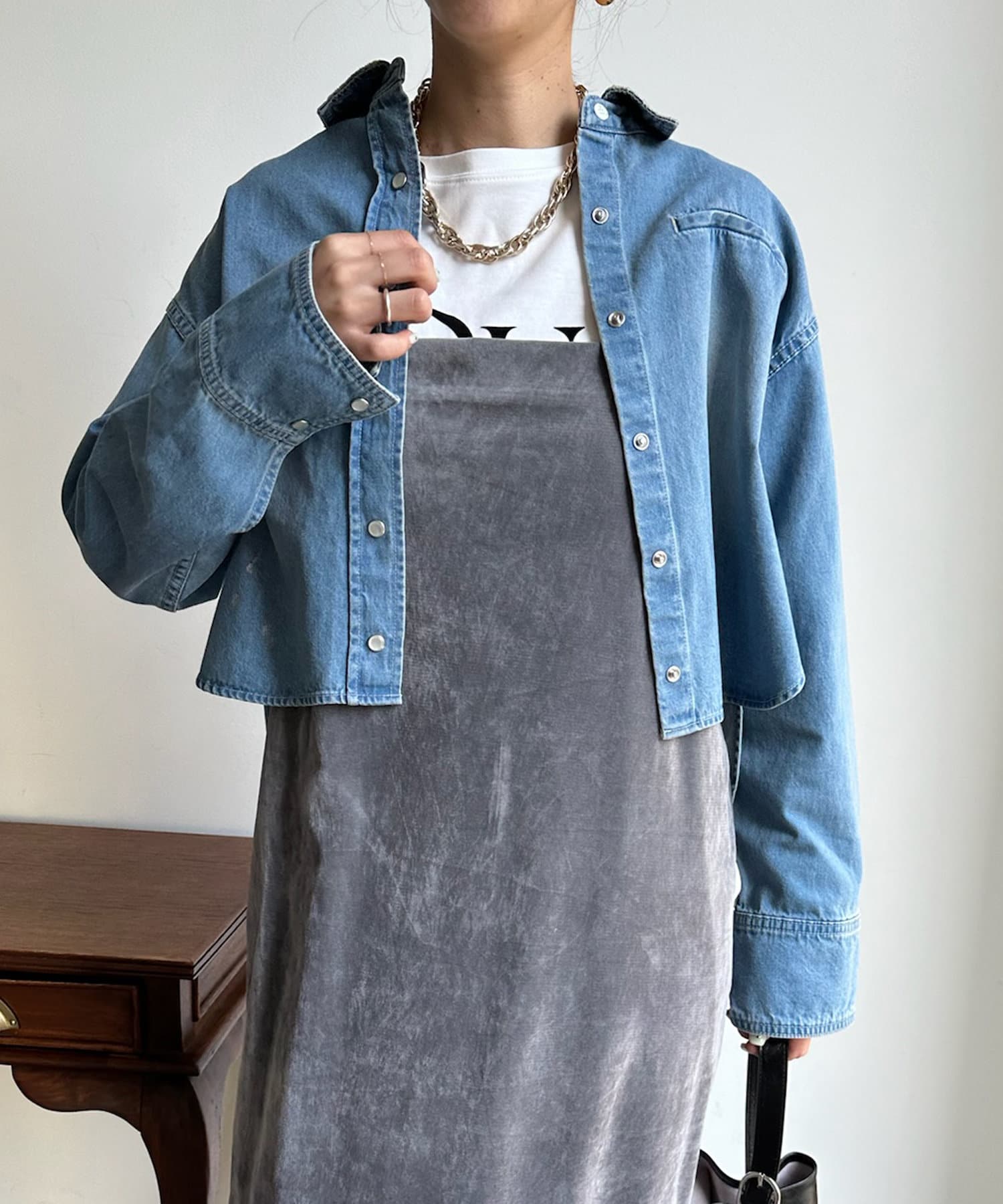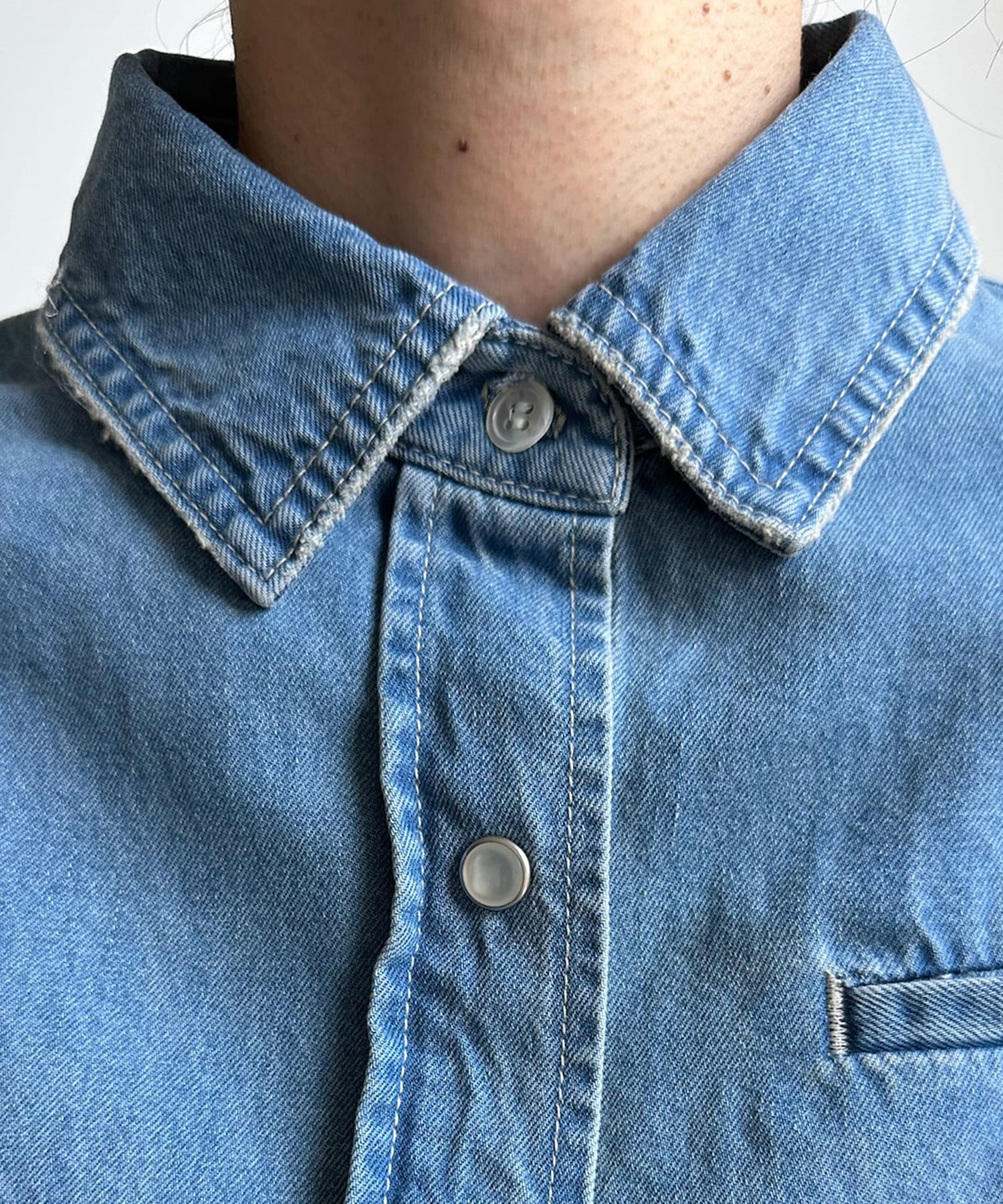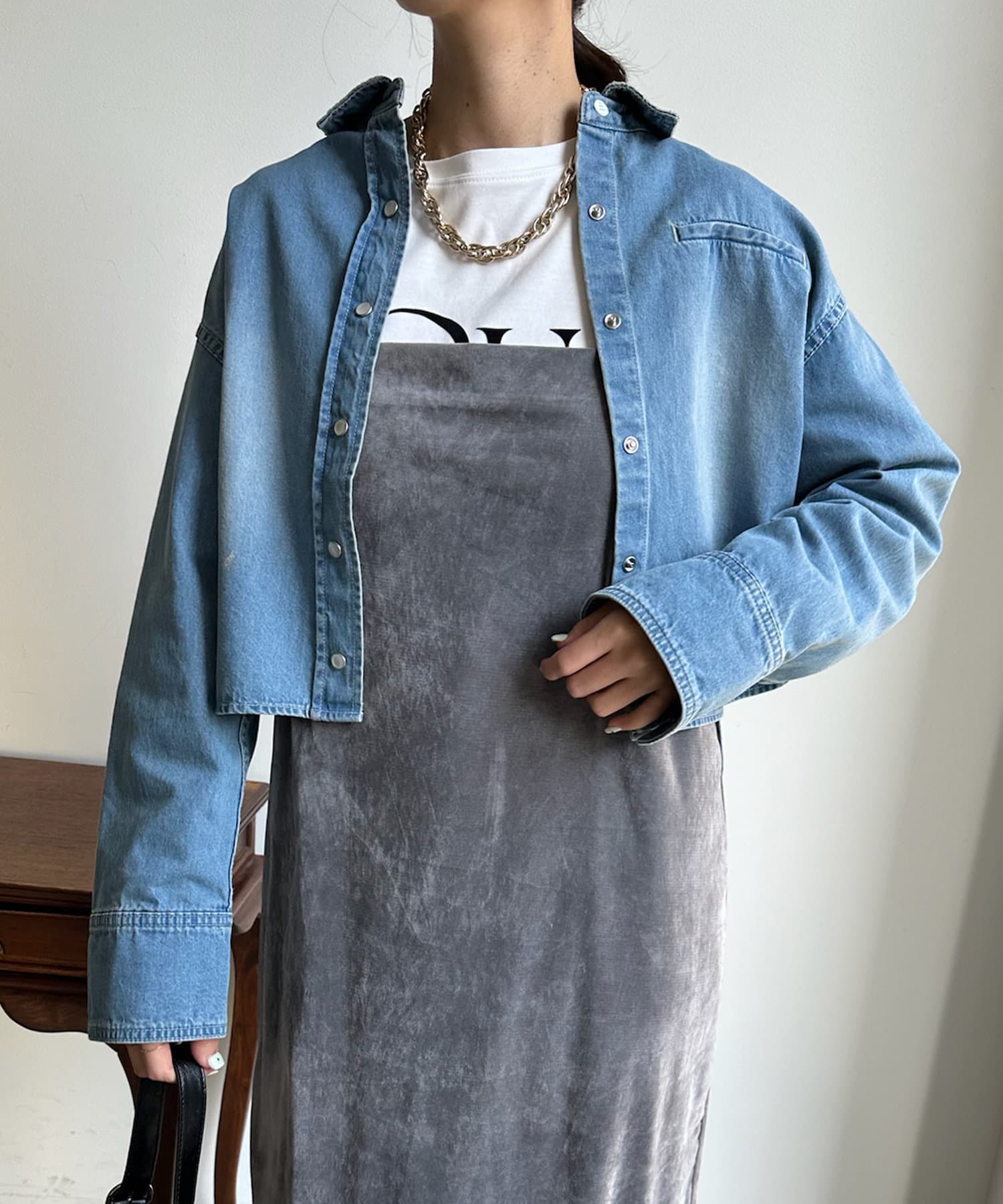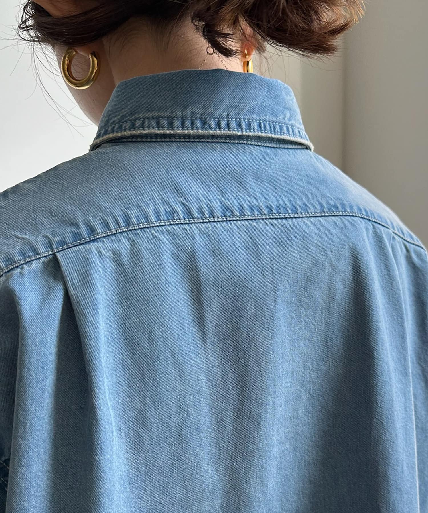 ショート丈に仕上げた柔らかなデニムシャツに、箔ペイントのデザインをプラスした1着。