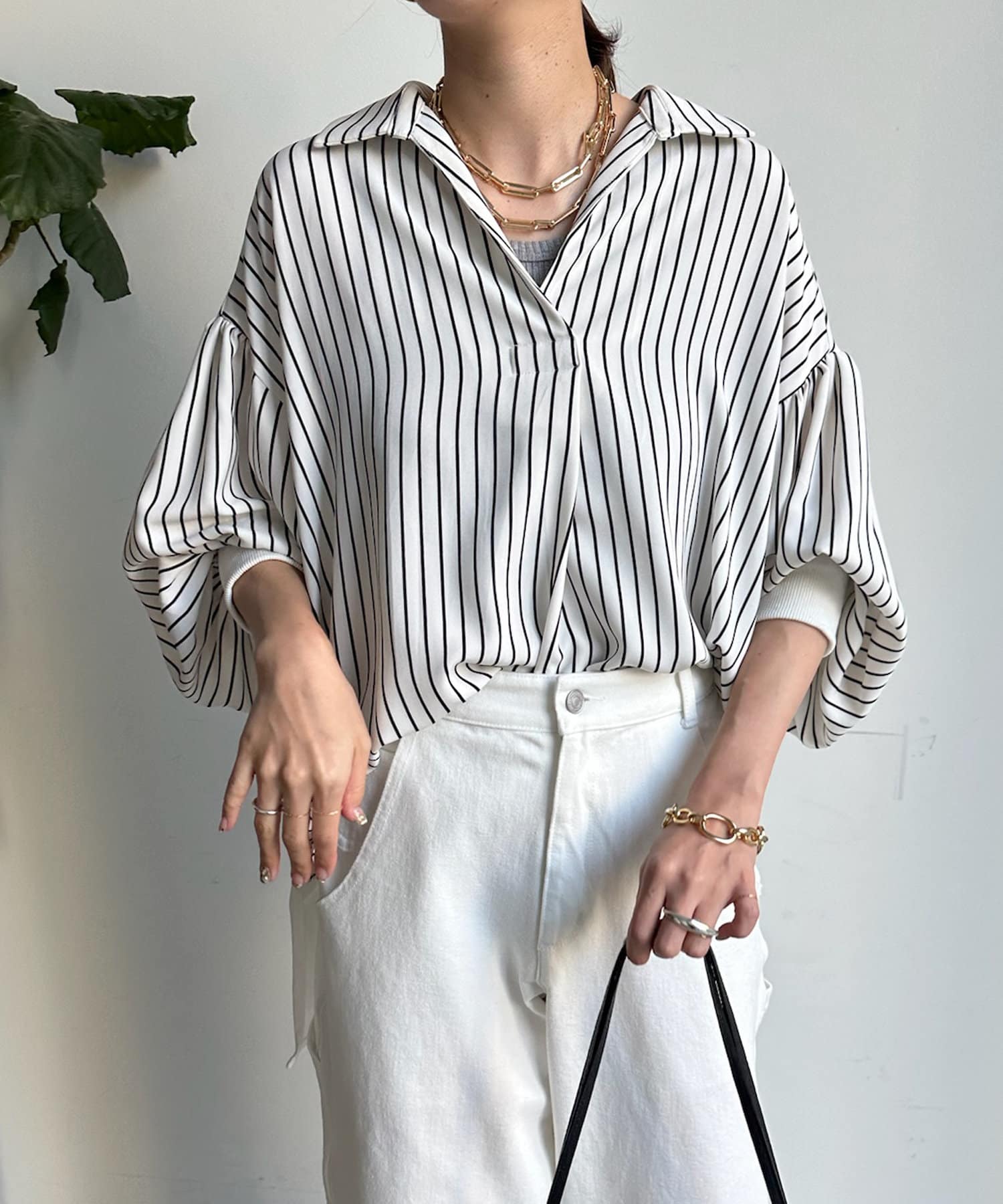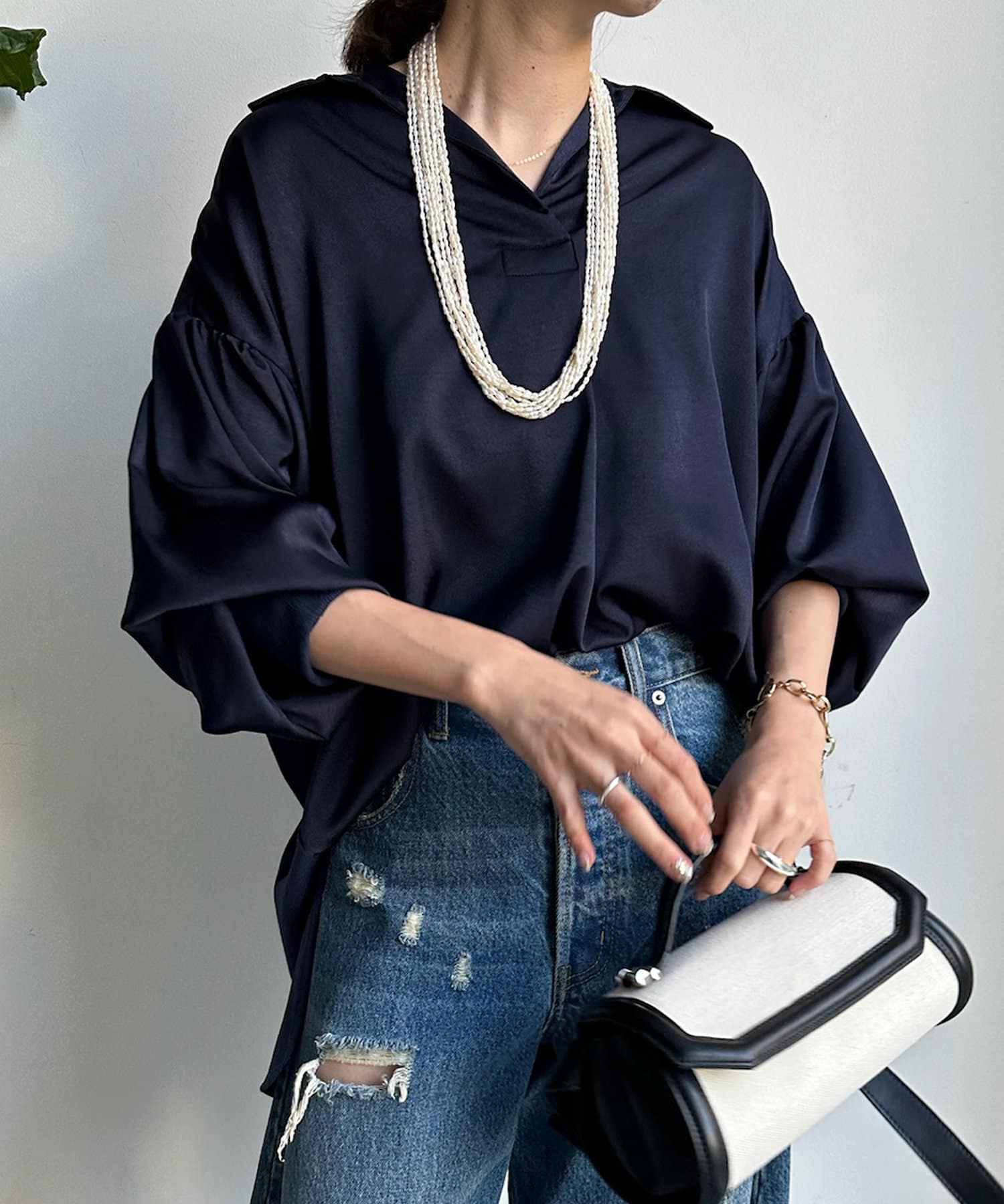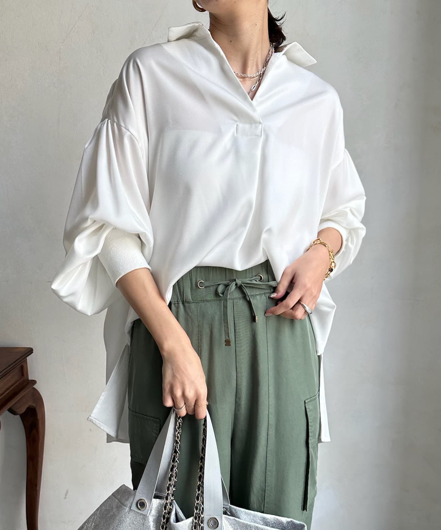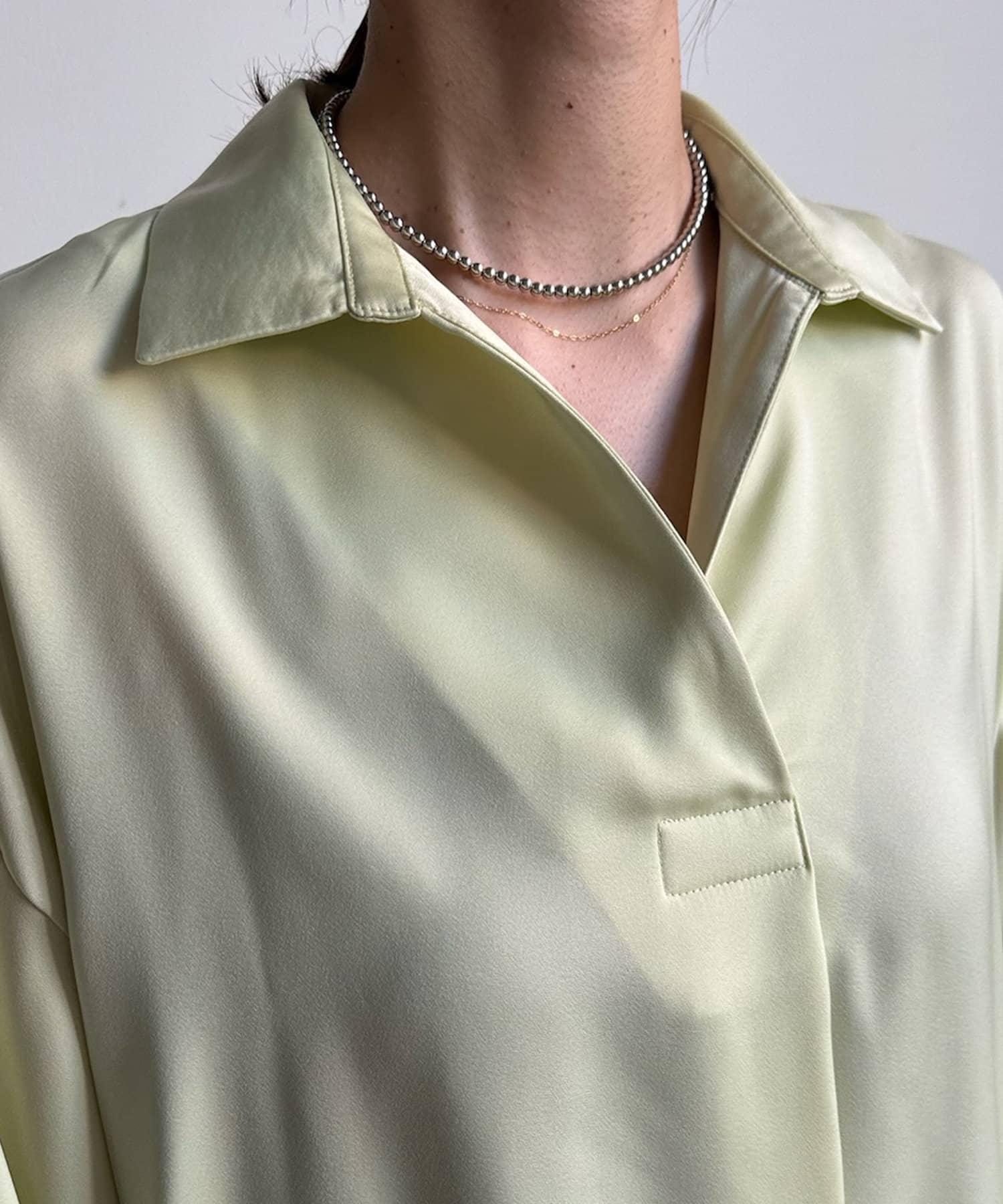 首元のスキッパーデザインは大人な雰囲気を醸し、ショートネックレスなどとも相性抜群。ぜひお手持ちのお気に入りアクセサリー合わせでお楽しみください。