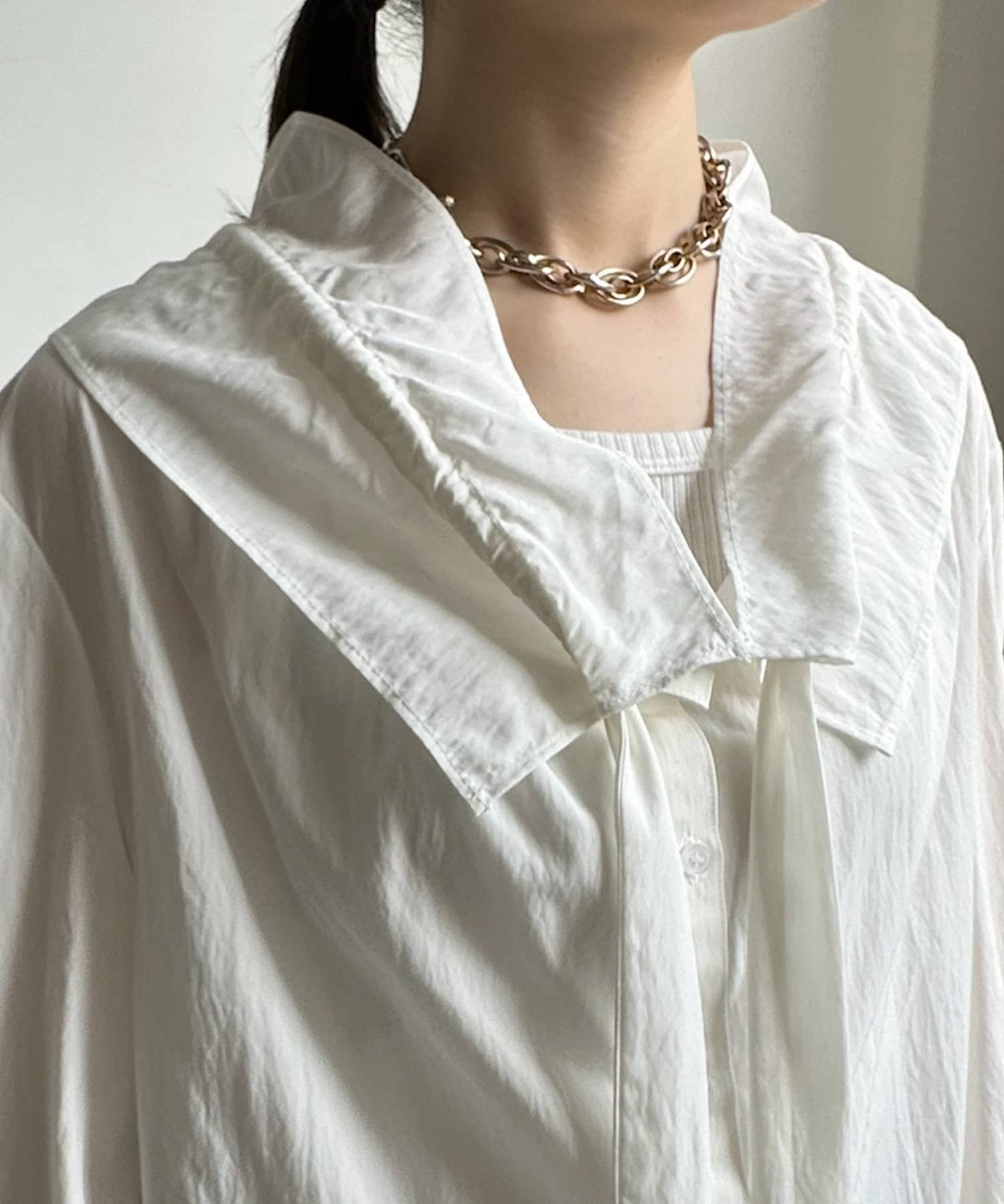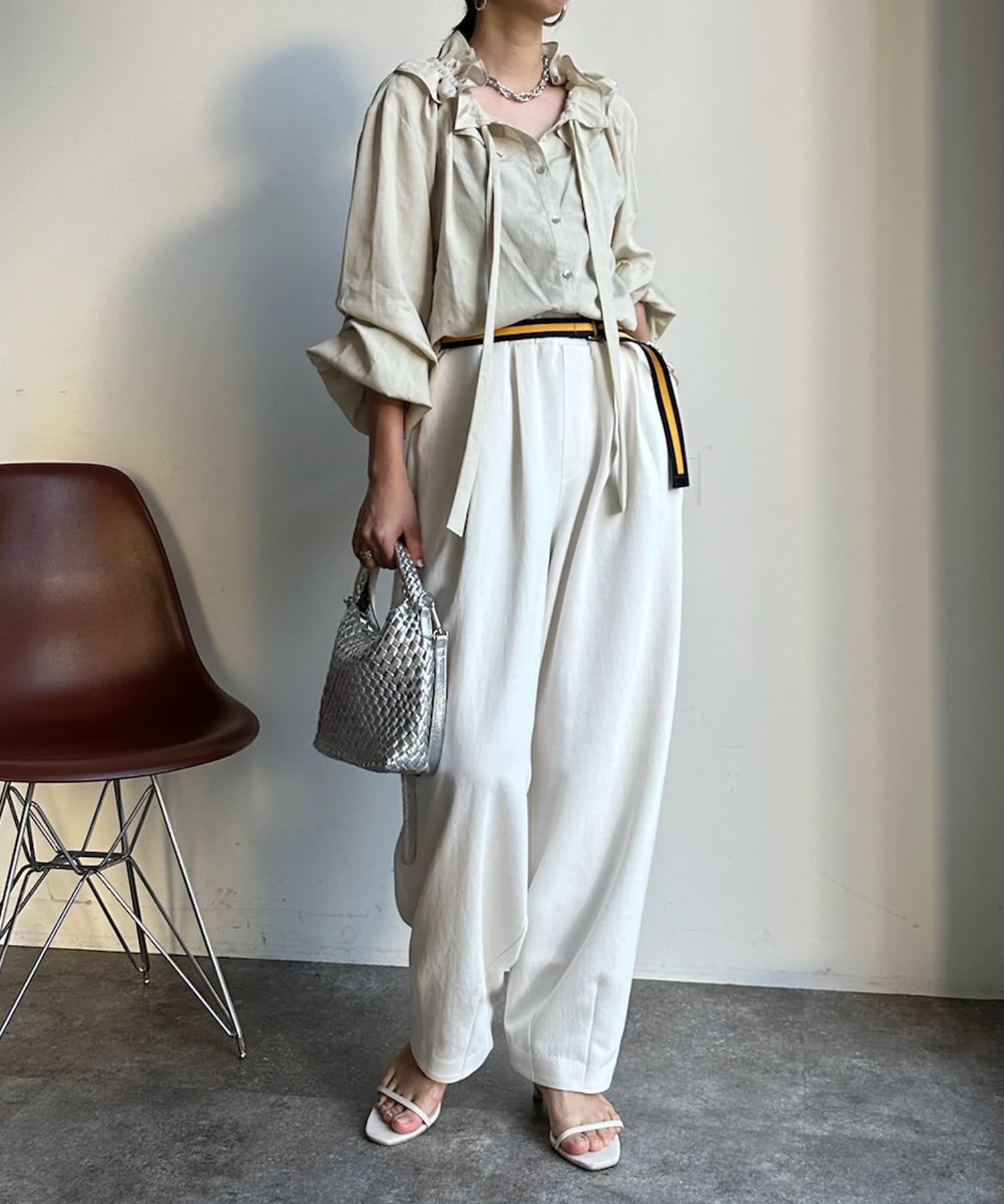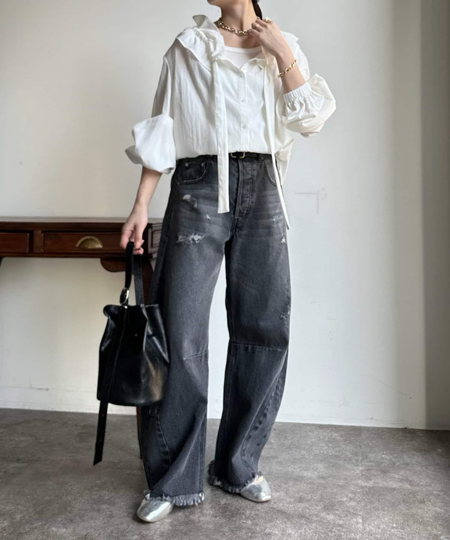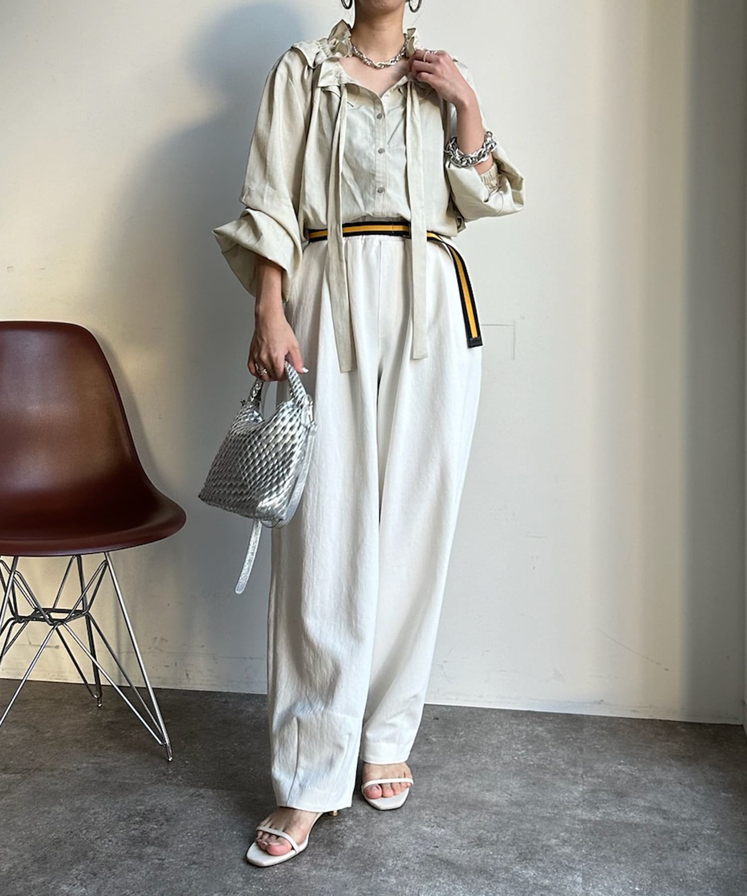 首元をざっくりと開けて、甘くなり過ぎないよう、抜け感をだした着こなしがおすすめ。