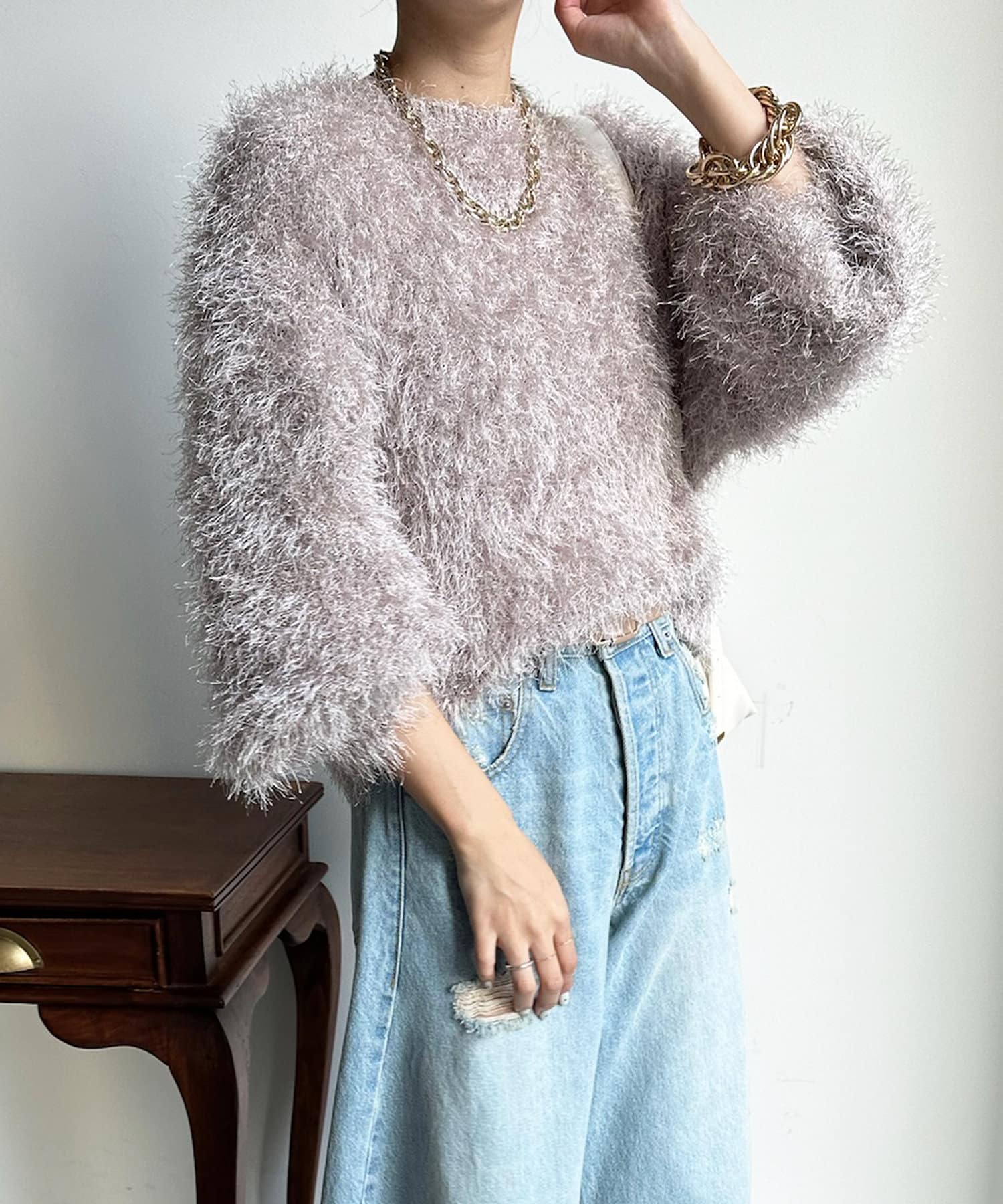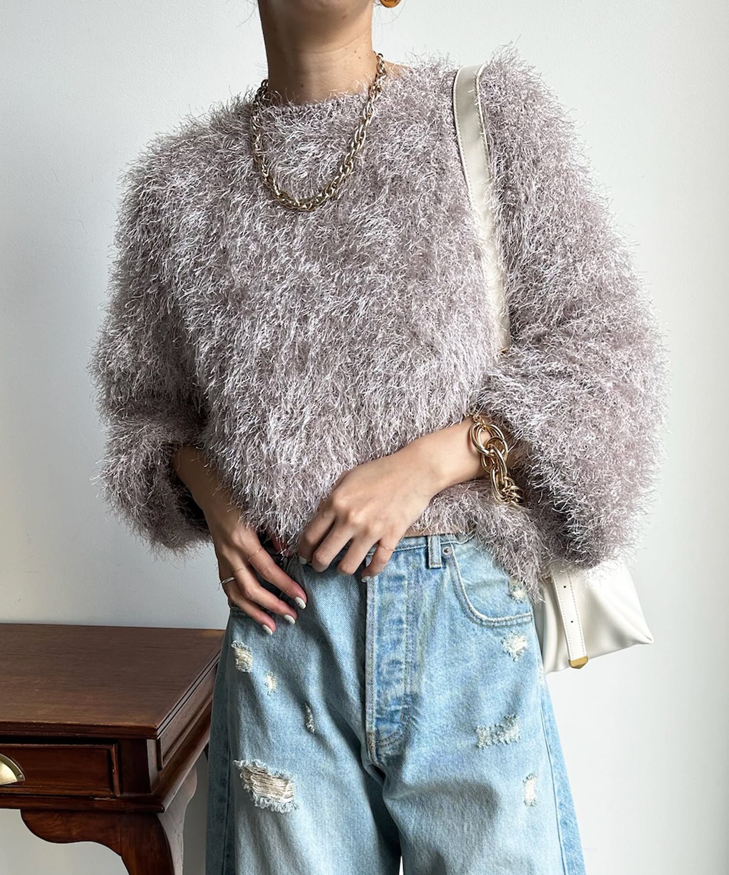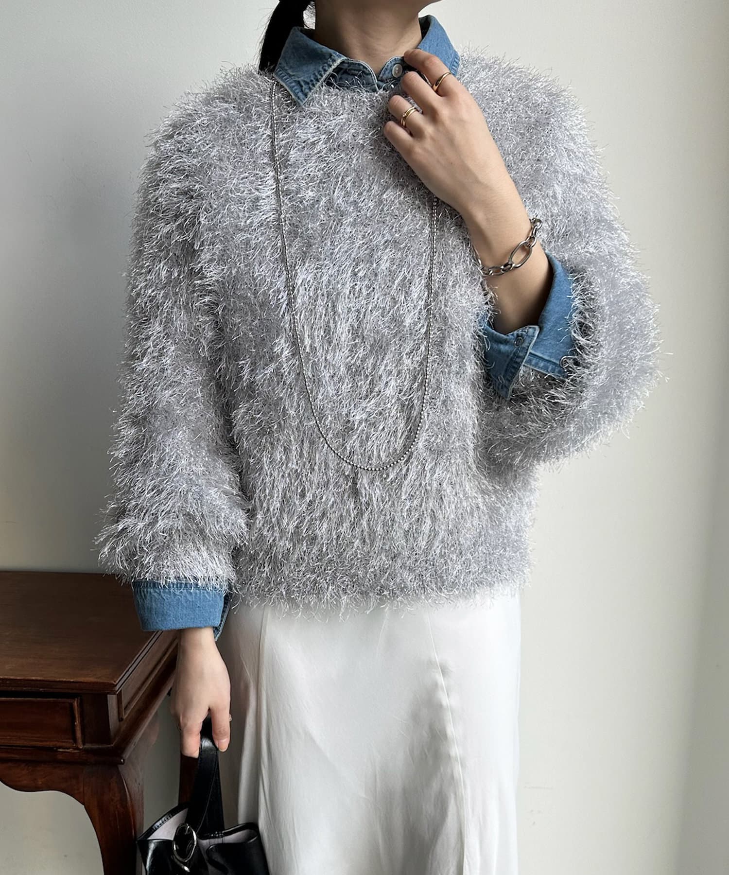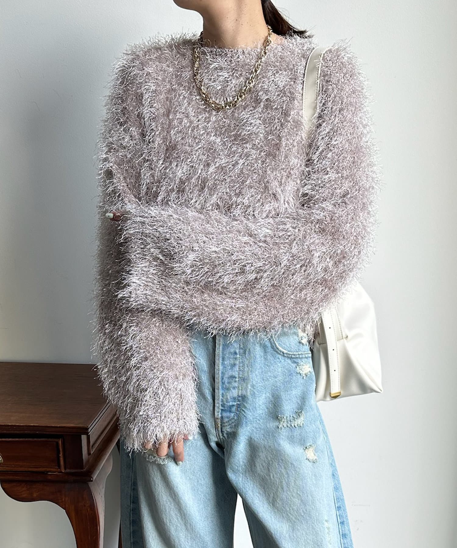 トレンドライクなシャギーニットは、シンプルなボトムに合わせるだけで洗練されたイメージに。