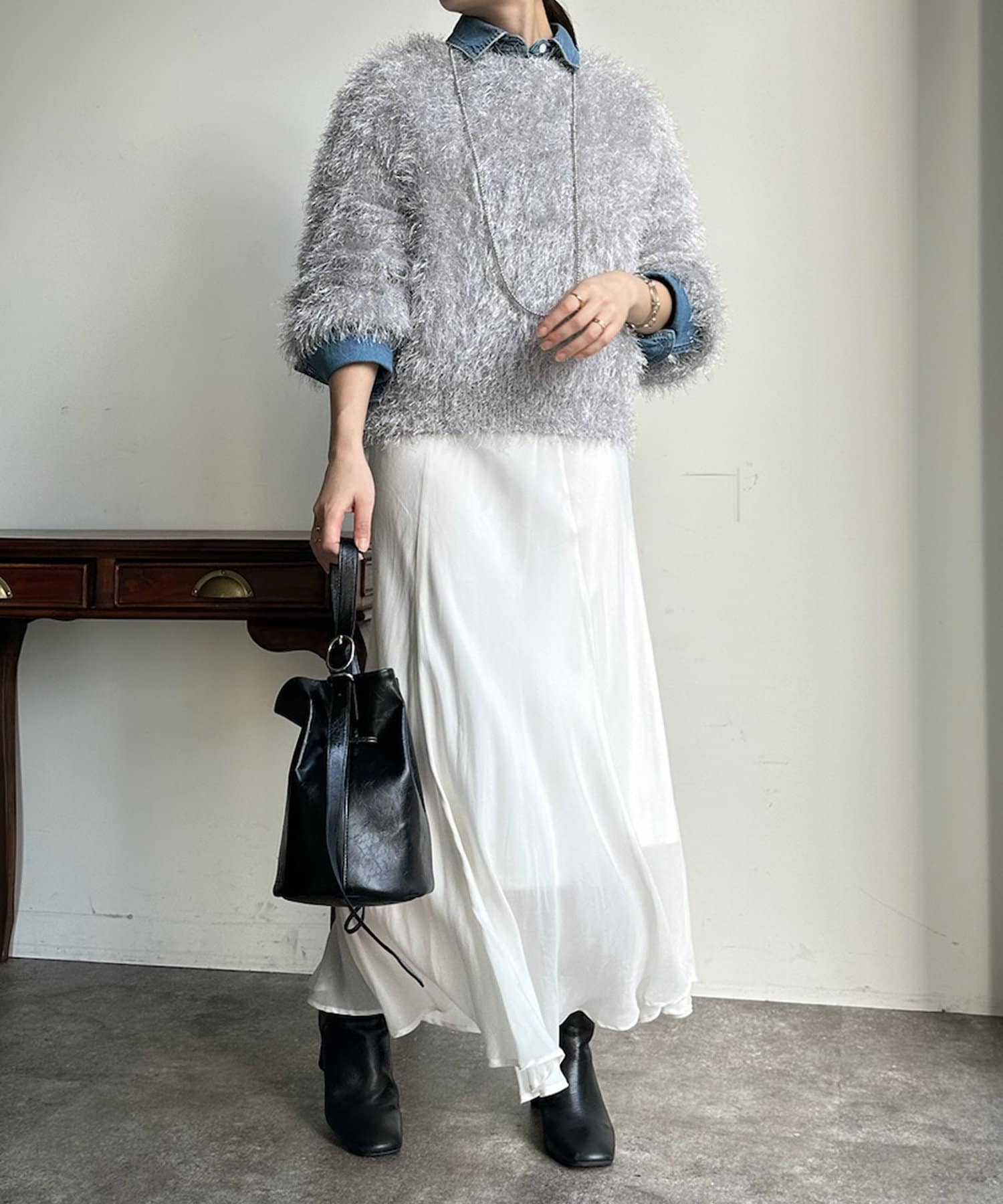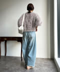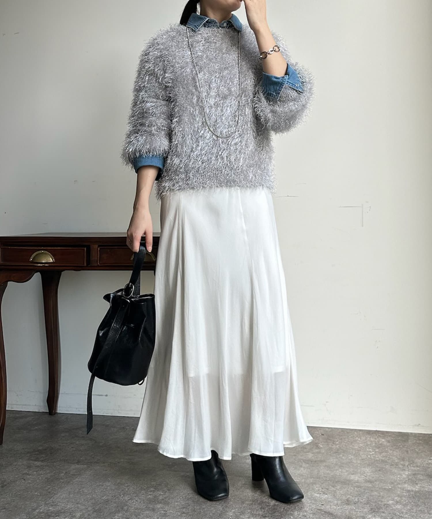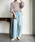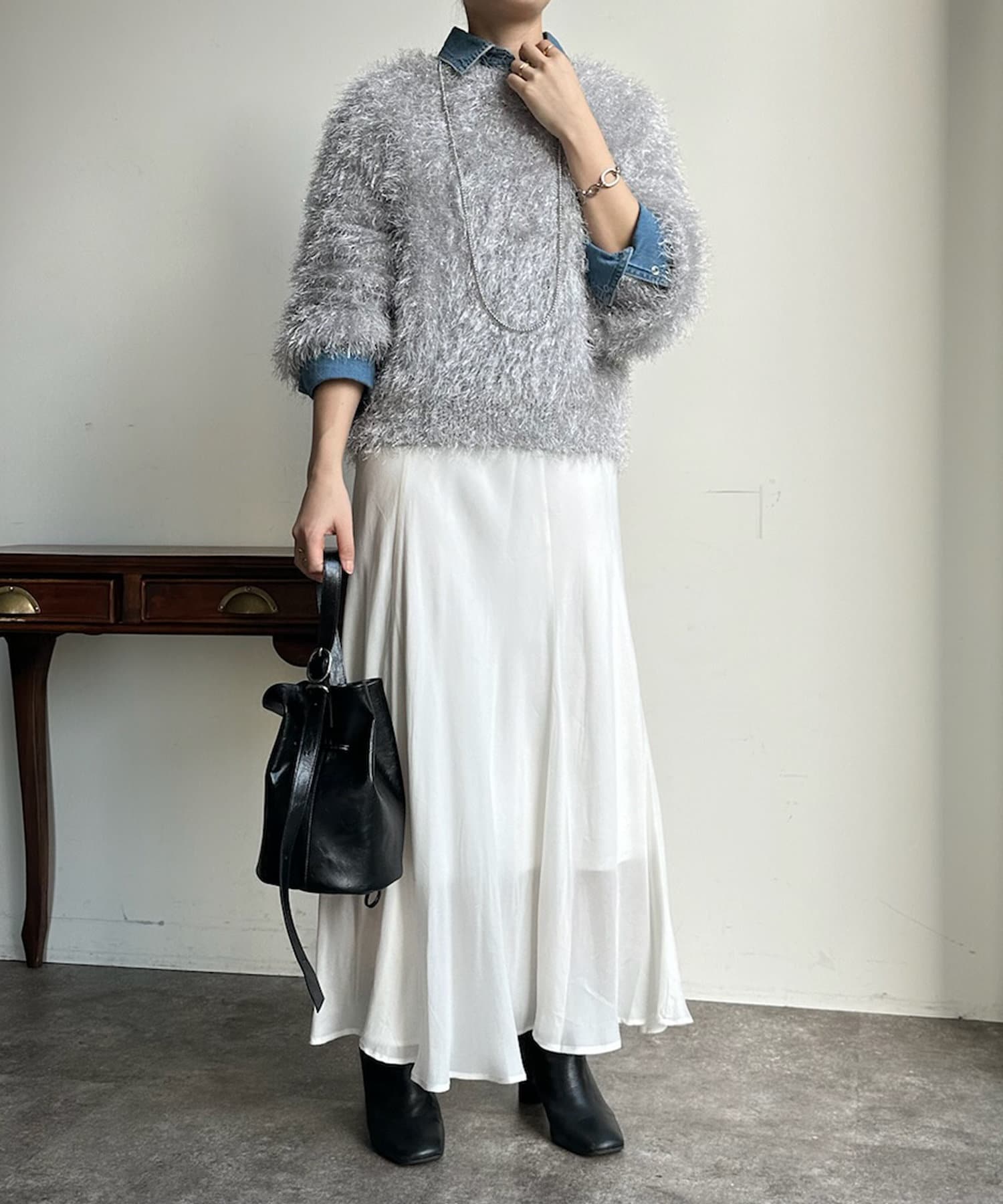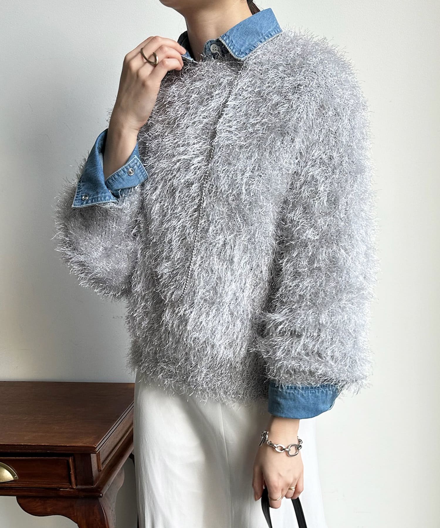 トレンドライクなシャギーニットは、シンプルなボトムに合わせるだけで洗練されたイメージに。