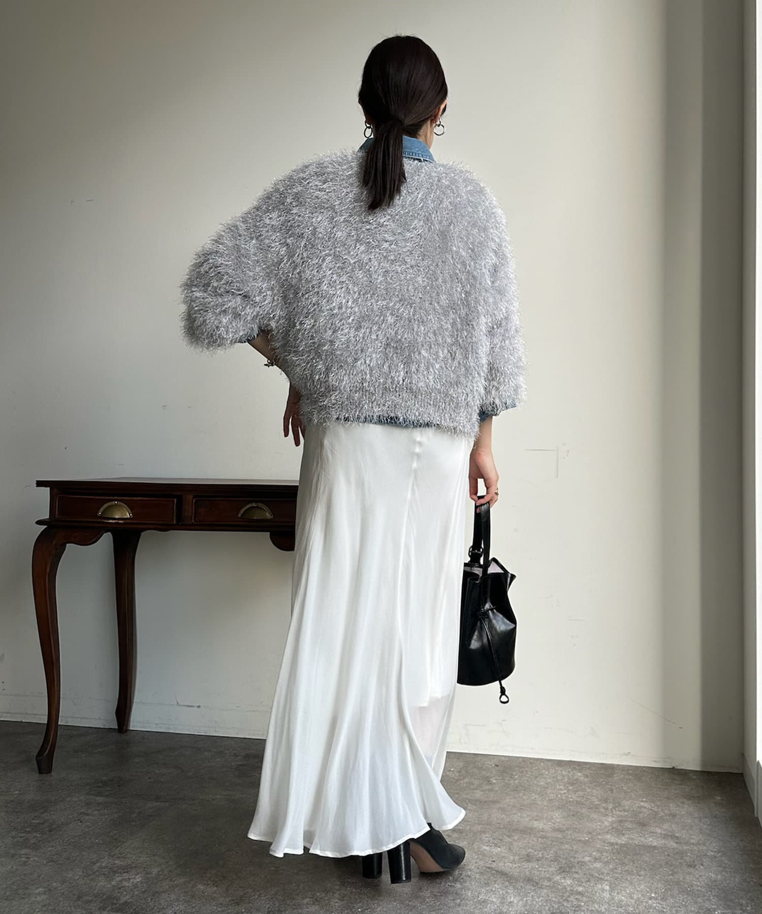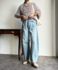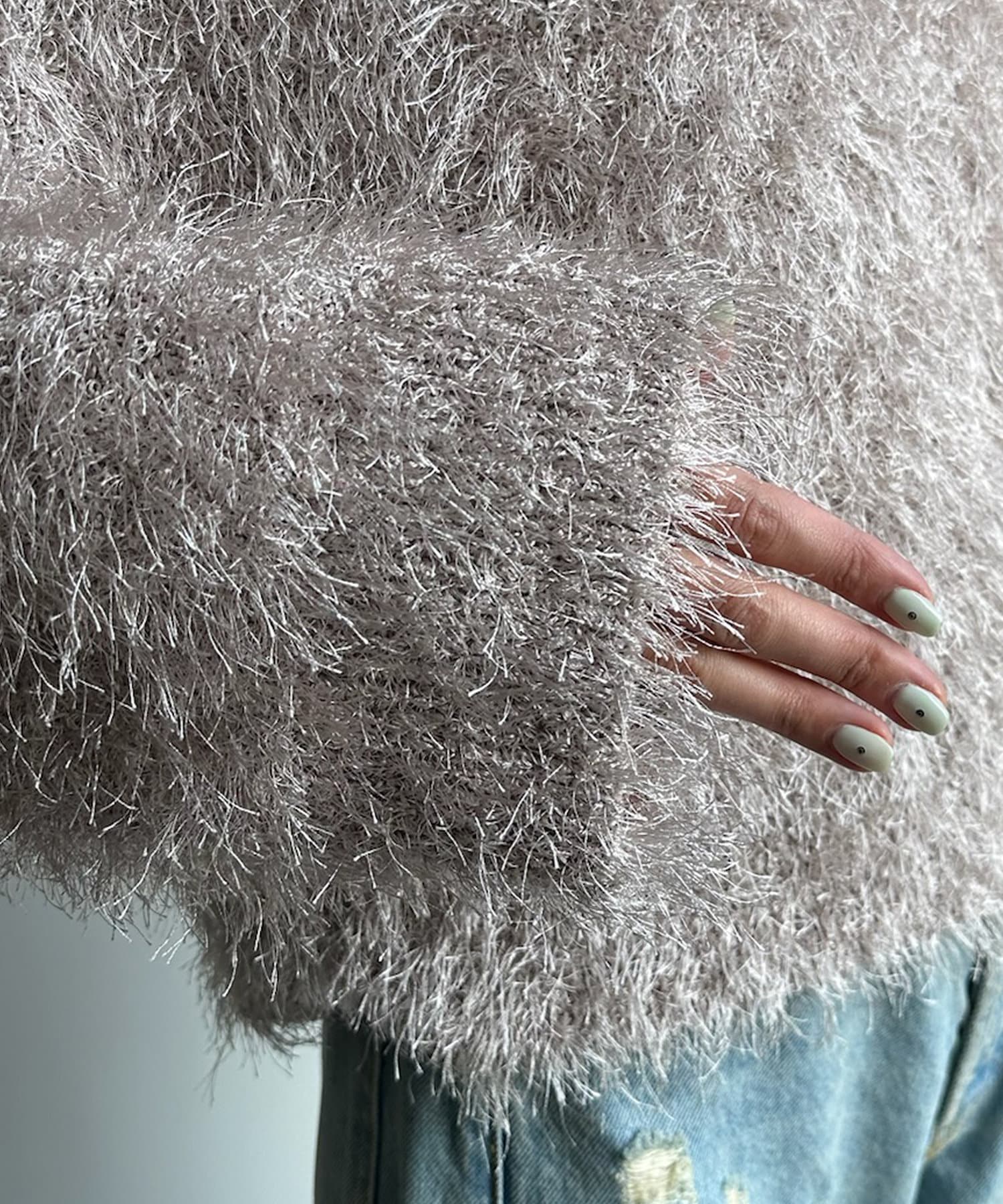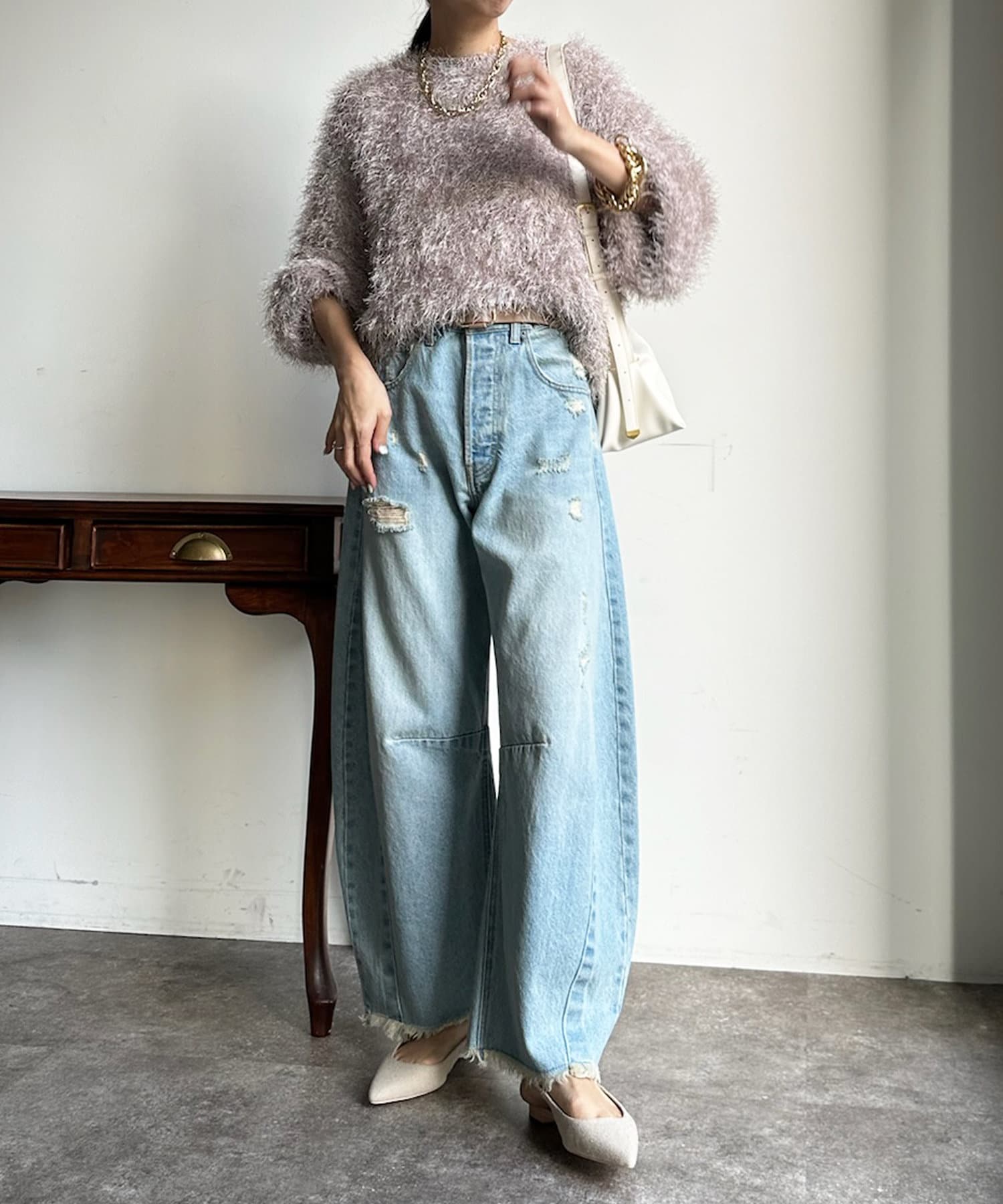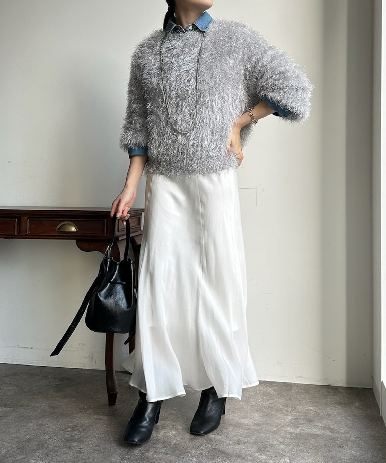 トレンドライクなシャギーニットは、シンプルなボトムに合わせるだけで洗練されたイメージに。