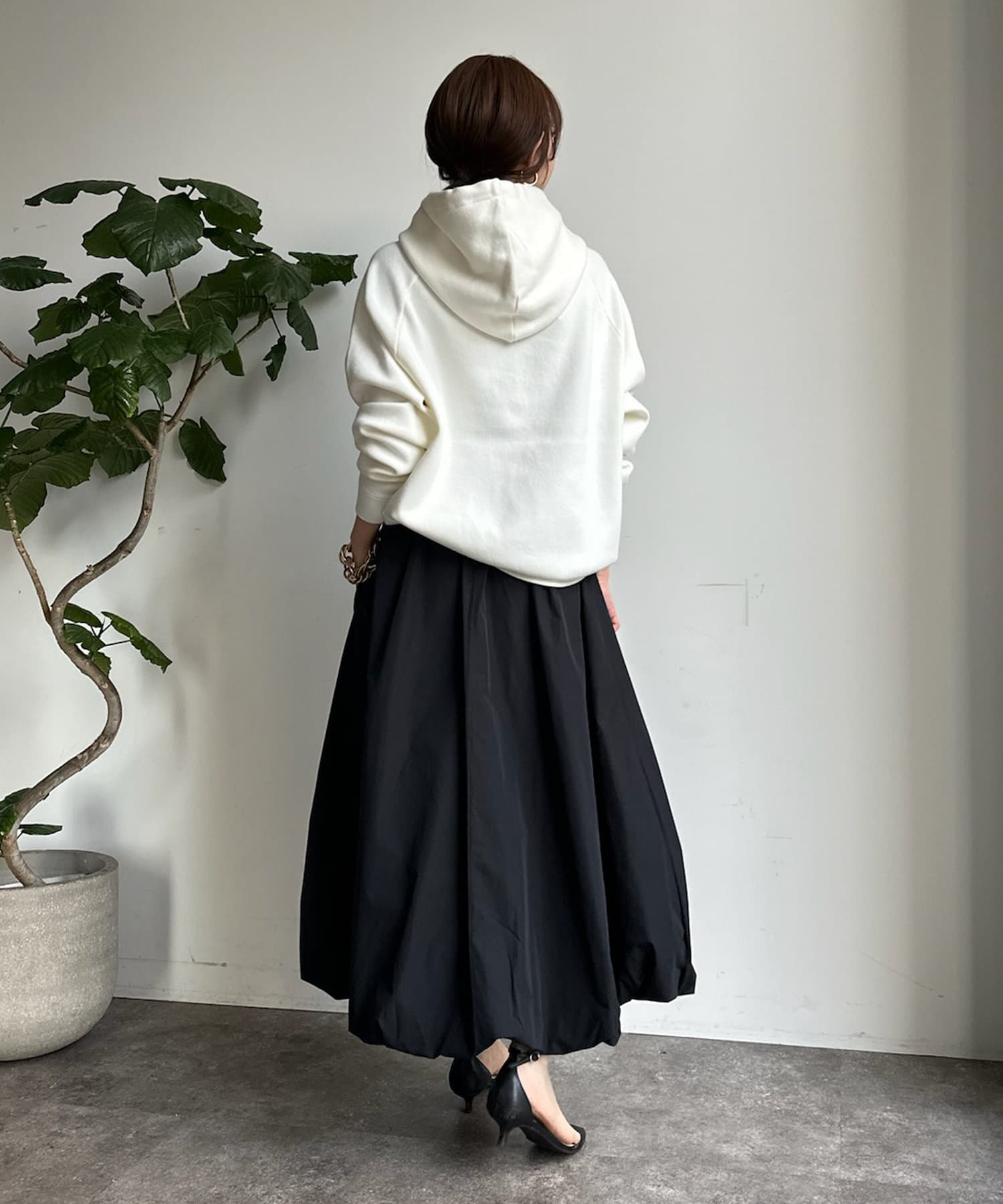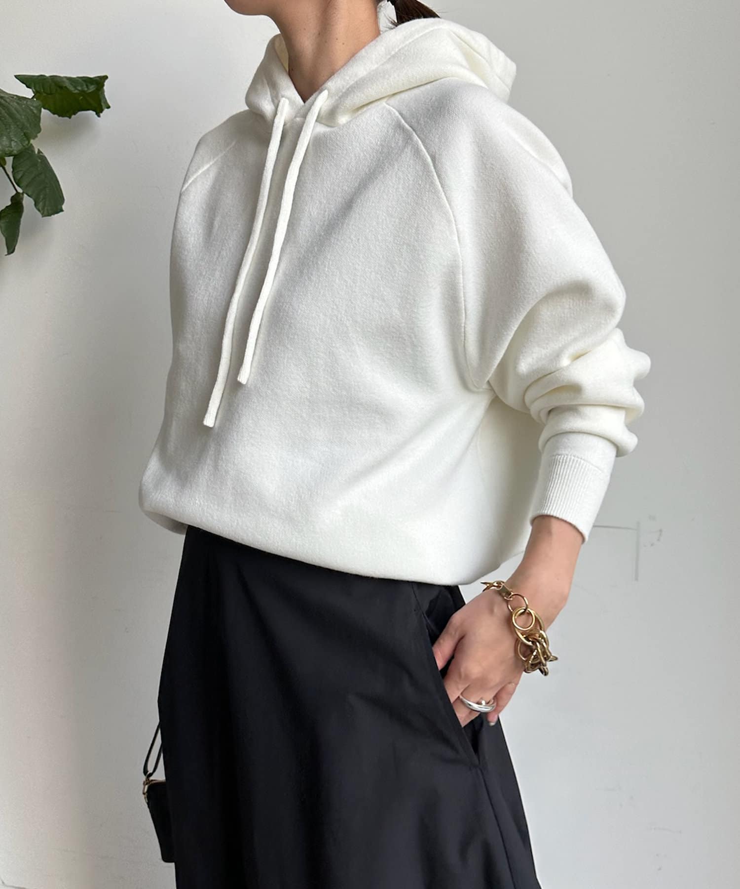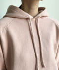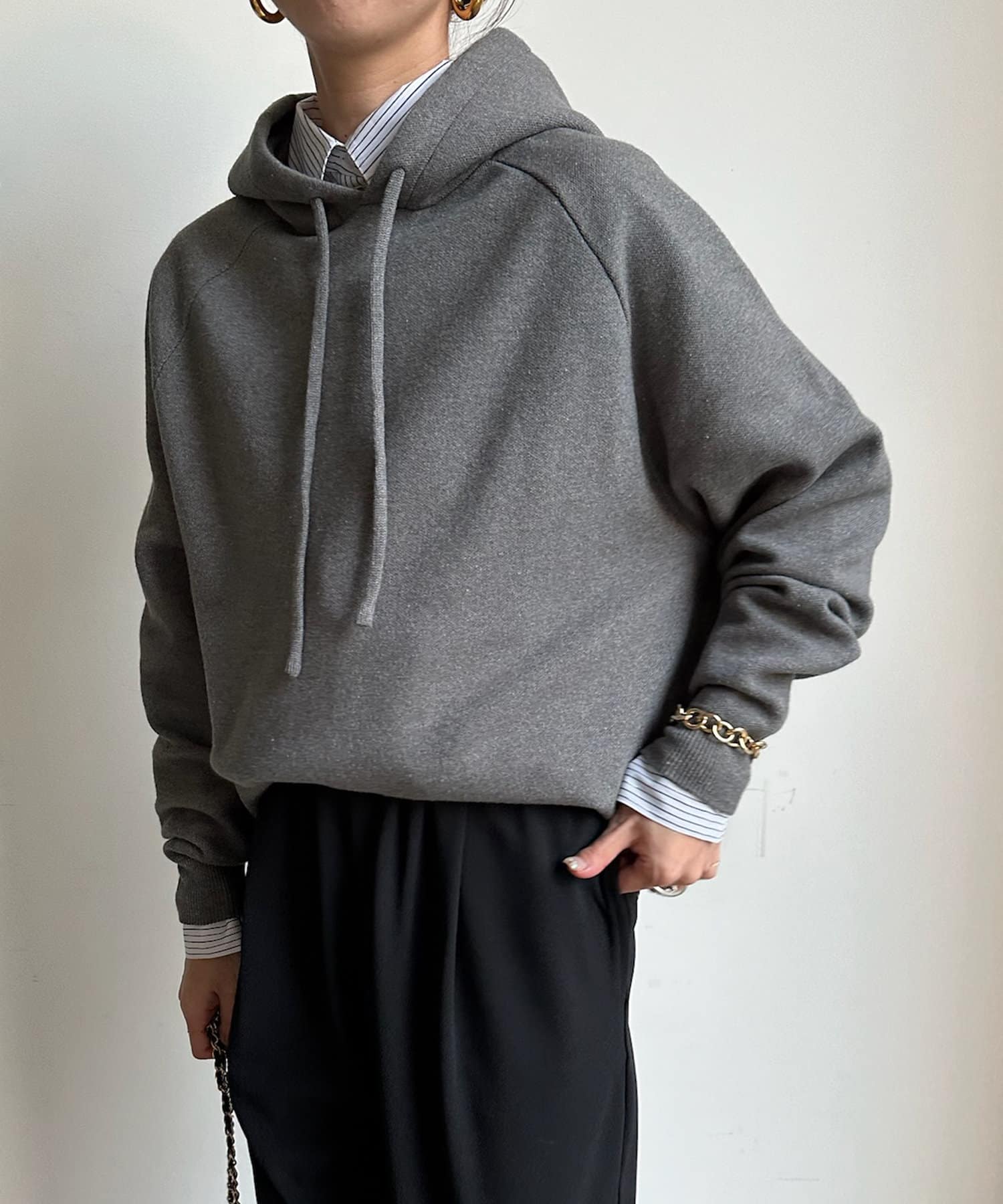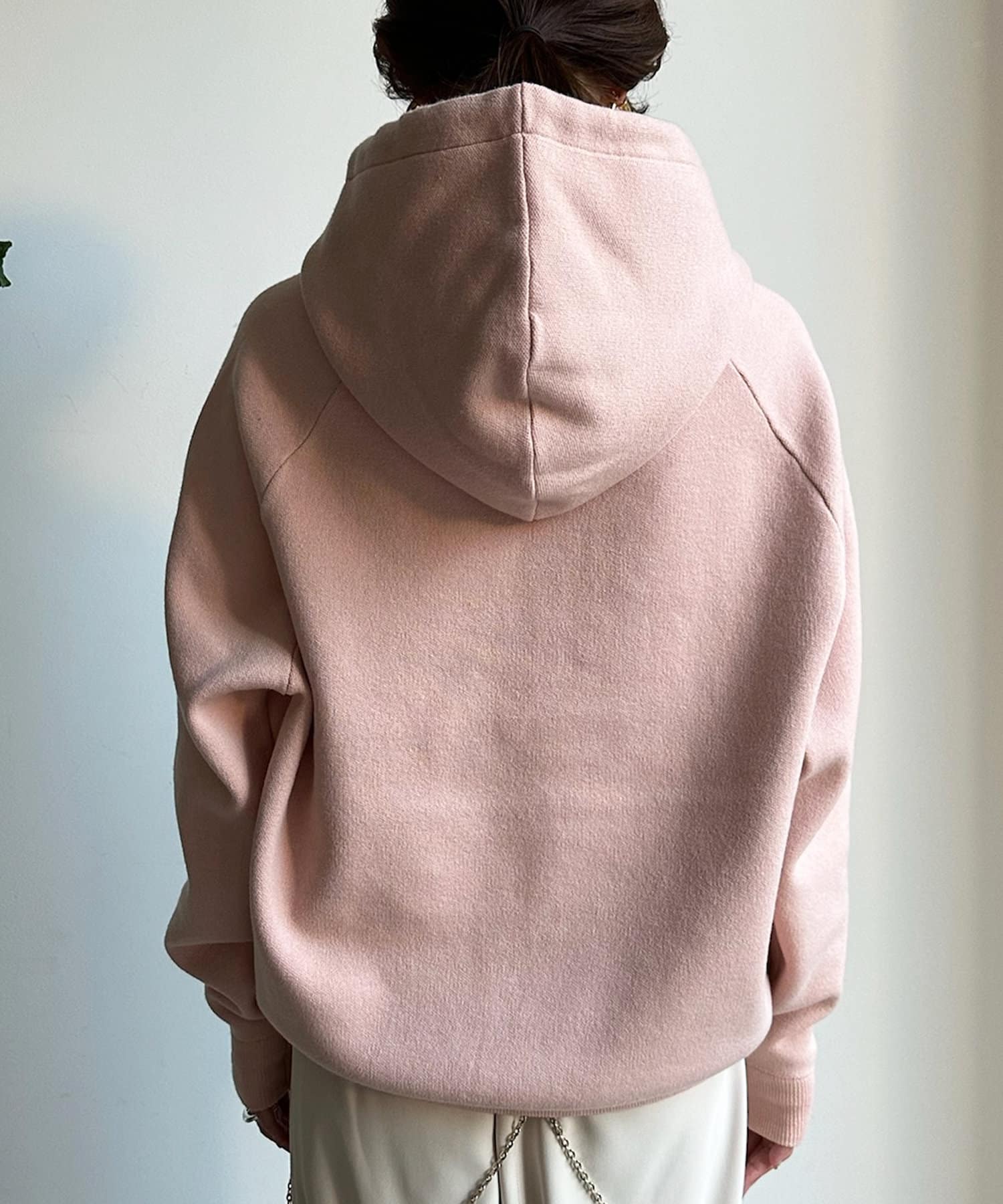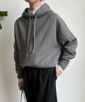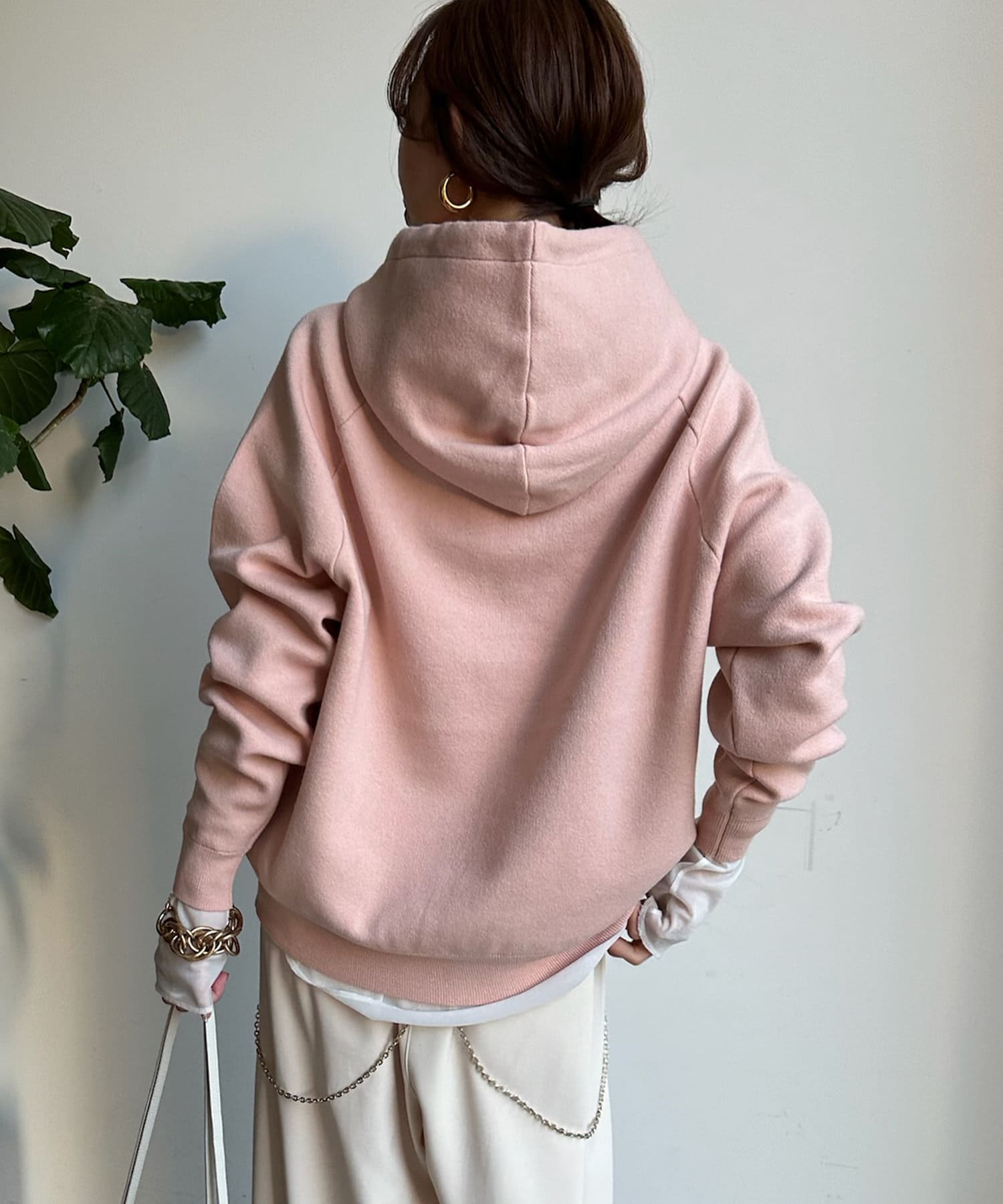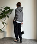 同素材の紐がアクセントになり、おおきめのフードが後ろ姿も映えるため、アウターを羽織ってもスタイリングにマッチ!