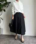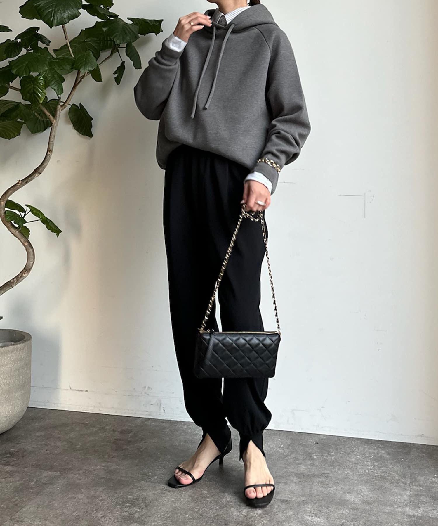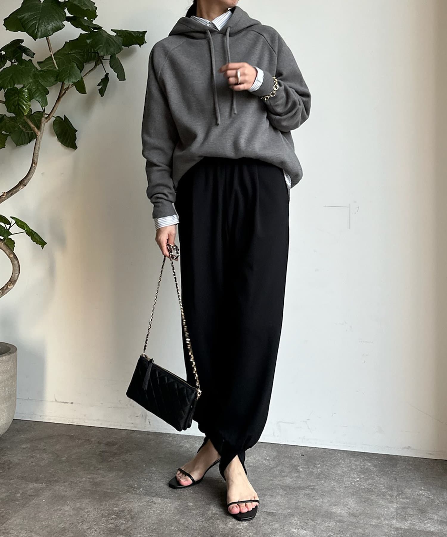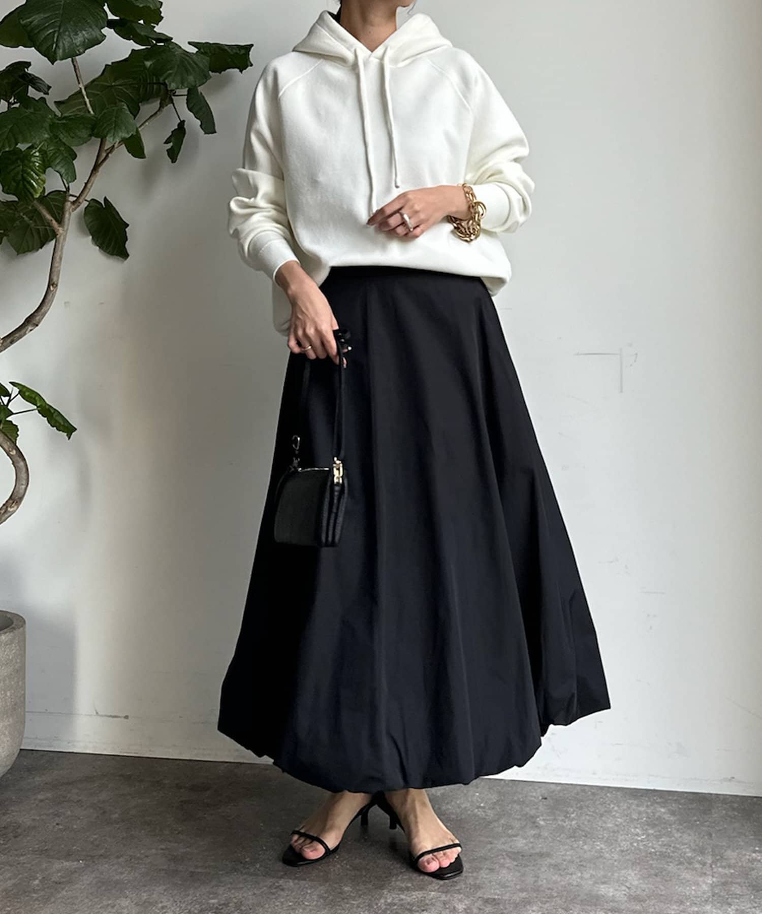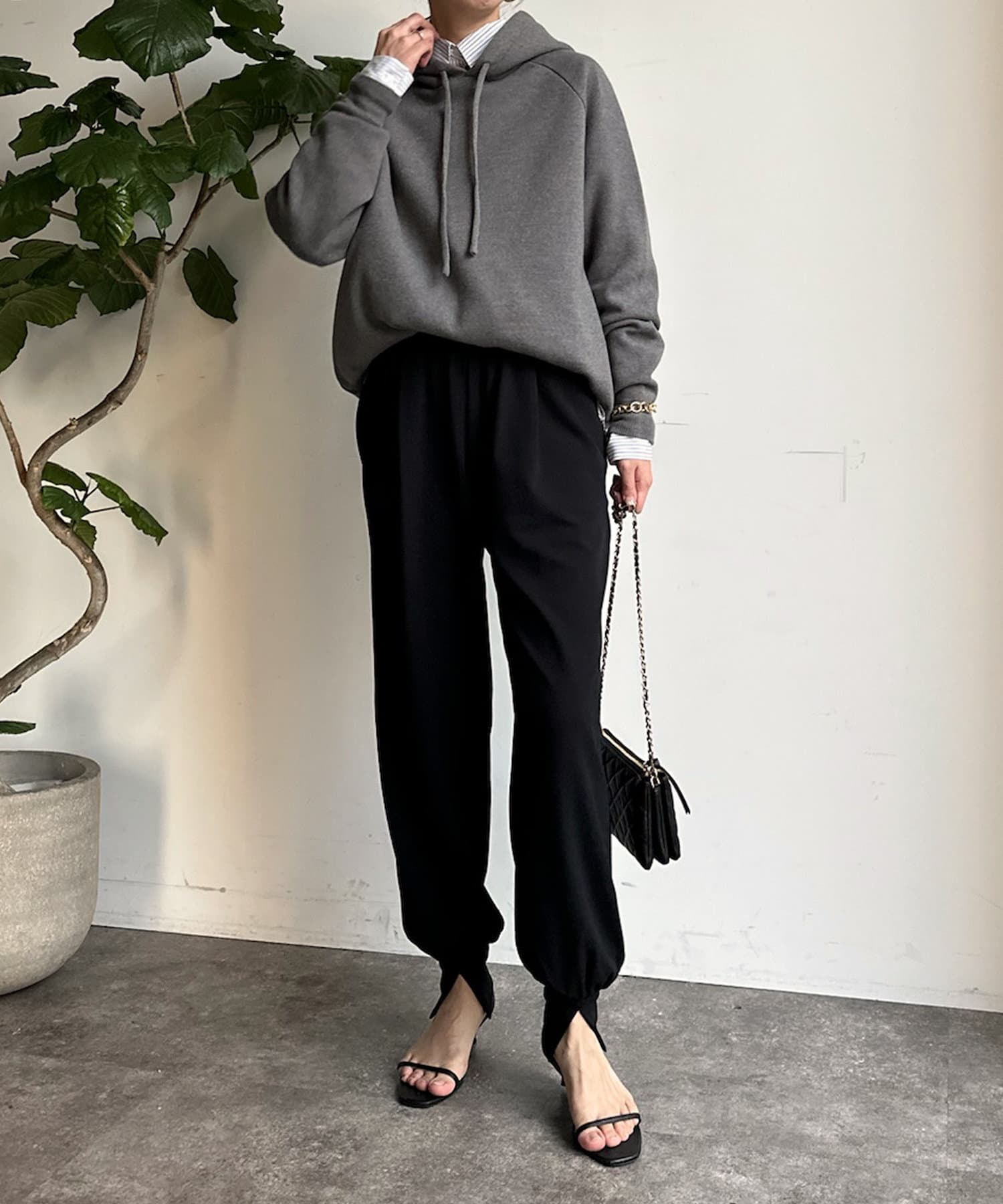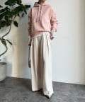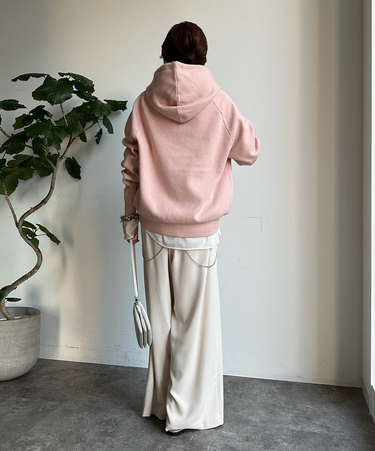 同素材の紐がアクセントになり、おおきめのフードが後ろ姿も映えるため、アウターを羽織ってもスタイリングにマッチ!