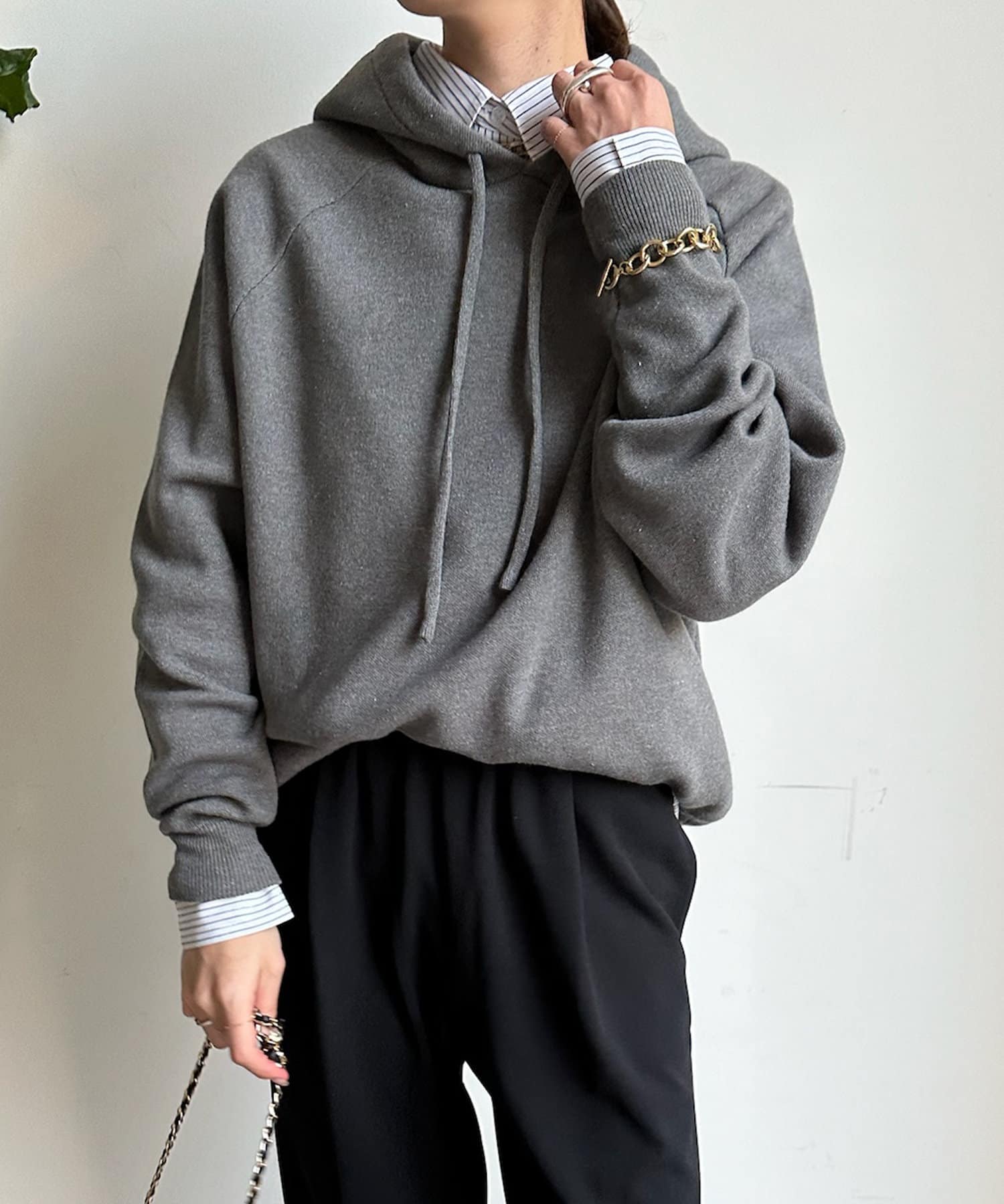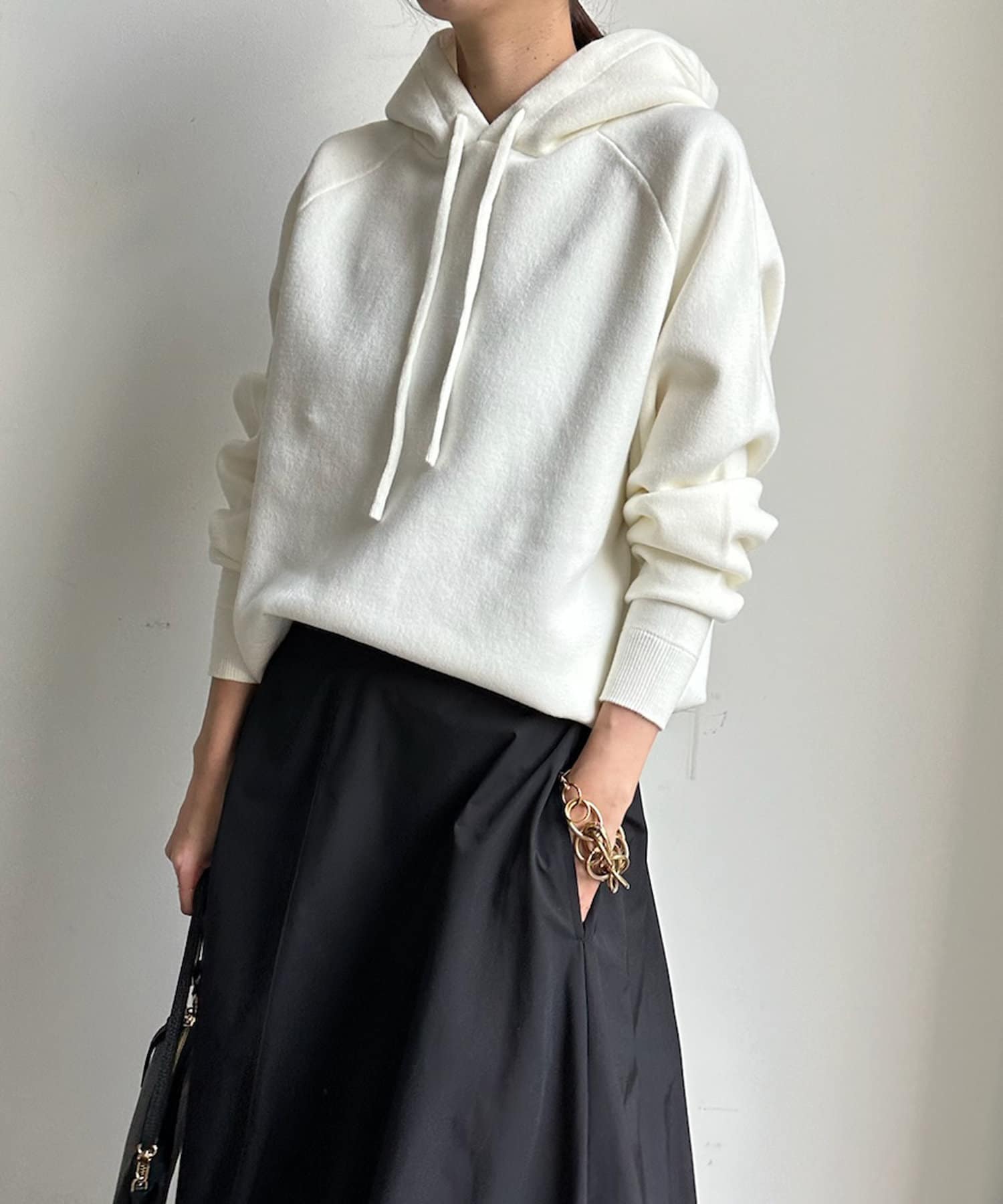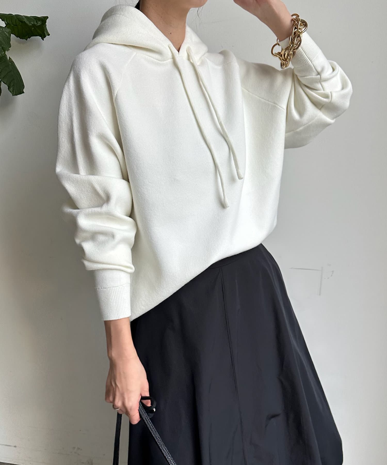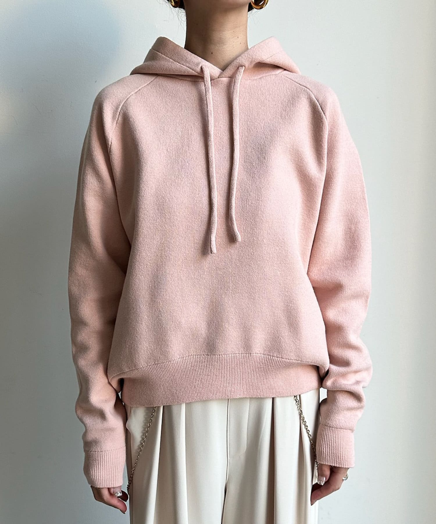 カジュアルになりすぎない上品なフーディーニット。