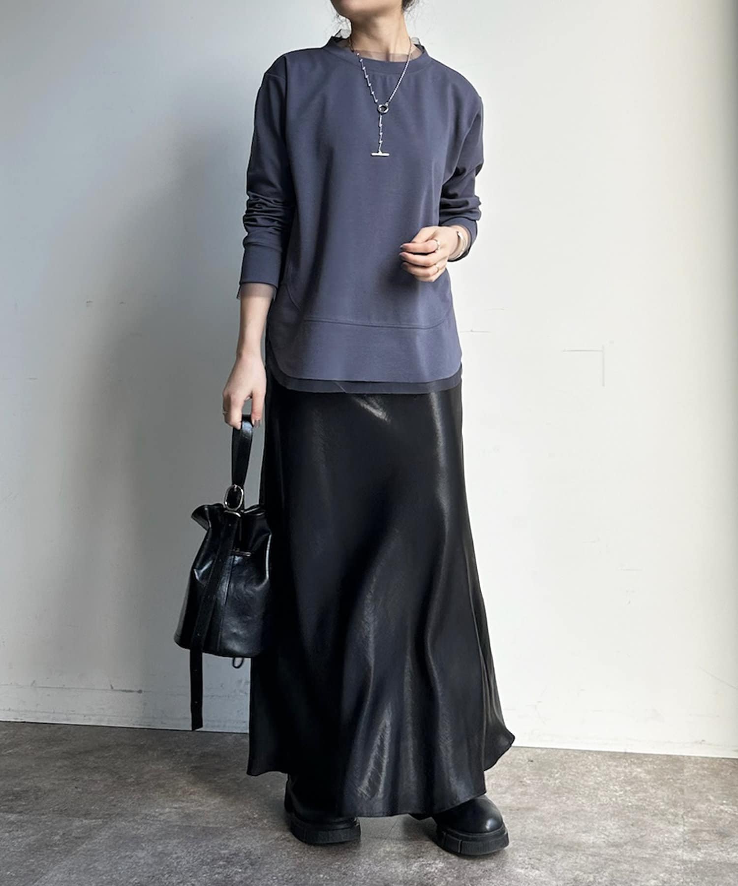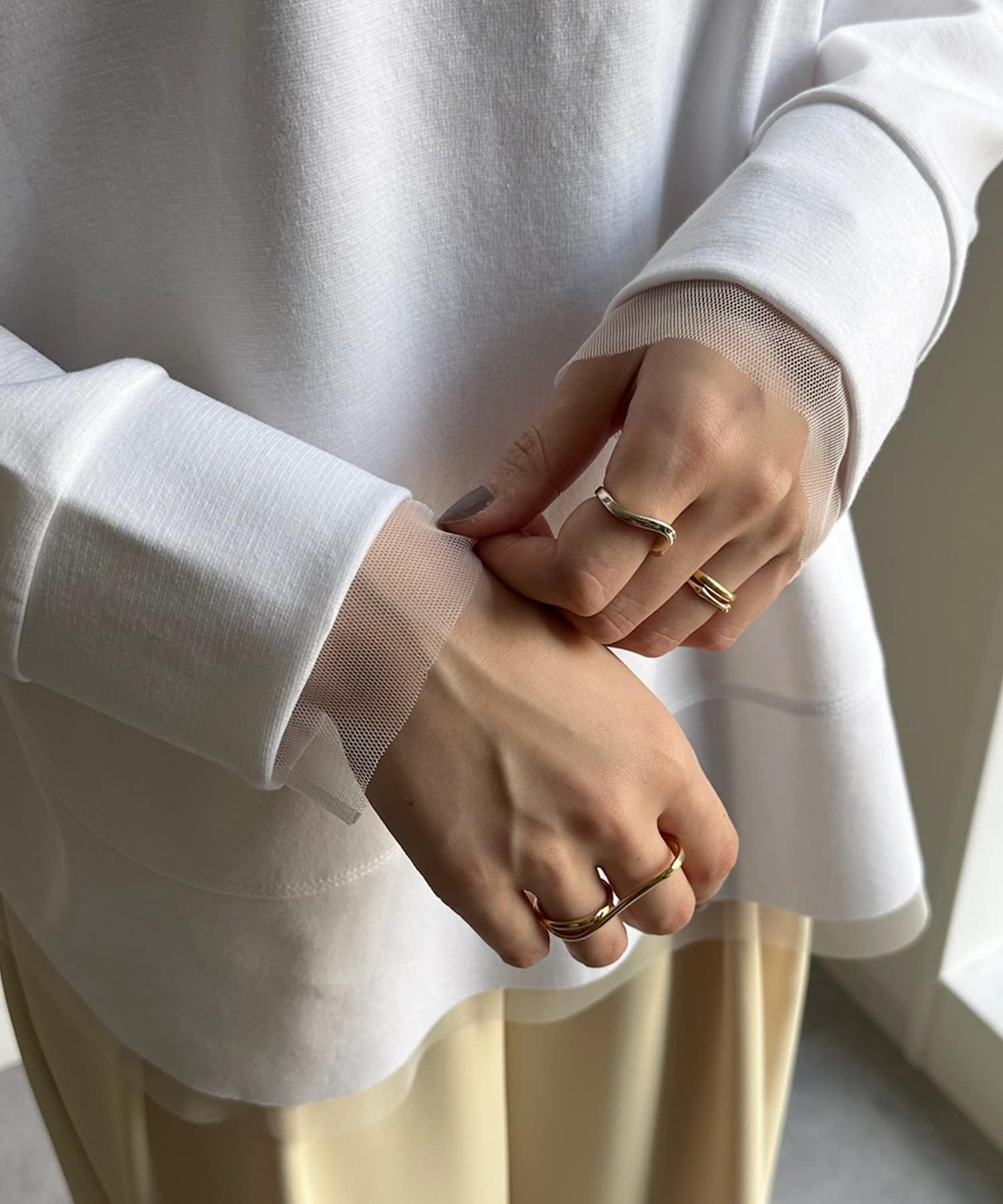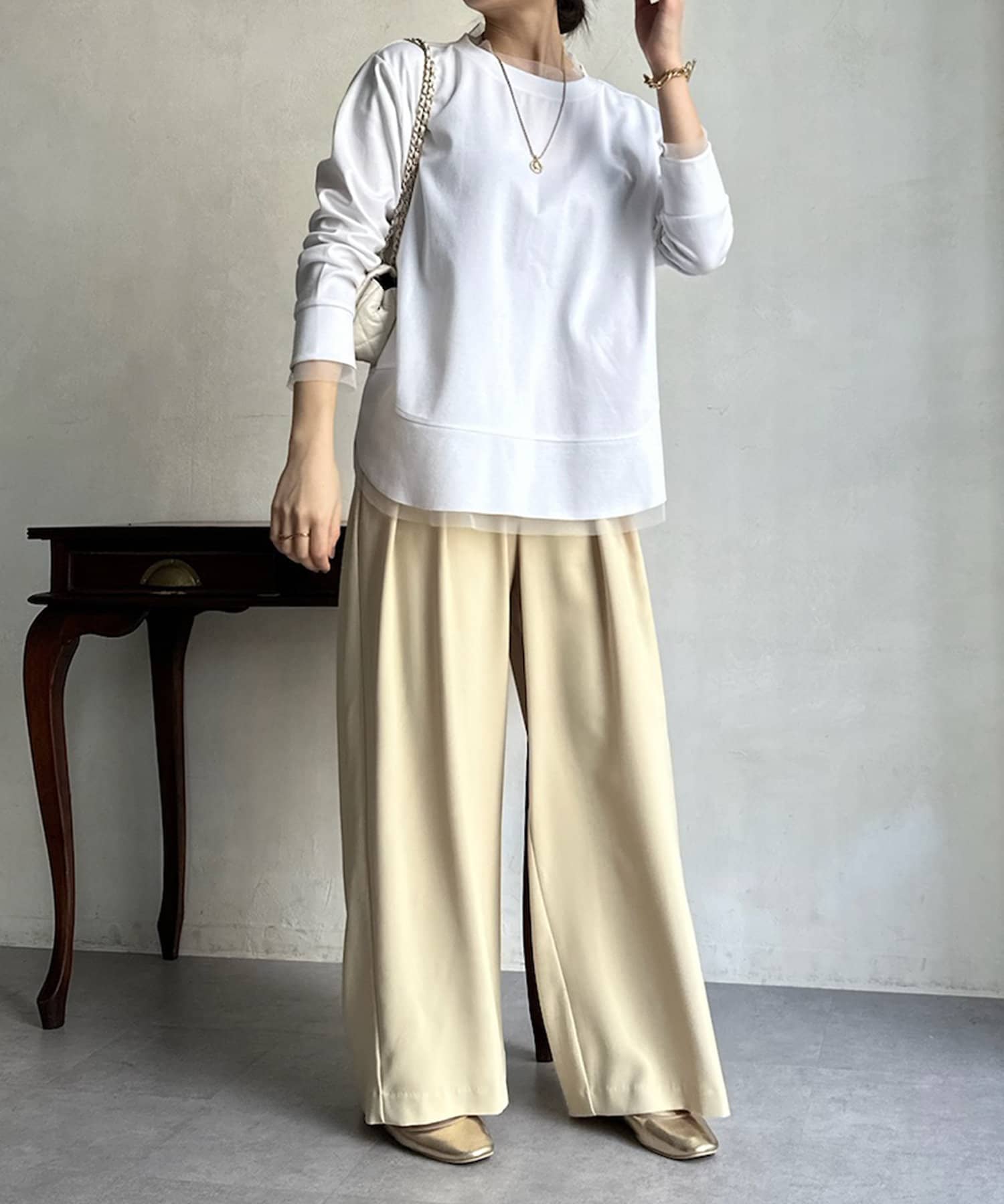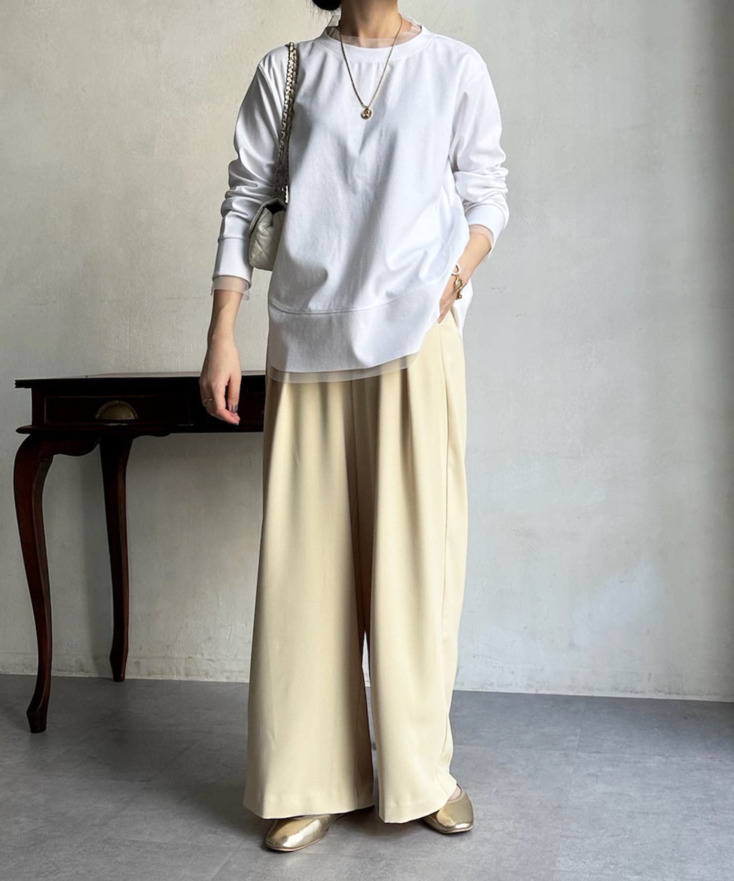 透け感素材がプラスされるだけでシンプルなカットソーも上品見え抜群に。
