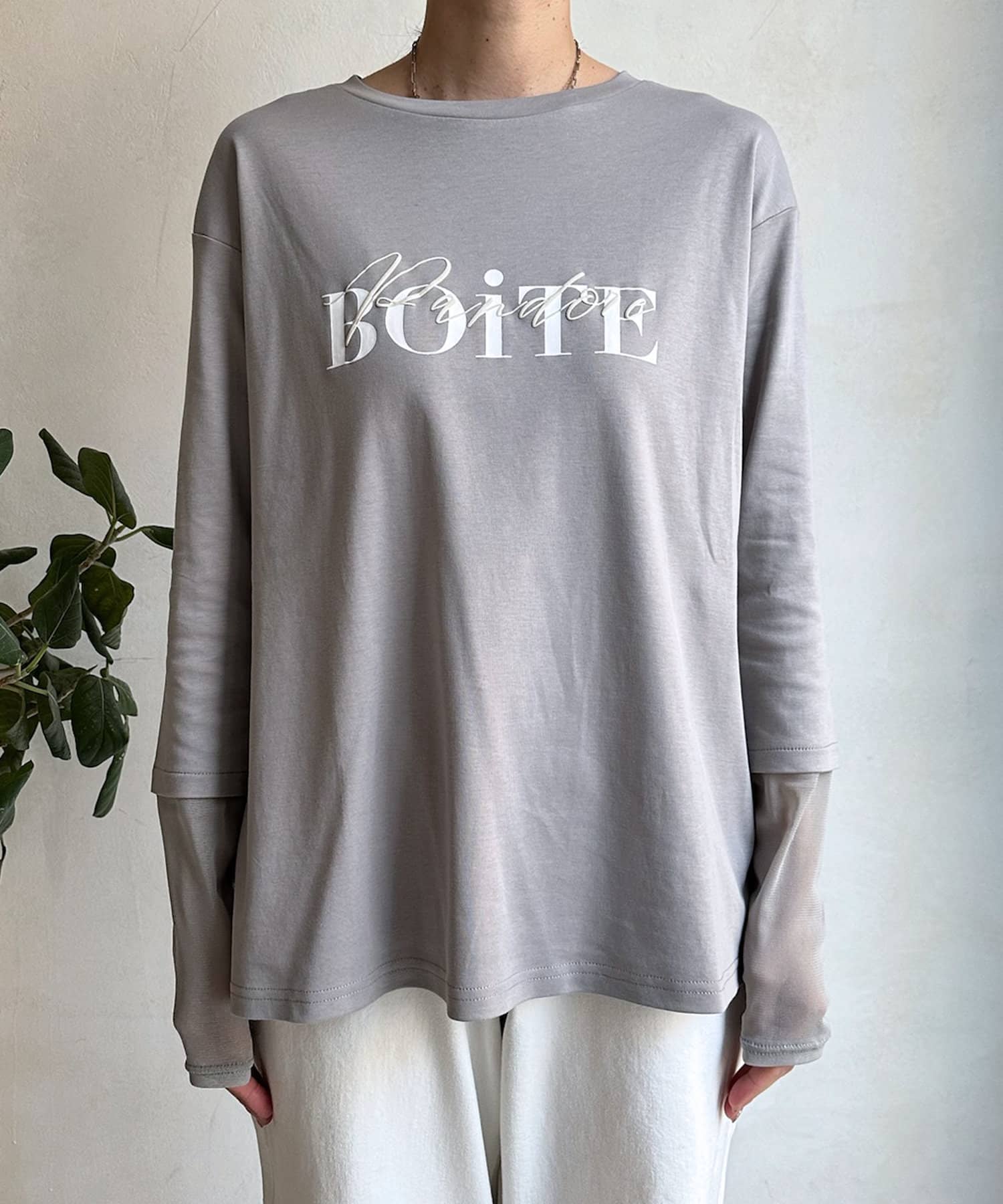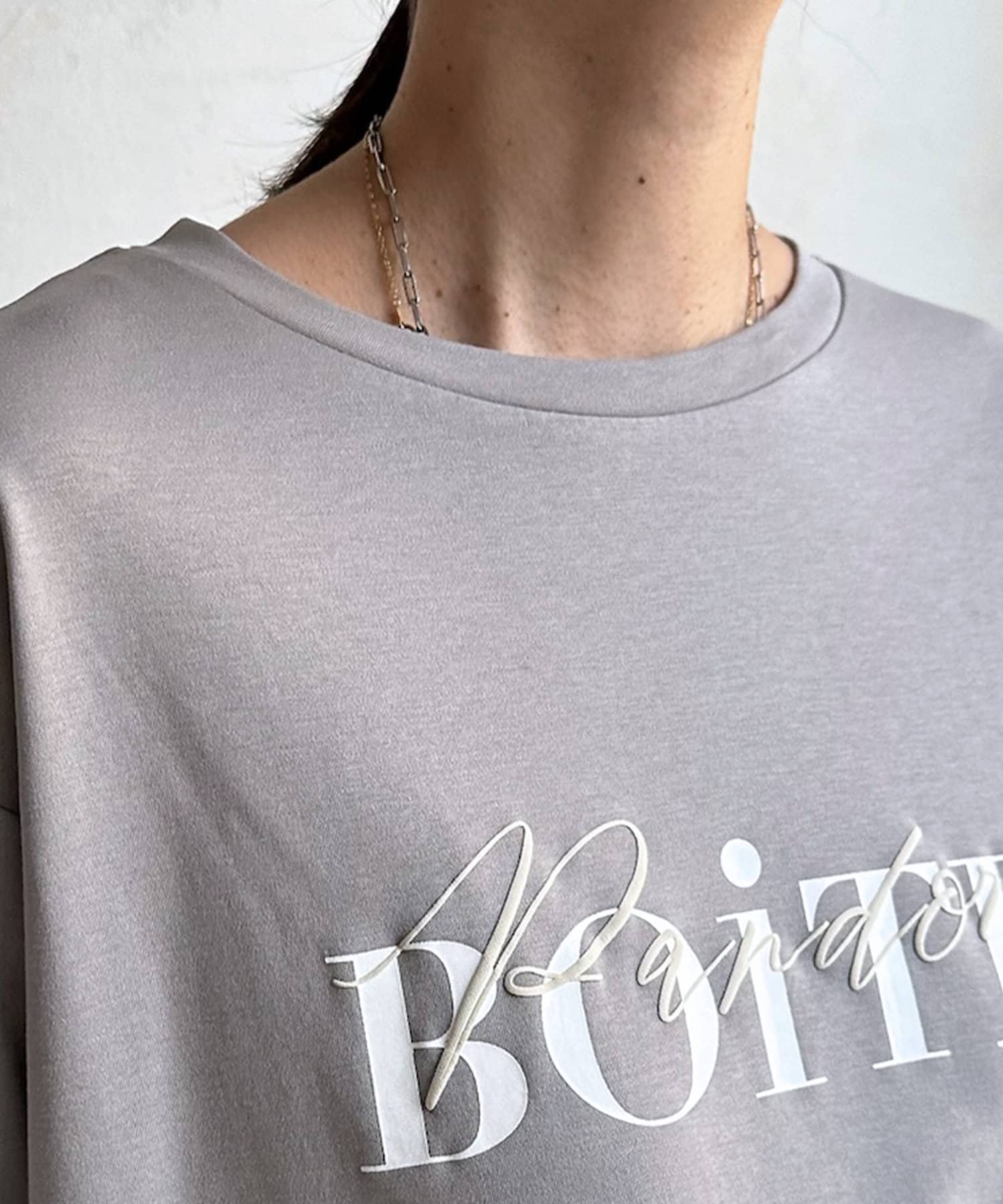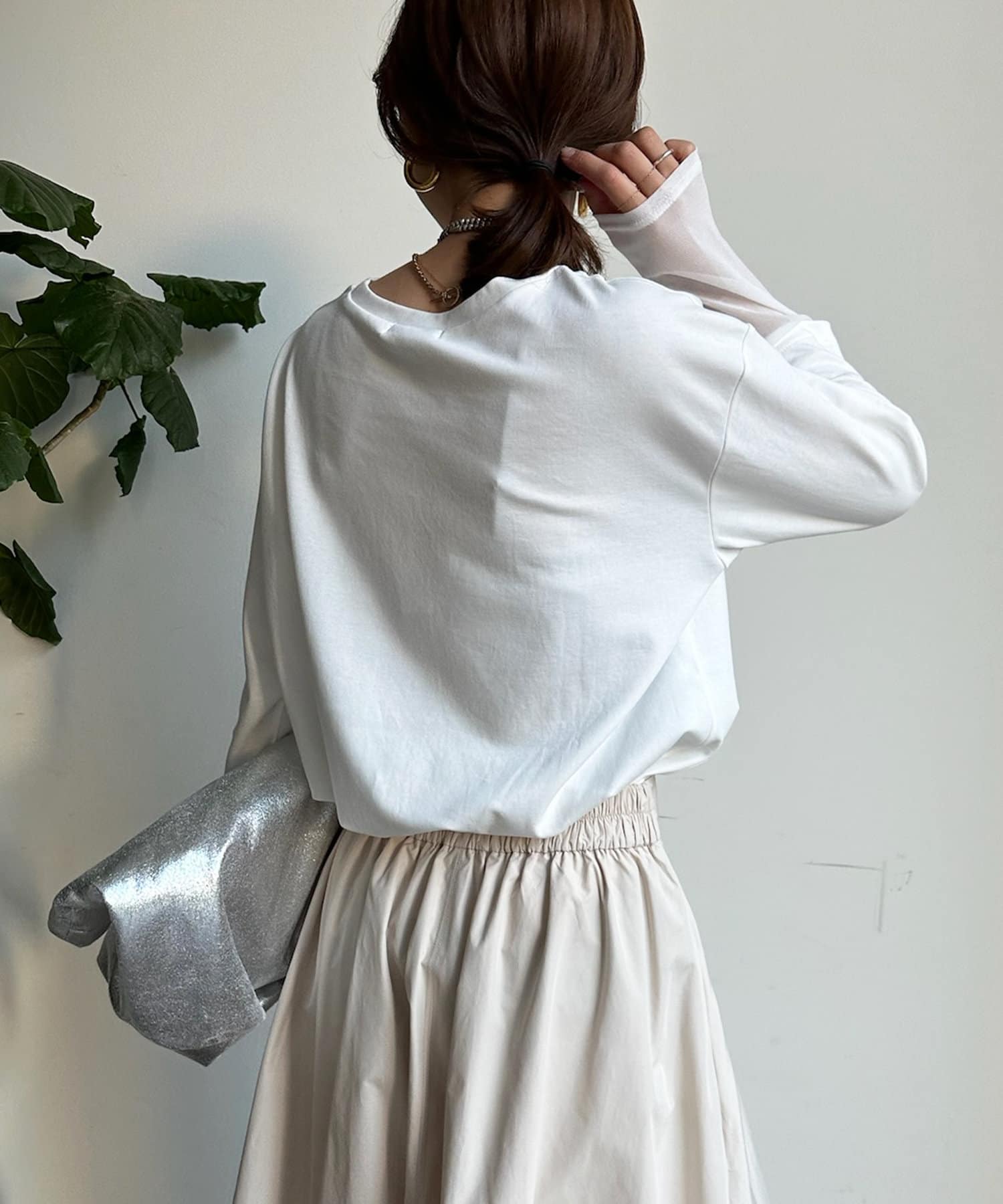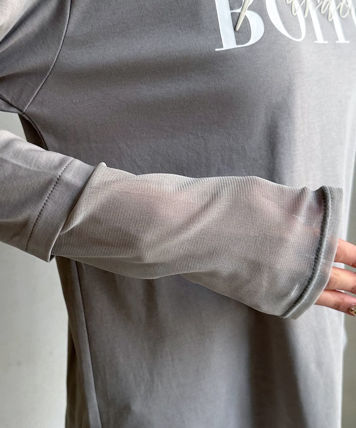 表面感のあるフロッキーロゴと、袖のシアー切り替えデザインがおしゃれな1着。