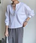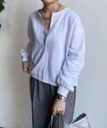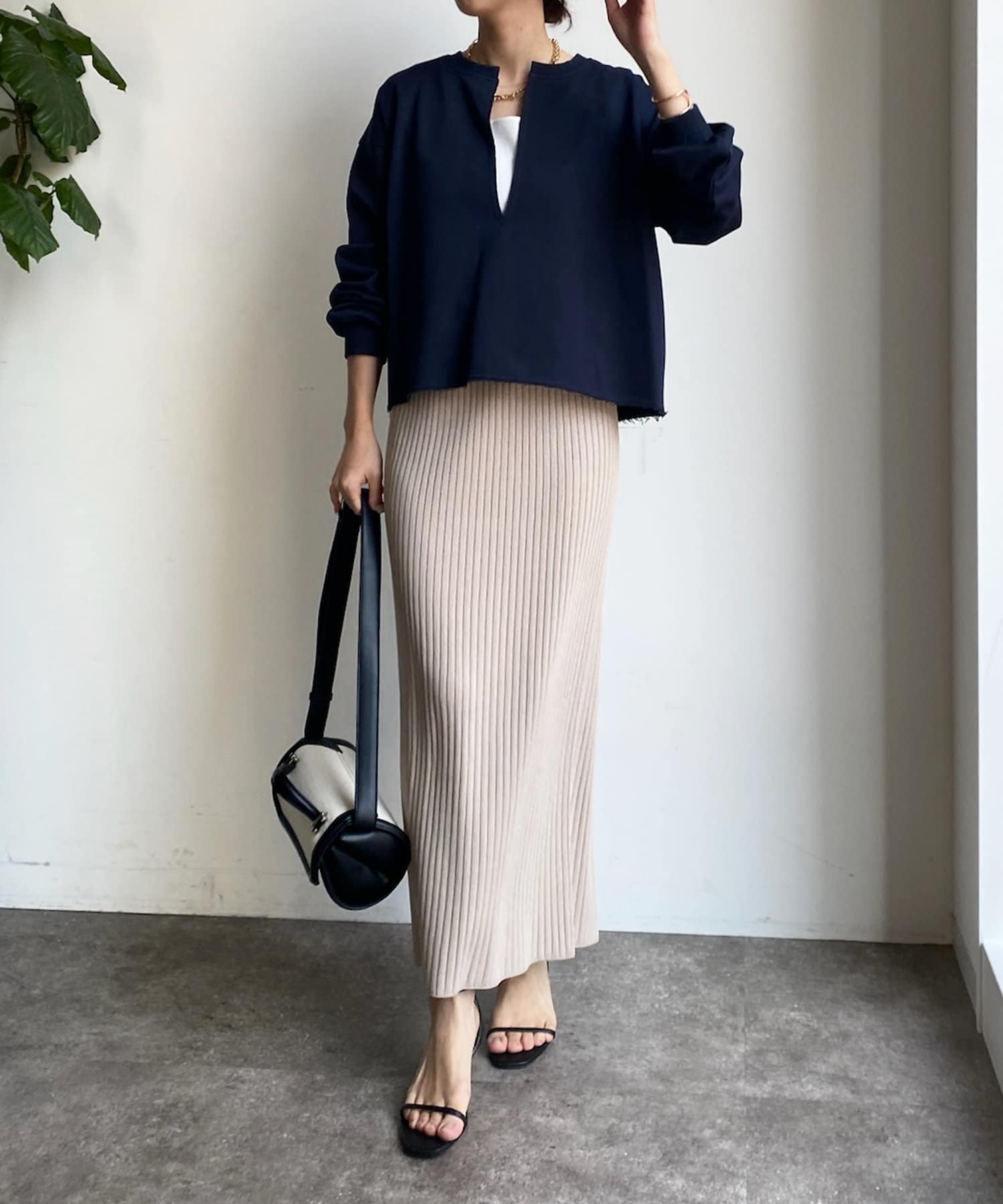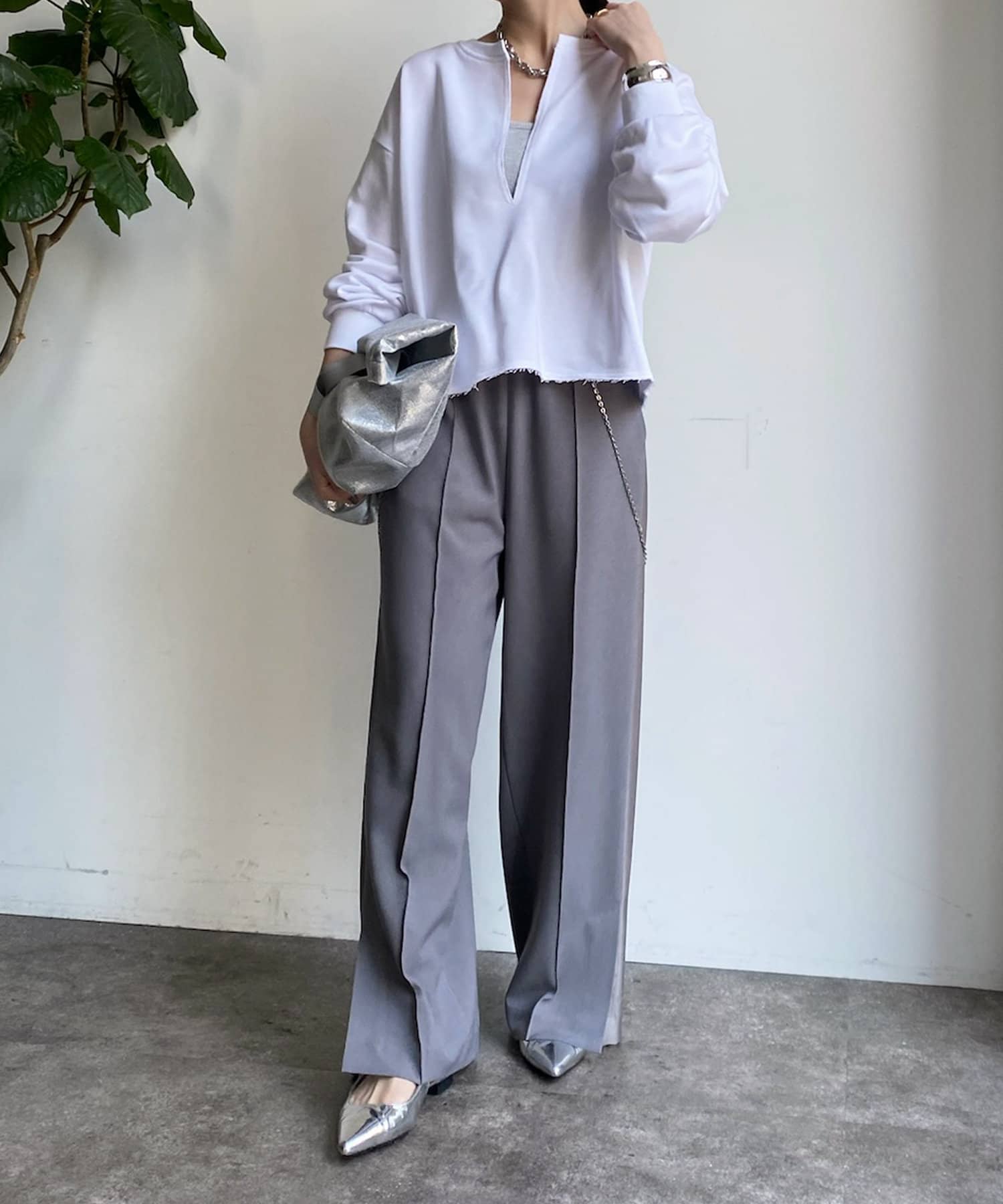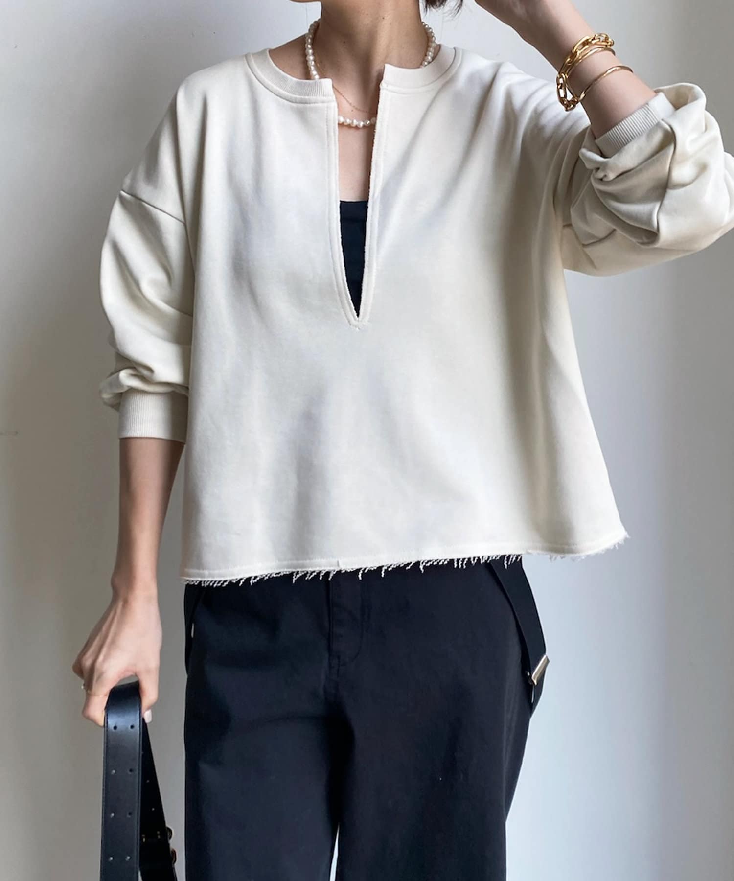 ネックラインのざっくりとしたカットがポイントで、顔回りをすっきりと、そしておしゃれな印象に仕上げます。