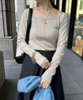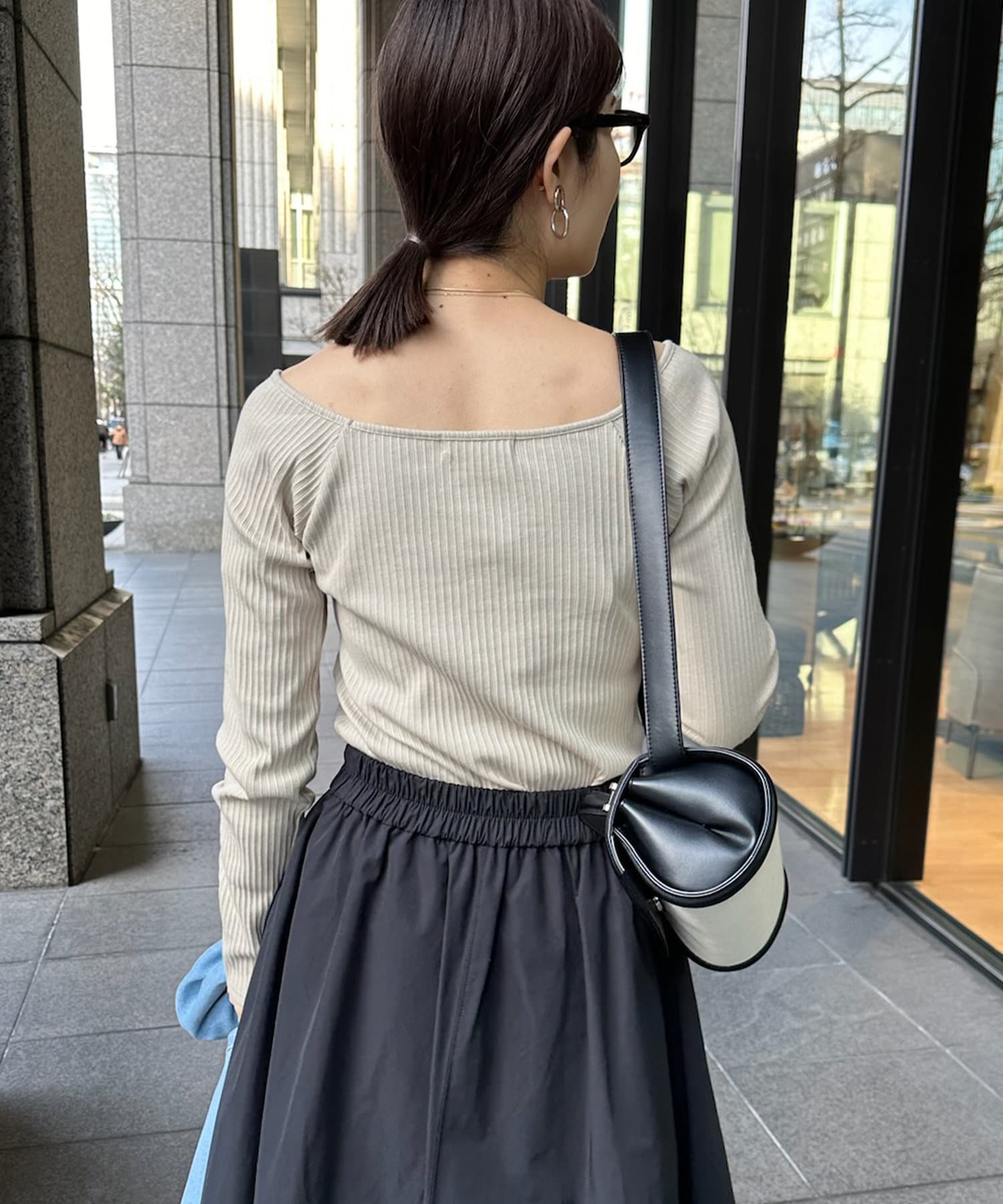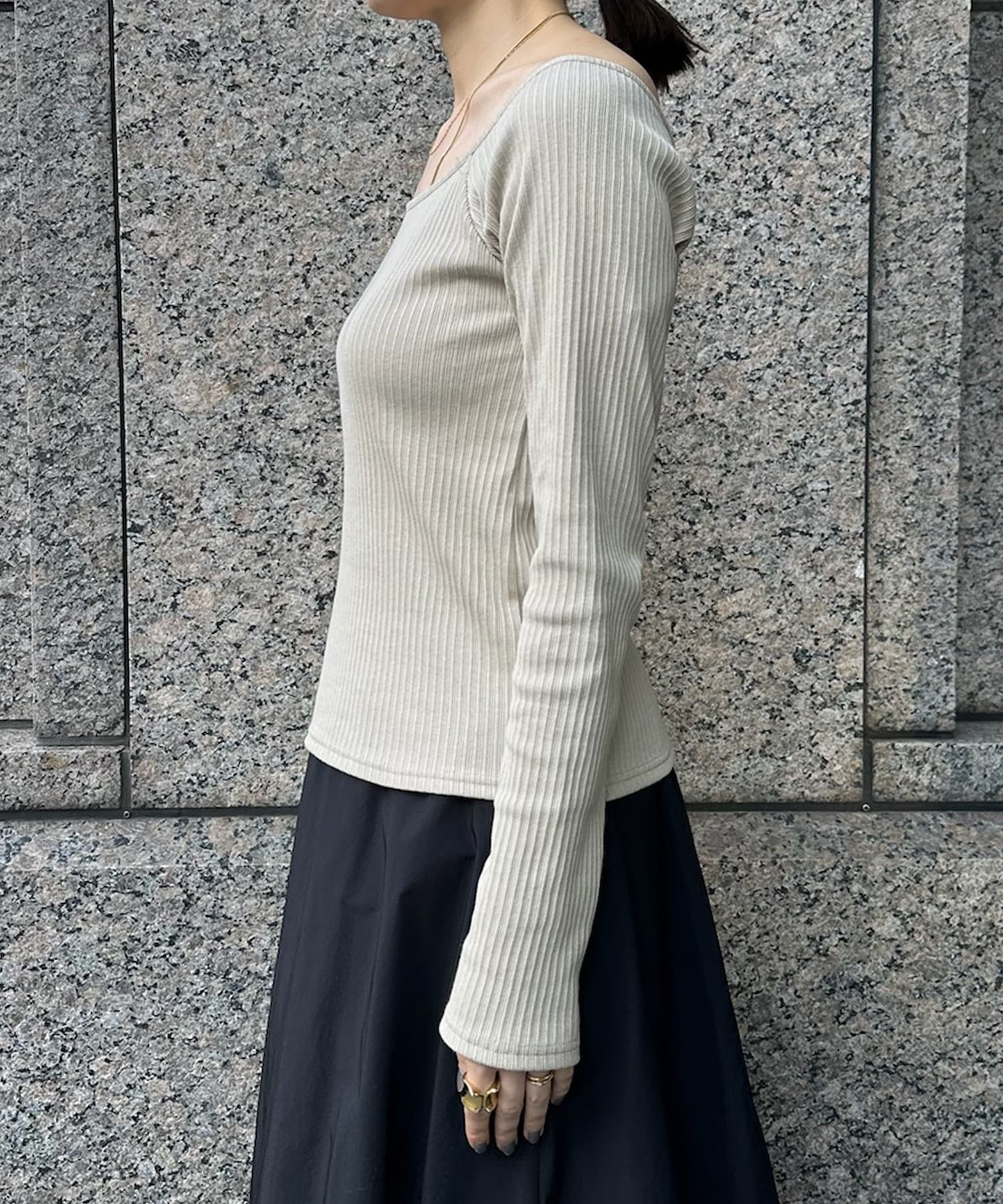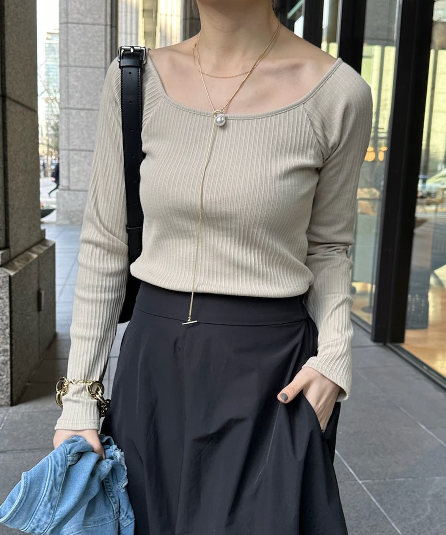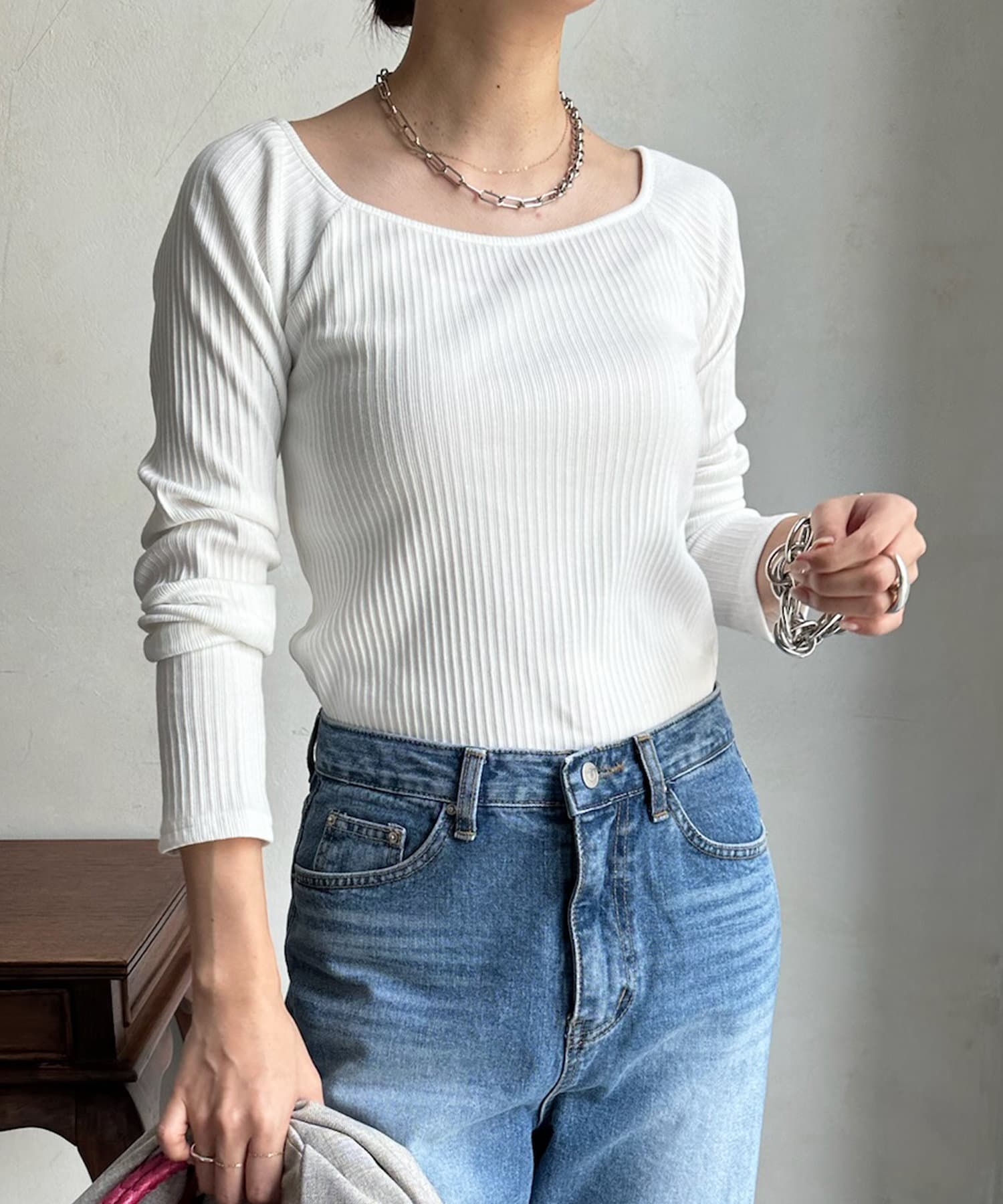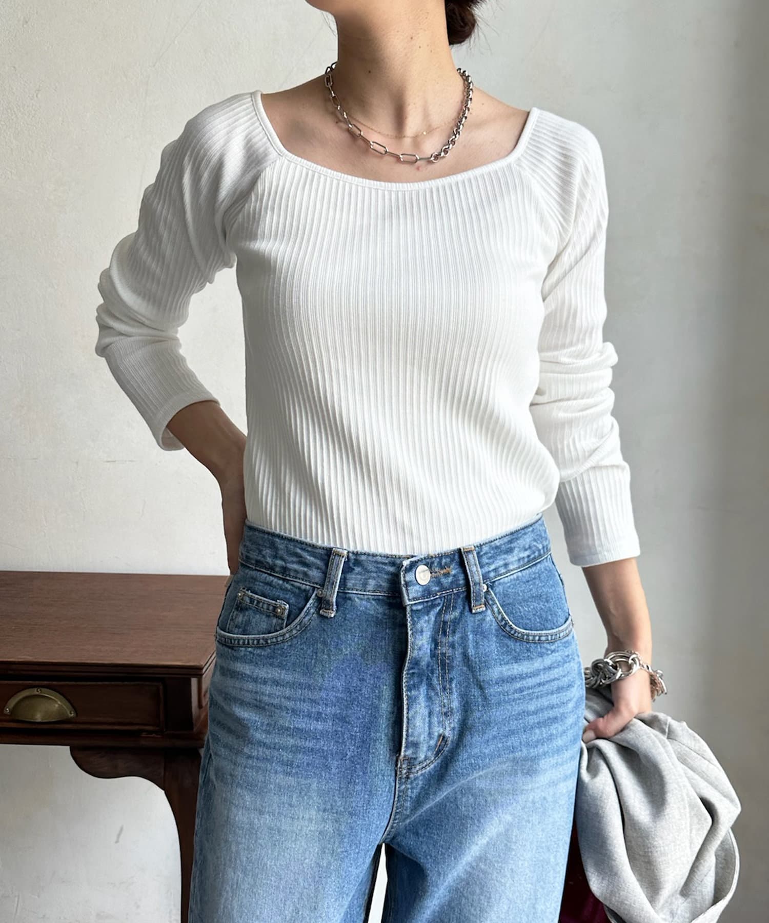 デコルテの空き具合や伸びやかな着心地に拘ったスクエアネックのテレコカットソー。