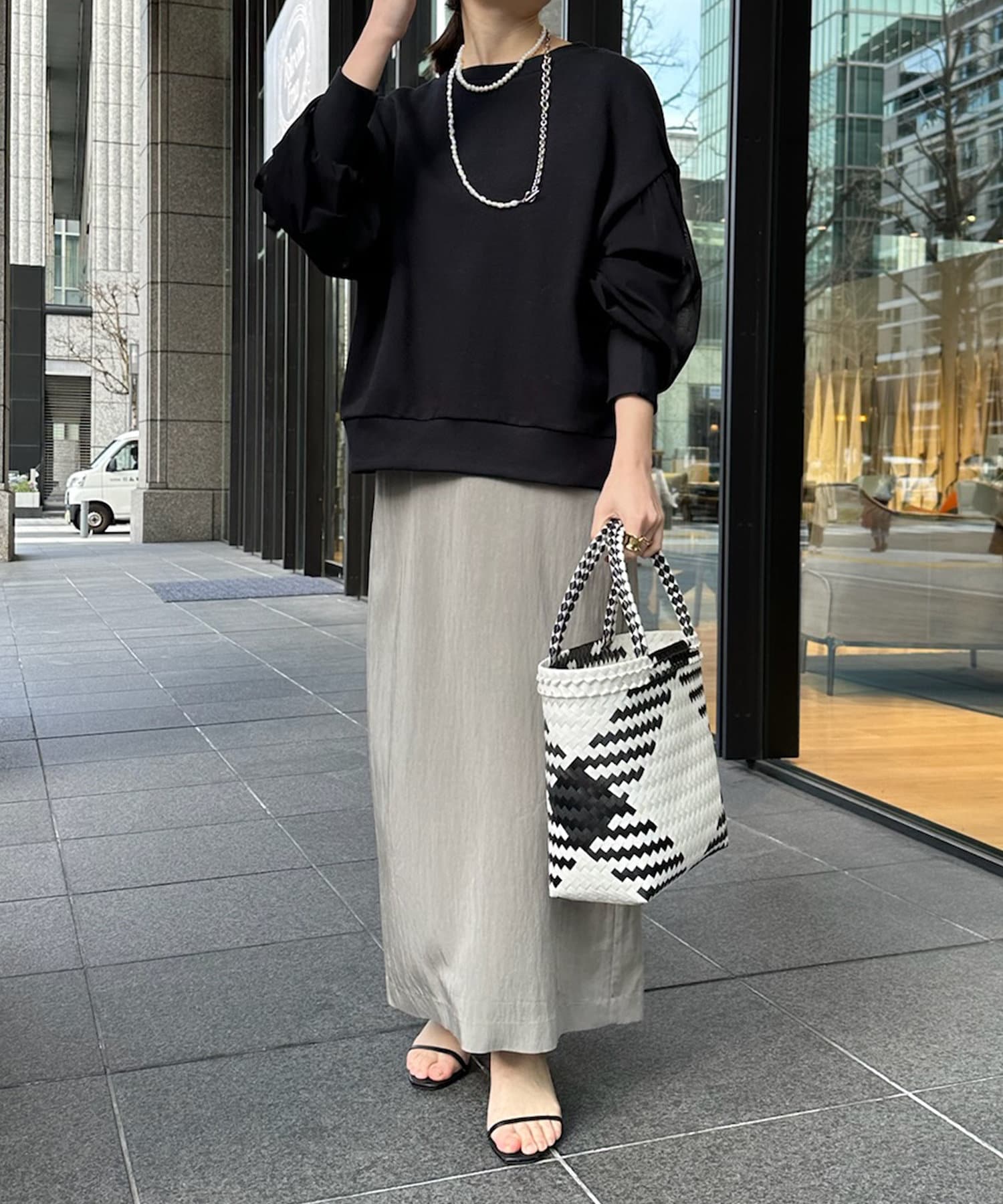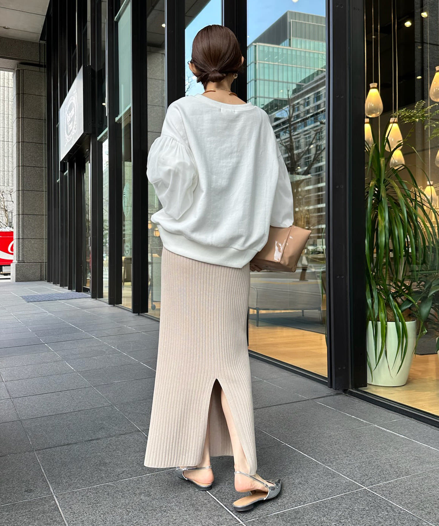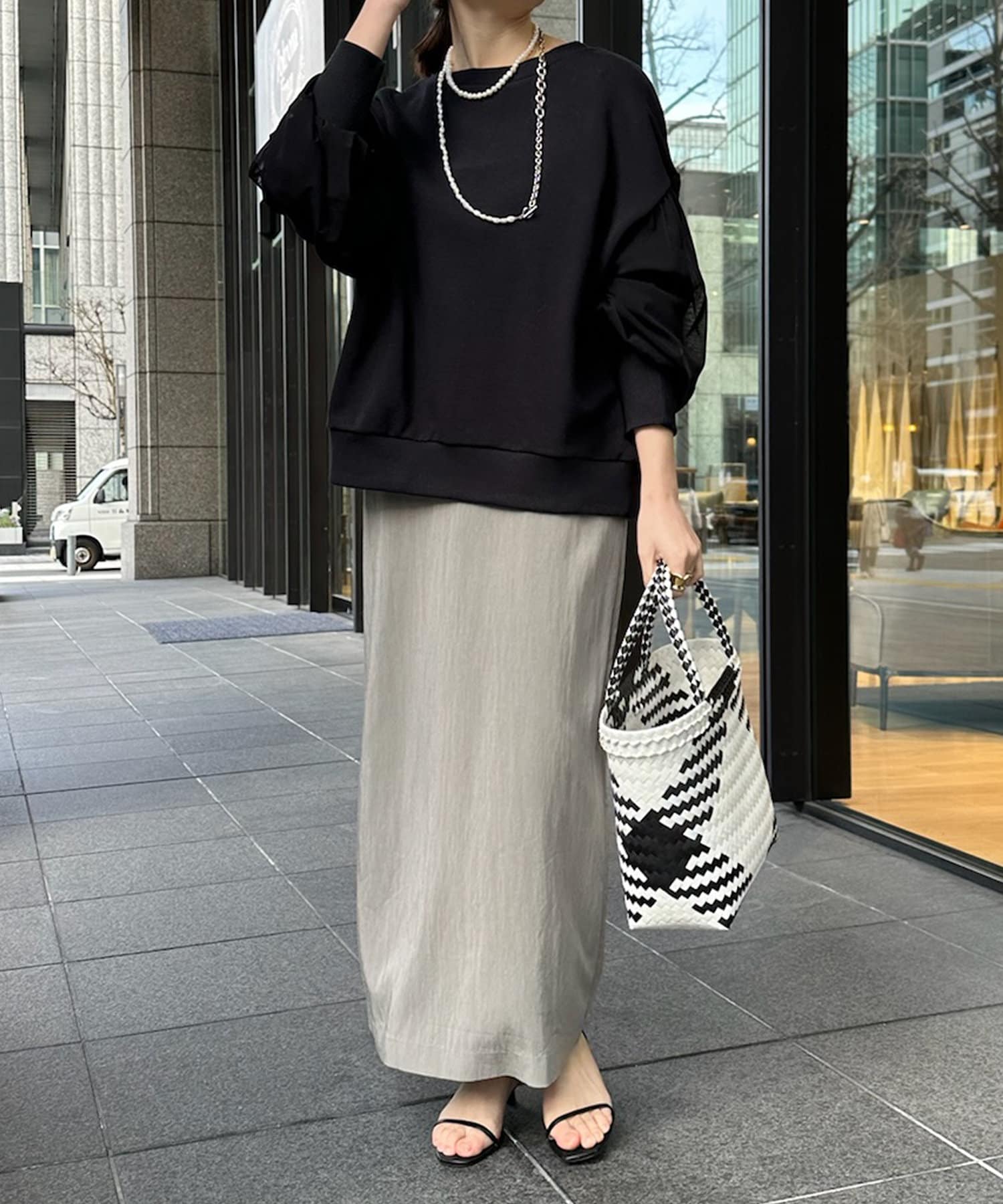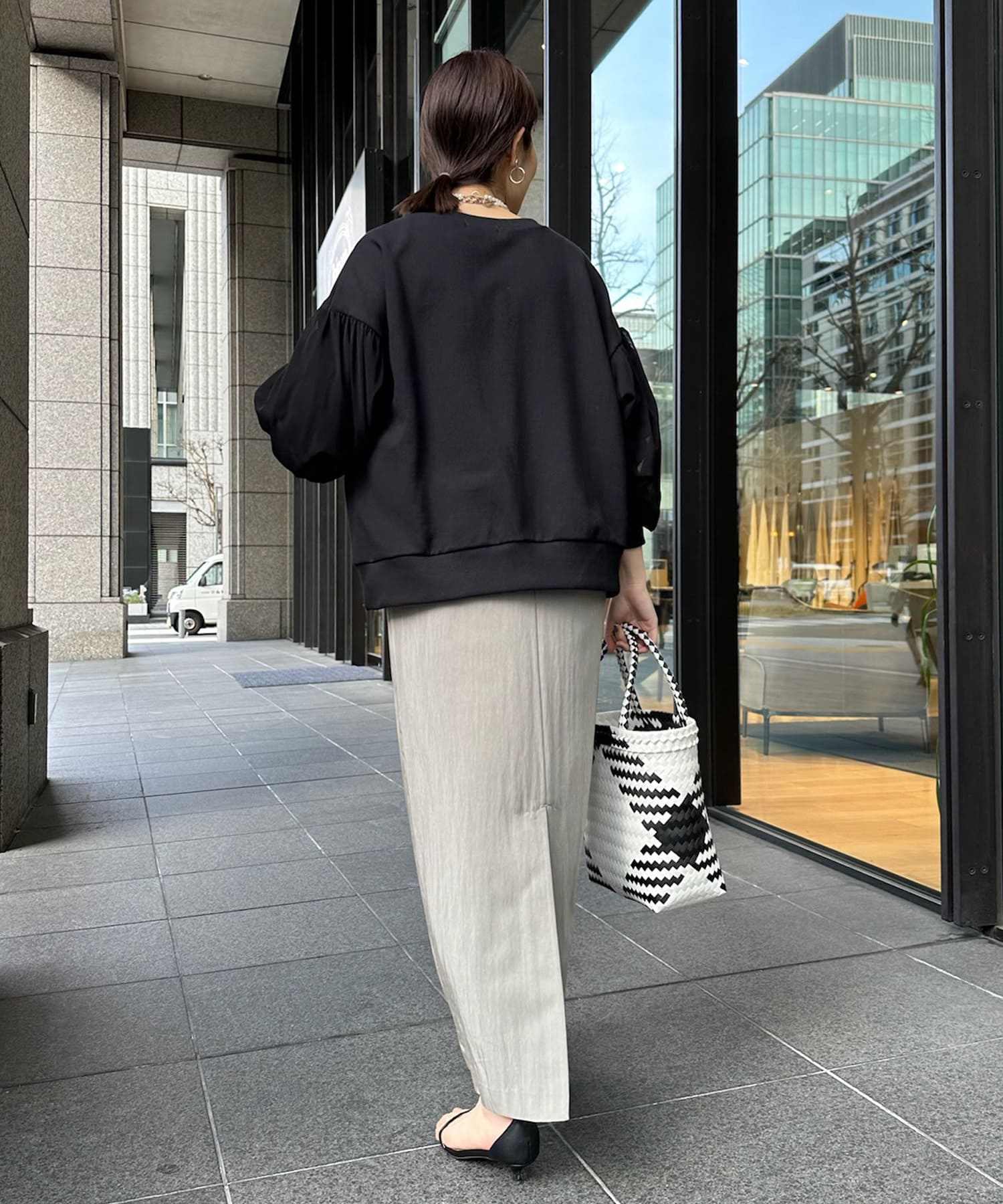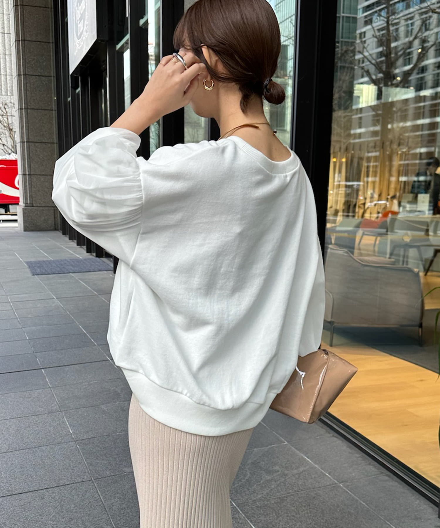本体はスウェット素材で仕上げることで、甘くなりすぎずに程よくカジュアルな印象です。