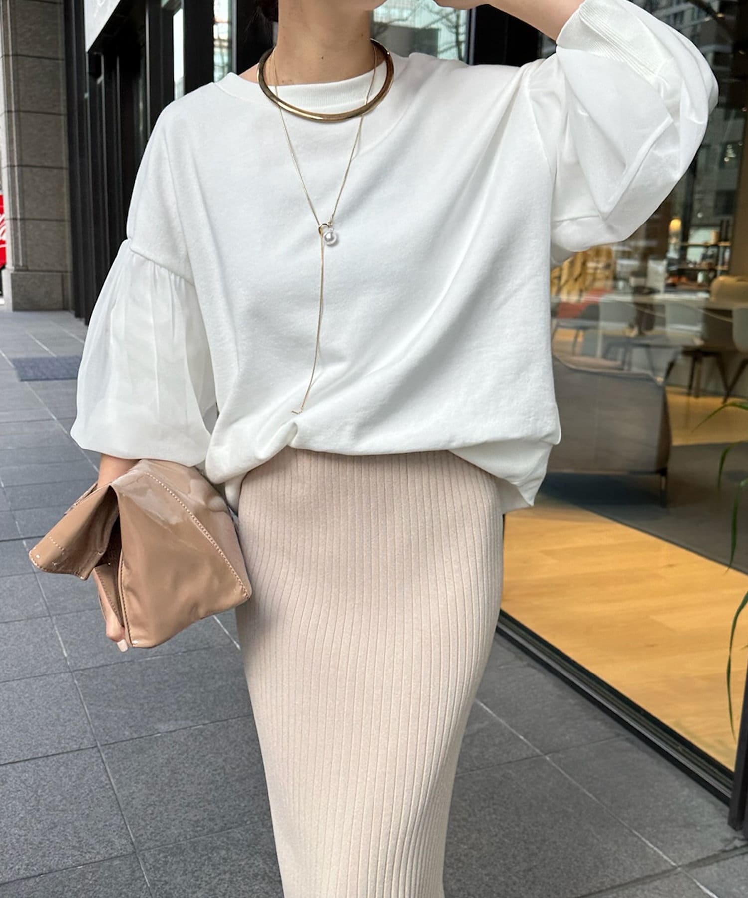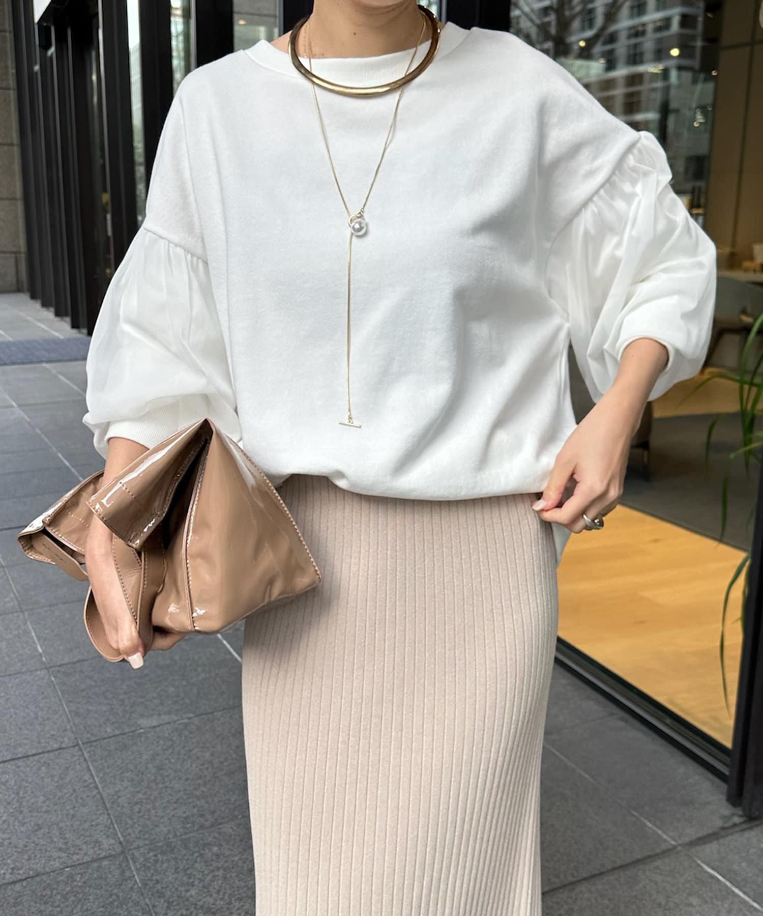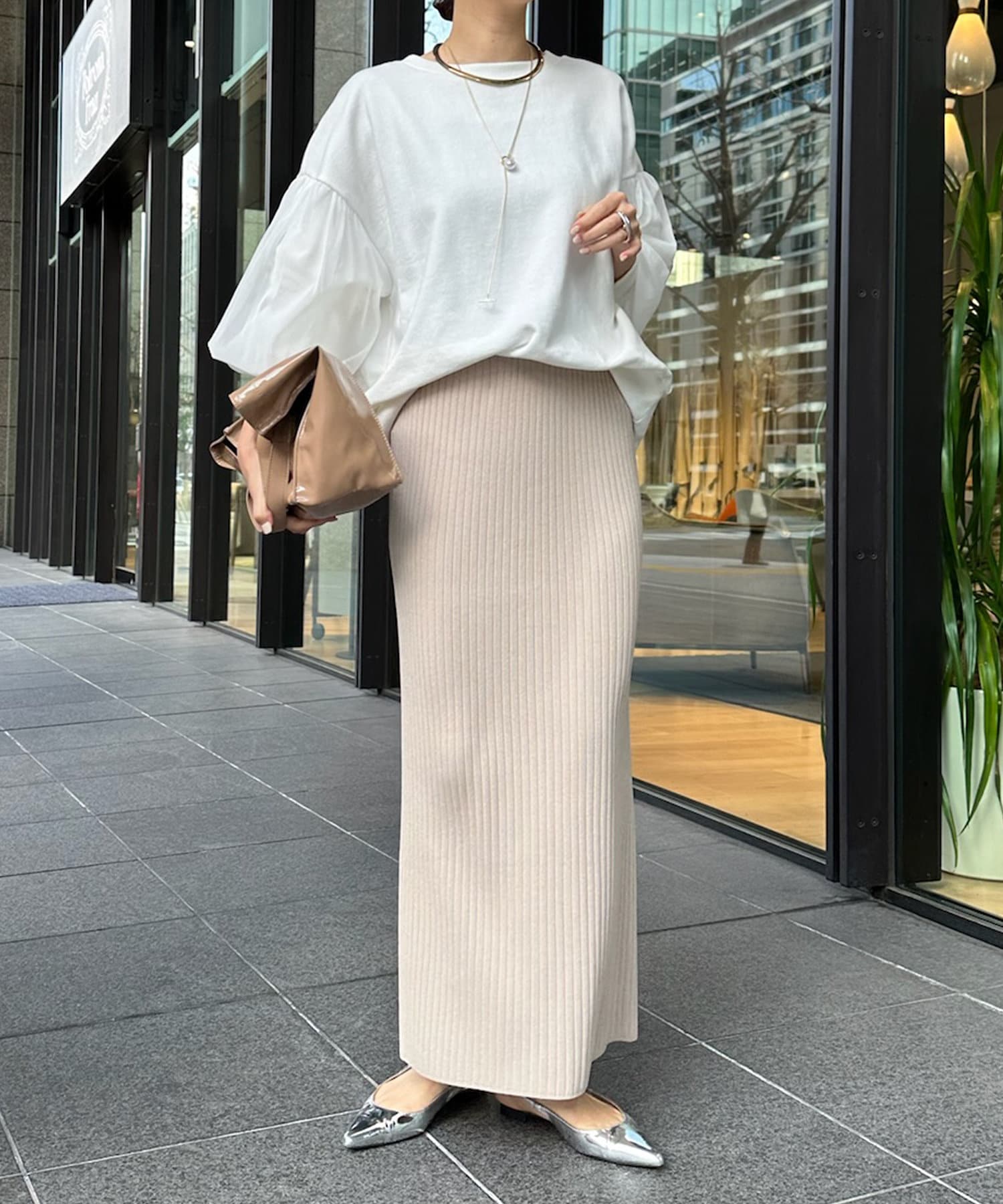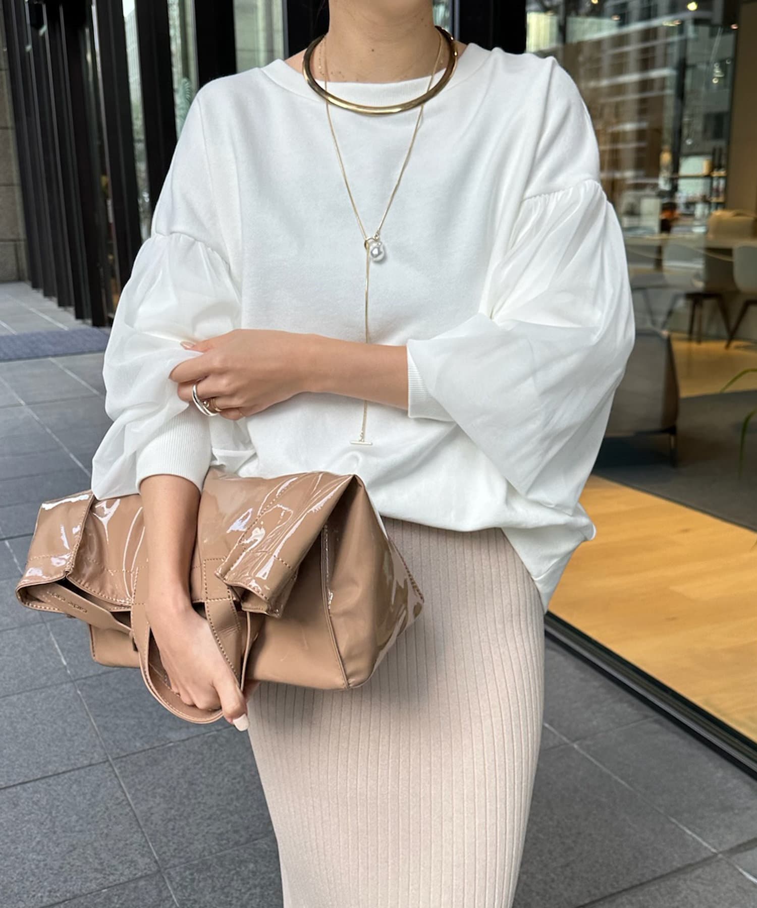 カジュアルなデニムやパンツと合わせて、アクセサリーをプラスしたスタイルがおすすめです。
