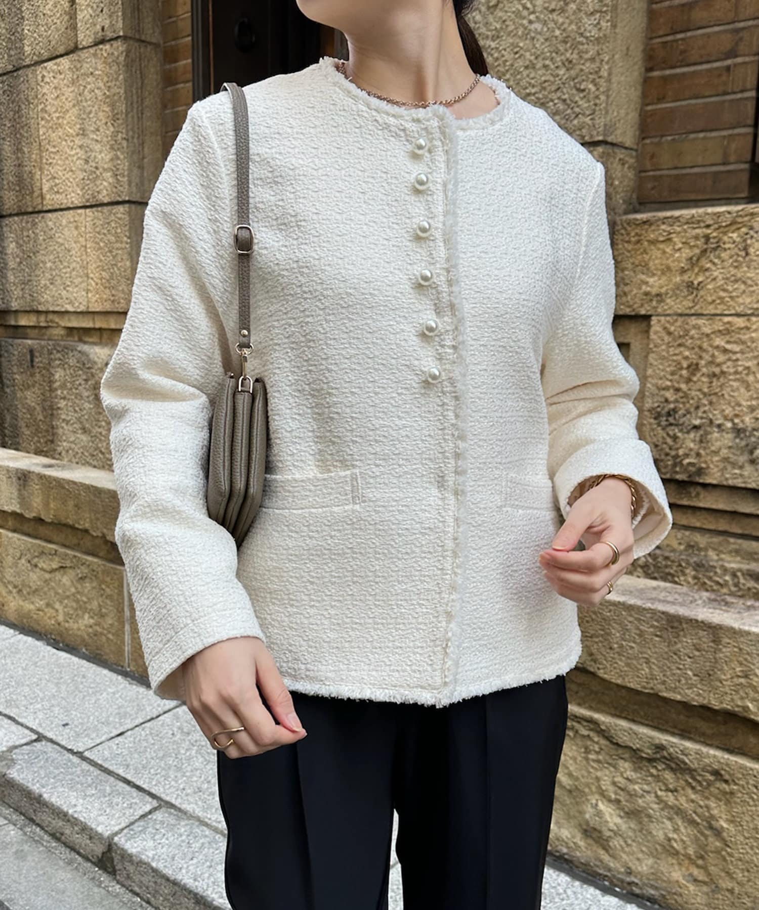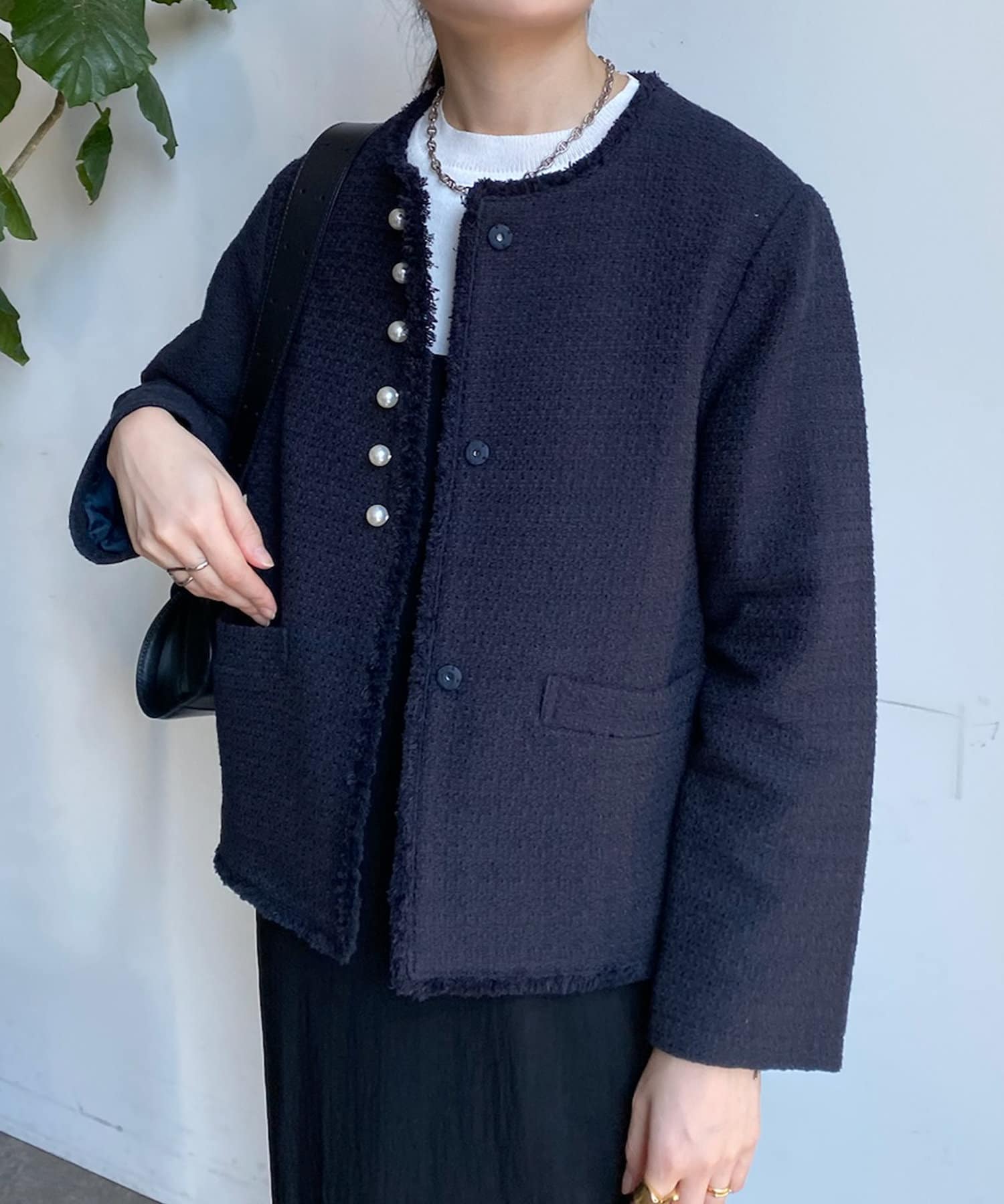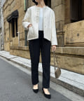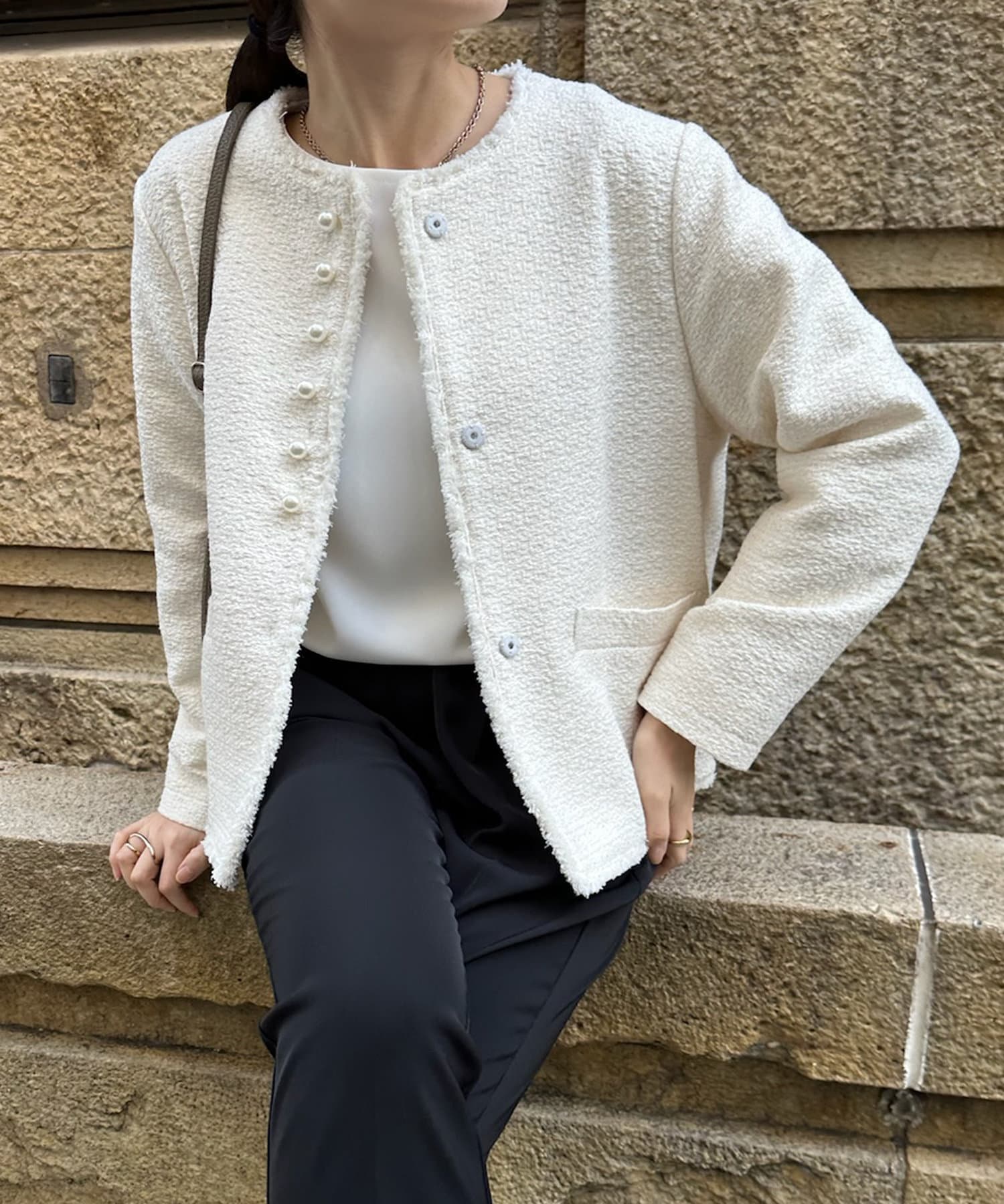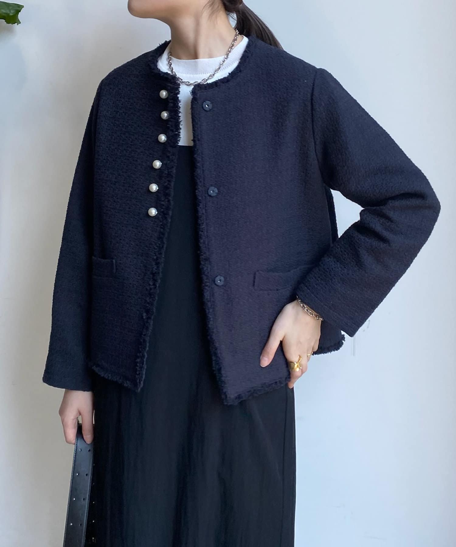 そして、トレンドのパールがアクセントになり、首周りはノーカラーですっきりと。重たくなり過ぎない印象に仕上がります。