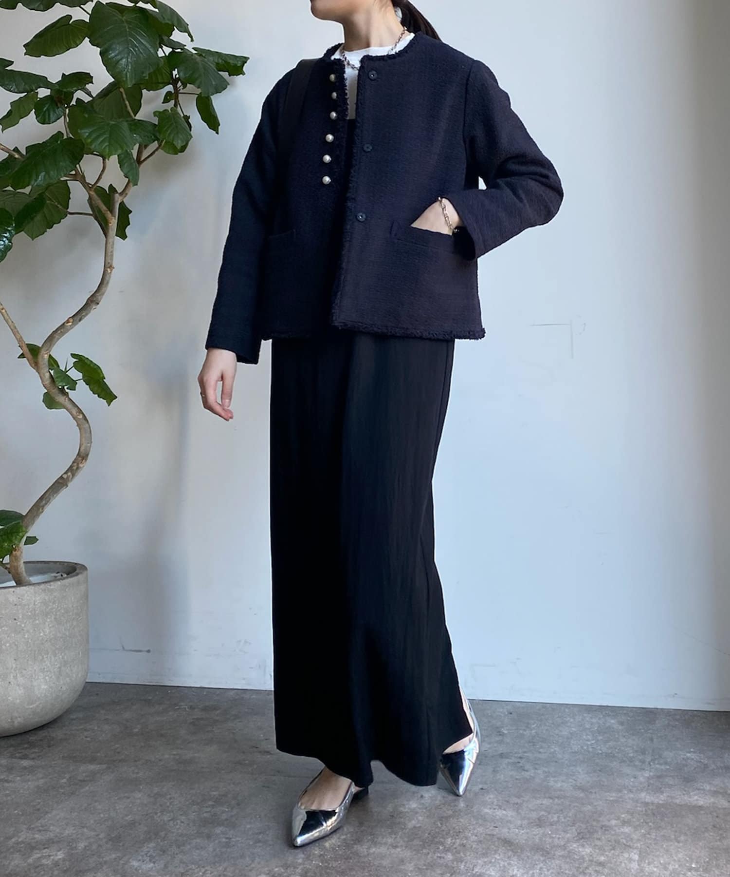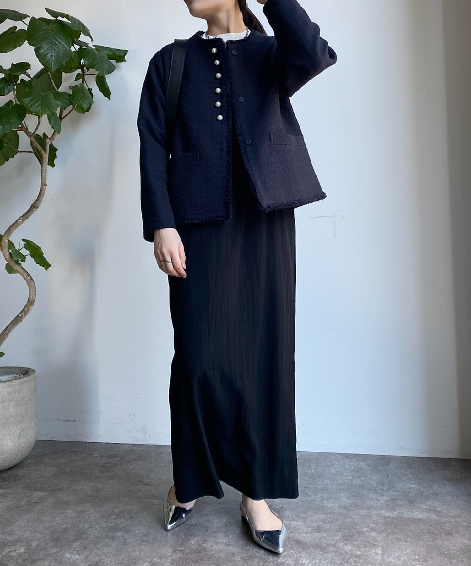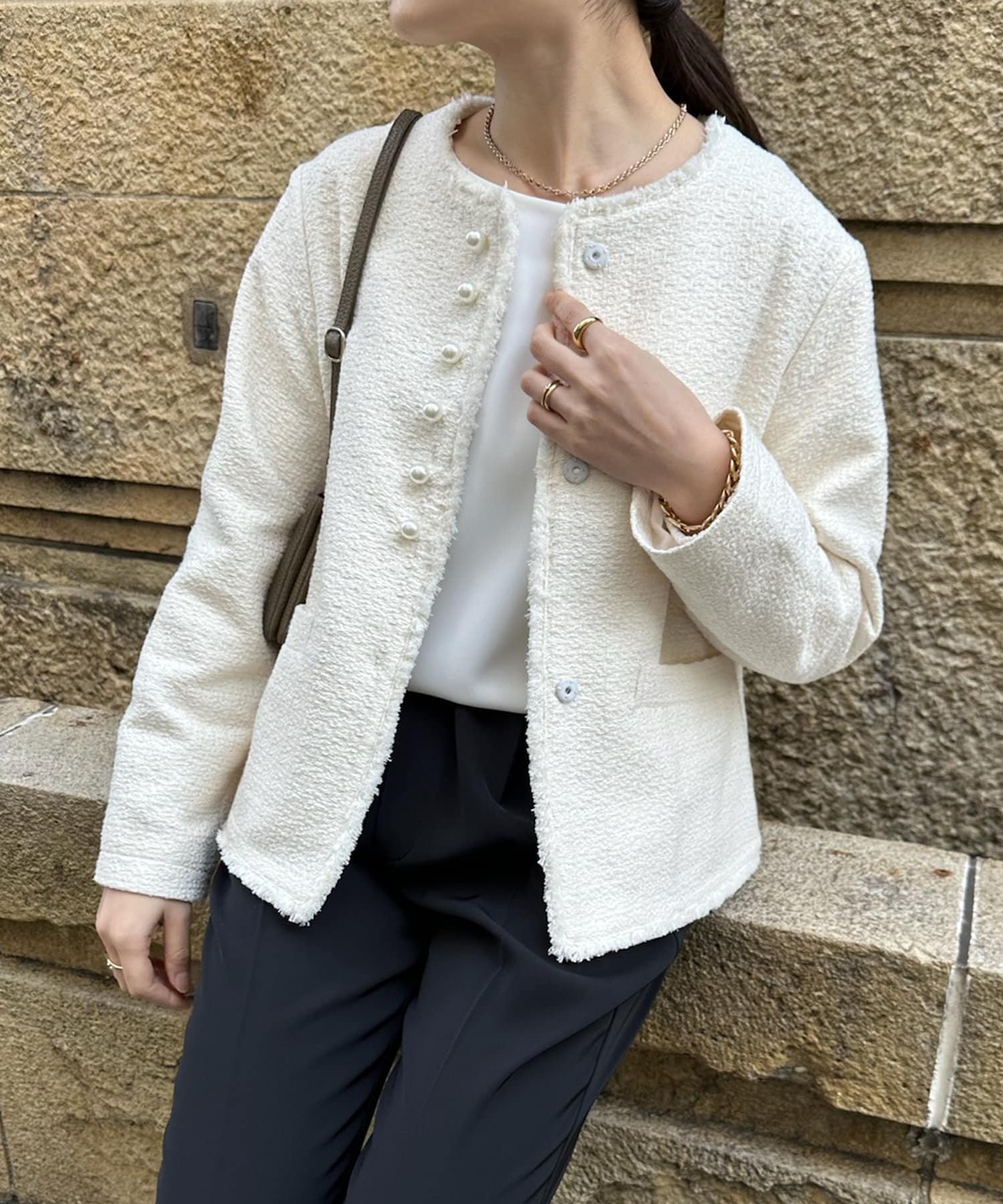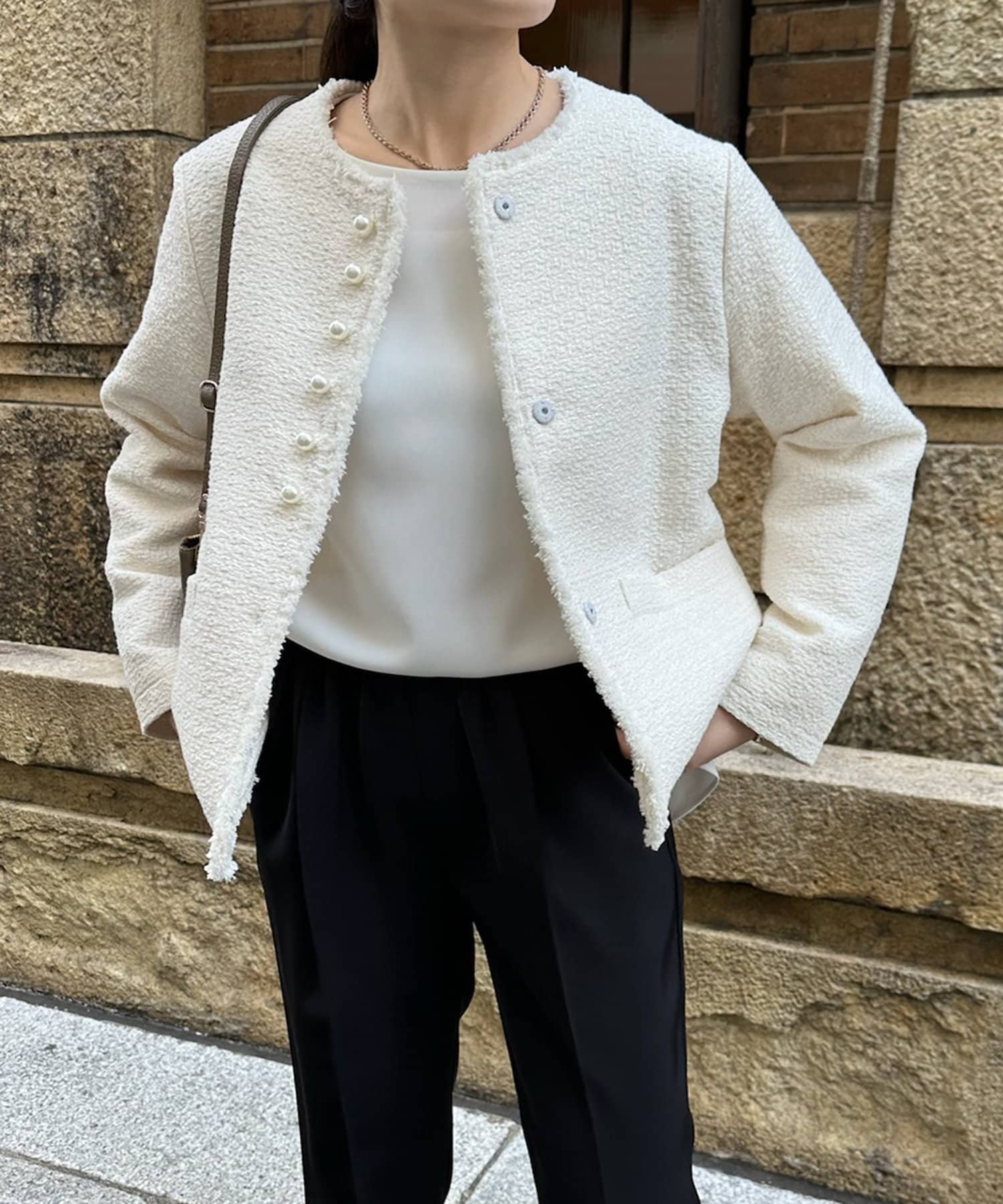 そして、トレンドのパールがアクセントになり、首周りはノーカラーですっきりと。重たくなり過ぎない印象に仕上がります。