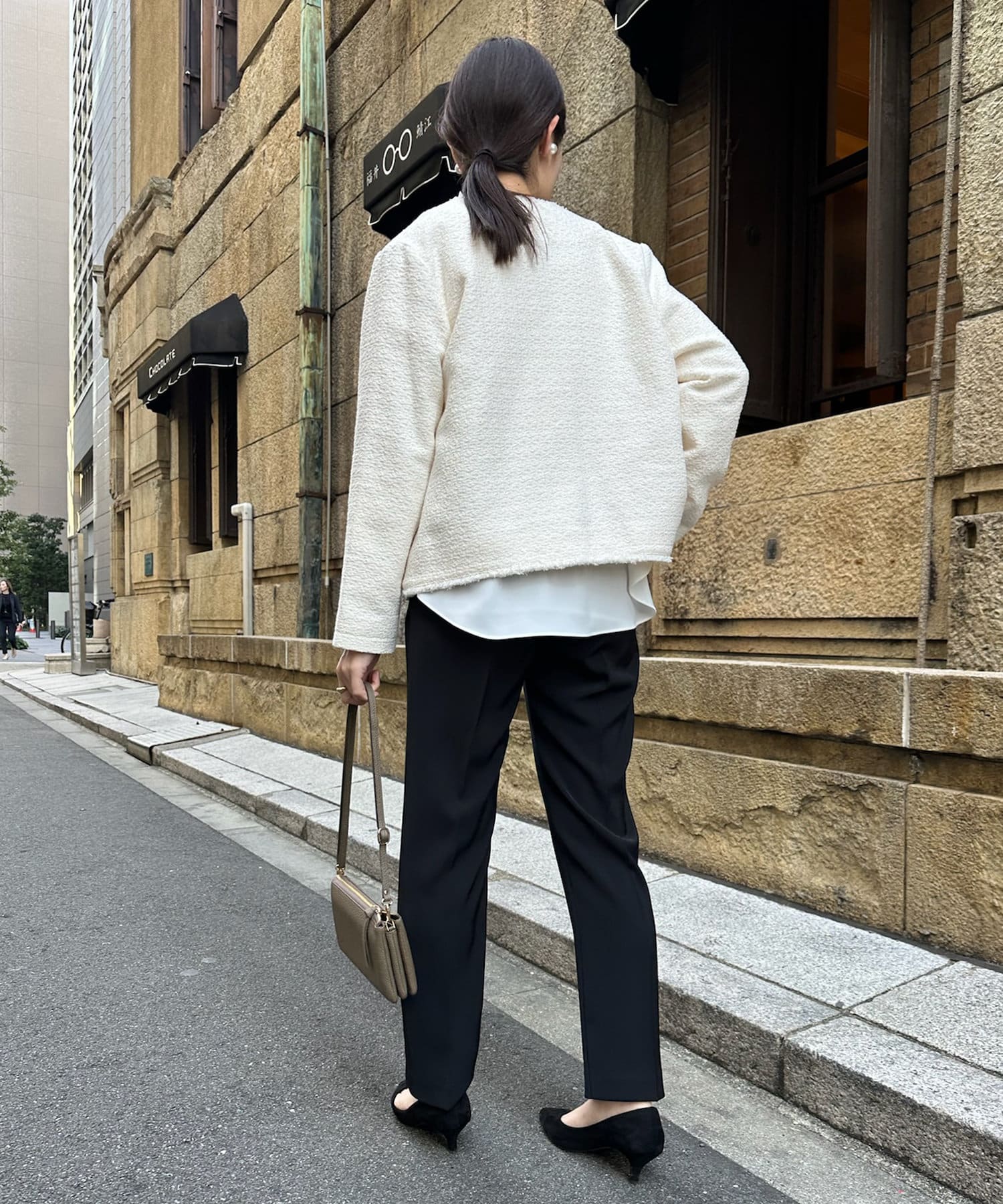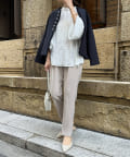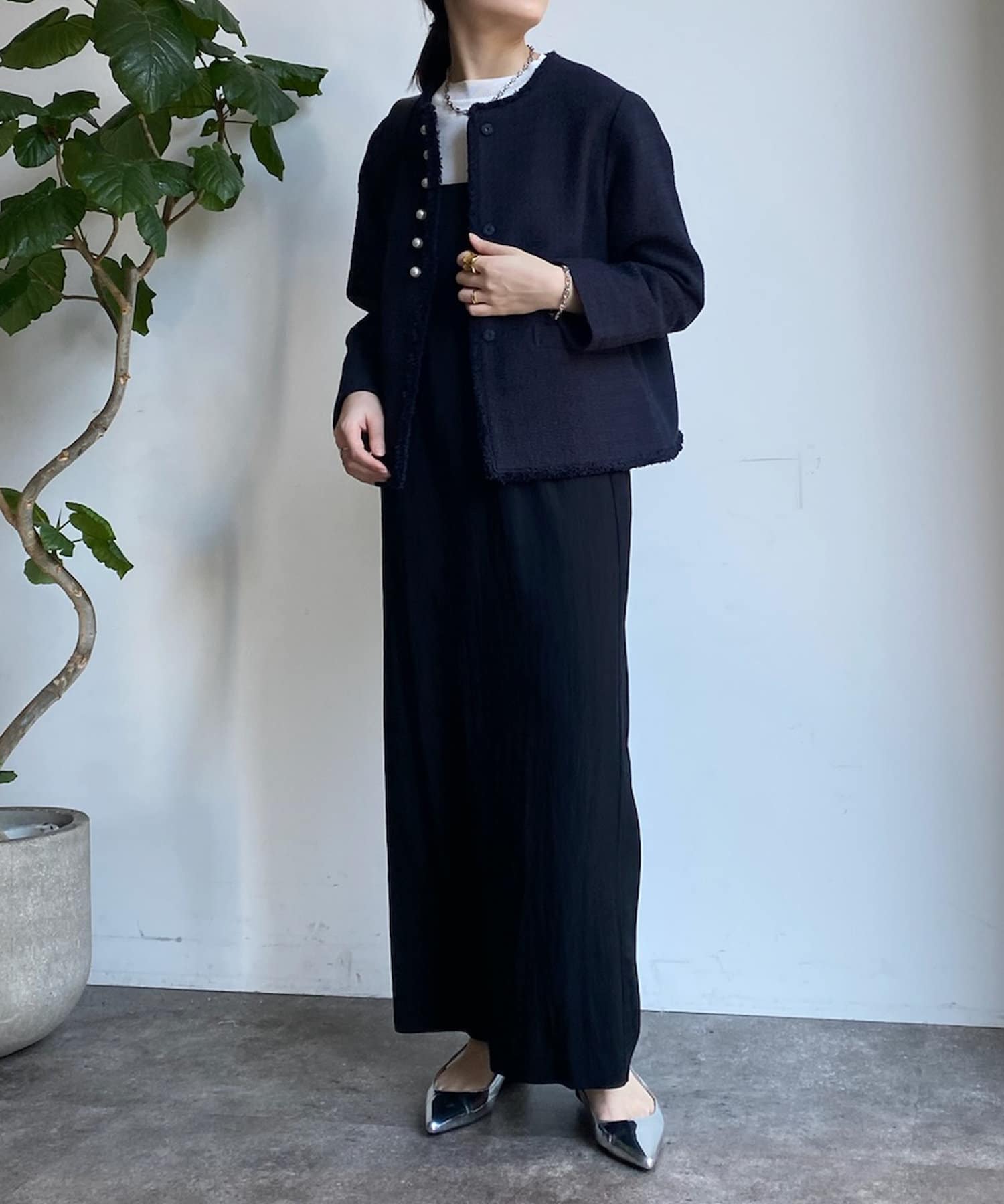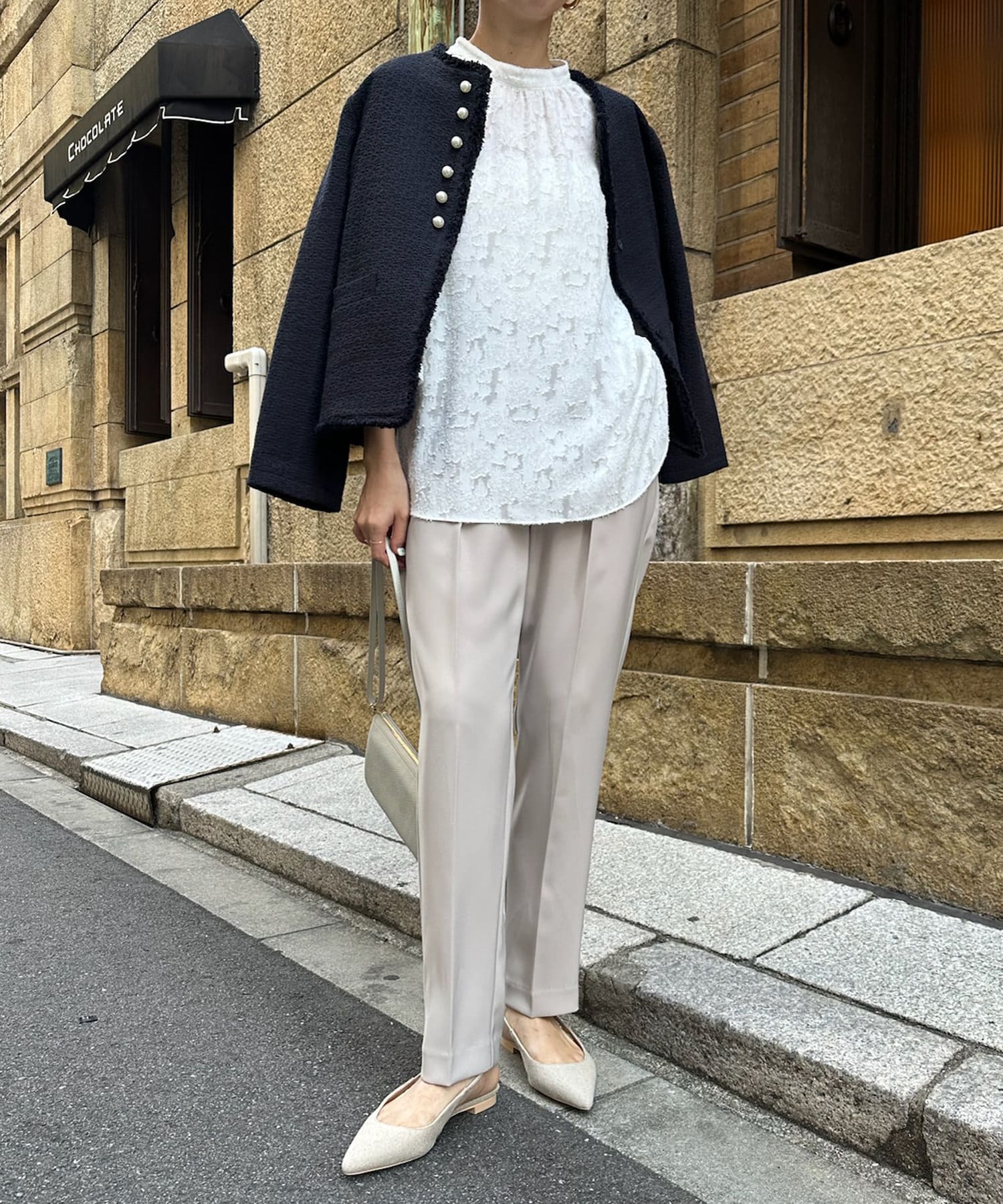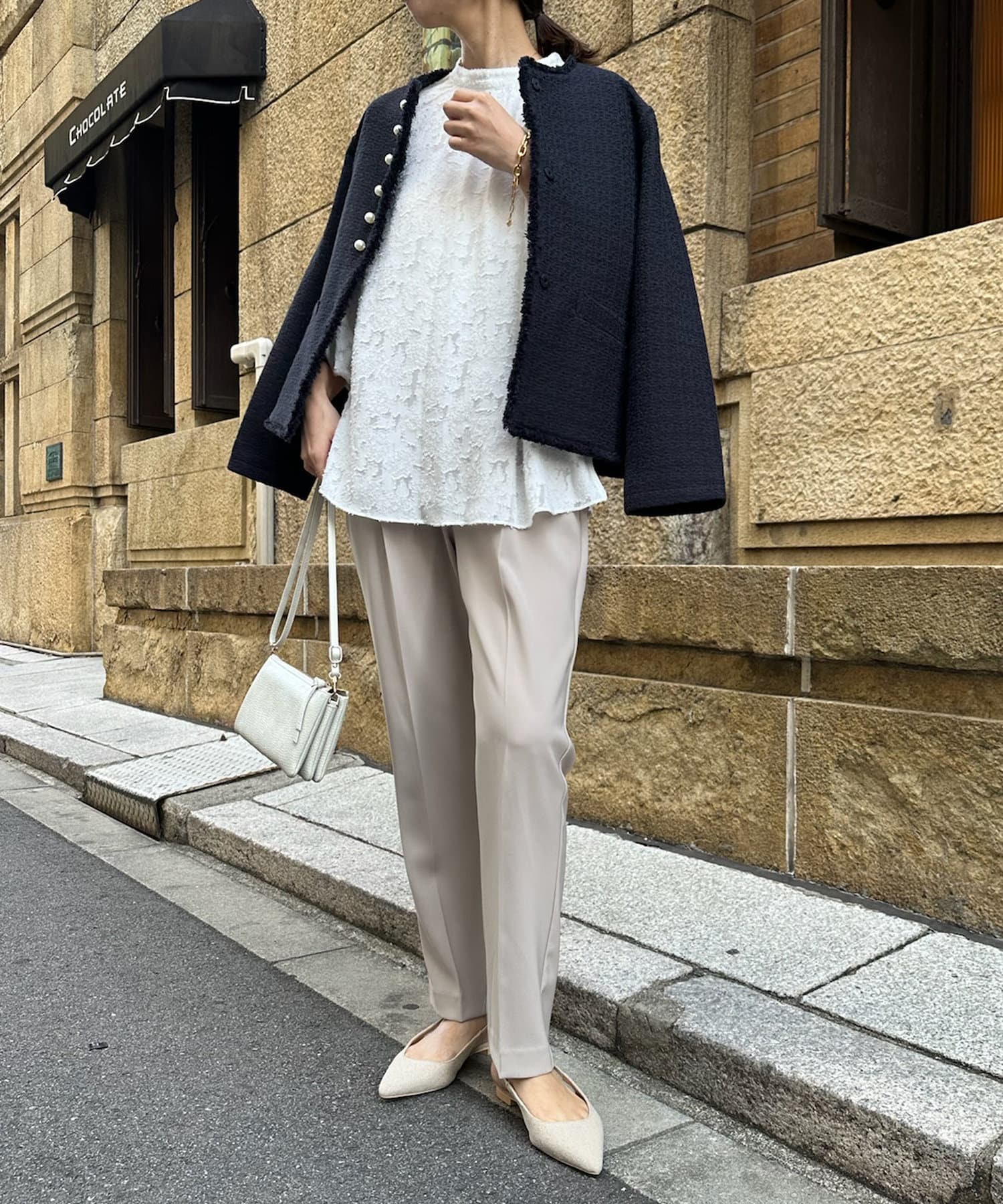 そして、トレンドのパールがアクセントになり、首周りはノーカラーですっきりと。重たくなり過ぎない印象に仕上がります。