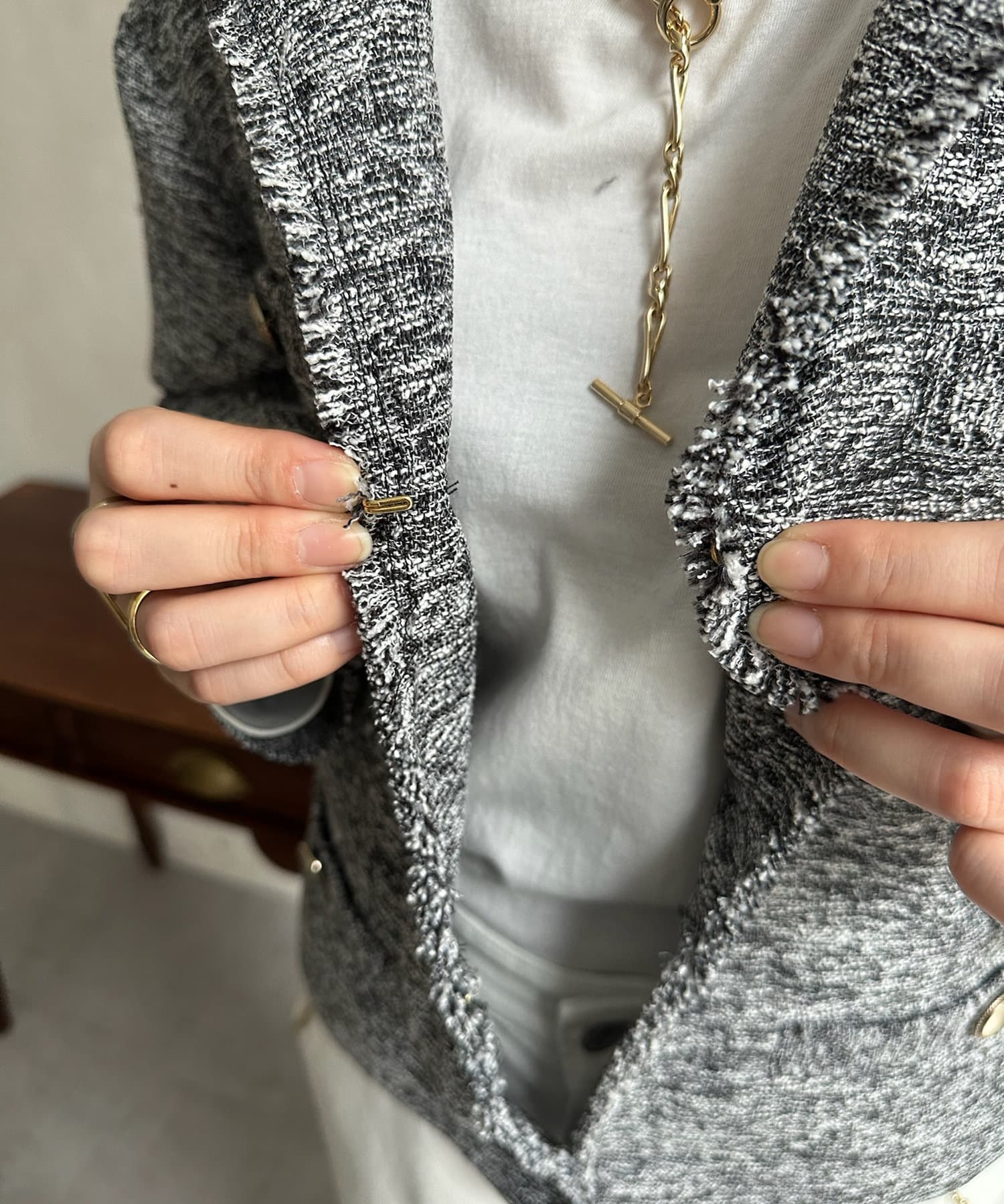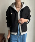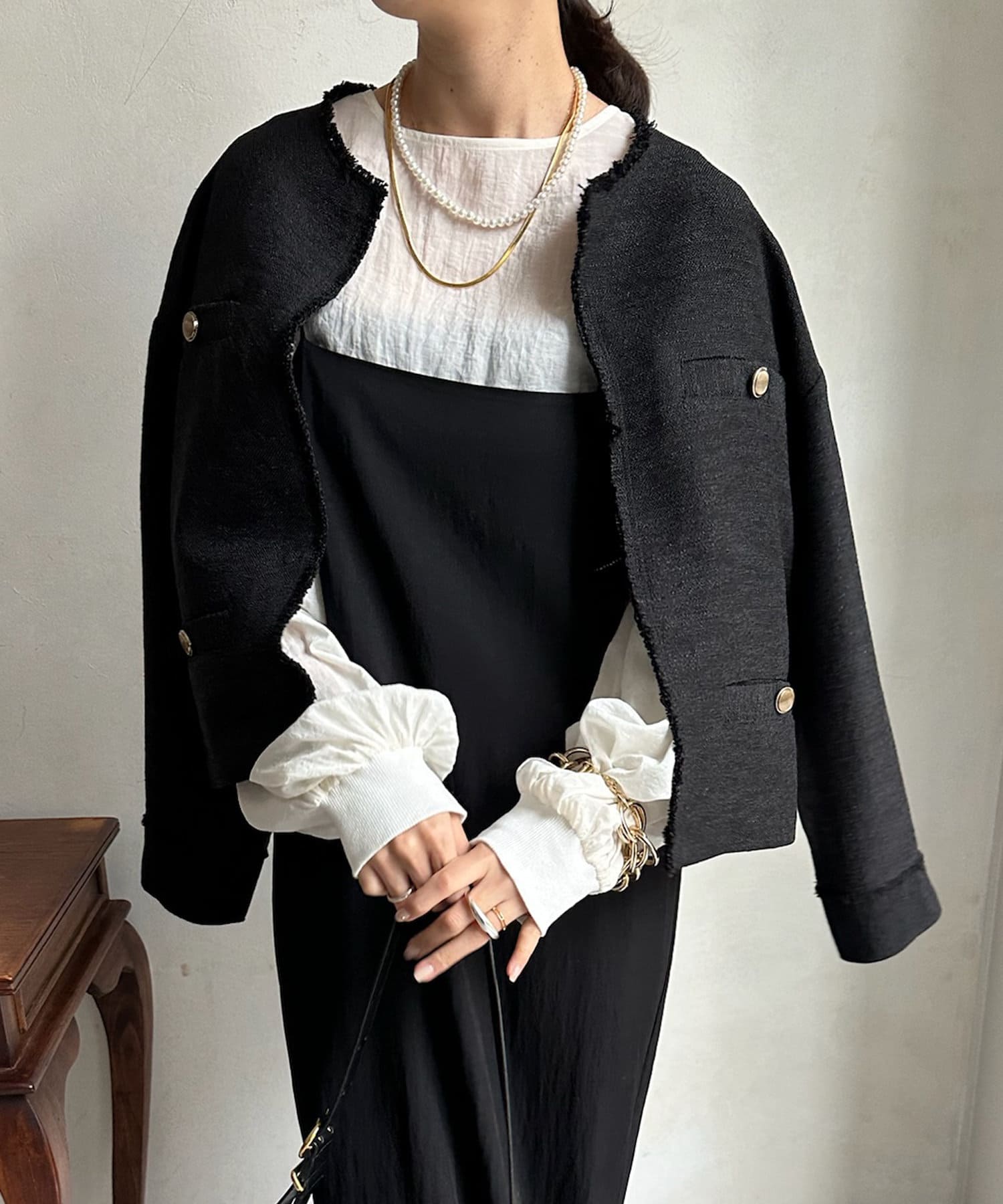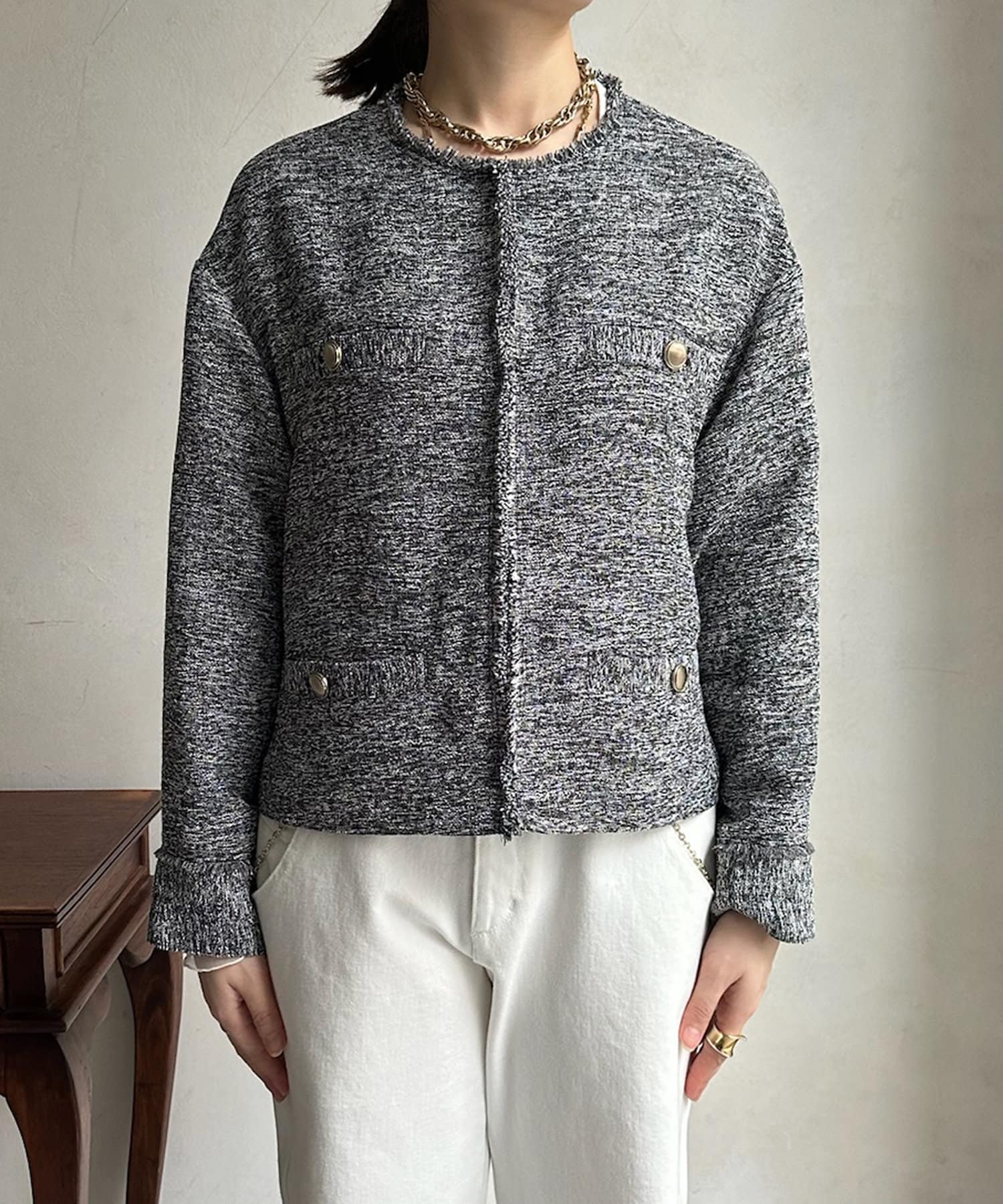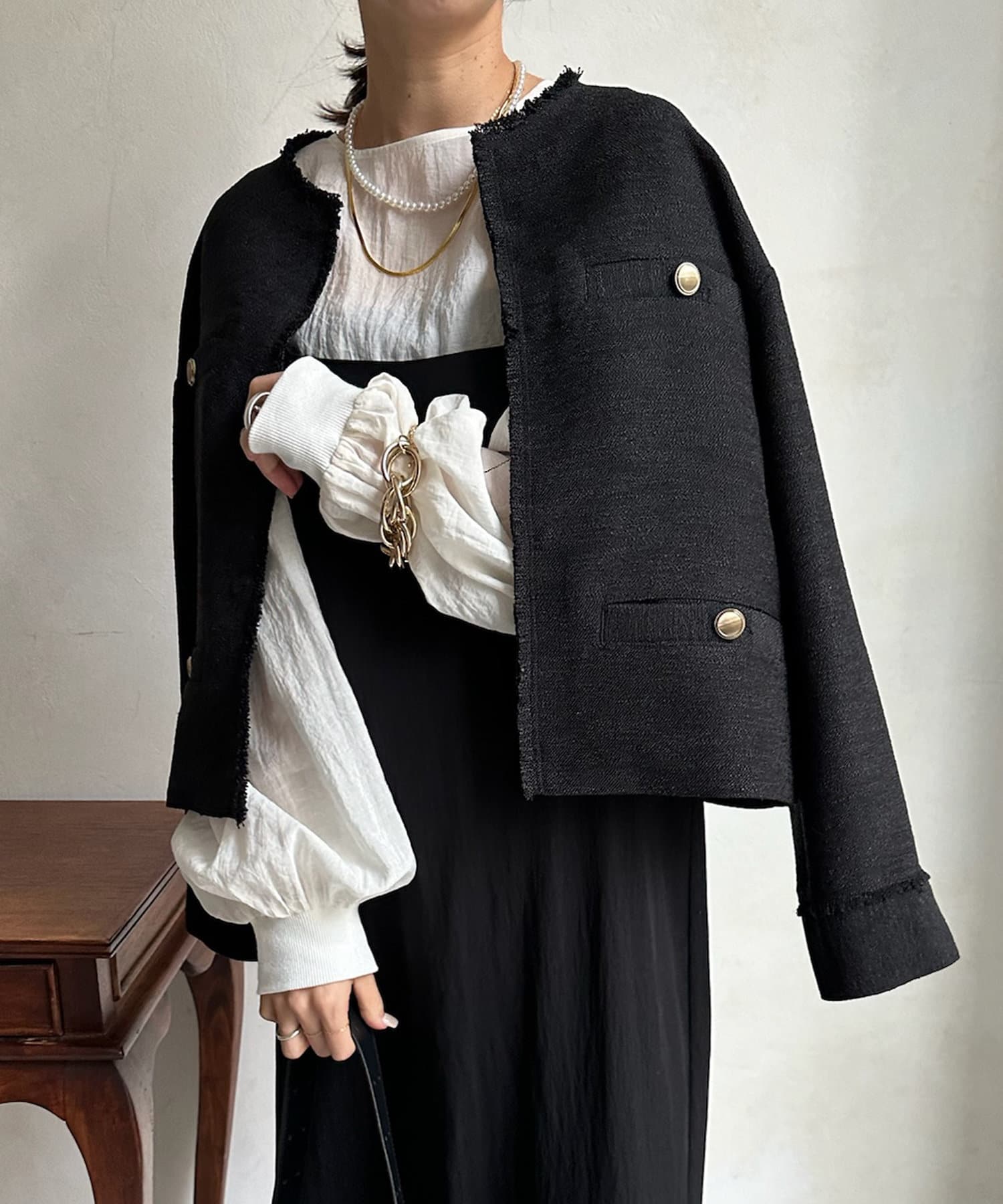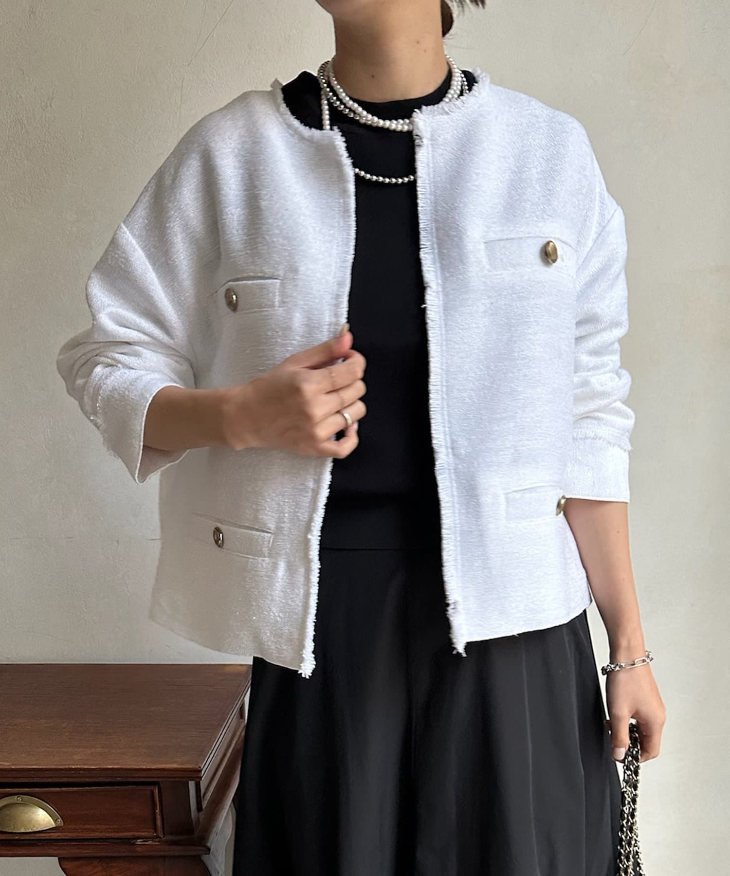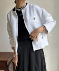 ノーカラーのデザインがお顔周りをすっきりとみせてくれ、4つのポケットとゴールドのボタンがクラシックなポイントに。