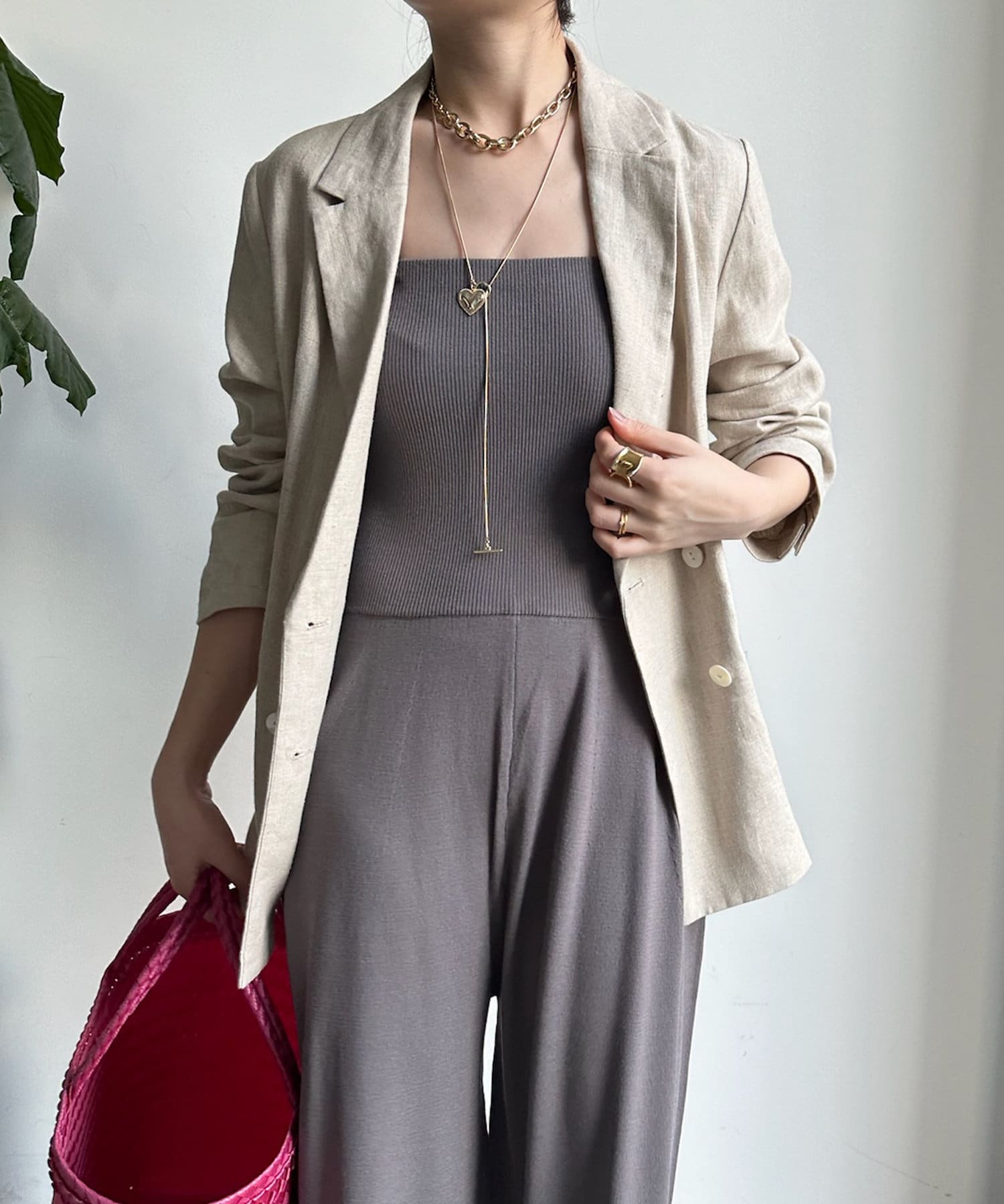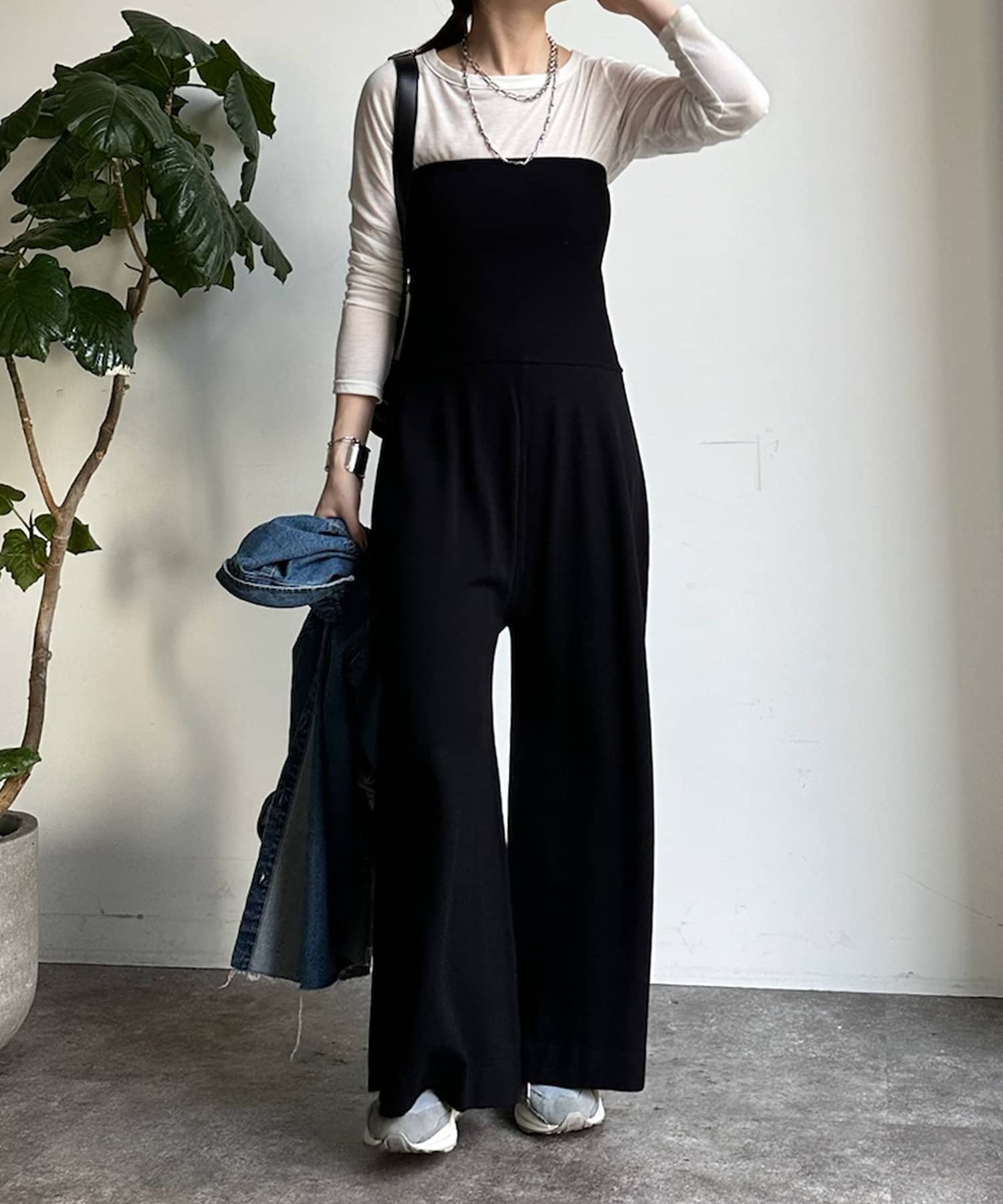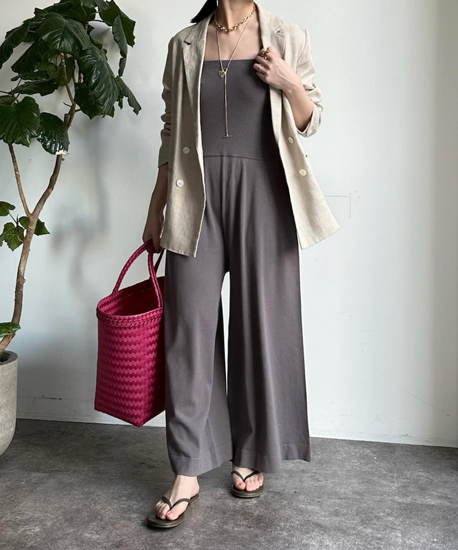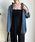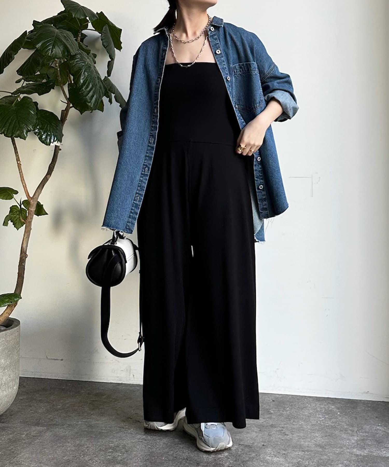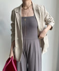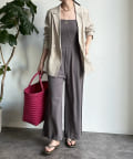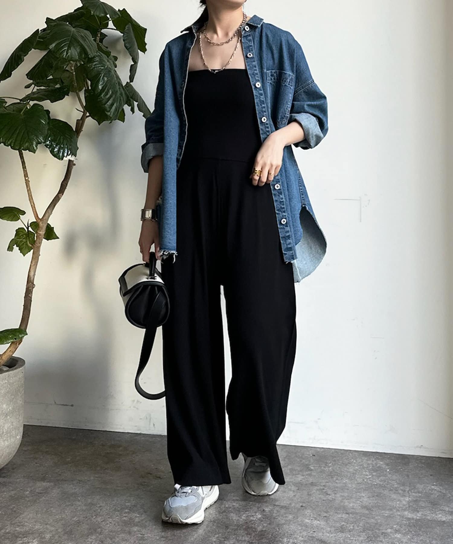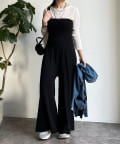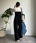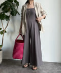 ベアトップとワイドなシルエットのパンツ部分が印象的なオールインワン。