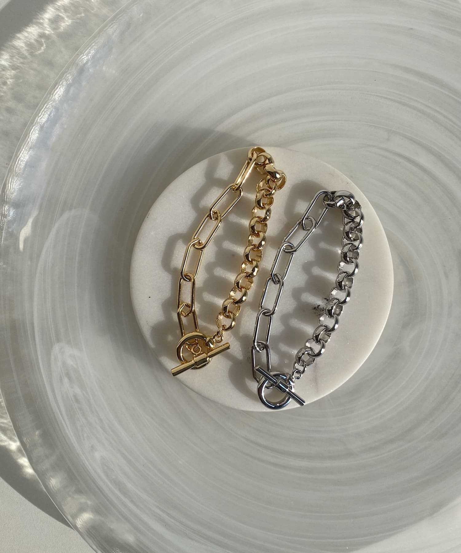 2種類の異なるチェーンが連なったデザインチェーンブレスレット。