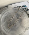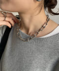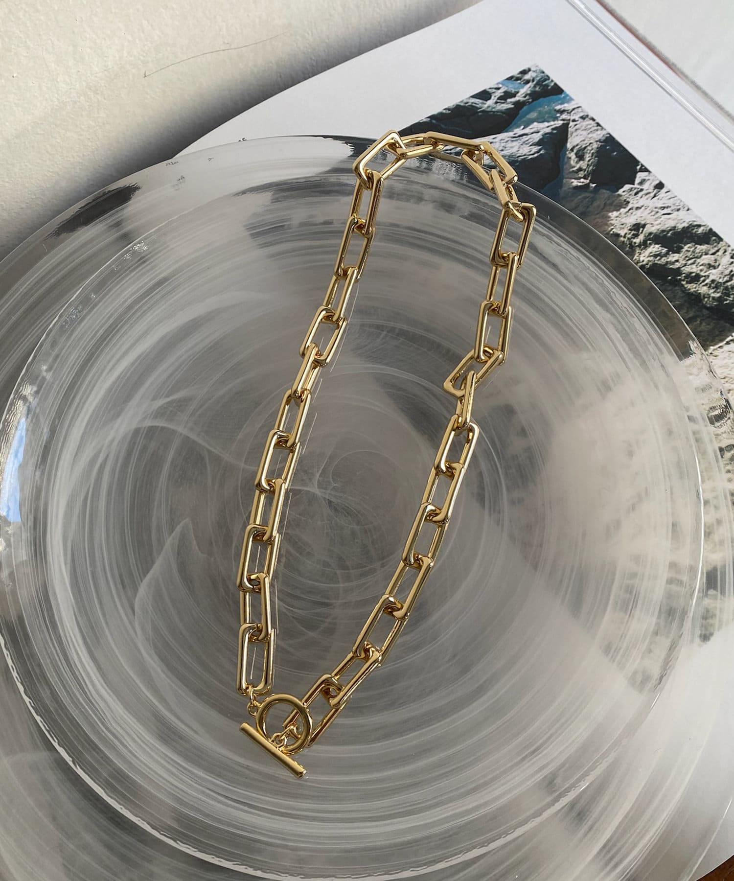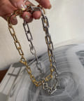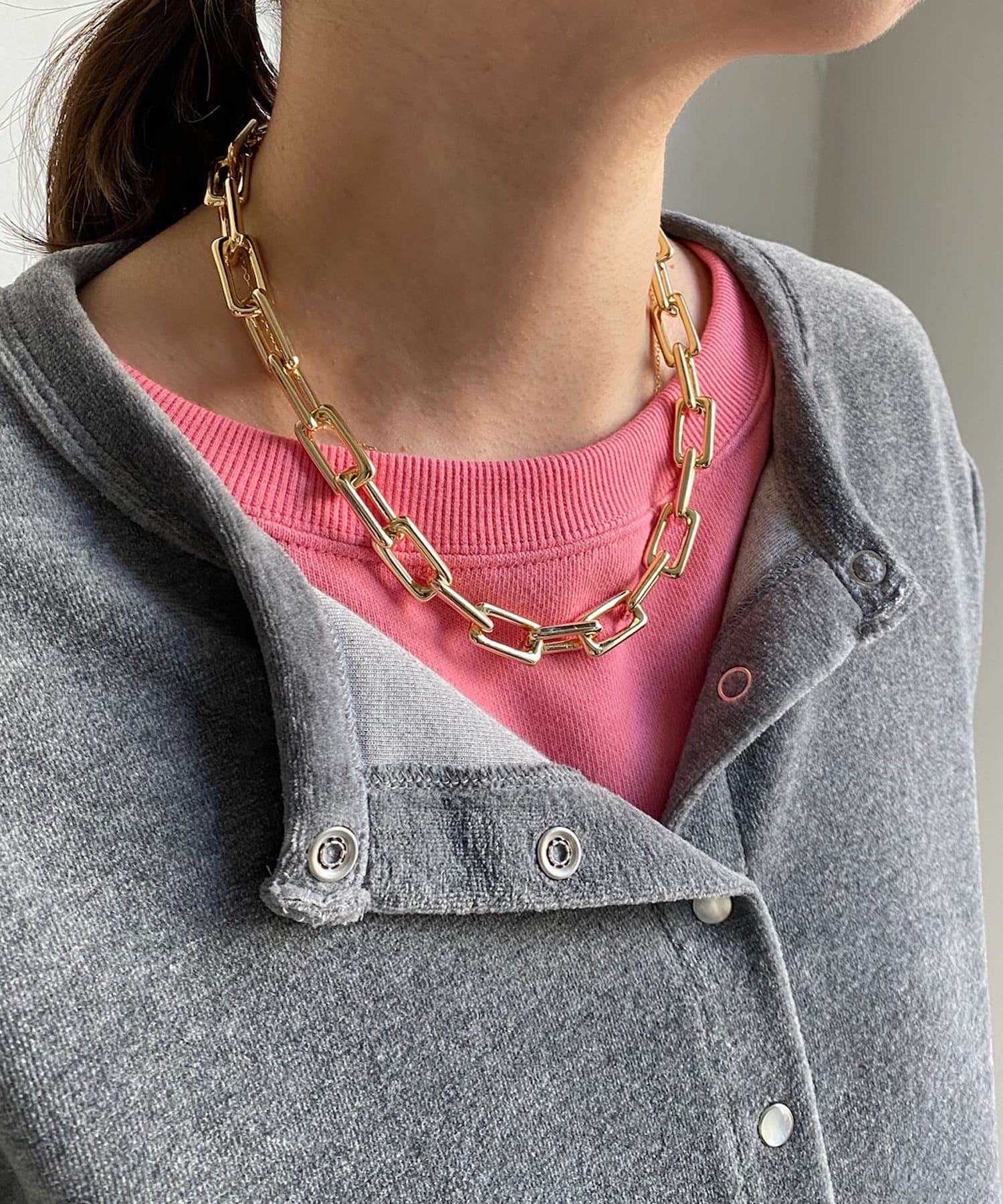 やや太めで存在感のあるネックレスで、スクエアのチェーンがコーディネートに