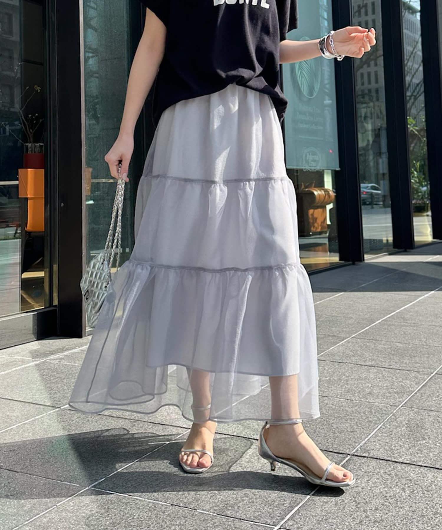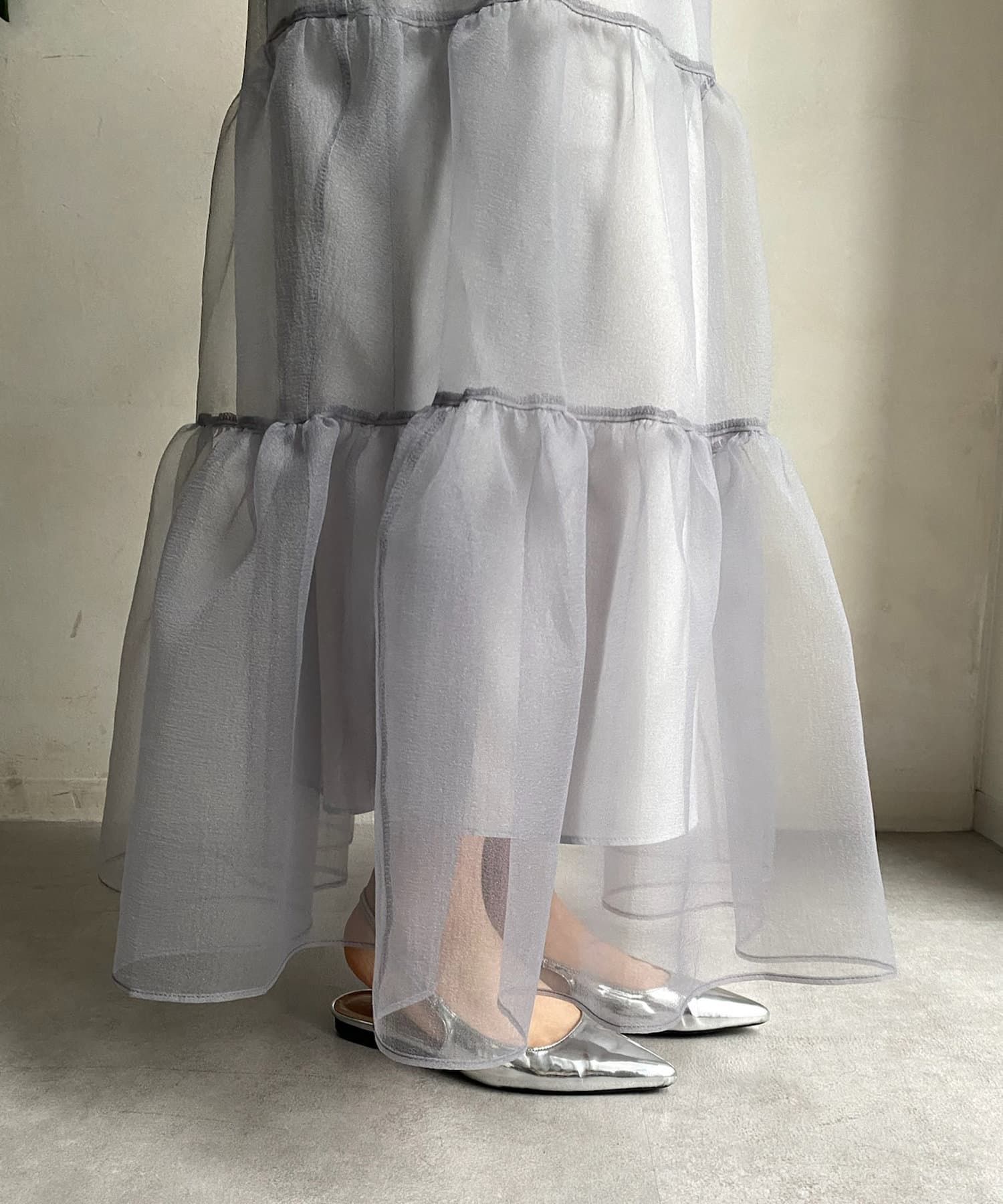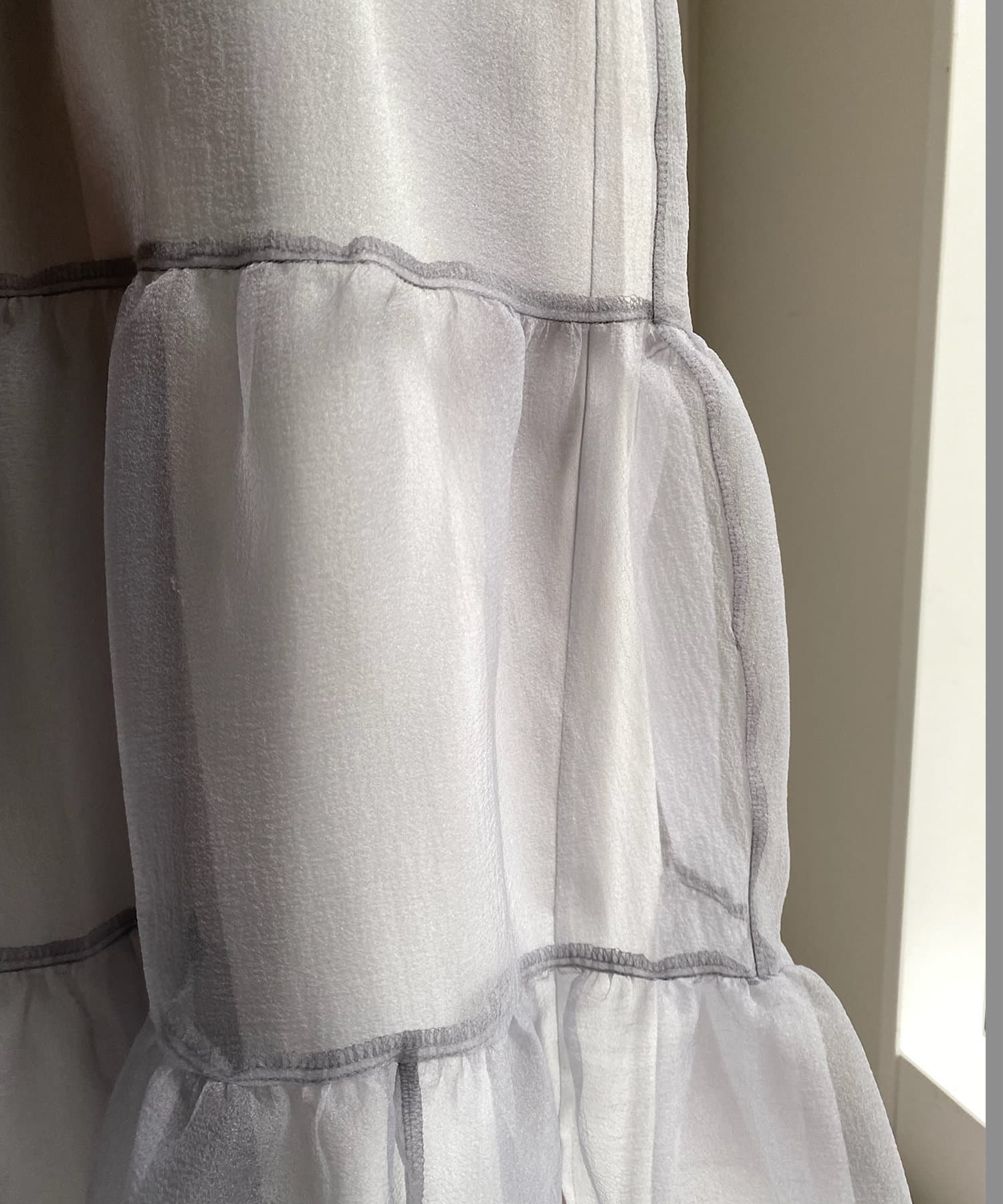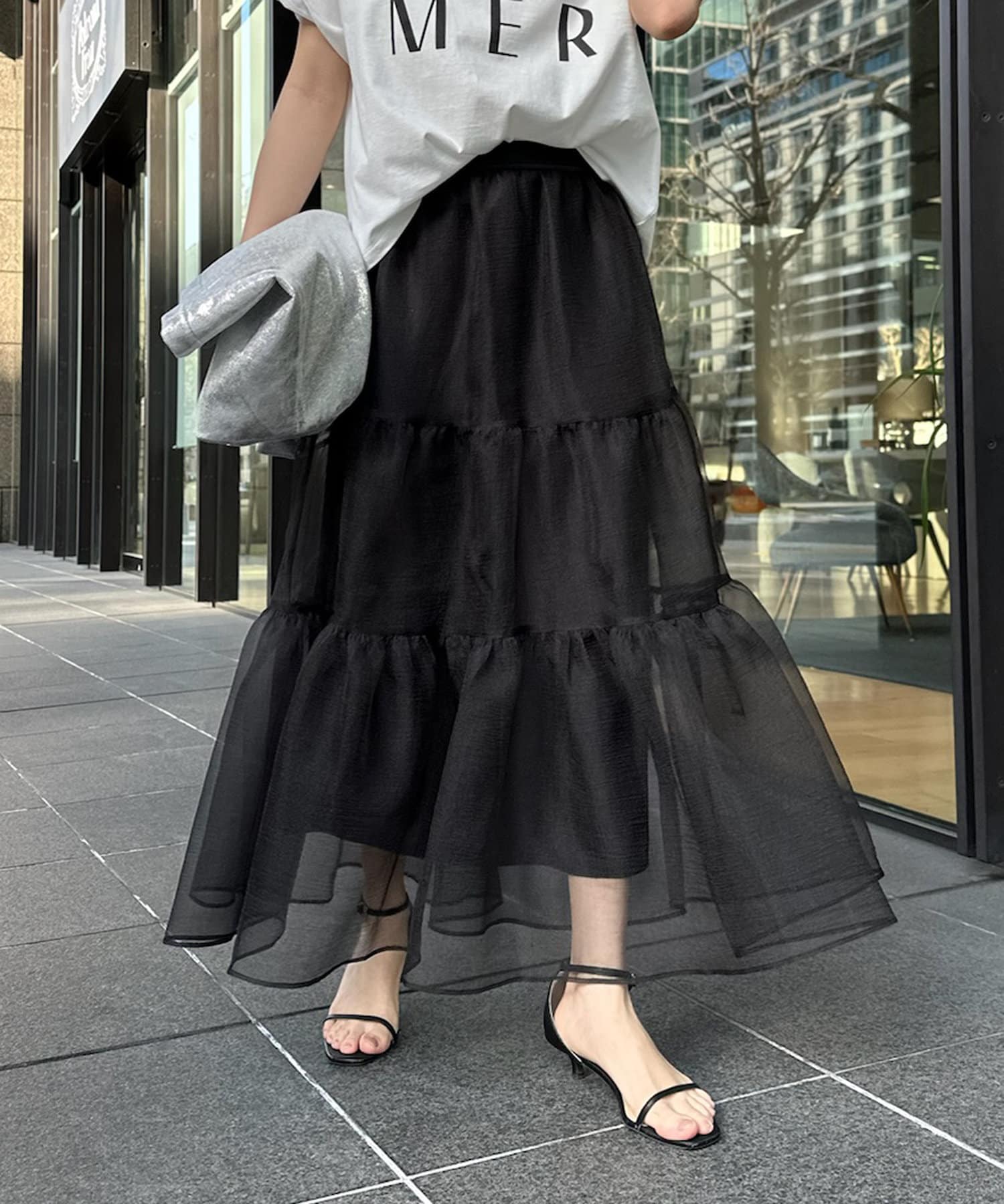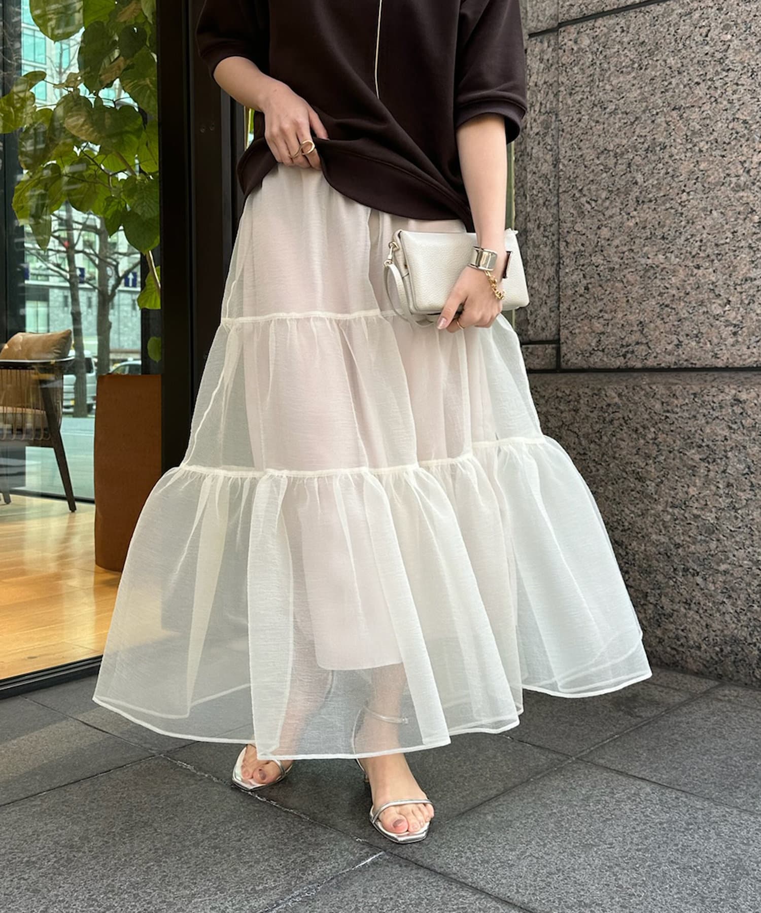 透け感がかわいいオーガンジー素材に、ティアードシルエットで今年らしさをたっぷりとプラス。