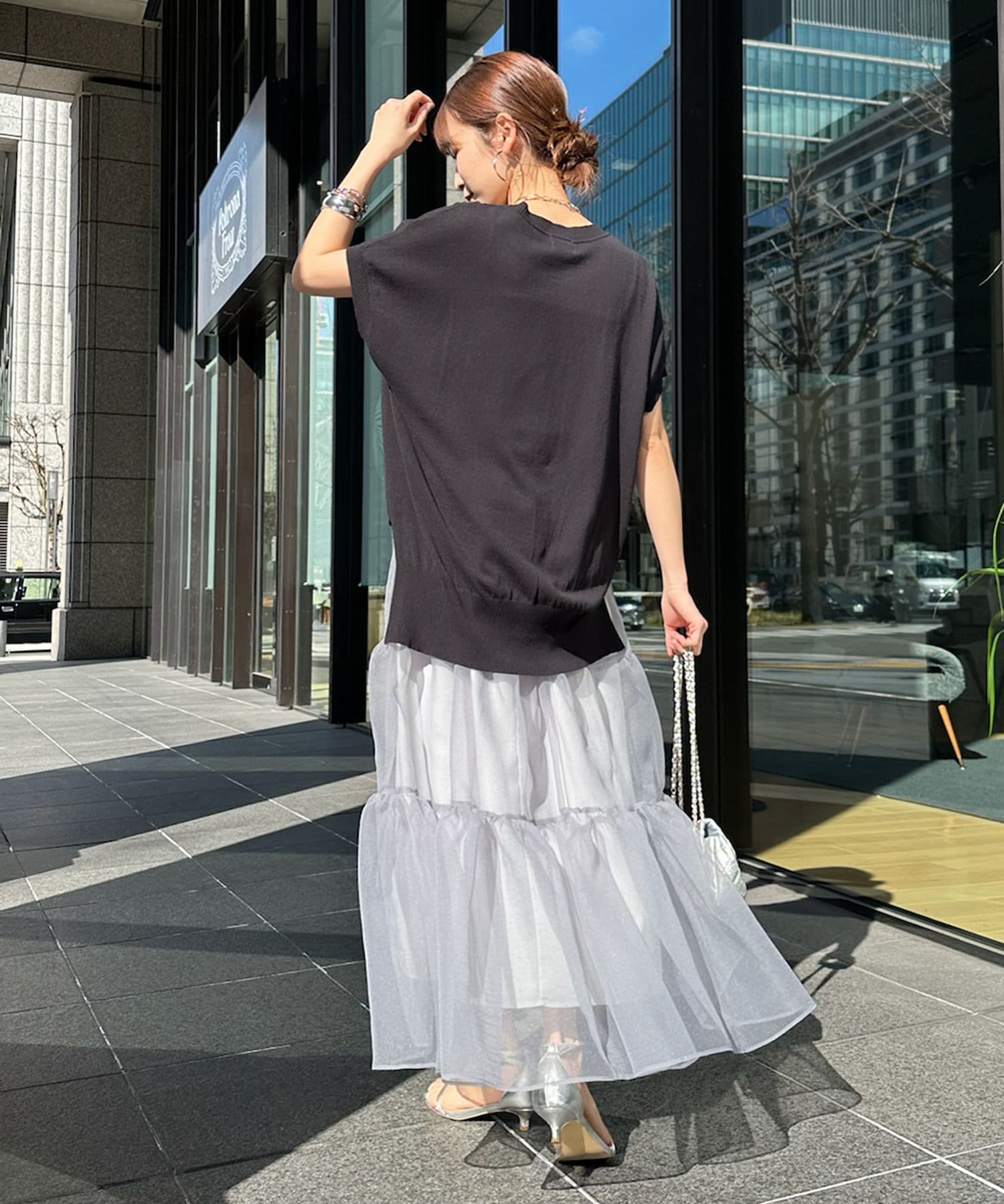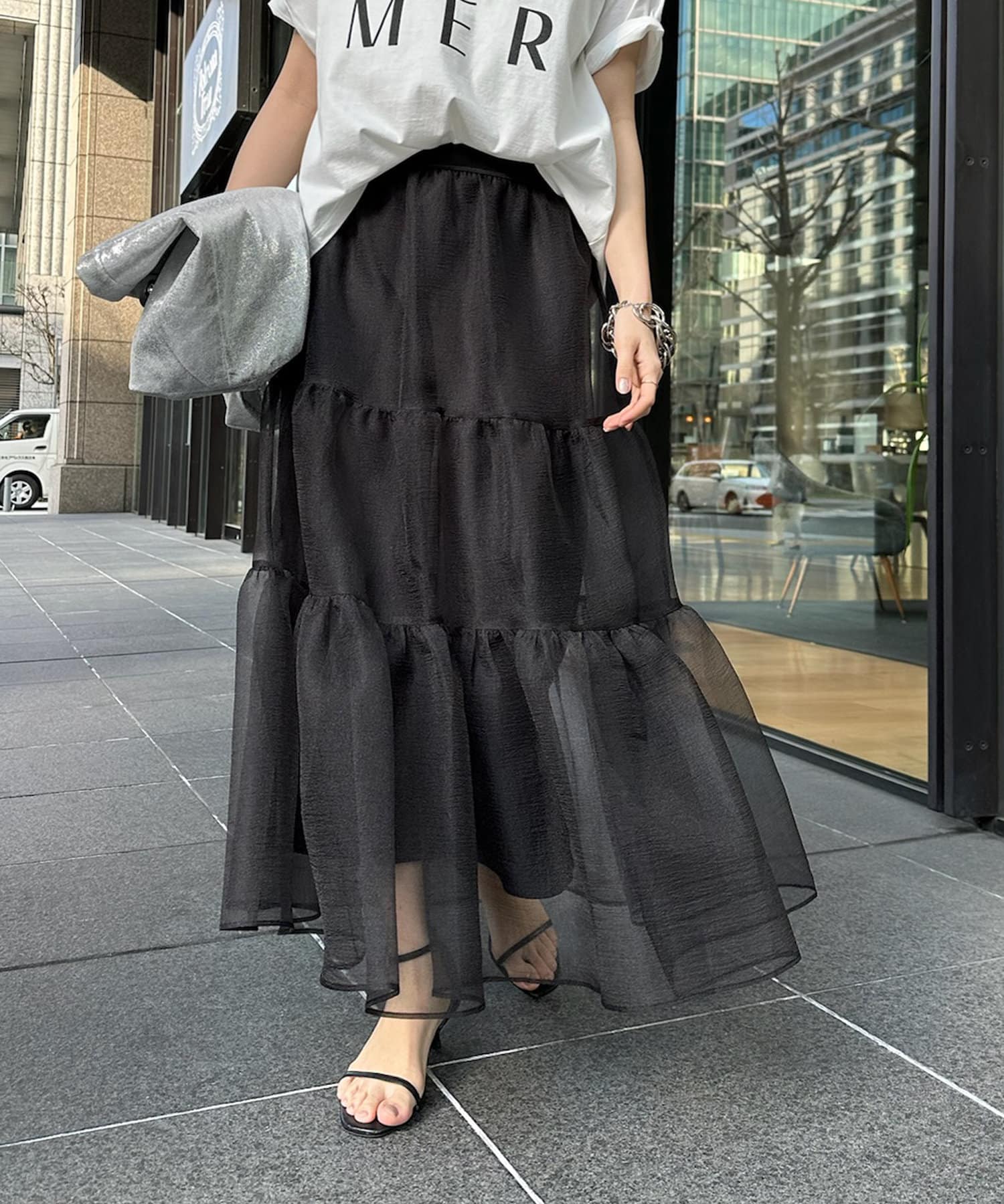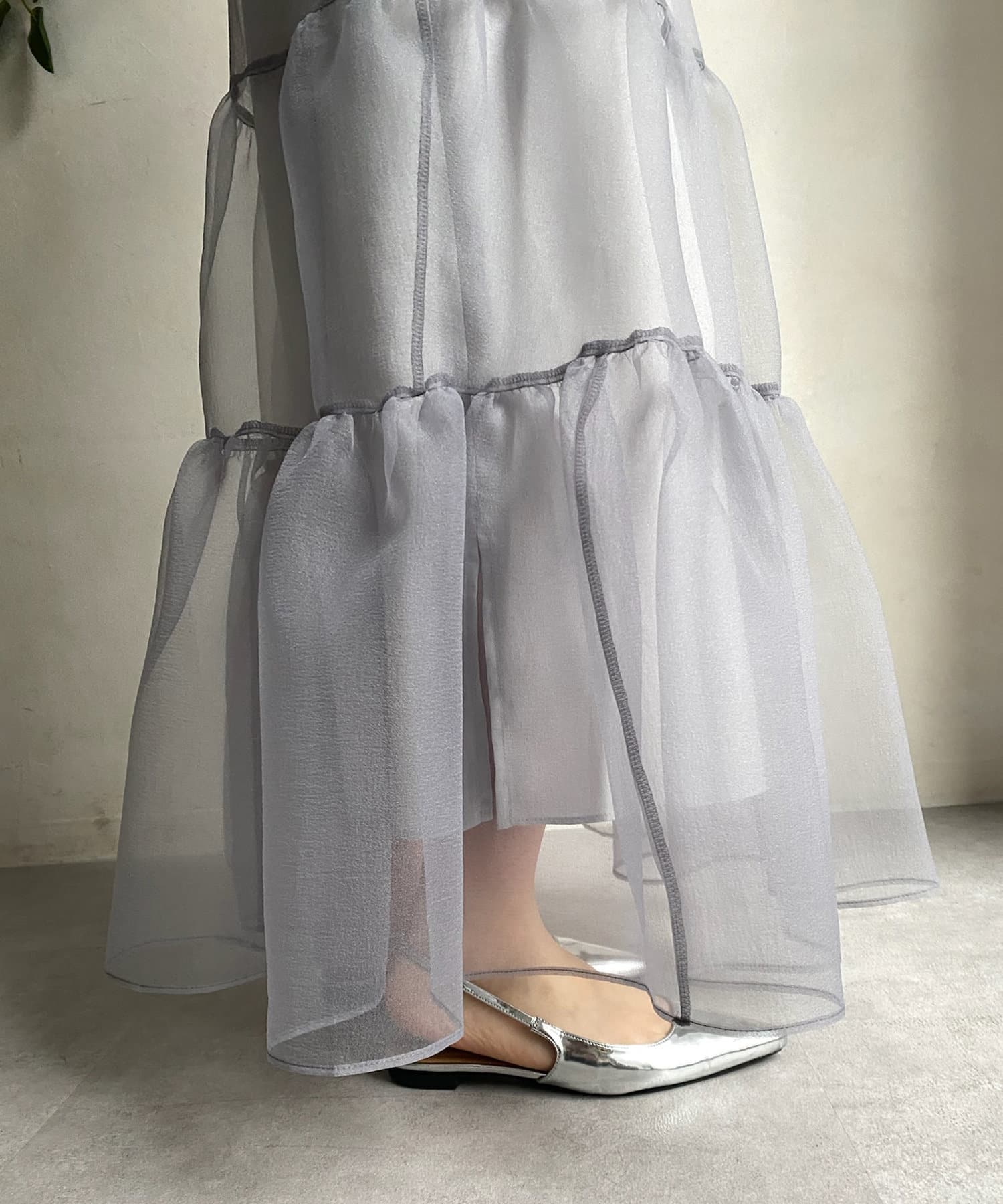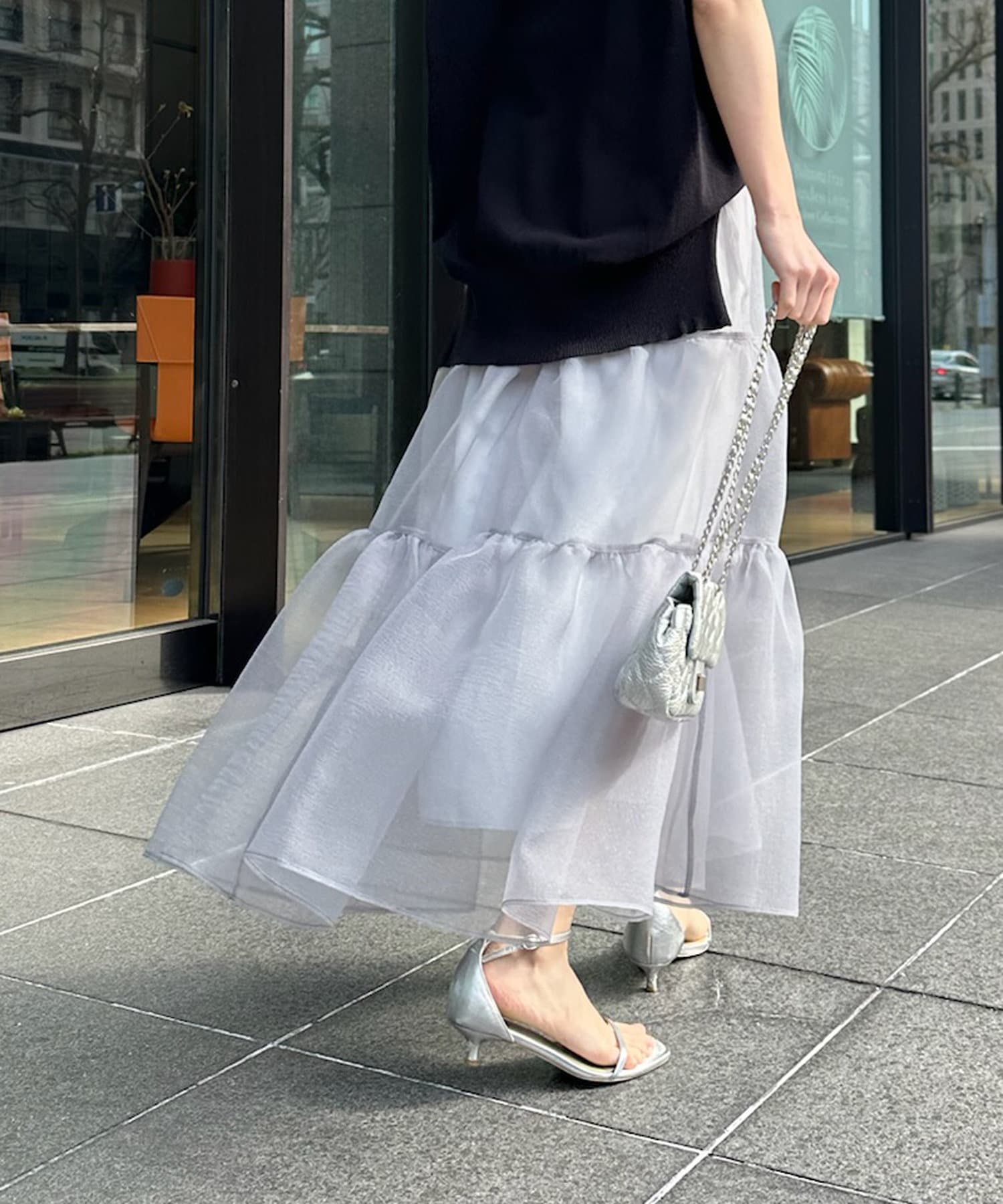 透け感がかわいいオーガンジー素材に、ティアードシルエットで今年らしさをたっぷりとプラス。