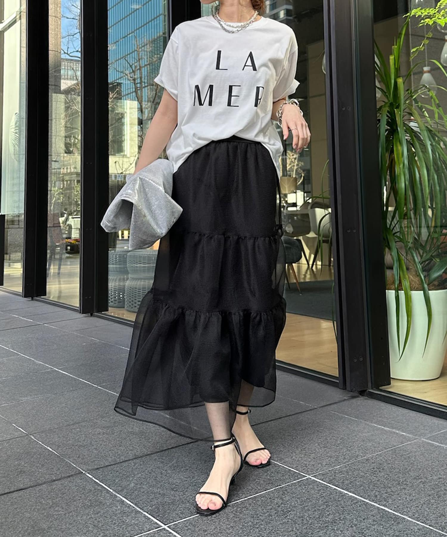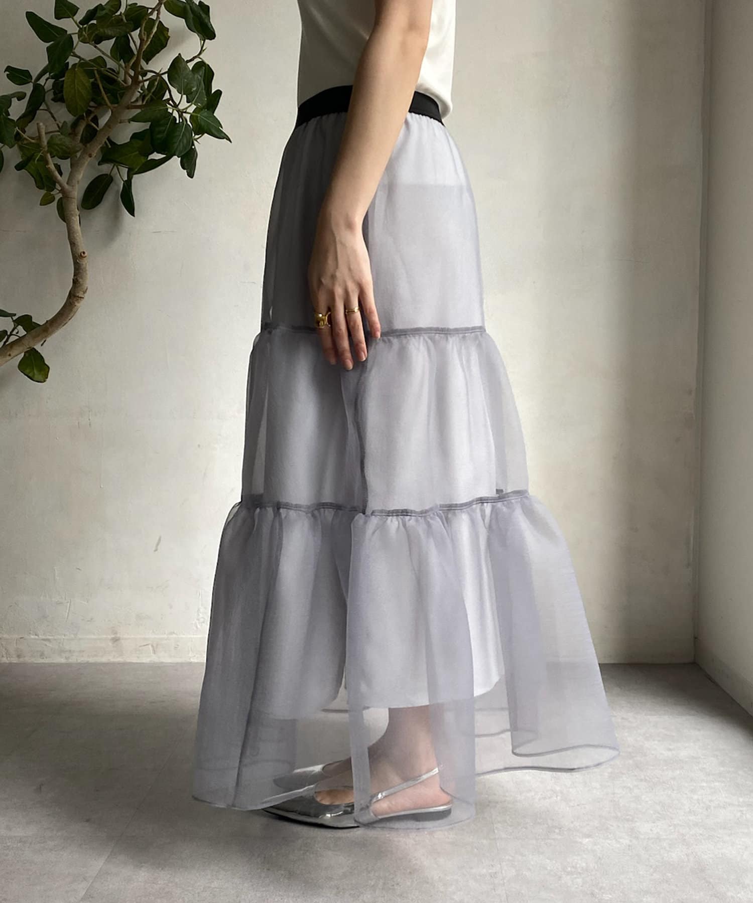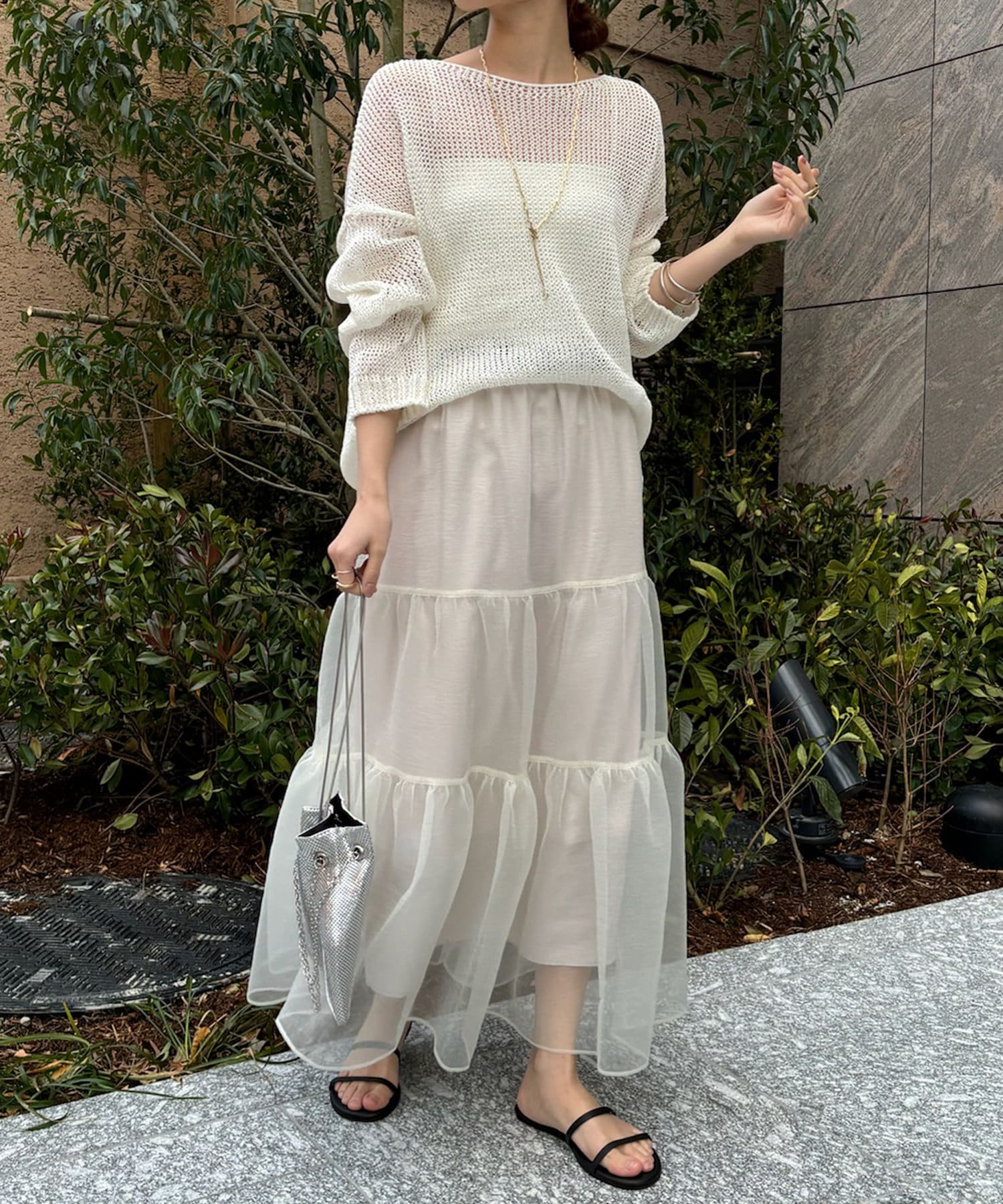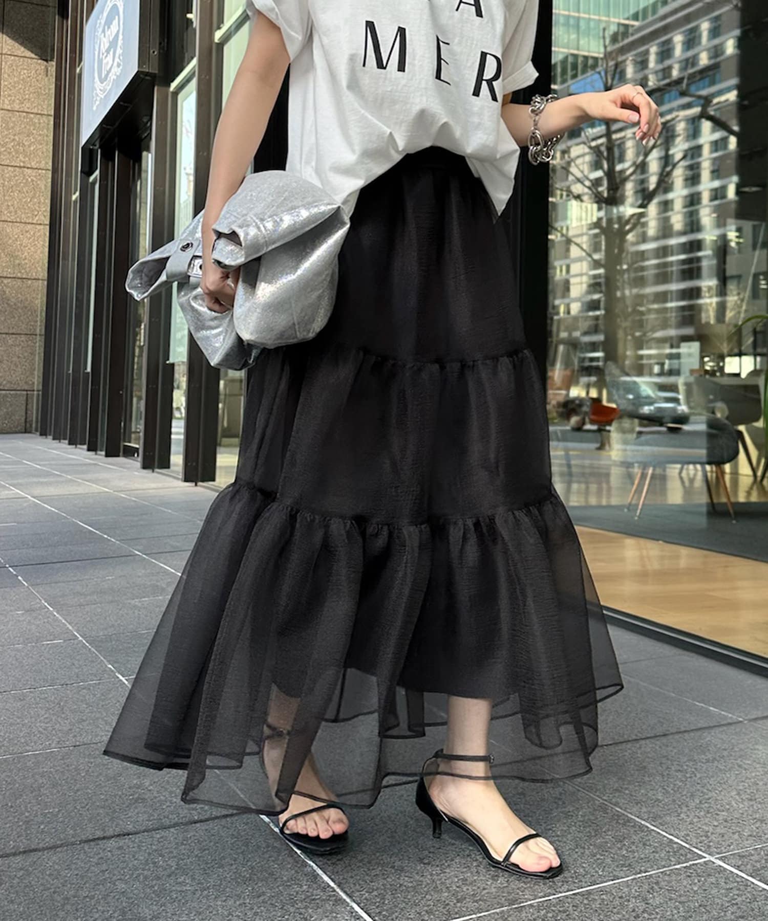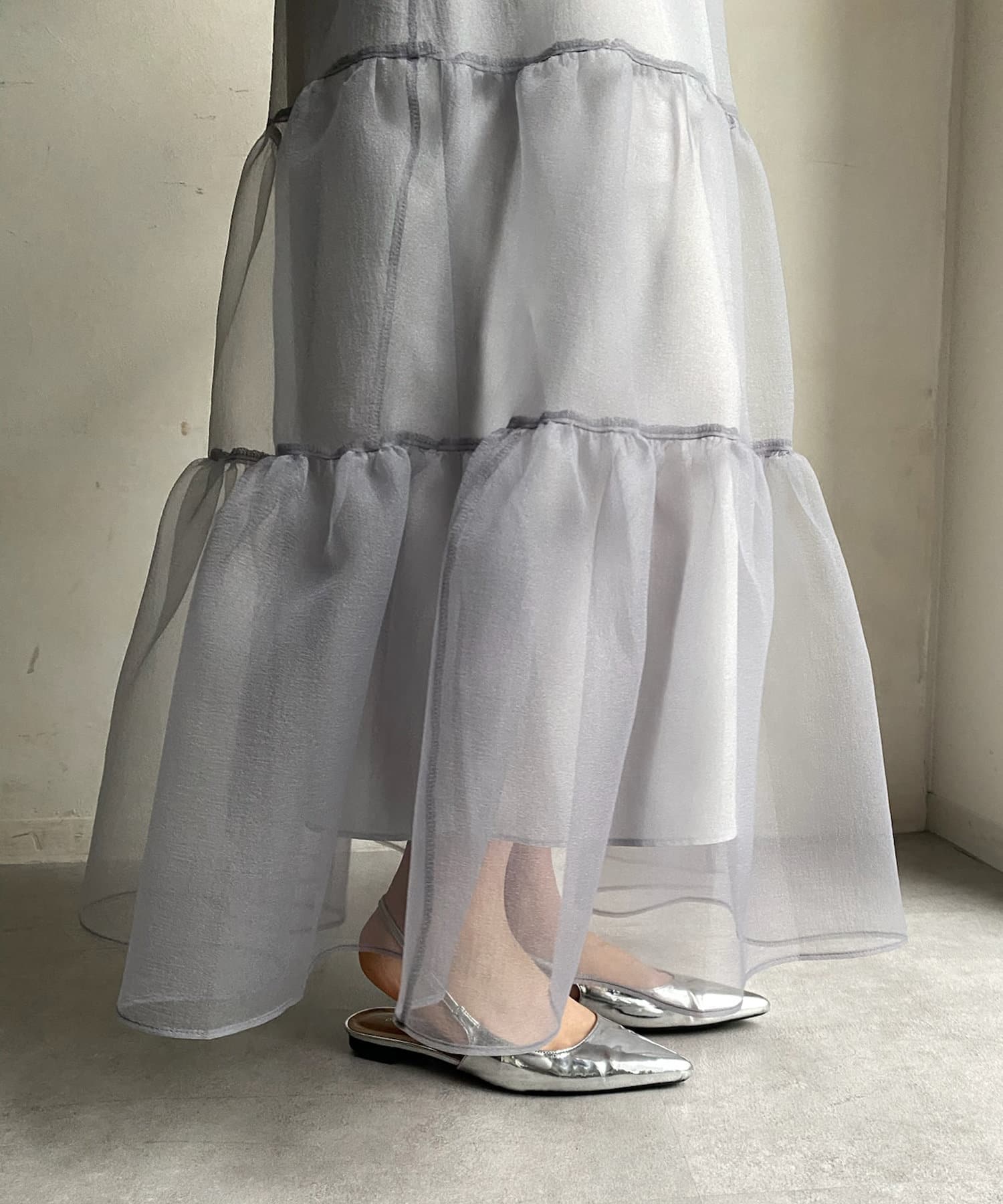 透け感がかわいいオーガンジー素材に、ティアードシルエットで今年らしさをたっぷりとプラス。