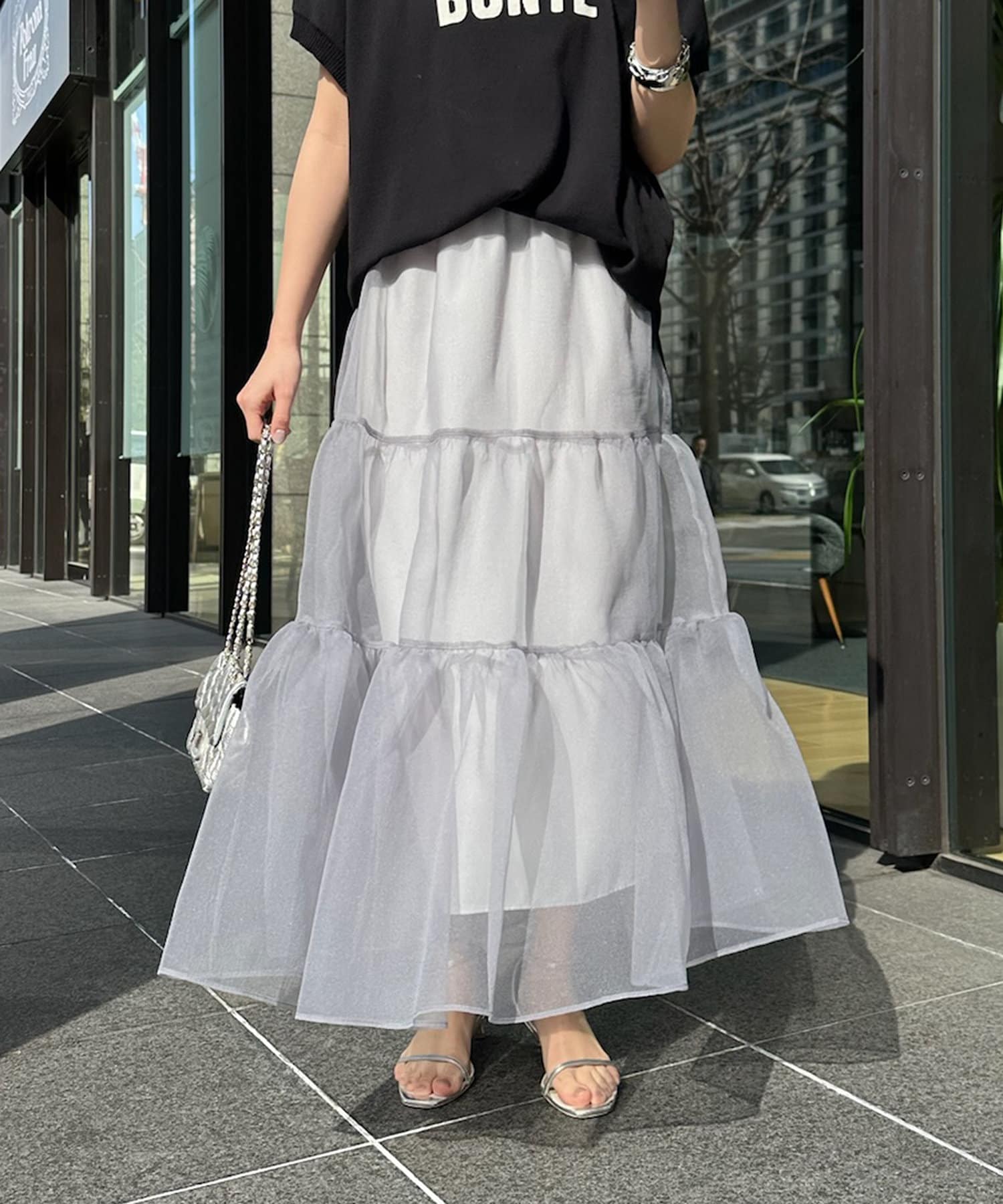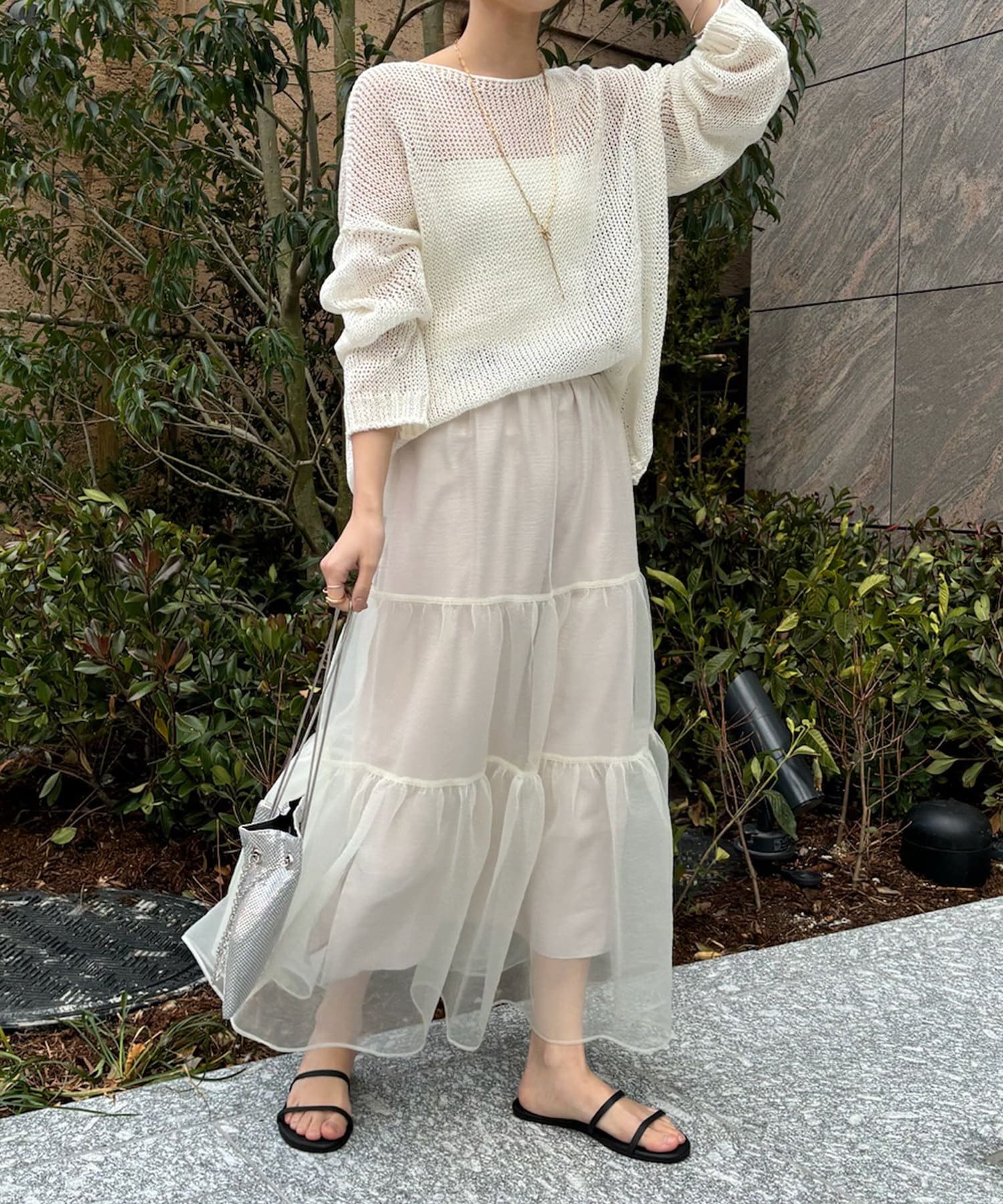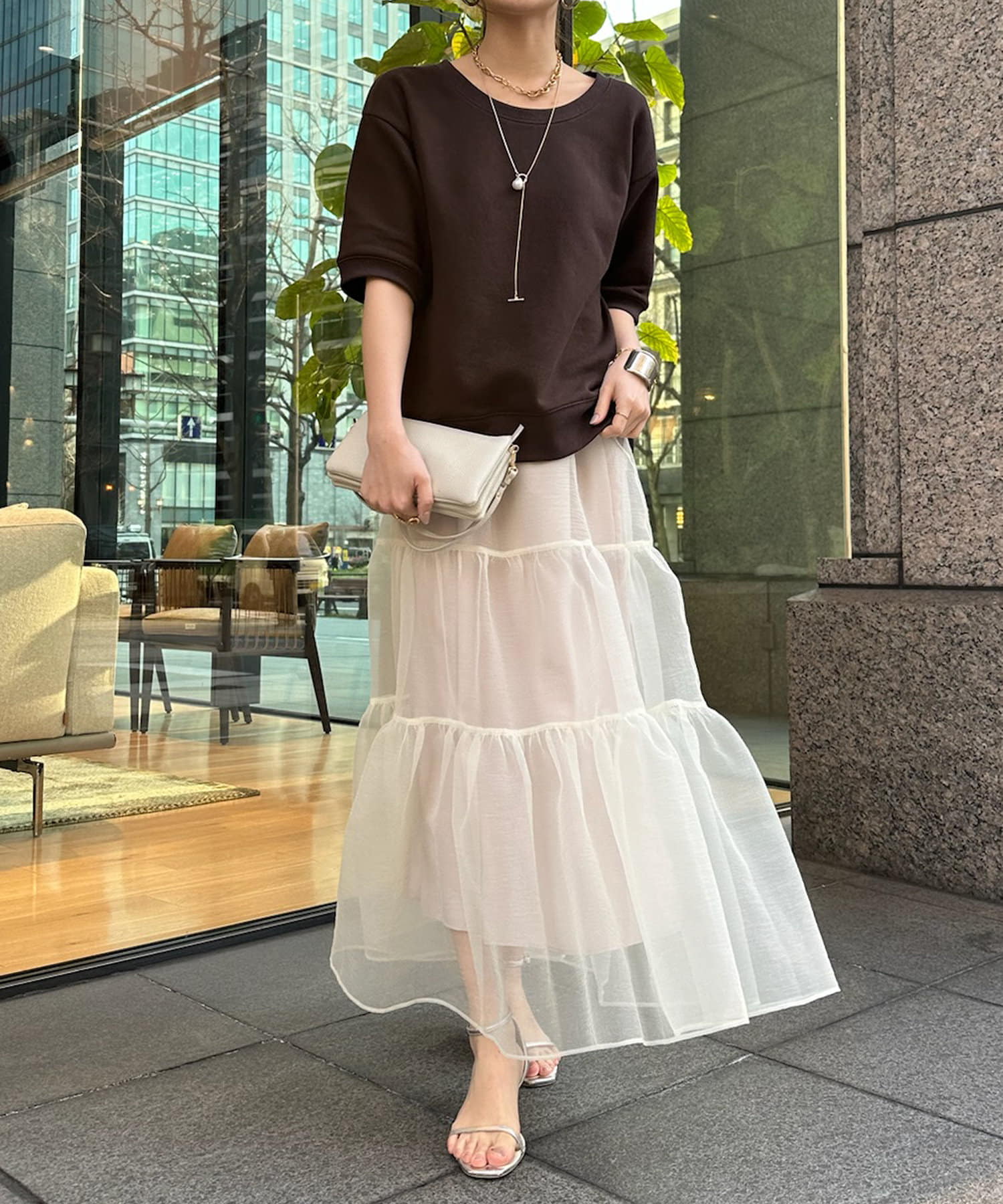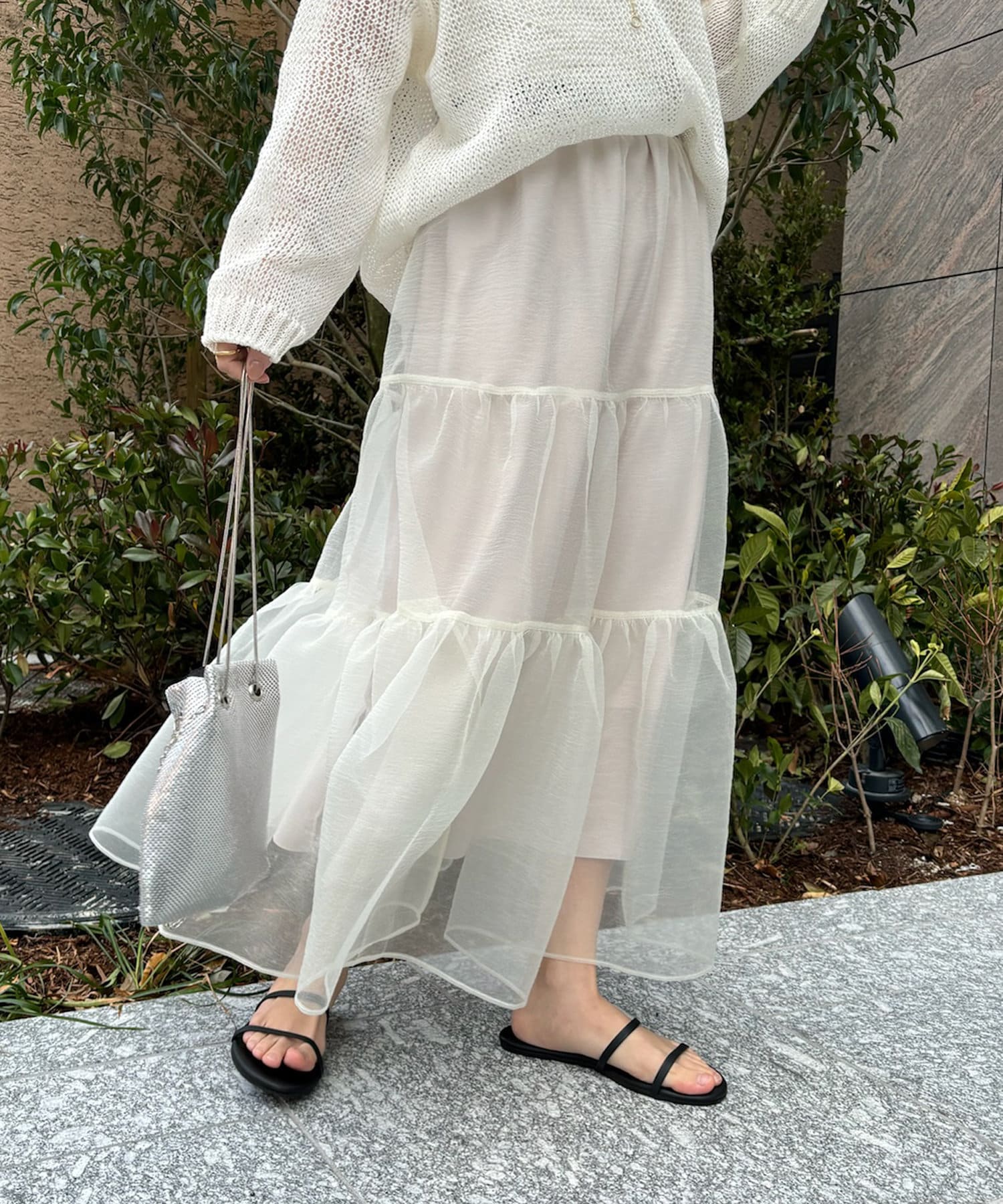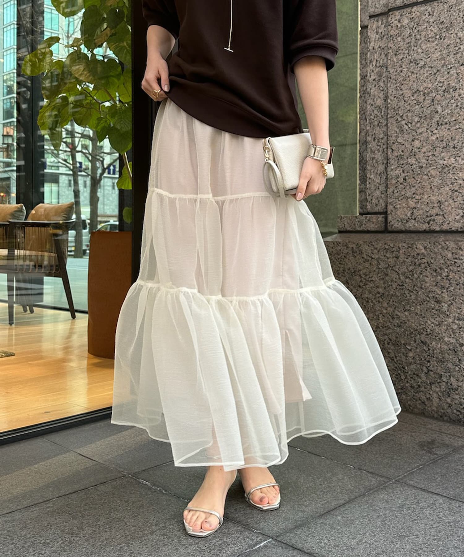透け感がかわいいオーガンジー素材に、ティアードシルエットで今年らしさをたっぷりとプラス。