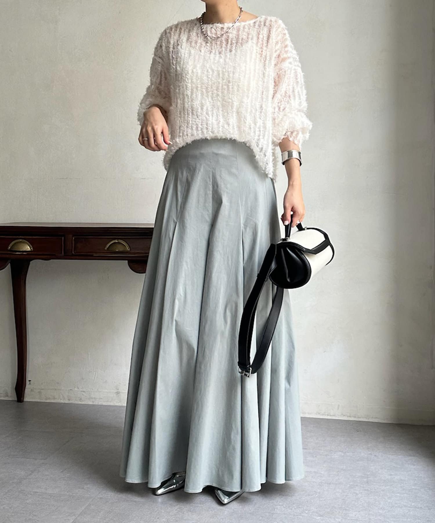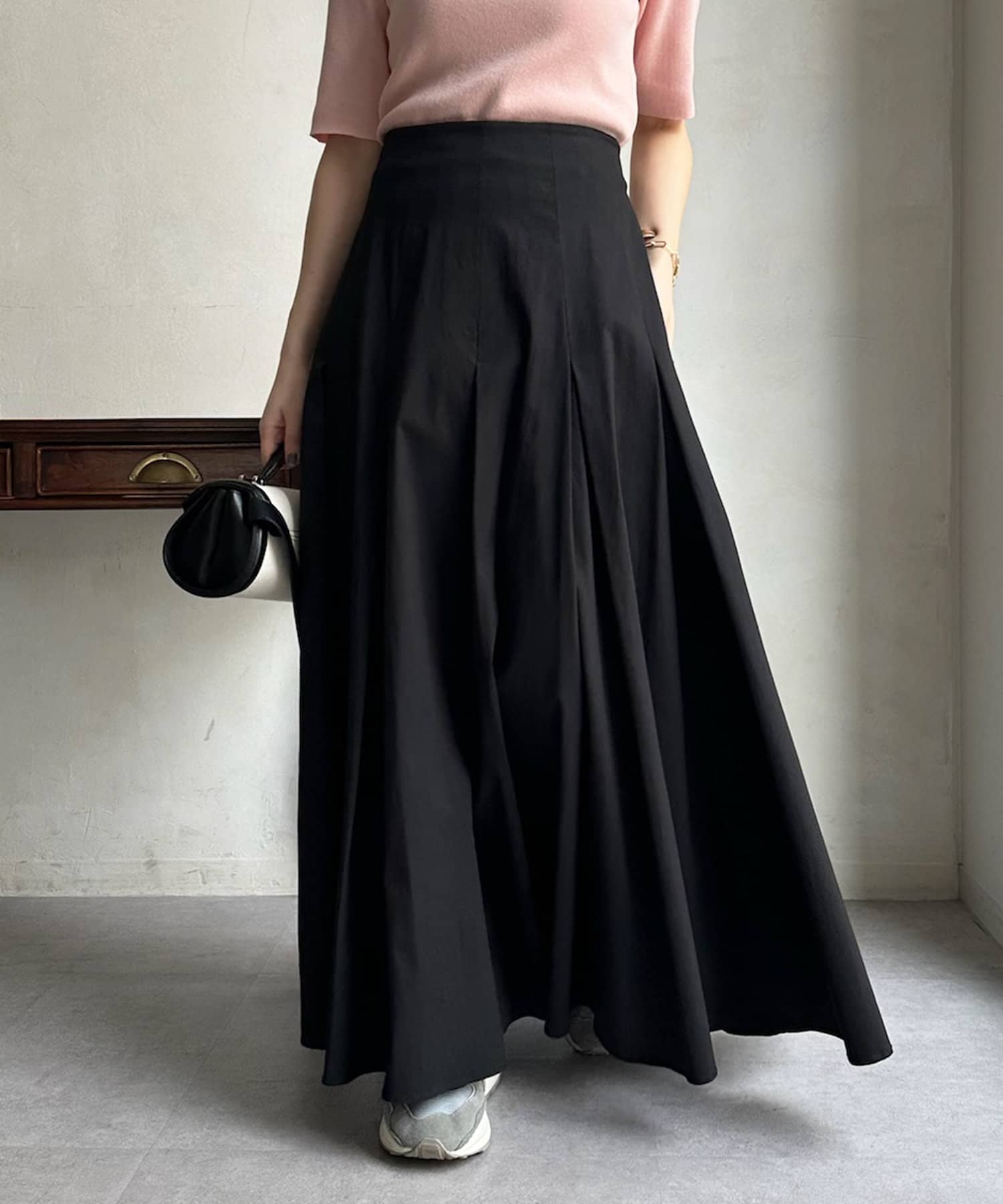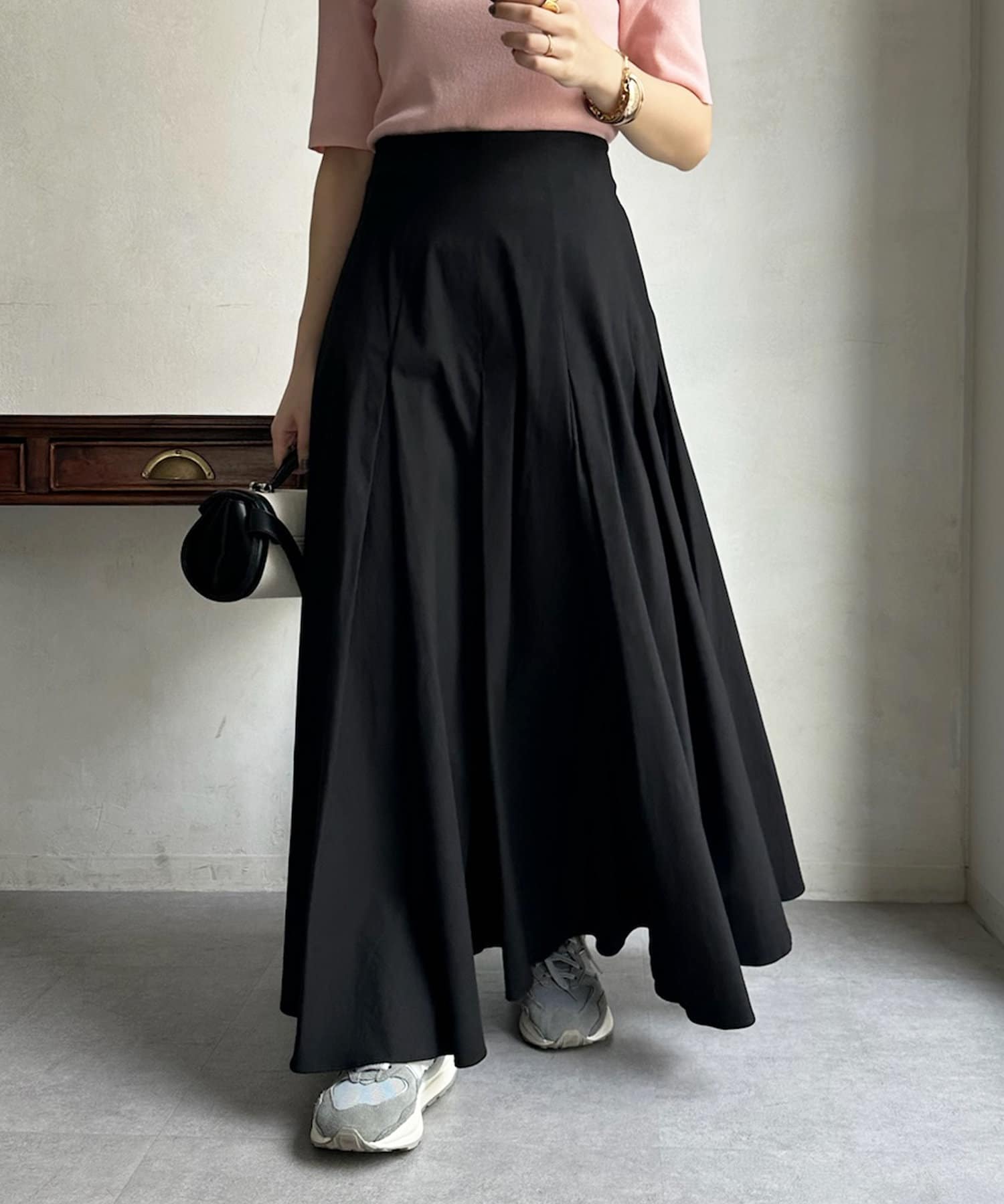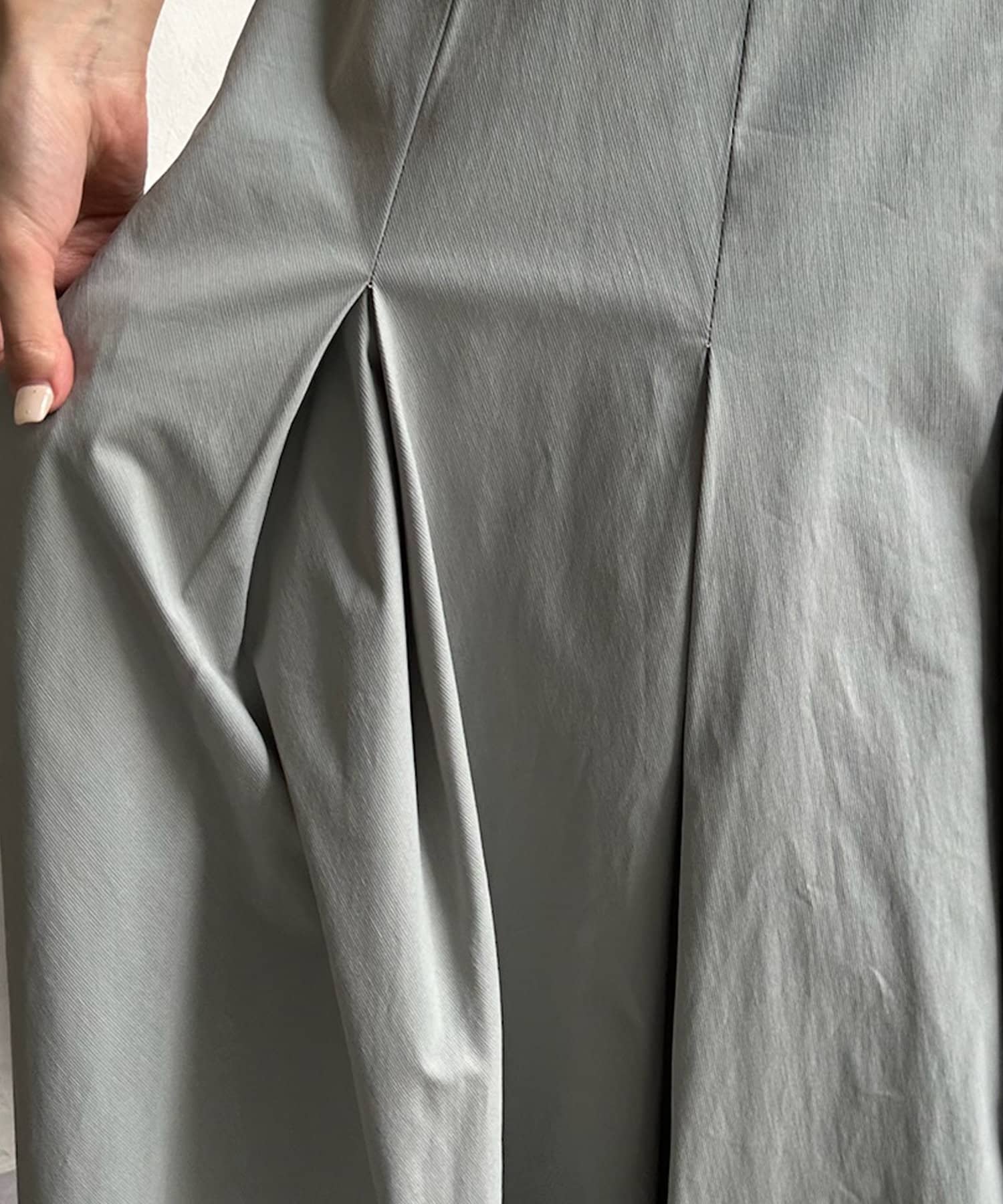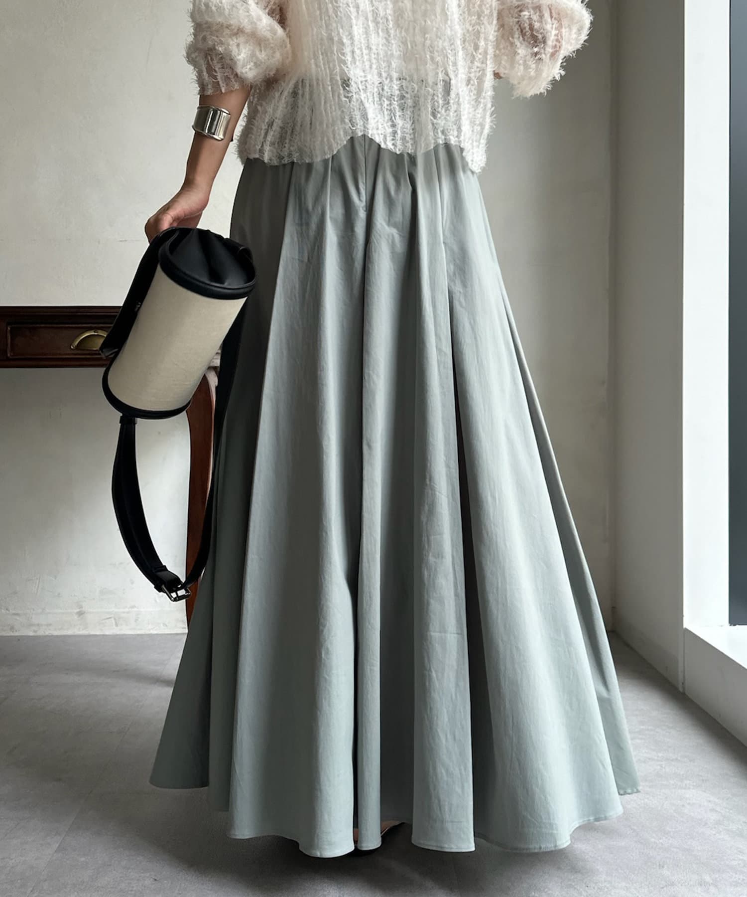 生地をふんだんに使い、タックを入れることで生まれるフレアシルエットが最大の魅力です。