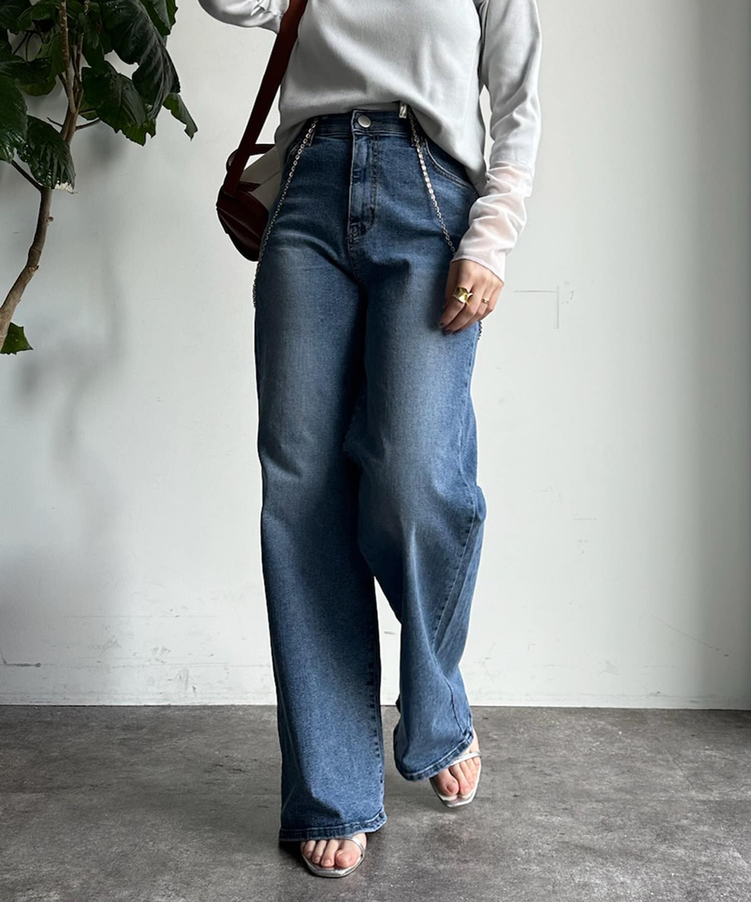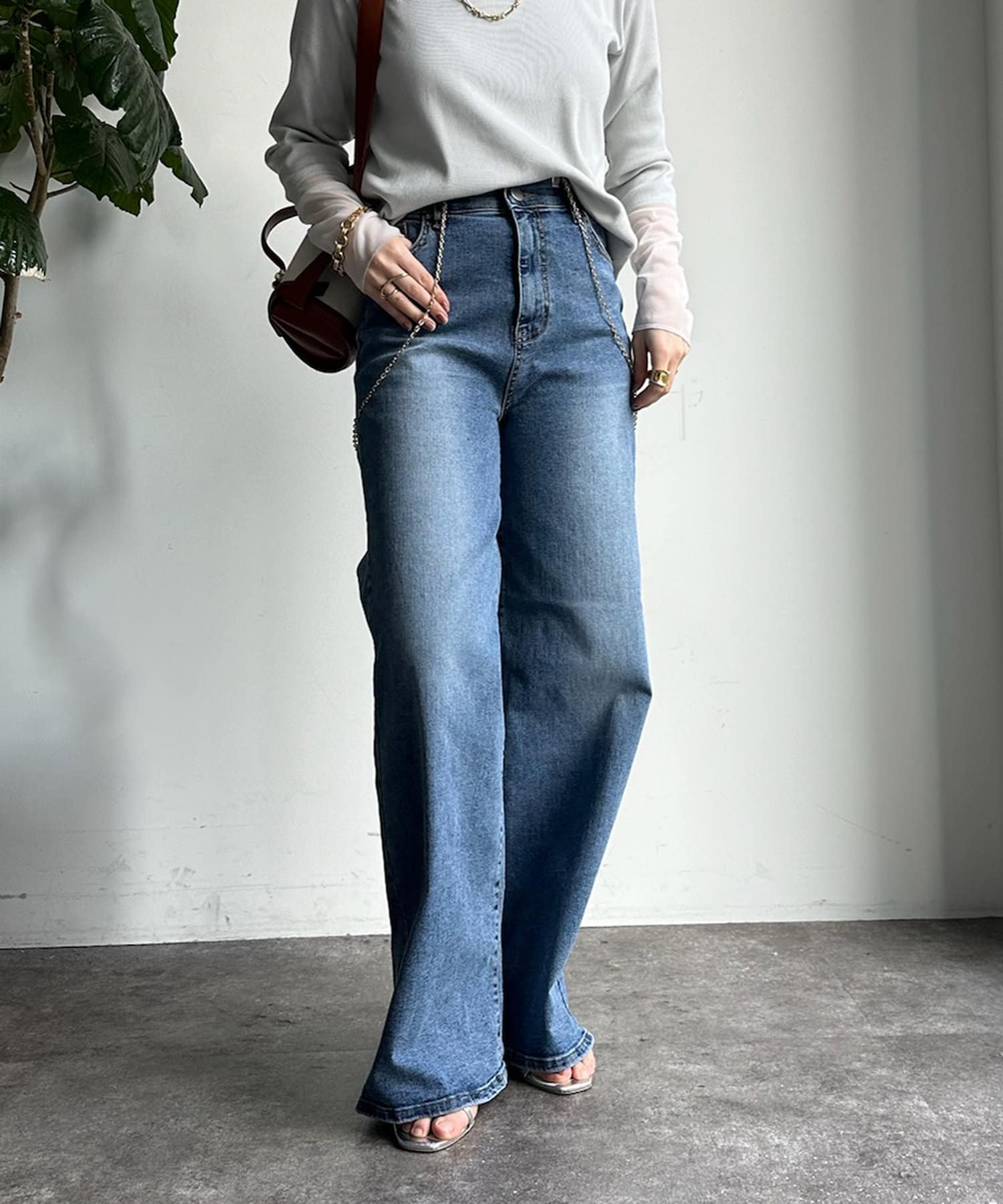 深めのウエストから裾まできれいに広がったワイドラインが特徴的なデニム!