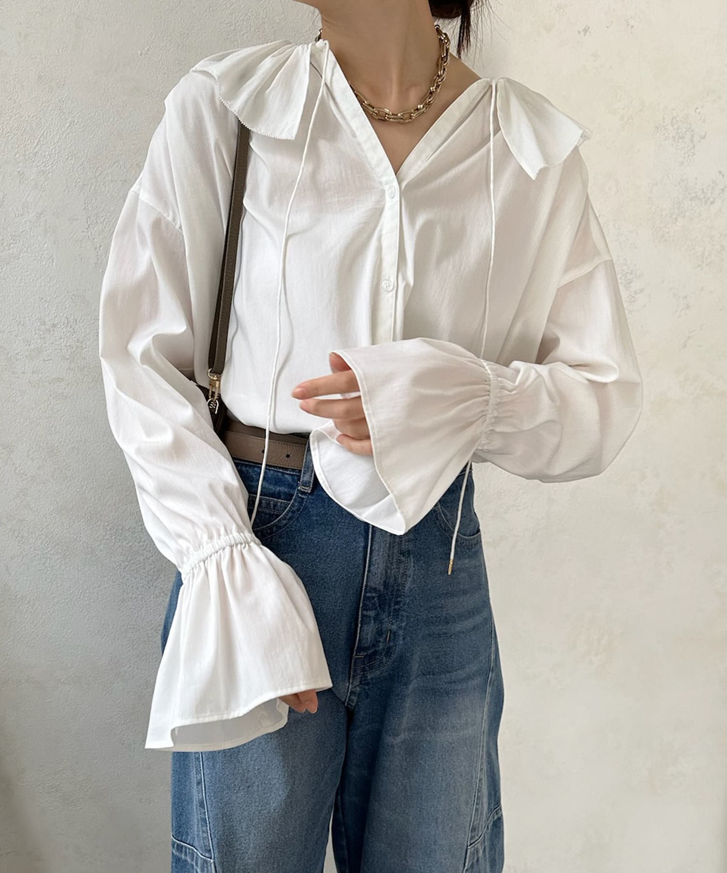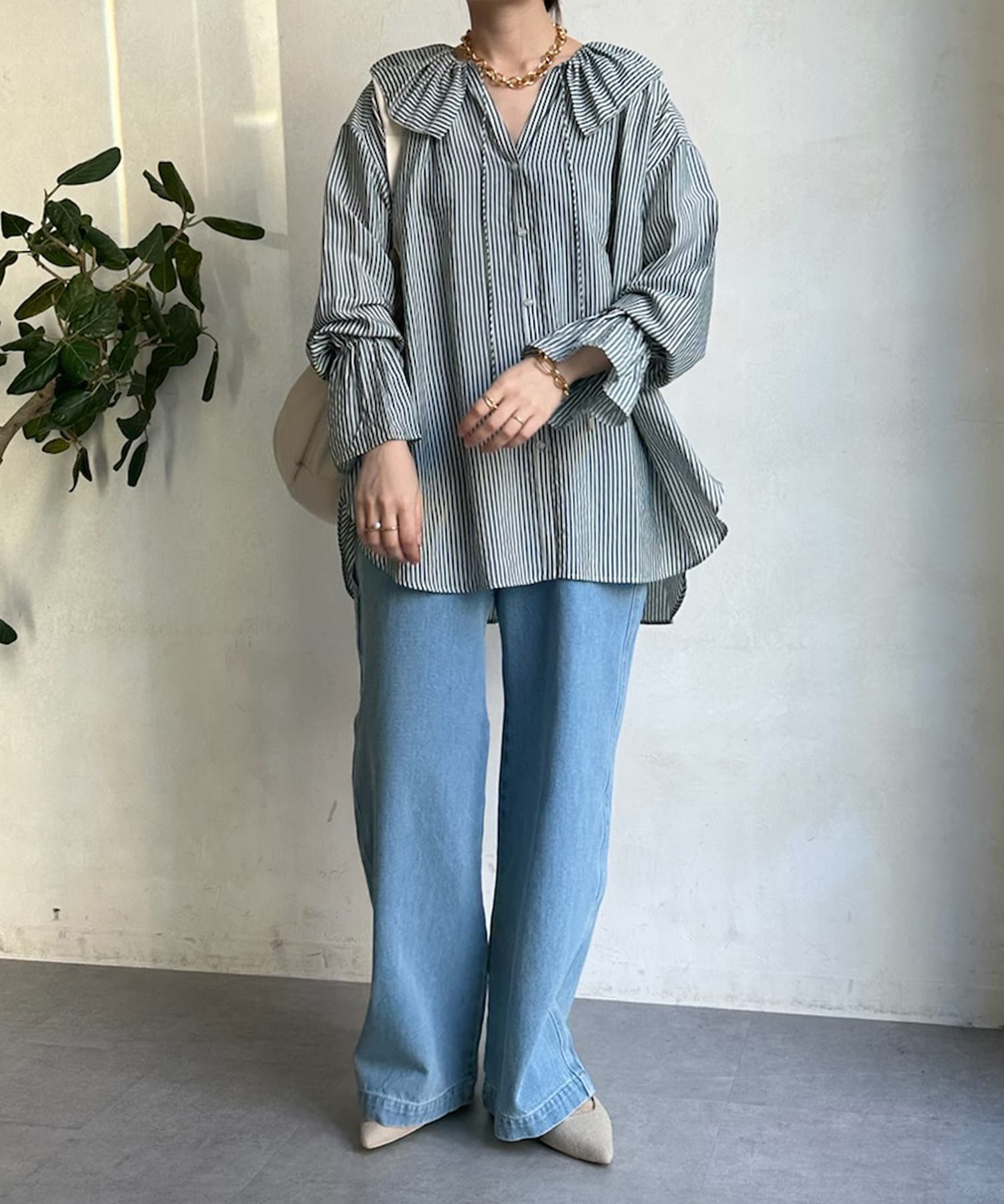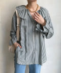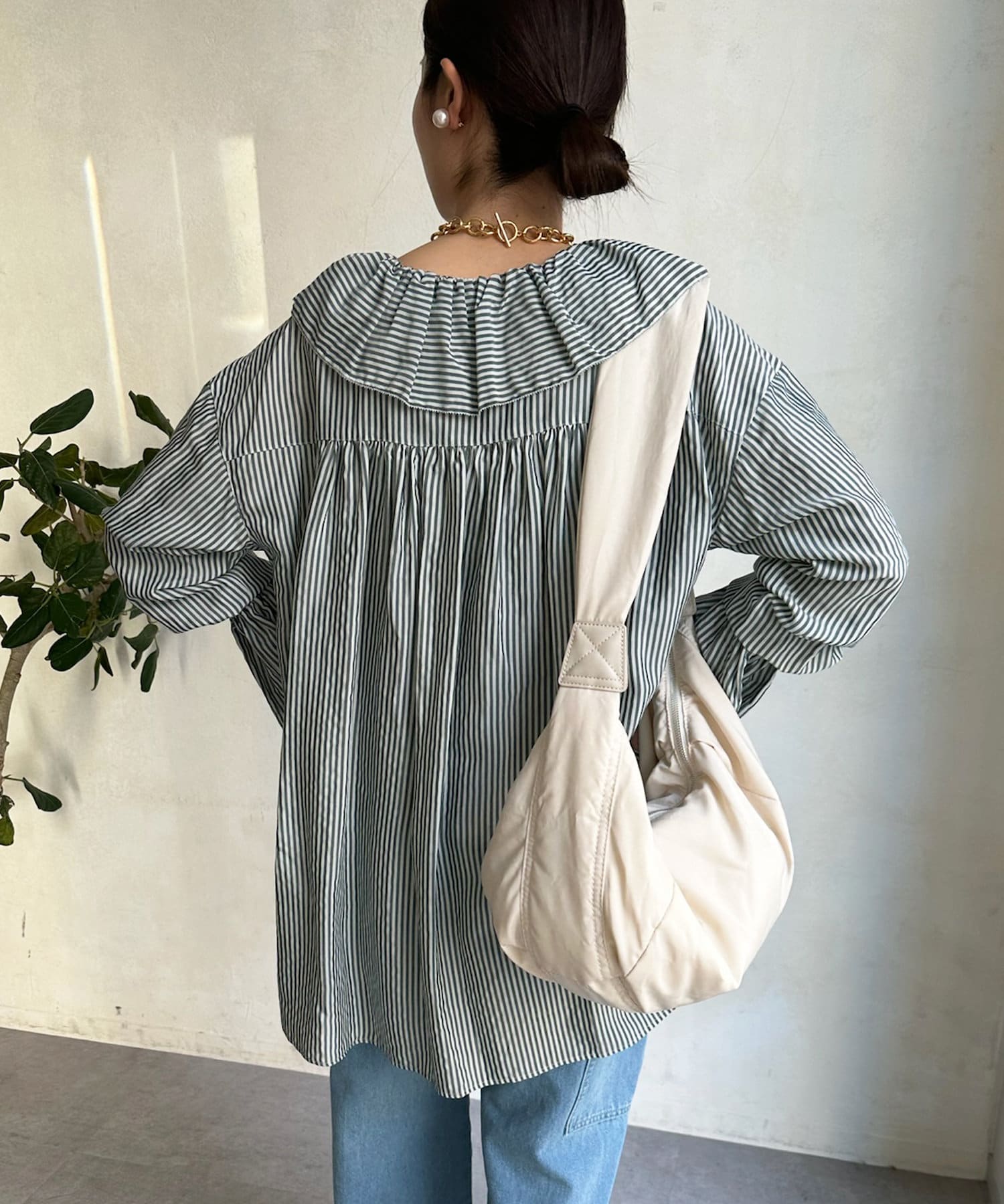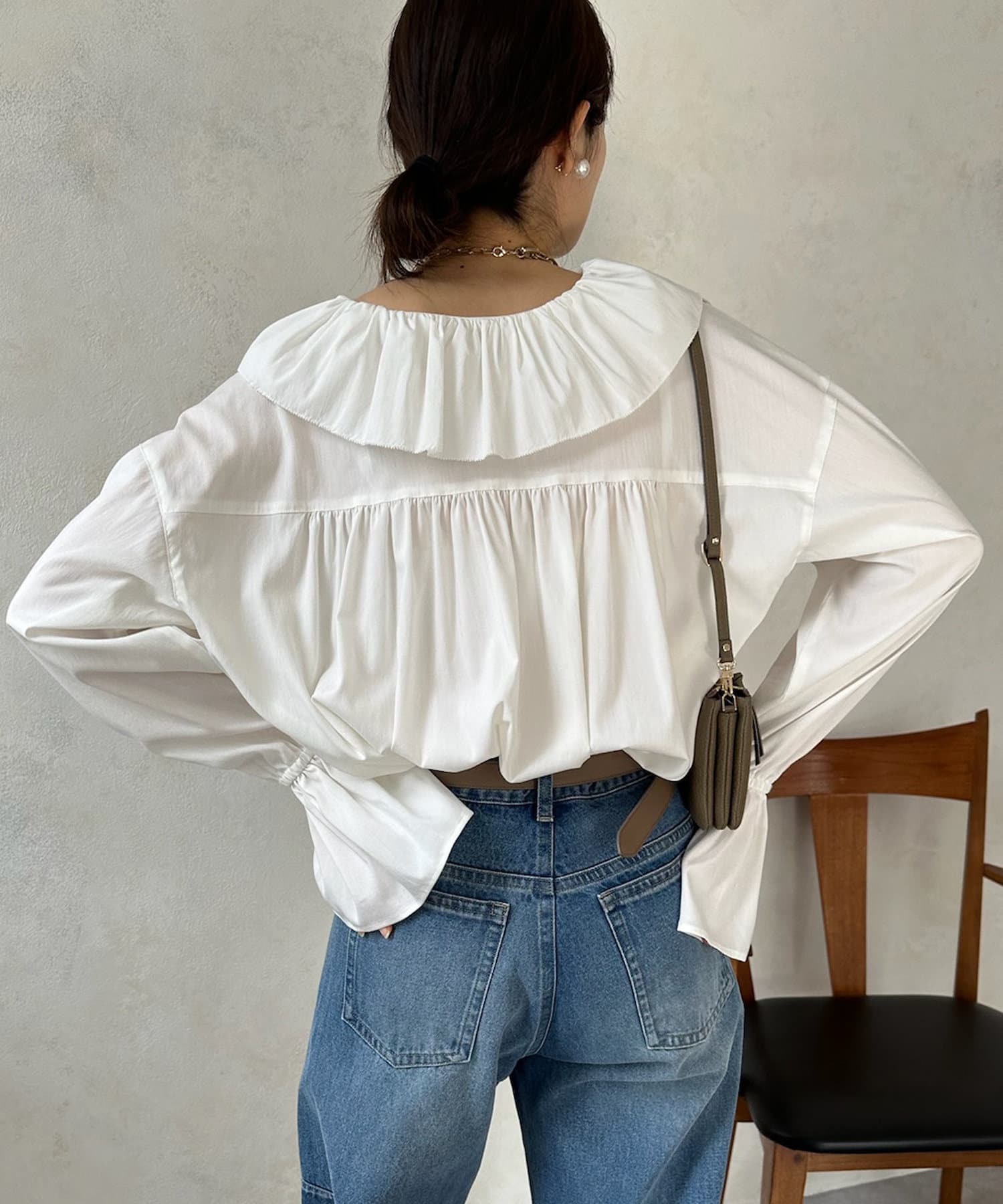 首元にフリルのデザインを施し、春夏らしいシーズンムード漂う1枚に。