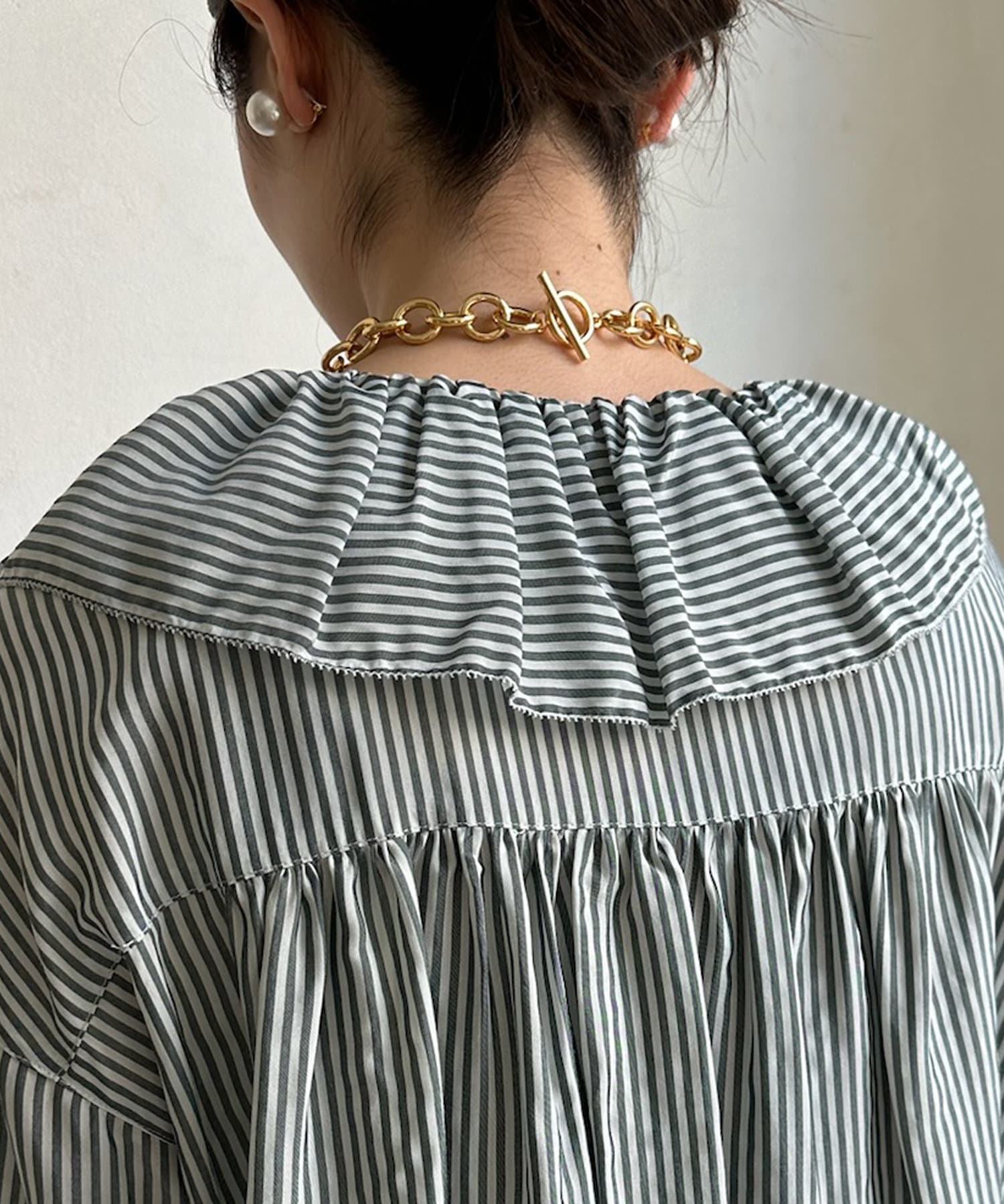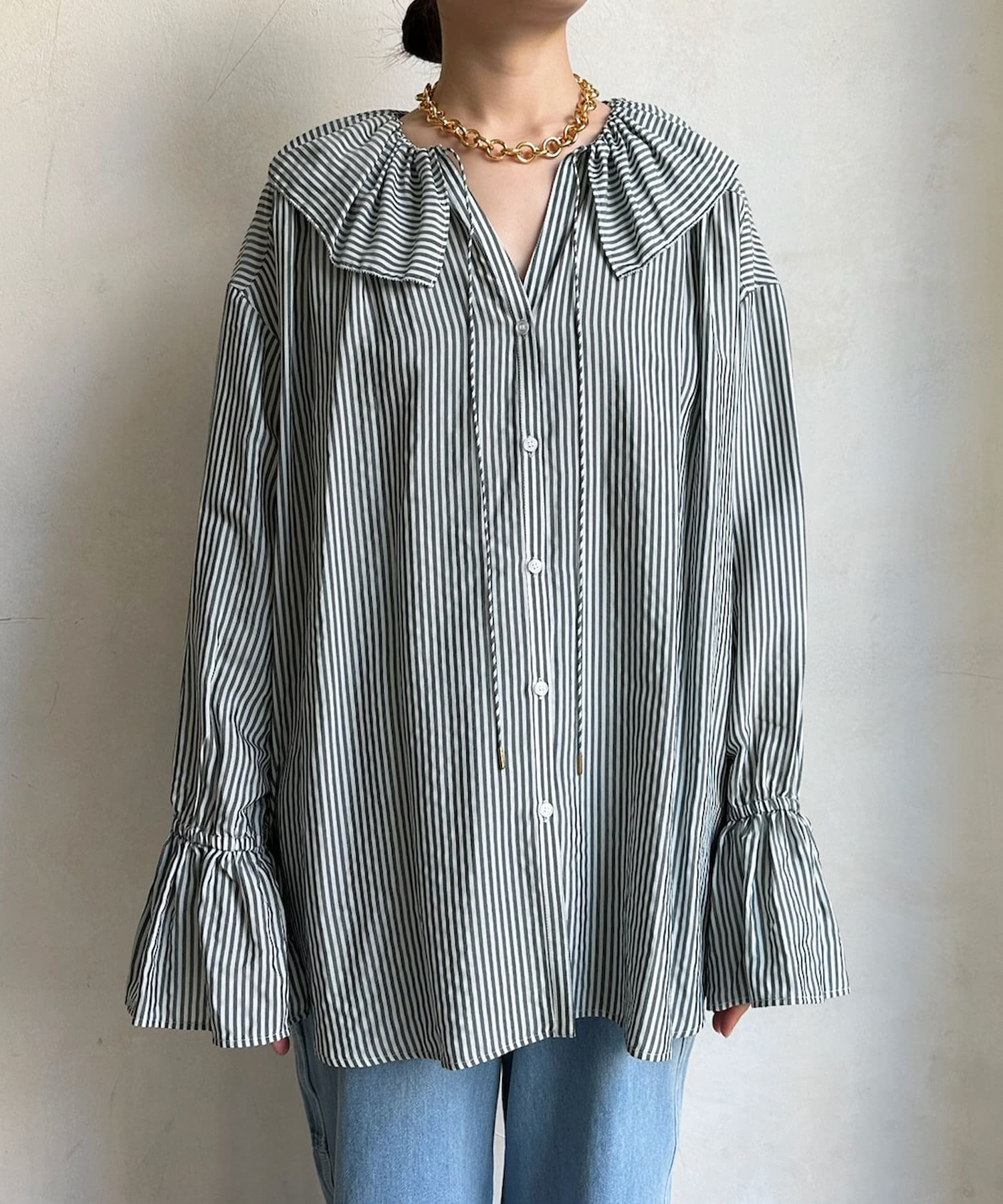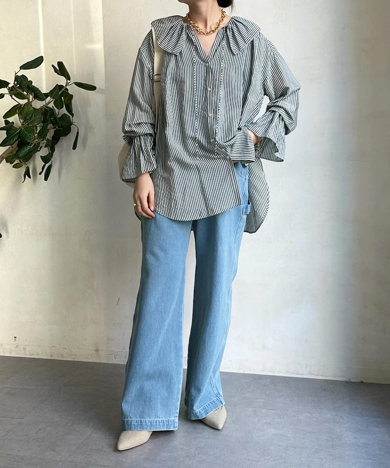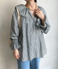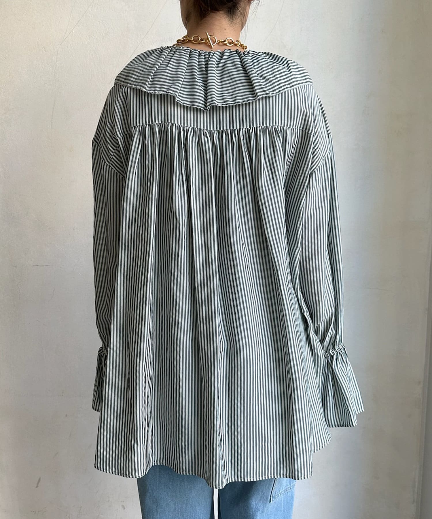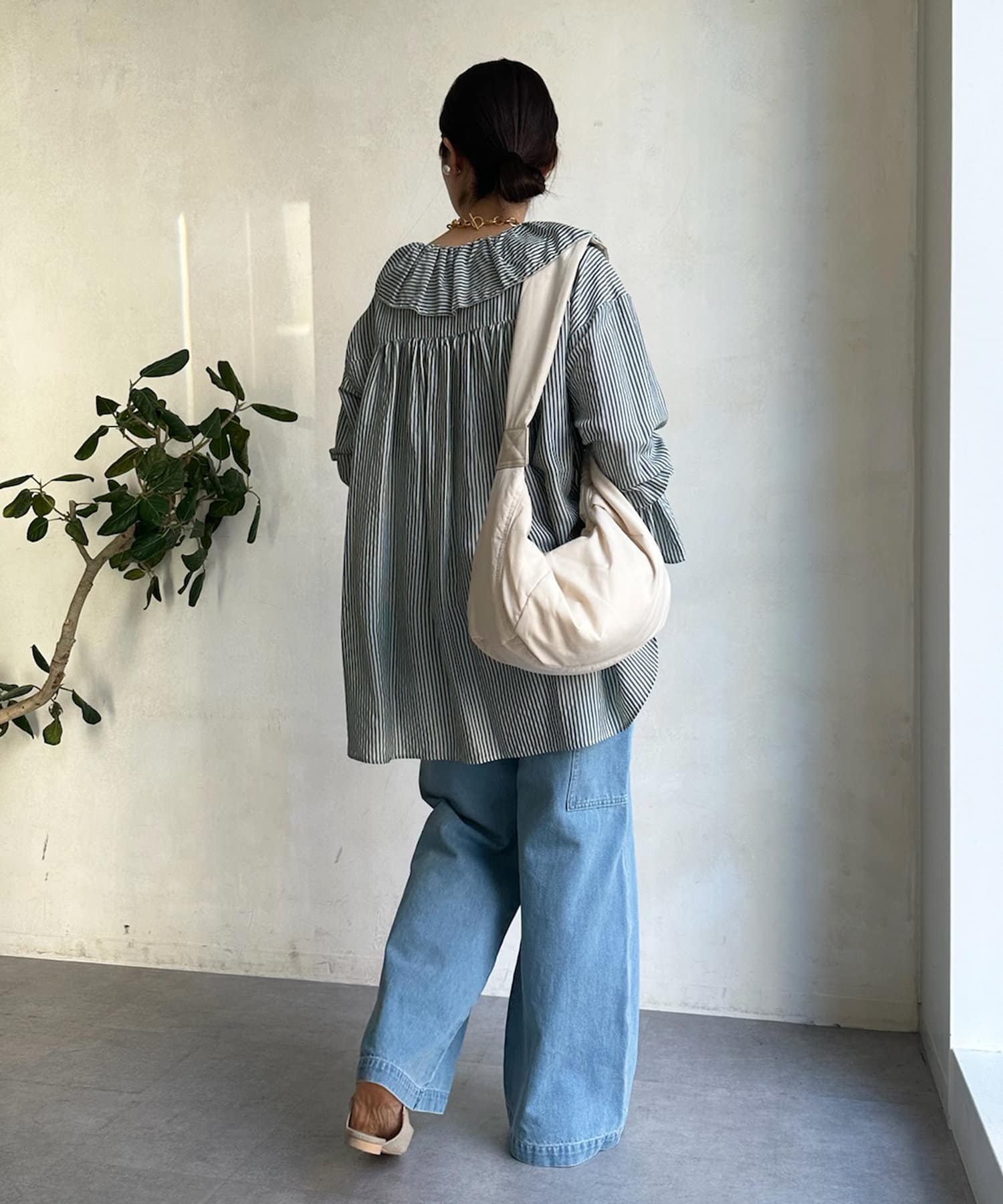 首元にフリルのデザインを施し、春夏らしいシーズンムード漂う1枚に。