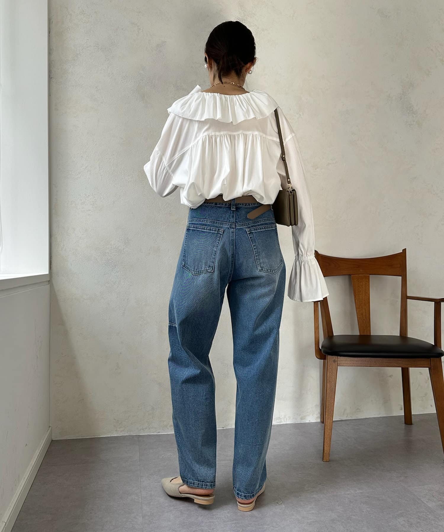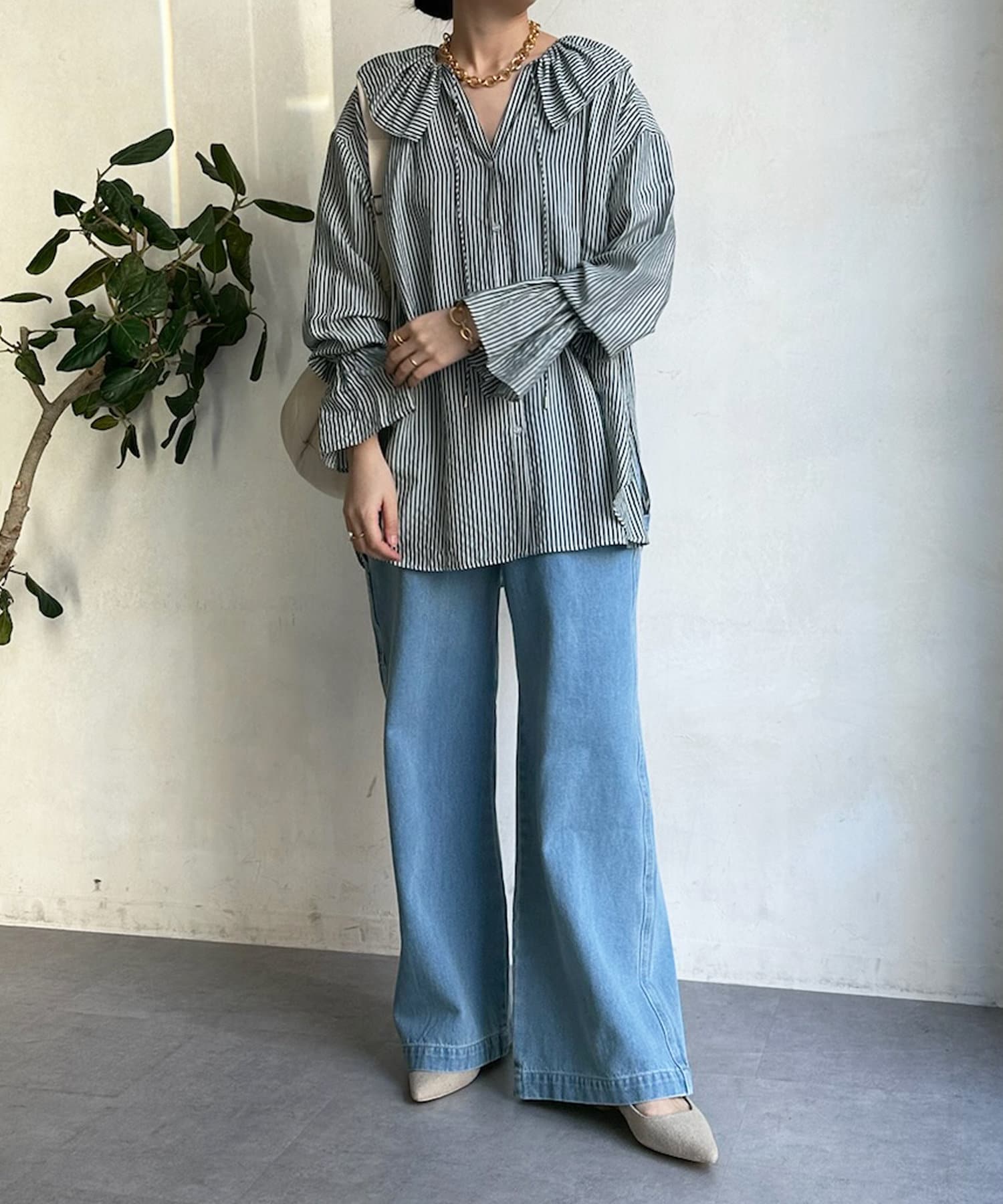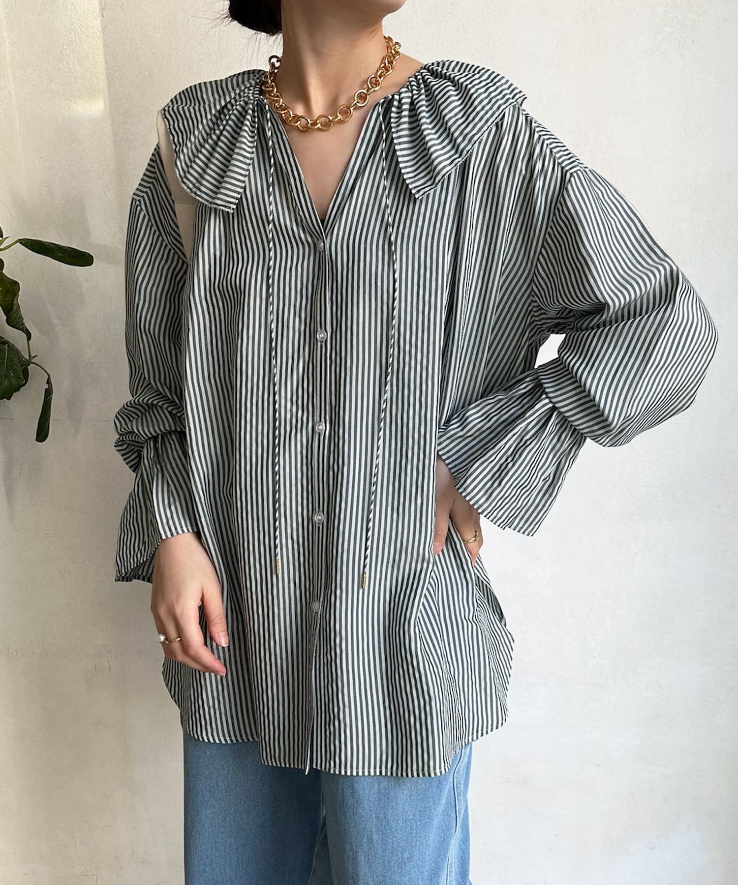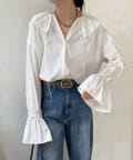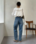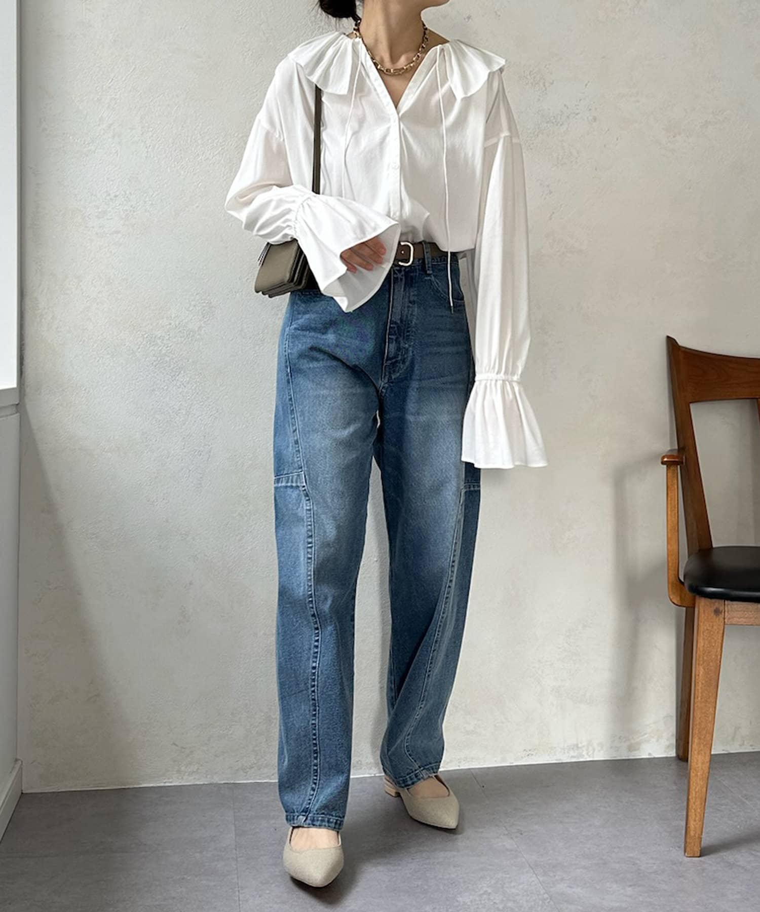 首元にフリルのデザインを施し、春夏らしいシーズンムード漂う1枚に。