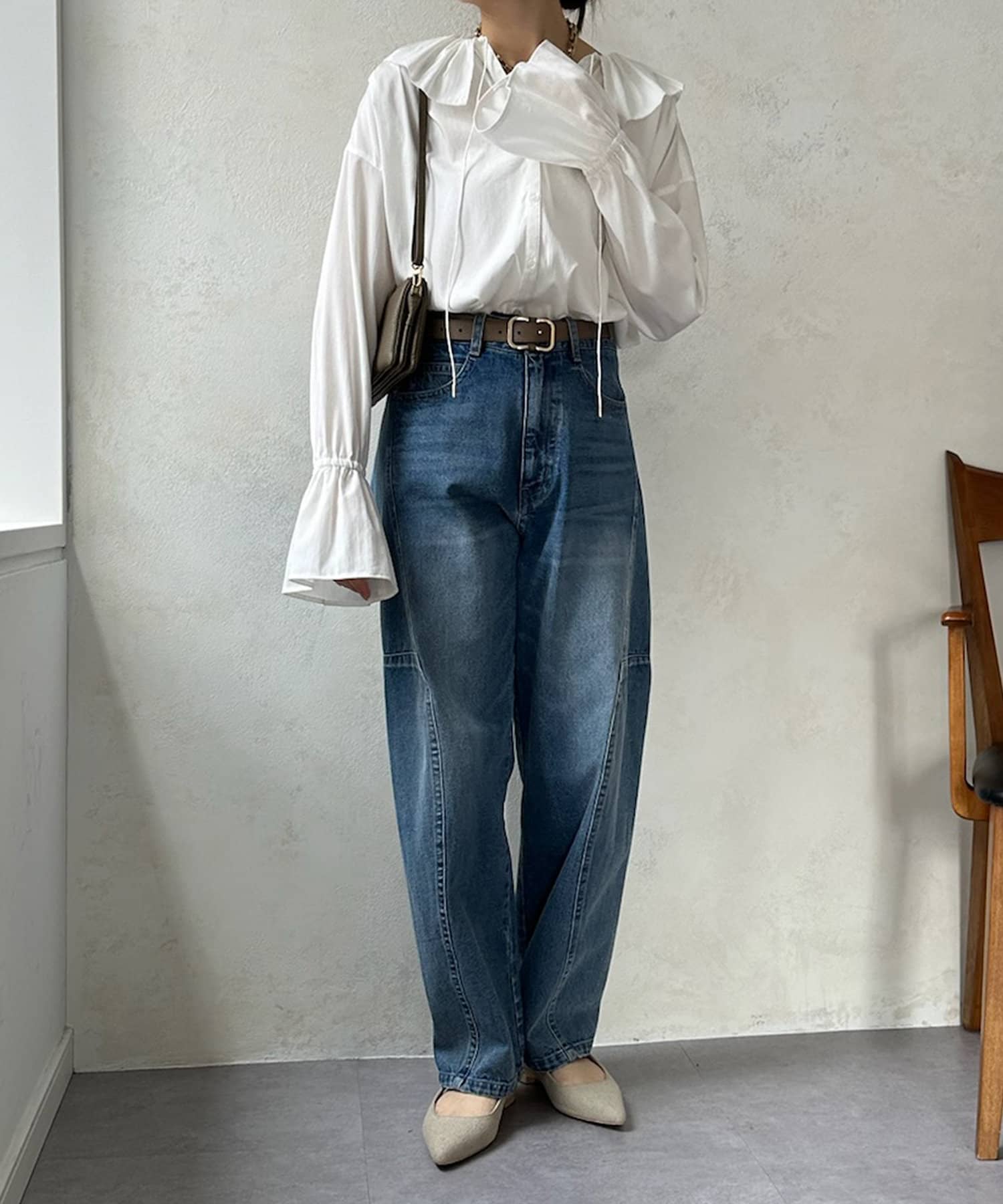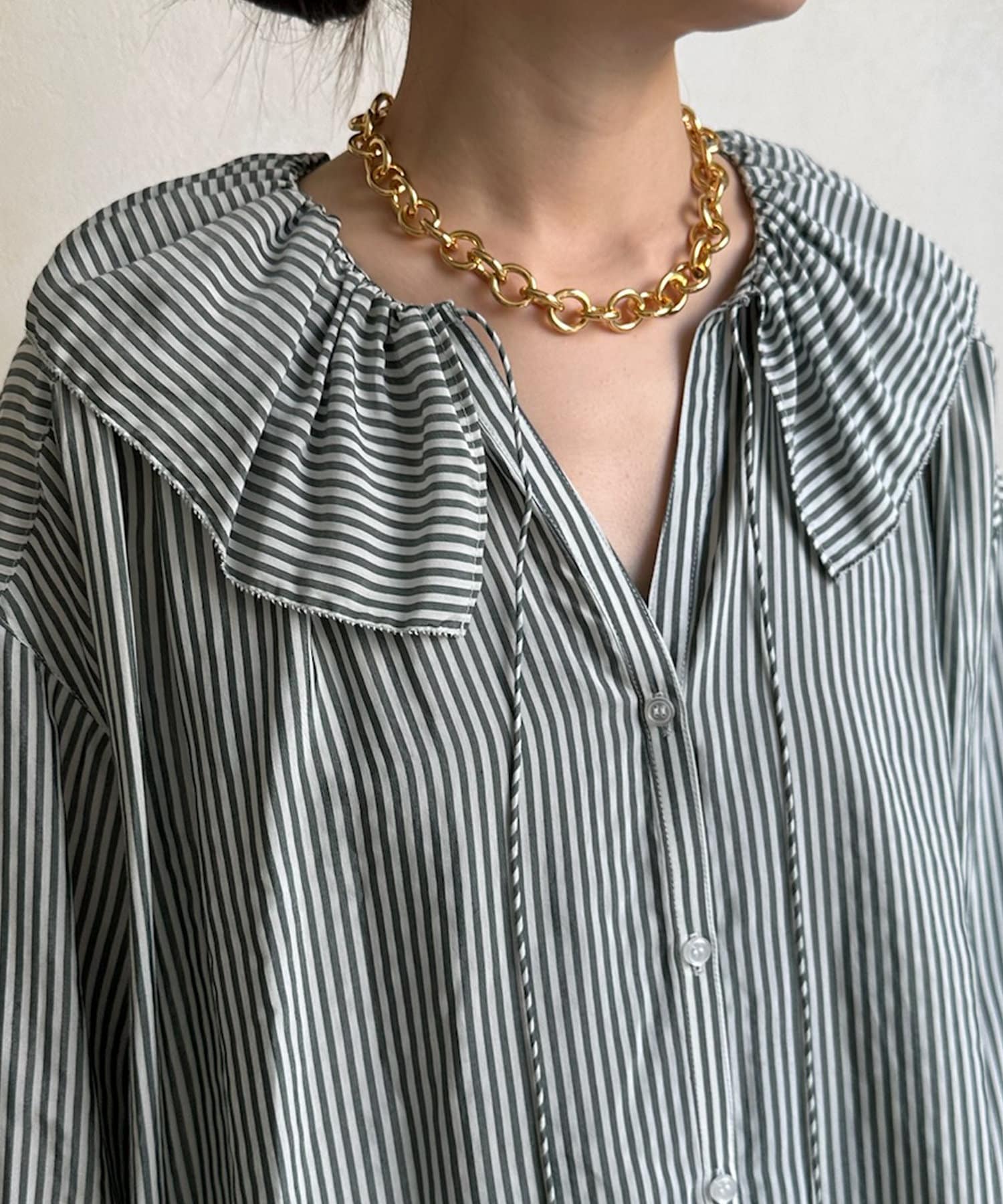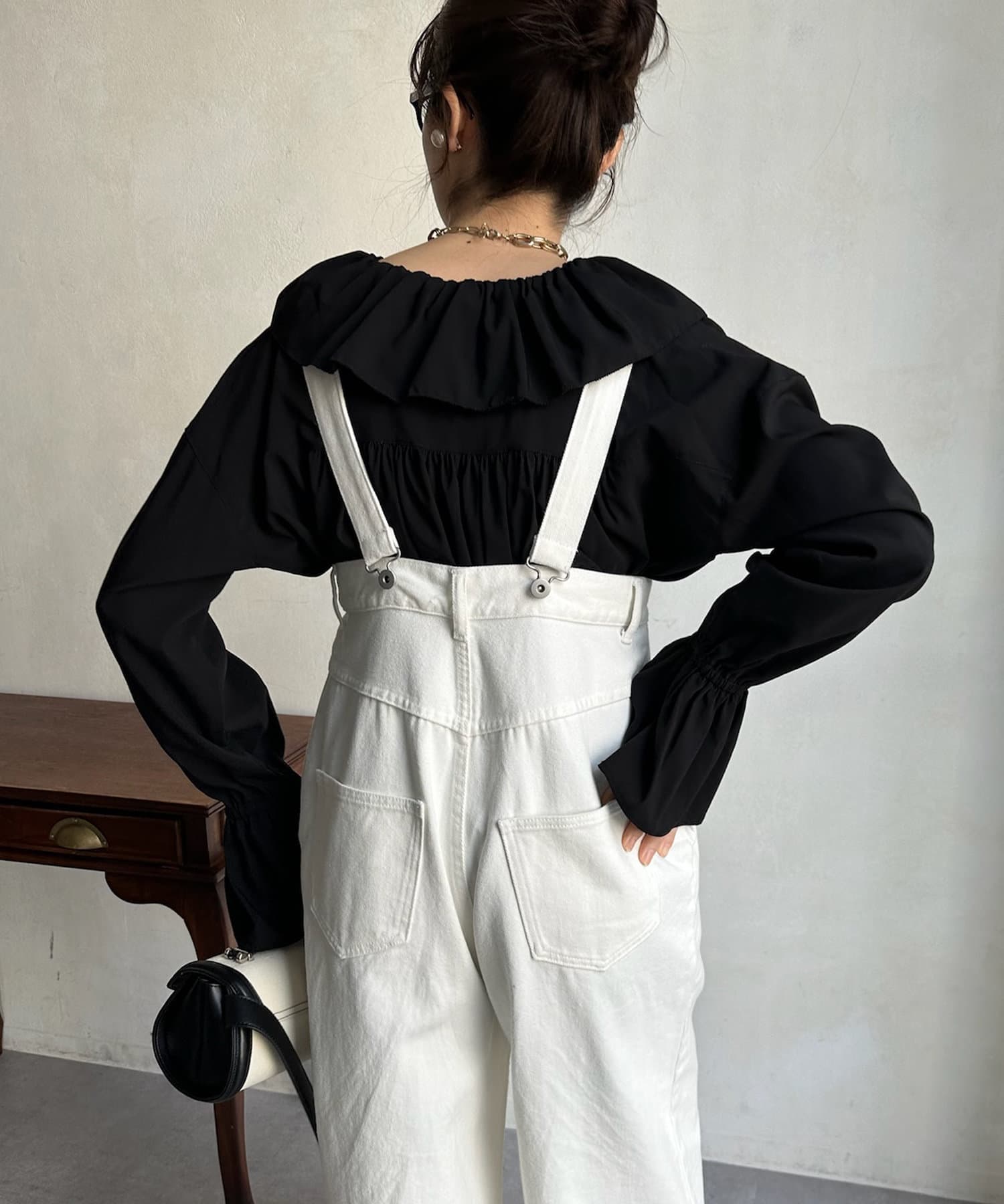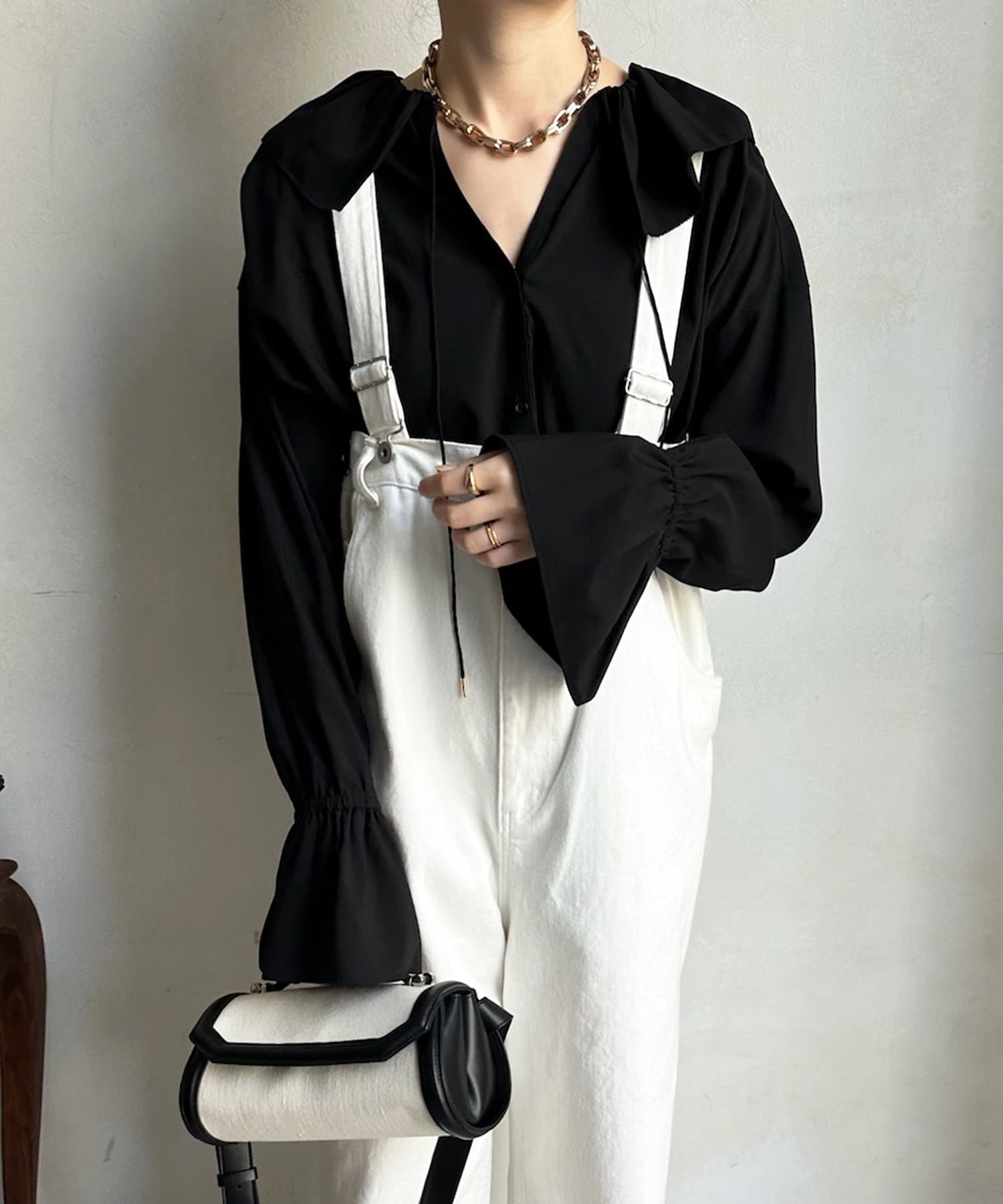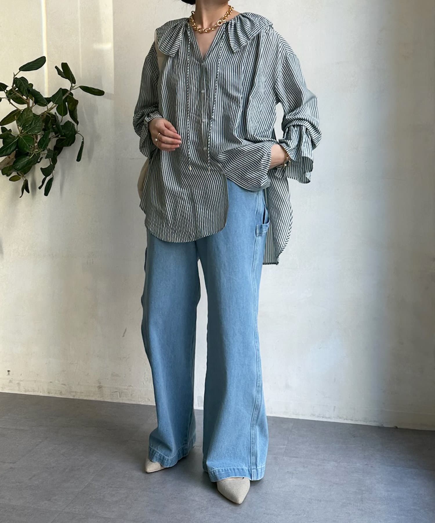 首元にフリルのデザインを施し、春夏らしいシーズンムード漂う1枚に。