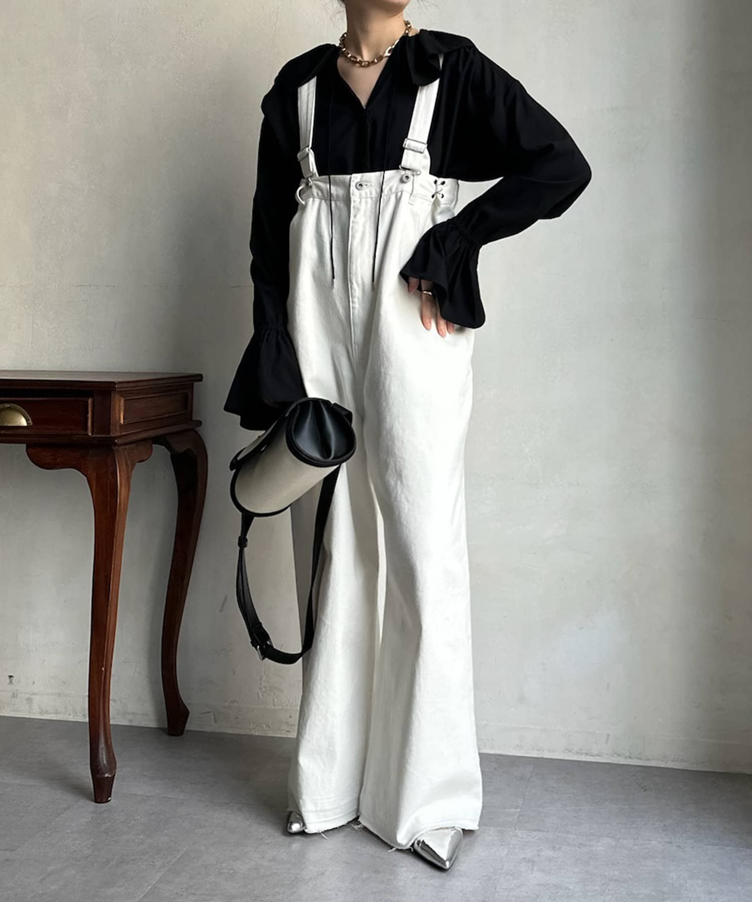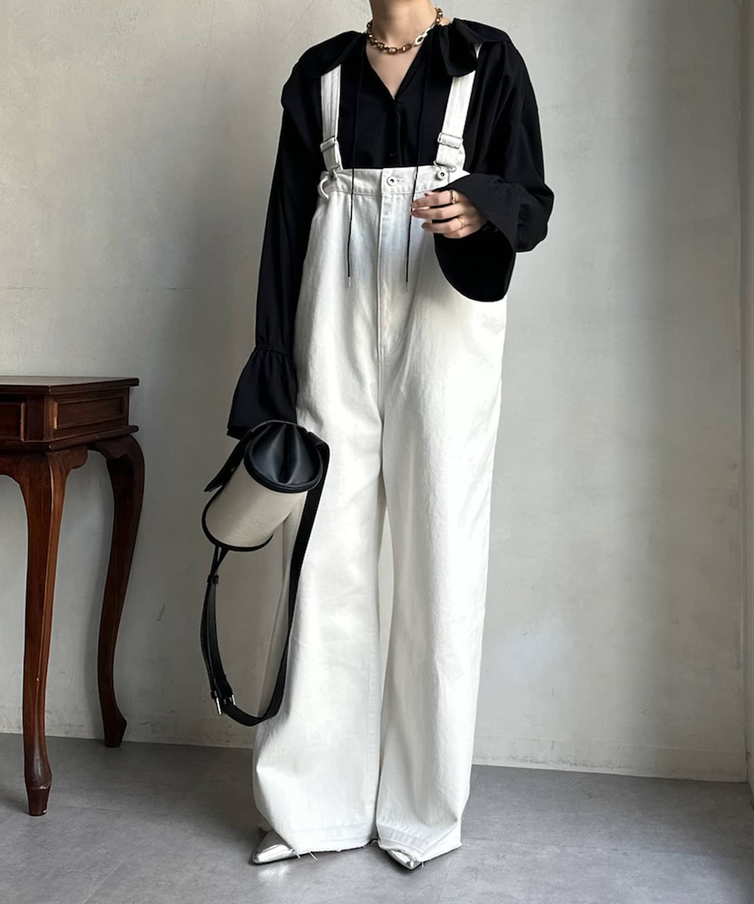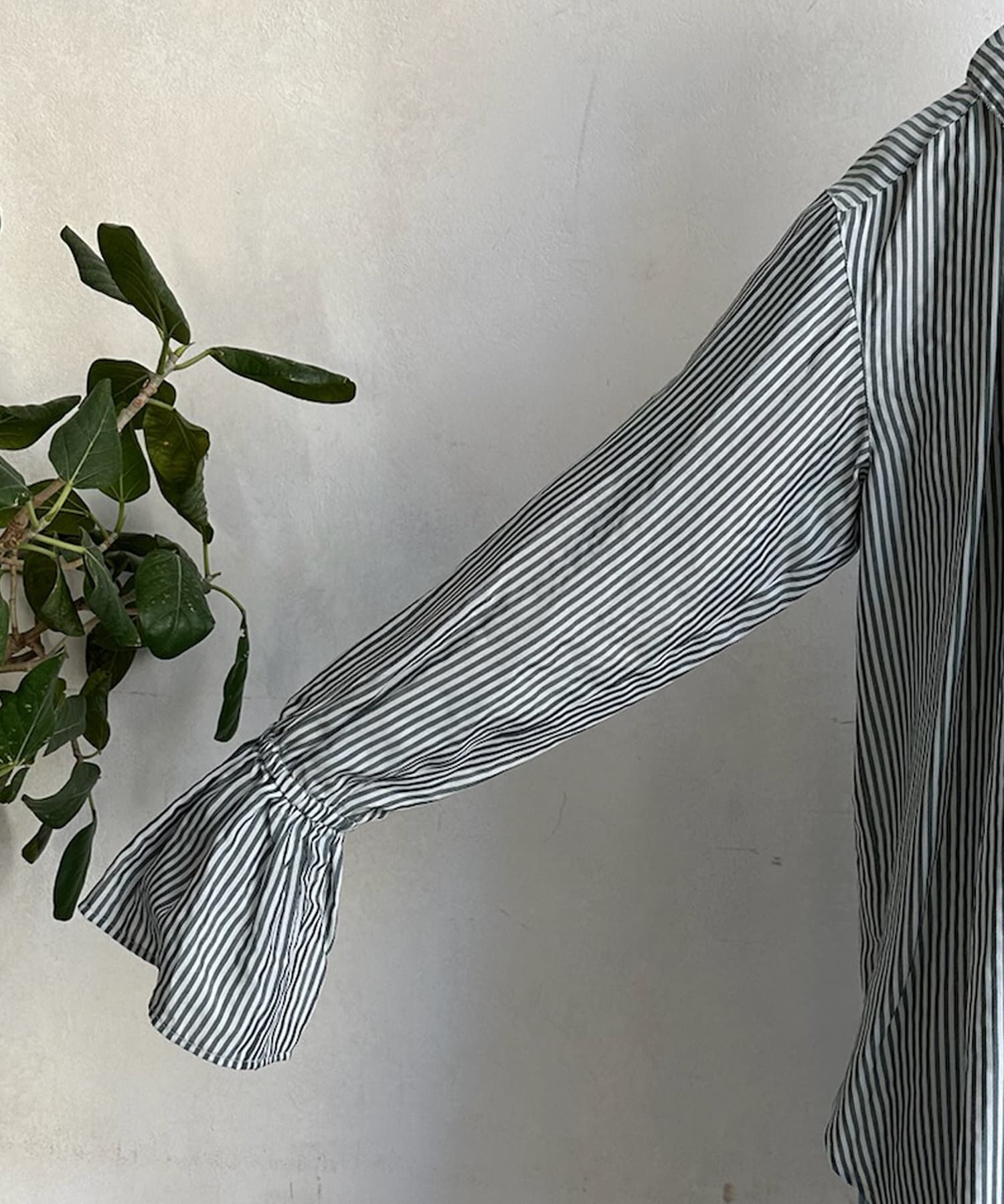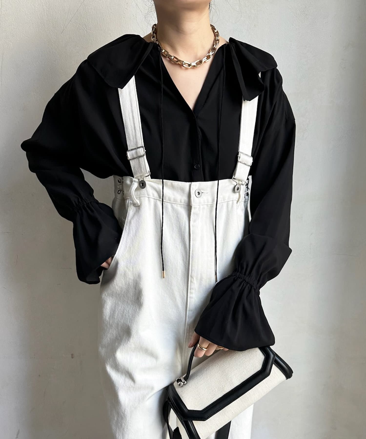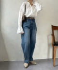 首元にフリルのデザインを施し、春夏らしいシーズンムード漂う1枚に。