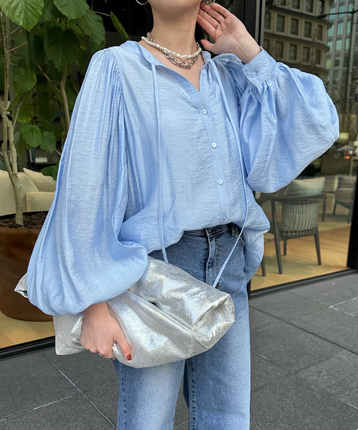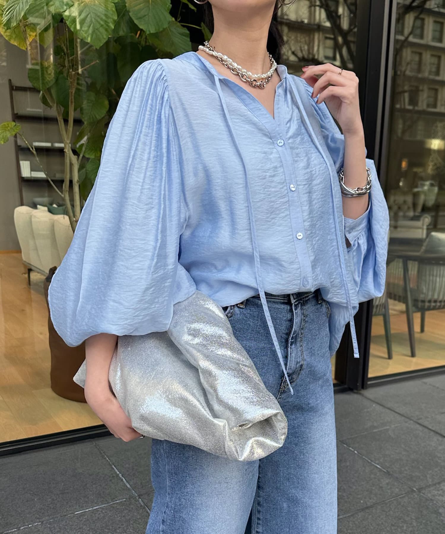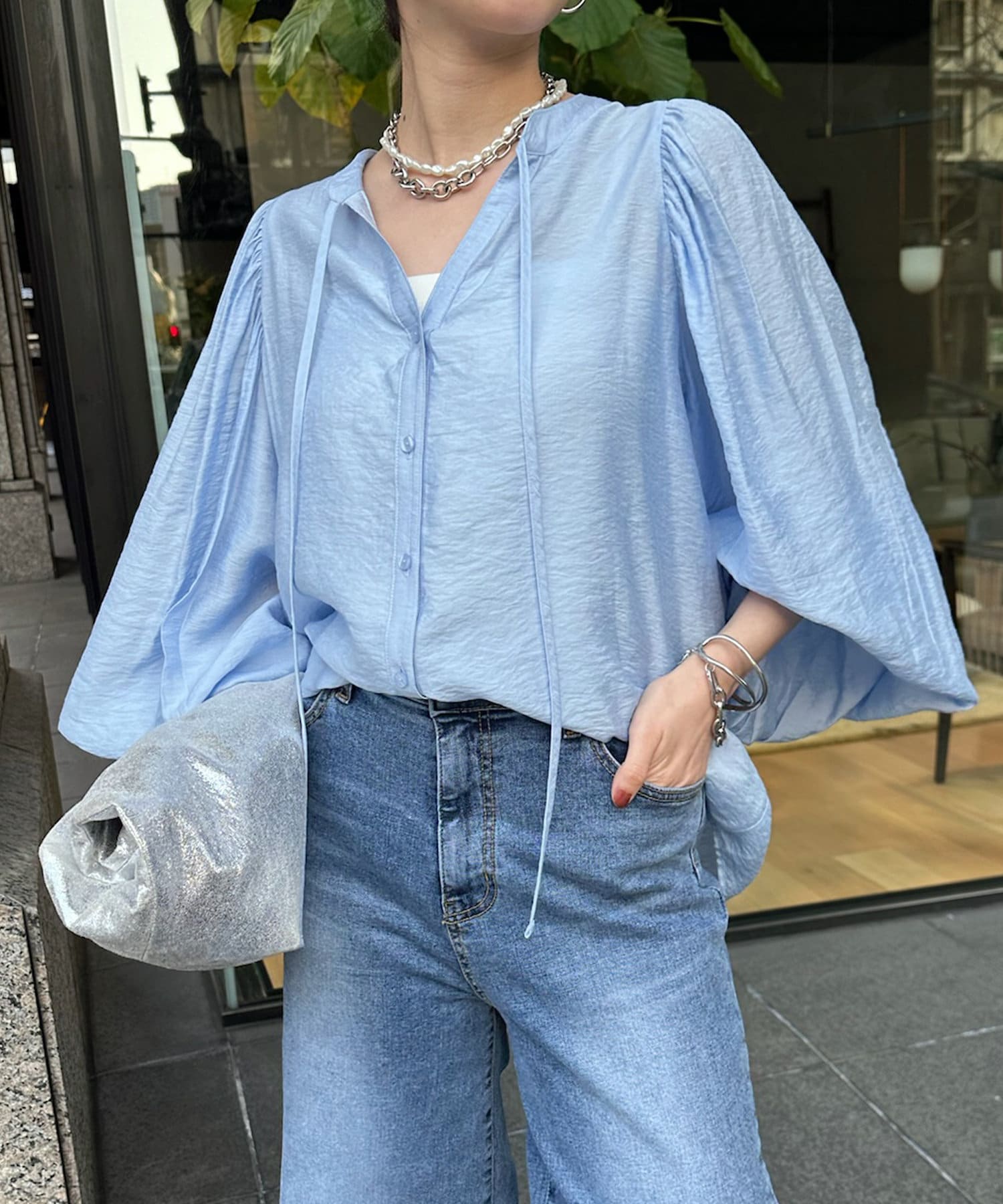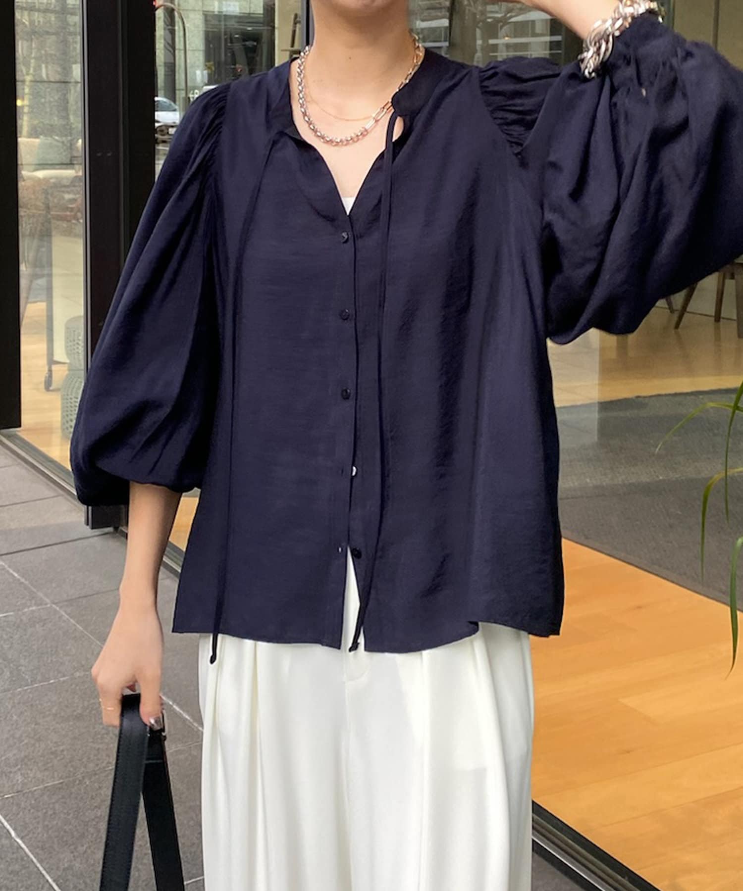 そして、お顔回りがすっきりと見えるスキッパーのデザインに、首元にはトレンド感のあるリボンをプラスしています。